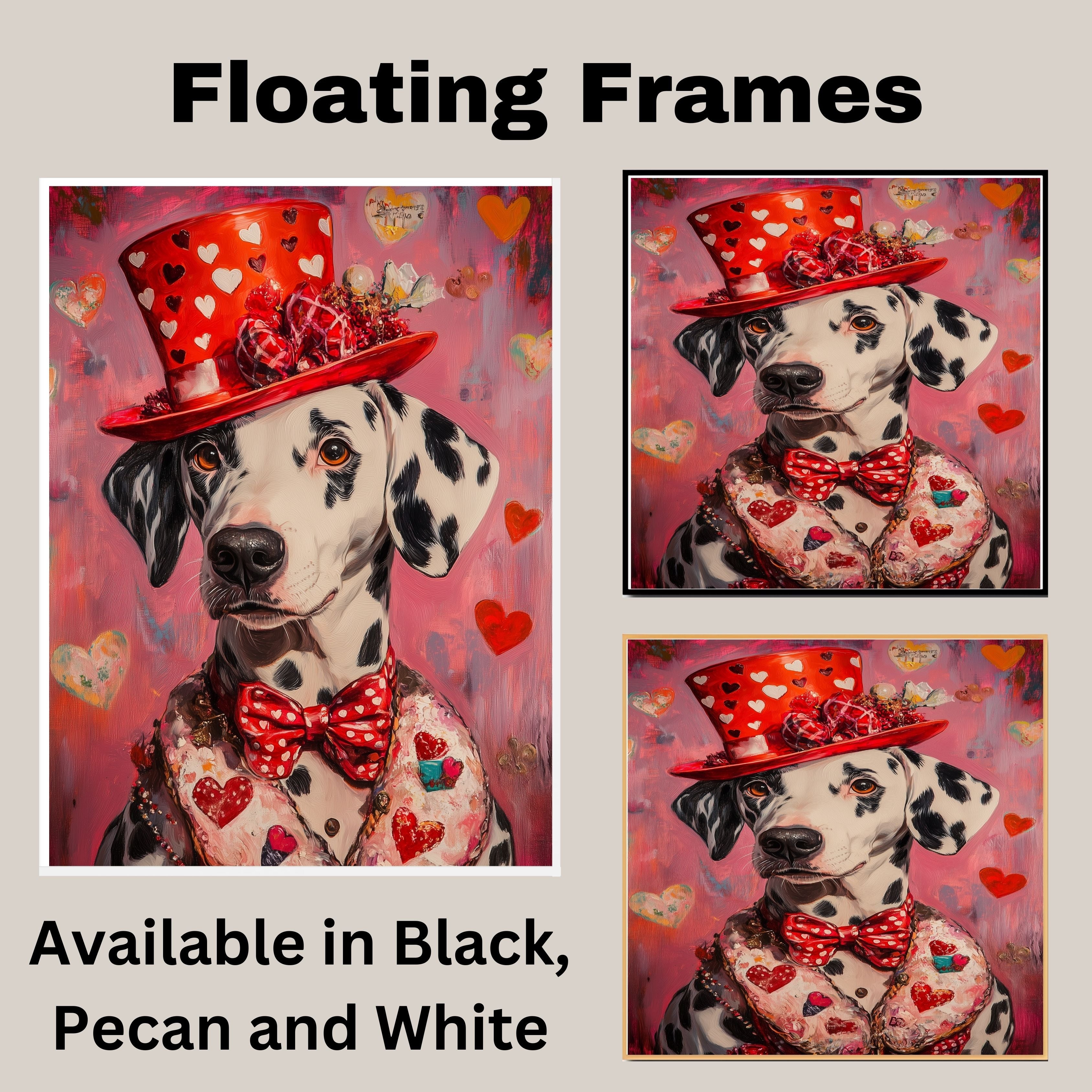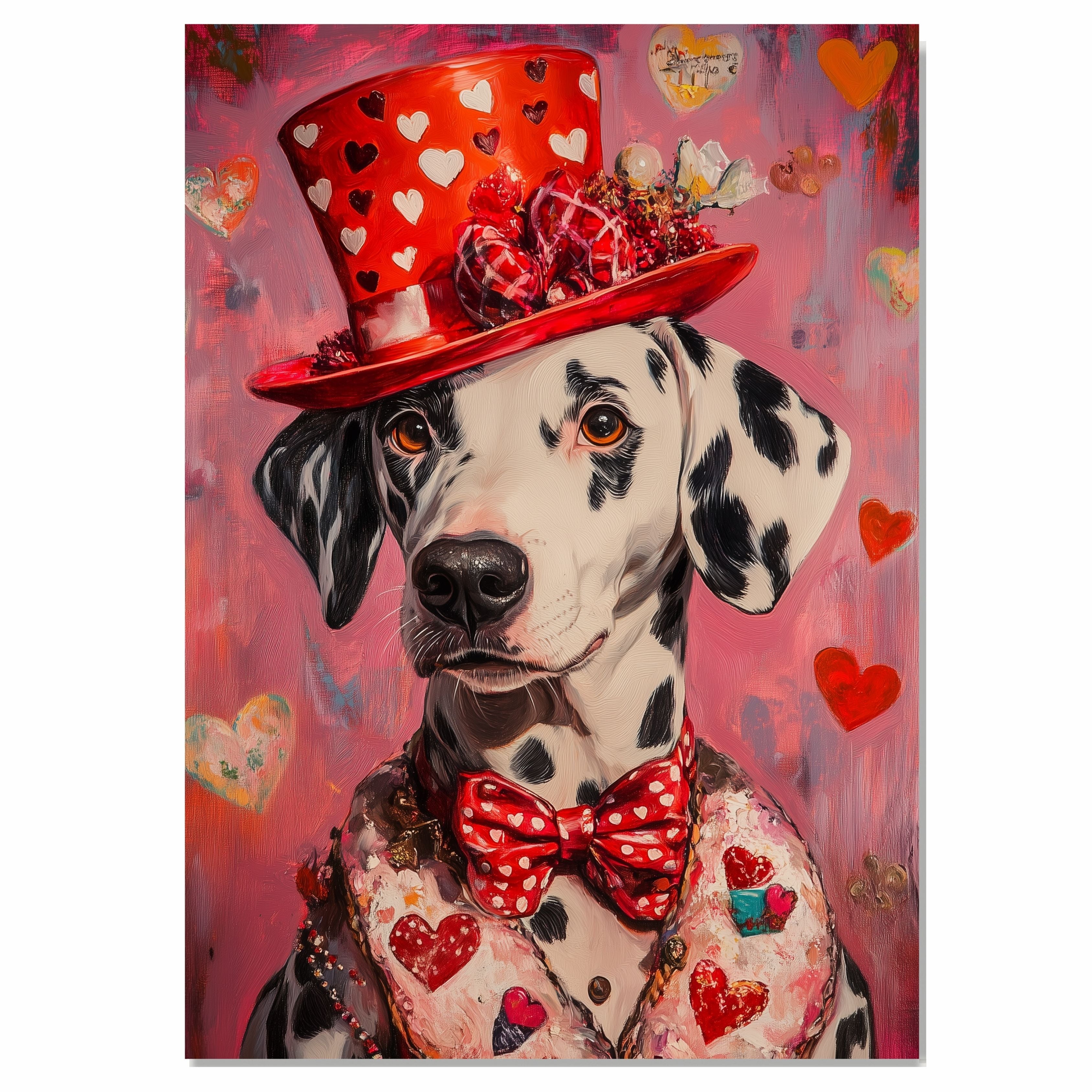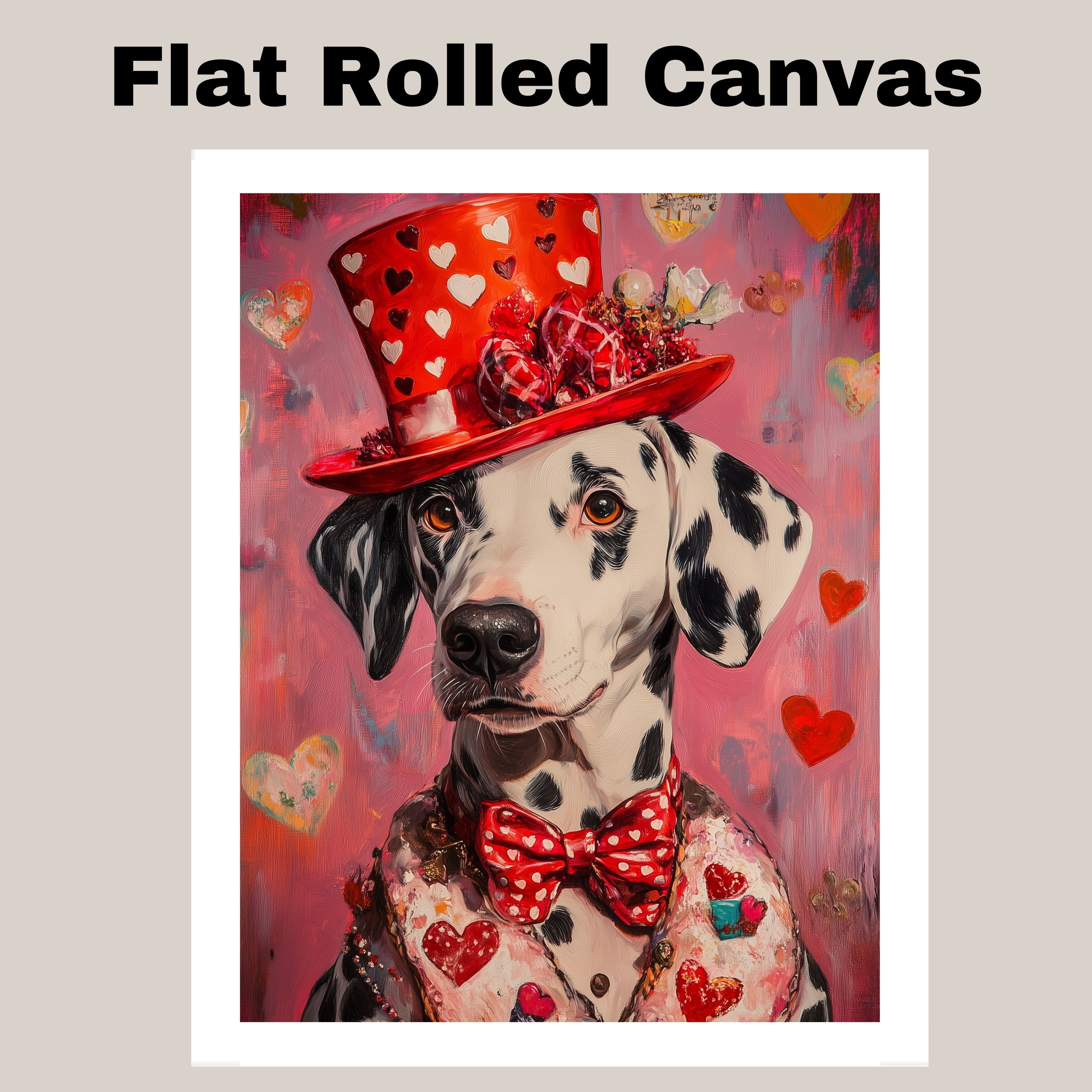 Our "Victorian Romance" Canvas showcases timeless elegance, featuring a refined Dalmatian dressed in a pink heart-patterned suit and matching hat, inspired by classic European style. This exquisite painting combines sophistication with affection, capturing the noble charm and romantic essence of the Victorian era. The delicate details and graceful design evoke a sense of timeless love and beauty, making it a stunning addition to your home. Available on a 1.5" thick canvas wrap, floating framed canvas, or flat rolled canvas, this sophisticated artwork is the perfect gift for Dalmatian lovers and admirers of refined, romantic art.