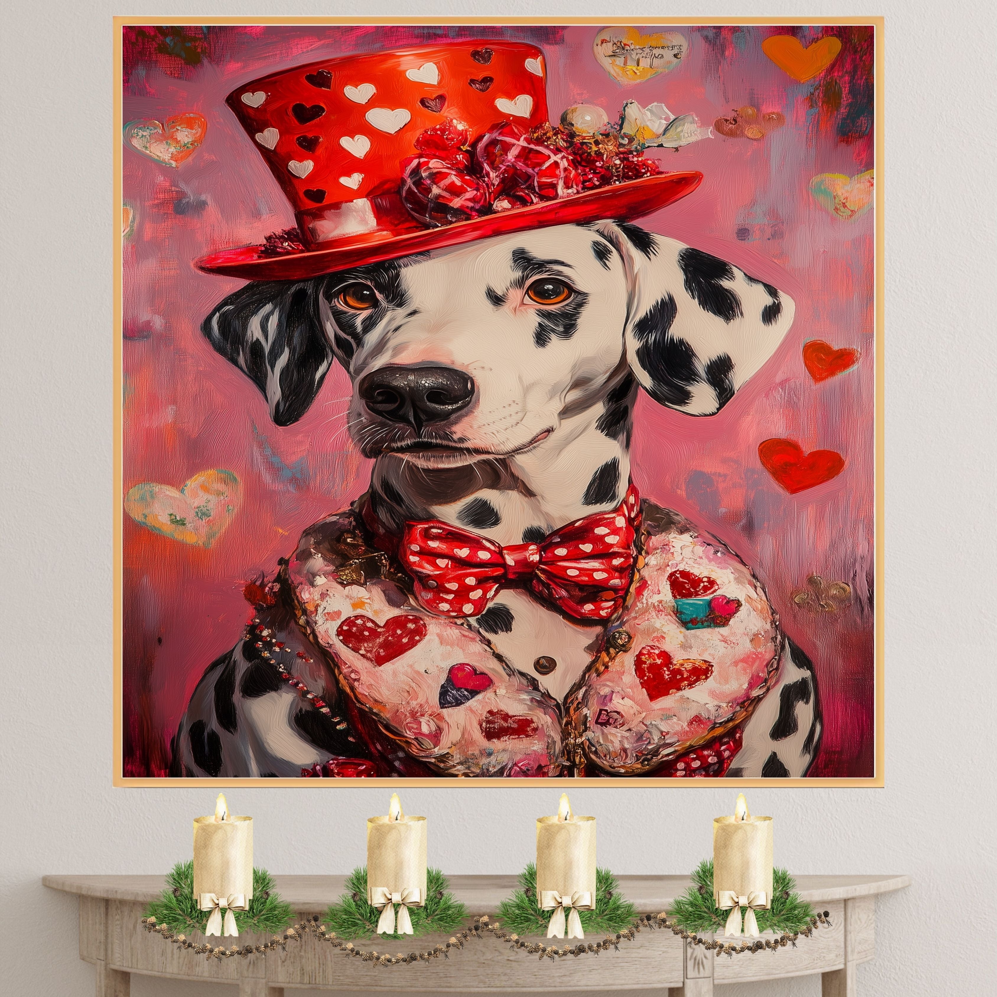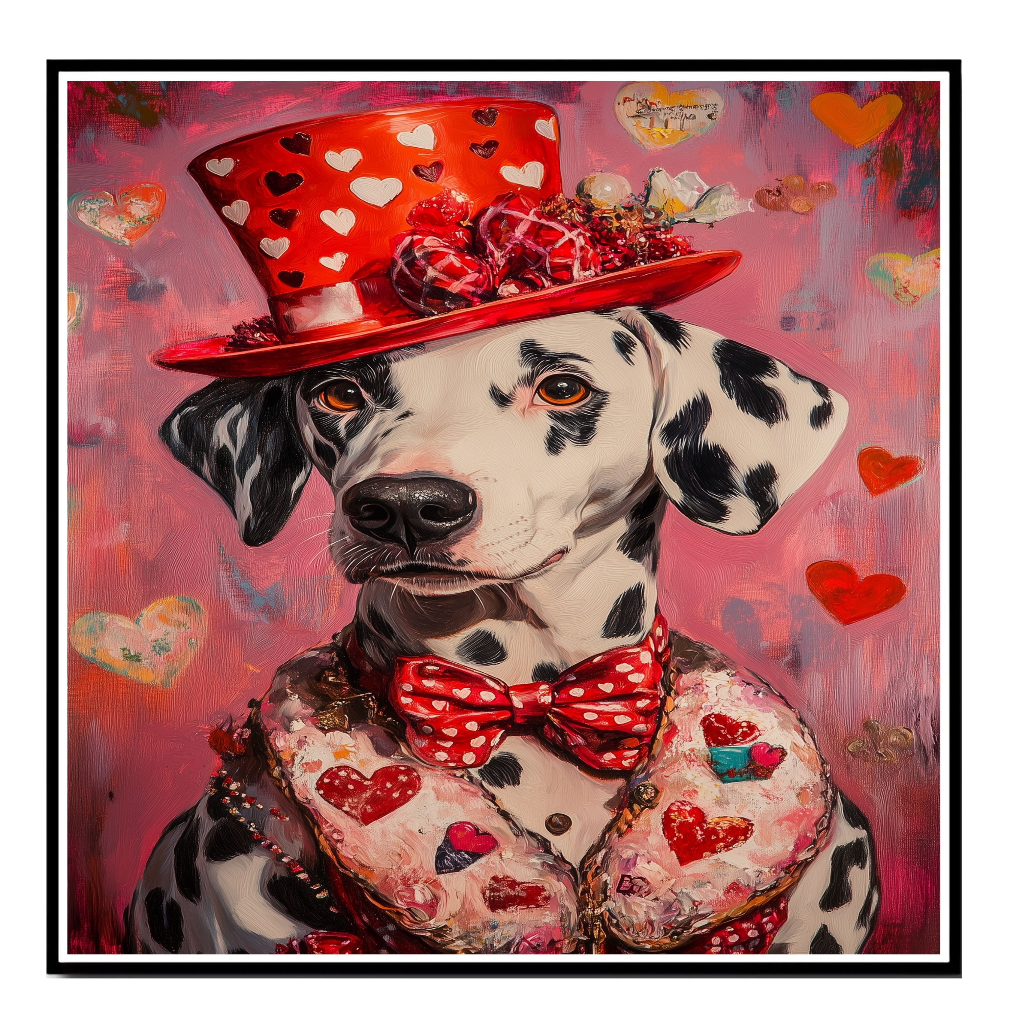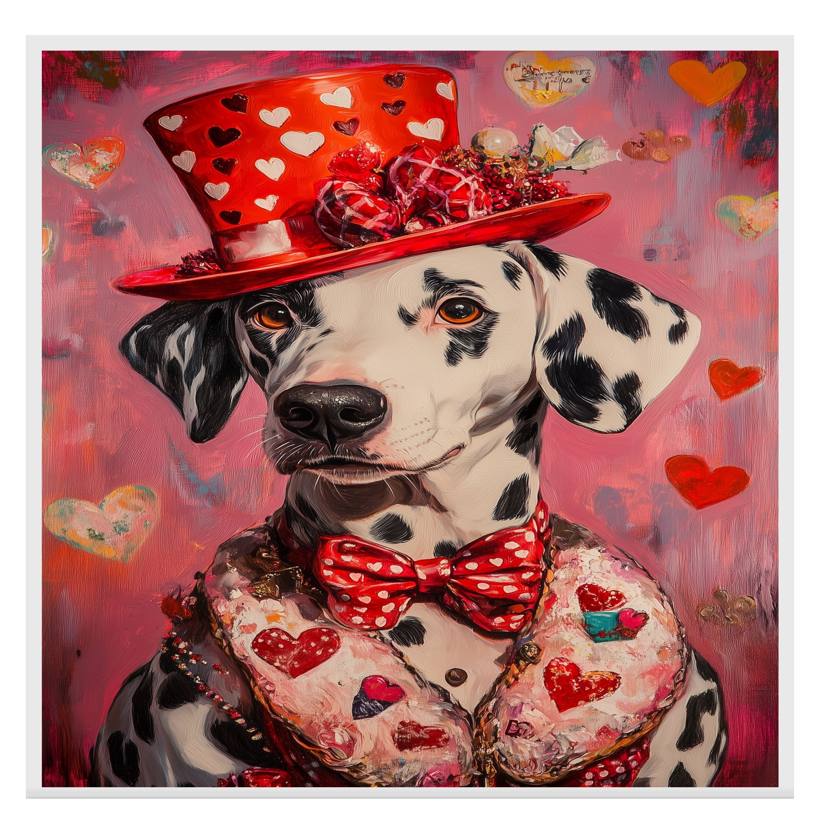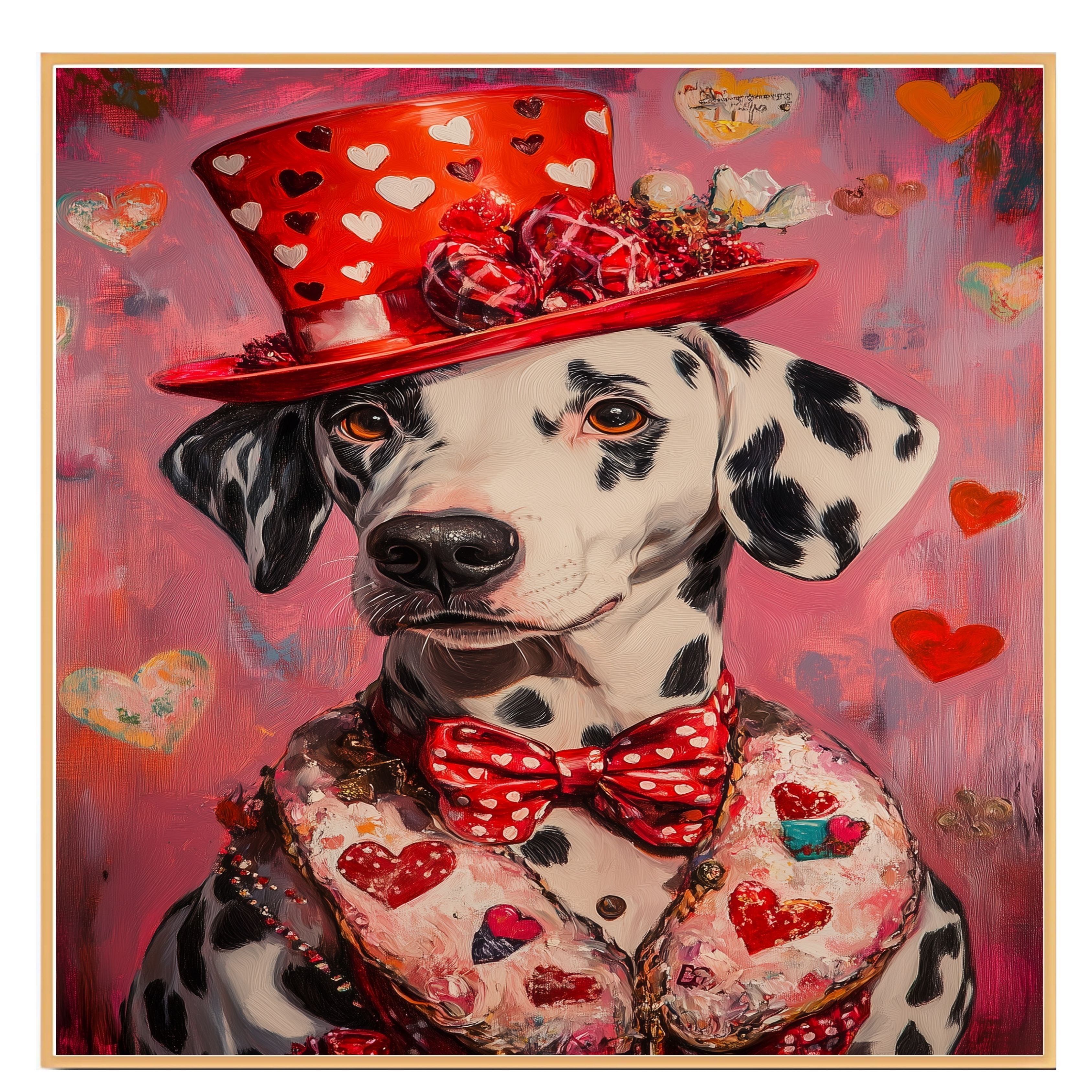 Victorian Romance: Dalmatian in a Pink Heart-Patterned Suit and Hat Elegant European-Inspired Painting on Ready to Hang 1.5" Thick Canvas Wrap, Floating Framed Canvas, Flat Rolled Canvas