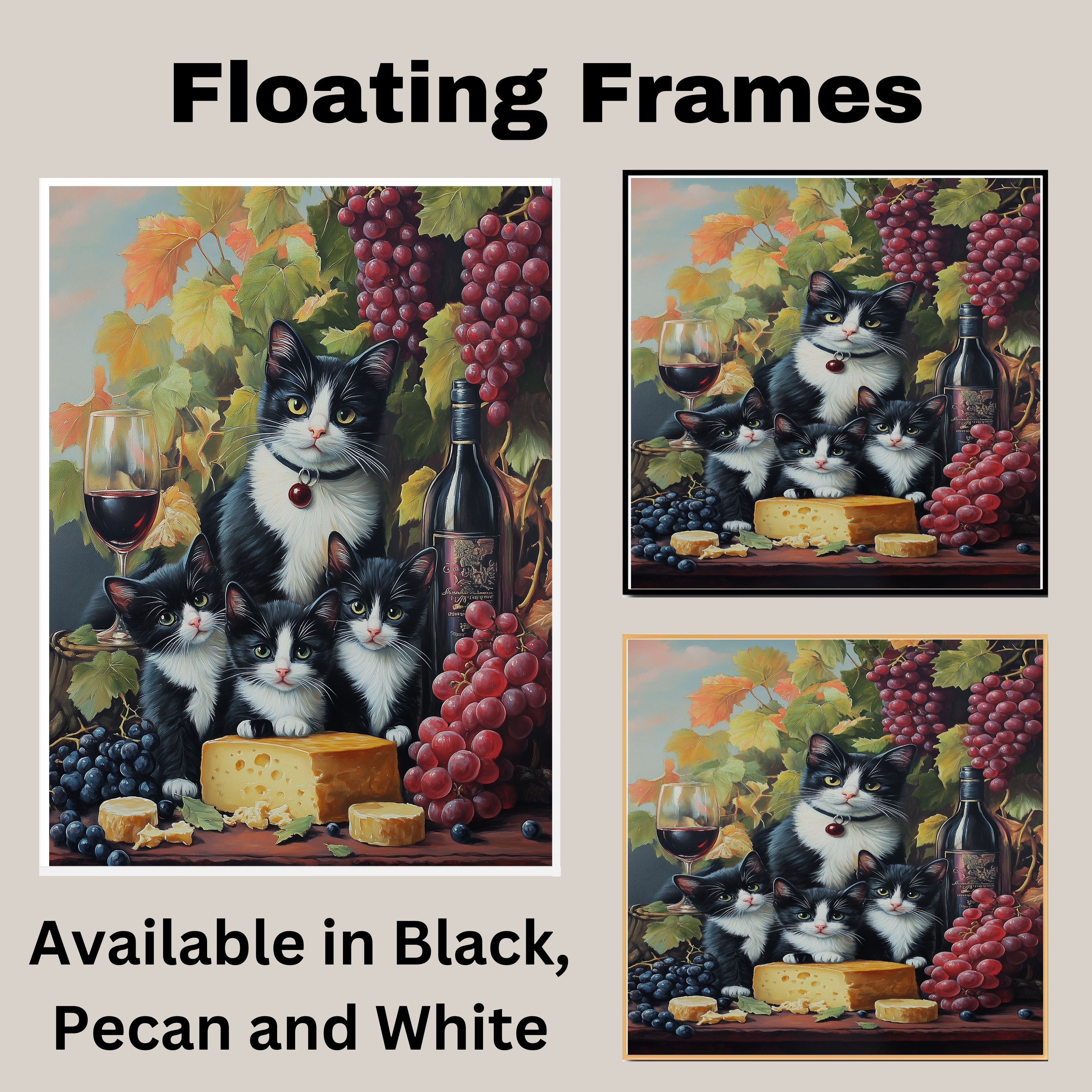 Vineyard Feast: Tuxedo Mom and Three Kittens with Wine, Grapes, and Cheese on Ready to Hang 1.5" Thick Canvas Wrap, Floating Framed Canvas, Flat Rolled Canvas