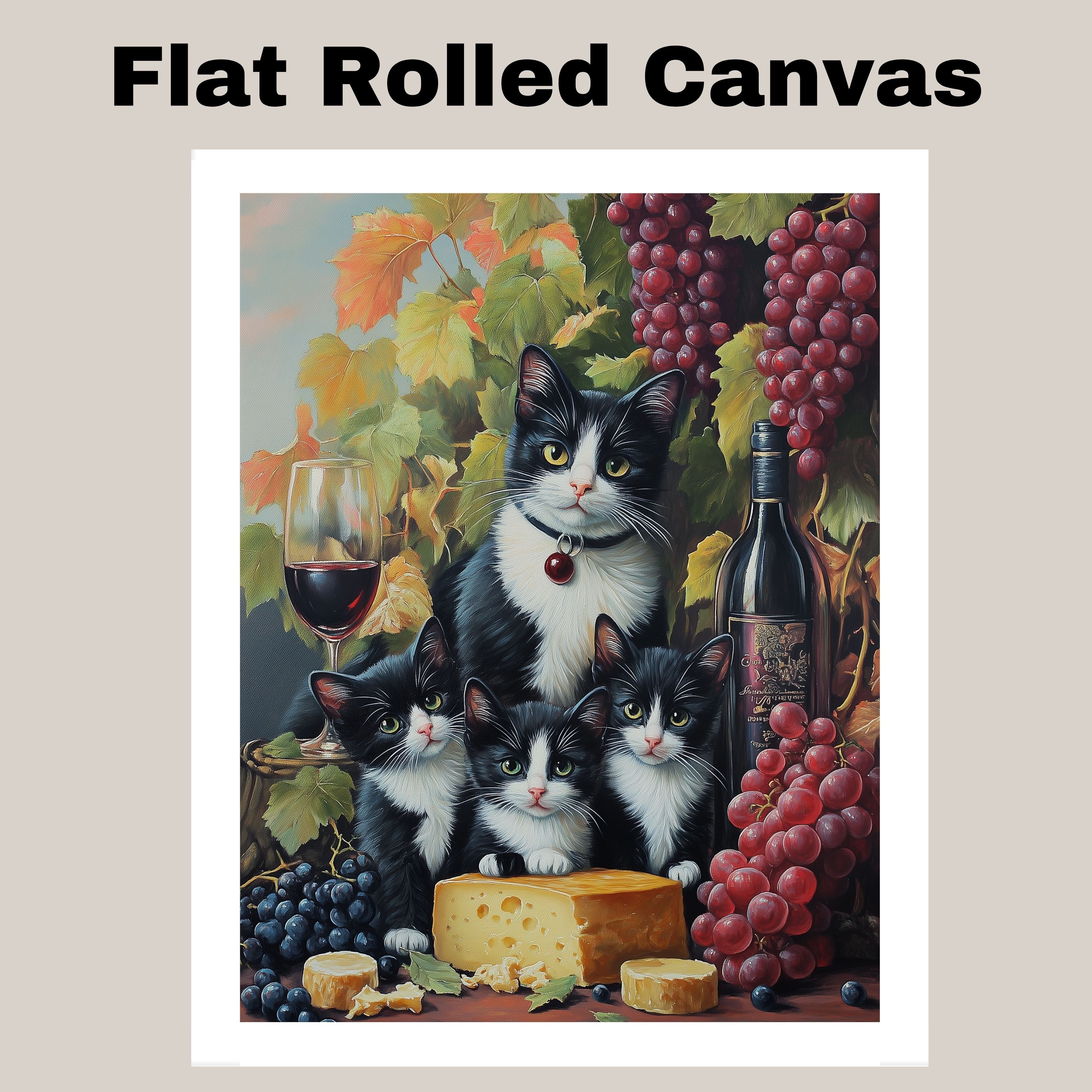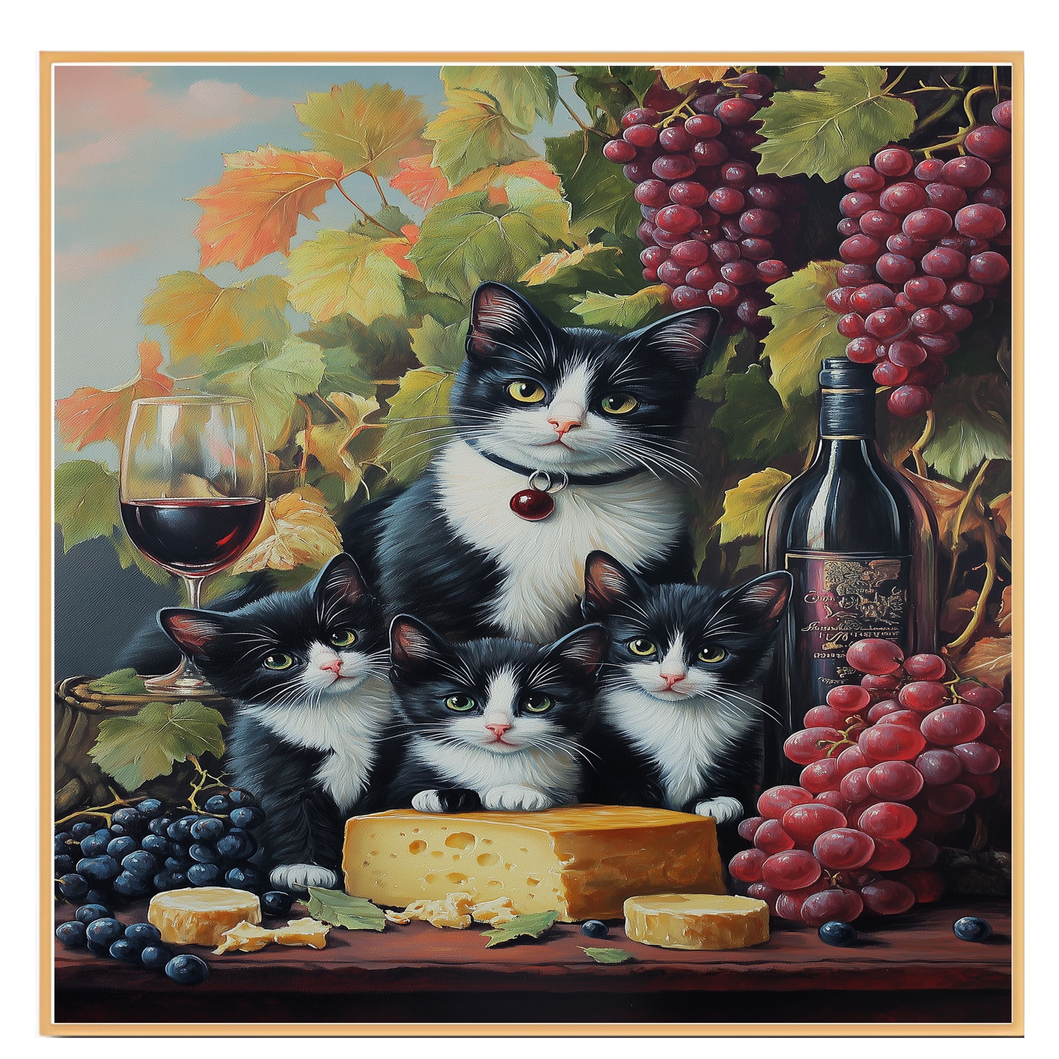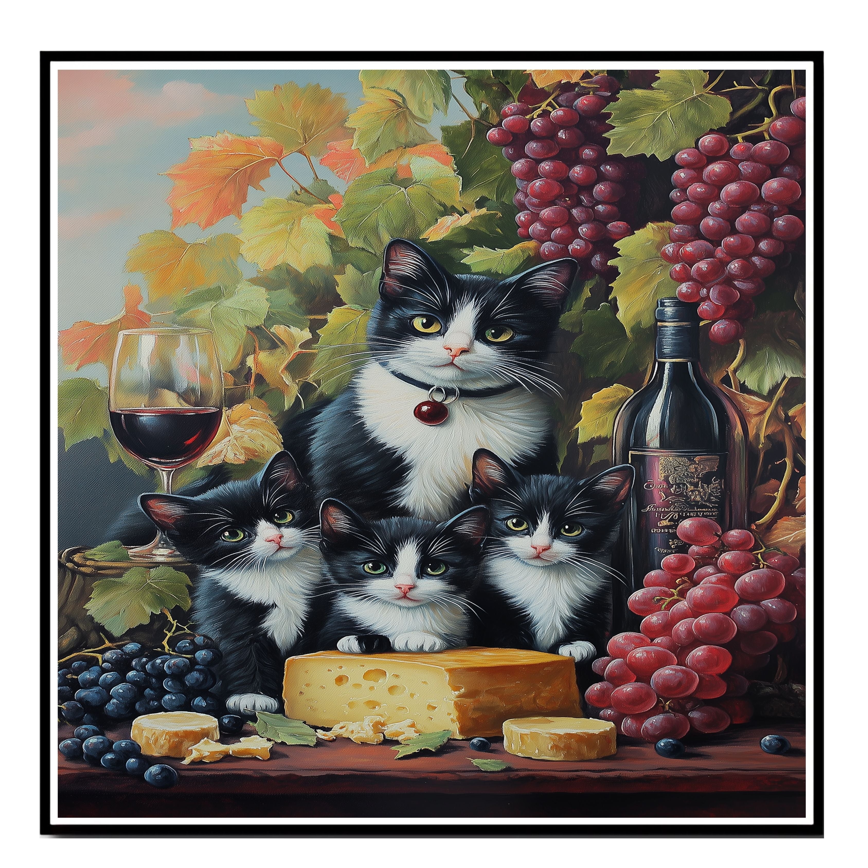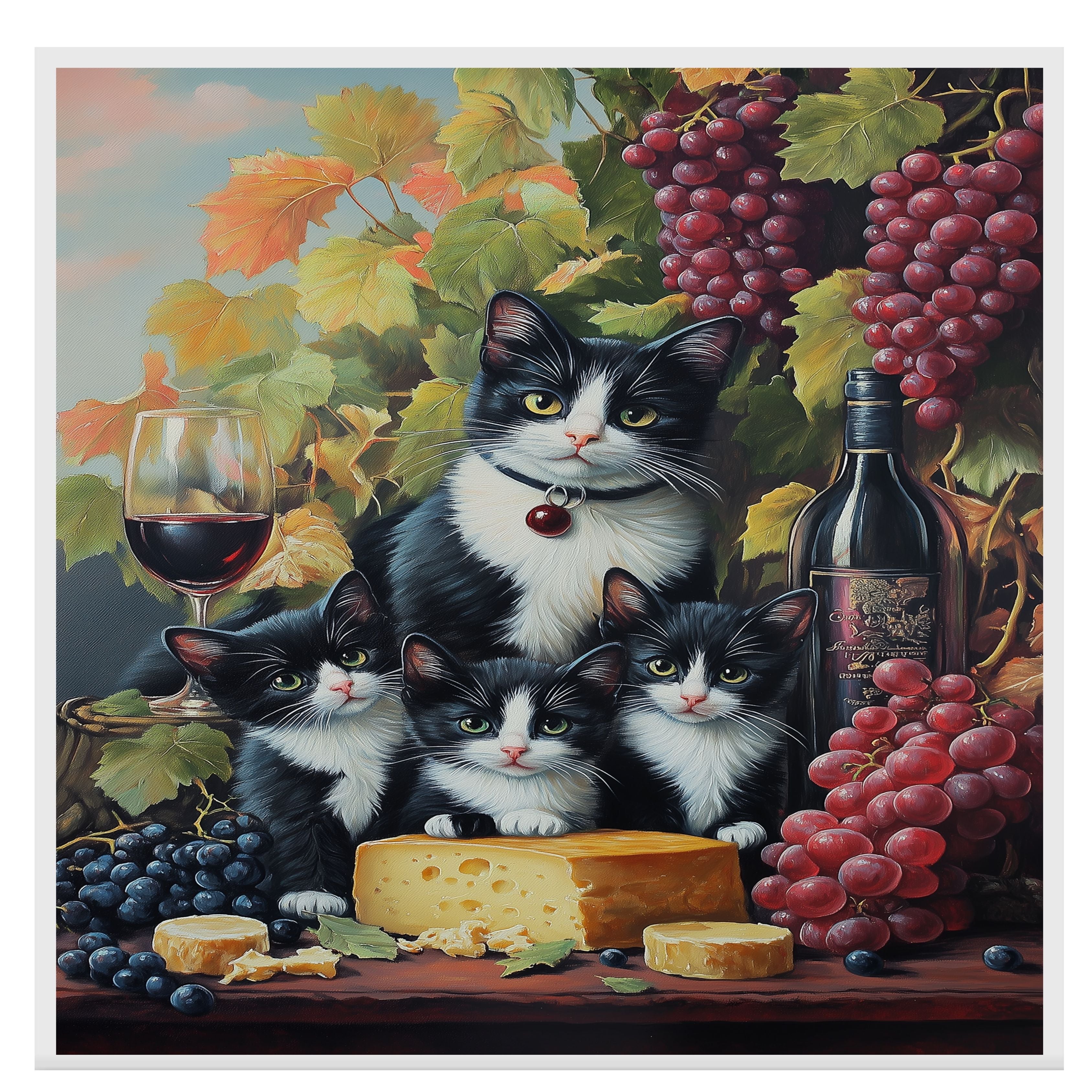 "Vineyard Feast" Canvas showcases a charming tuxedo cat mom and her three kittens indulging in a rustic vineyard setting. Surrounded by plump grapes, fine wine, and artisanal cheese, this artwork exudes European countryside charm with a touch of feline mischief. A perfect piece for wine lovers and cat enthusiasts, it adds a warm, whimsical touch to any space. Available on 1.5" thick canvas wrap, floating framed canvas, or flat rolled canvas.