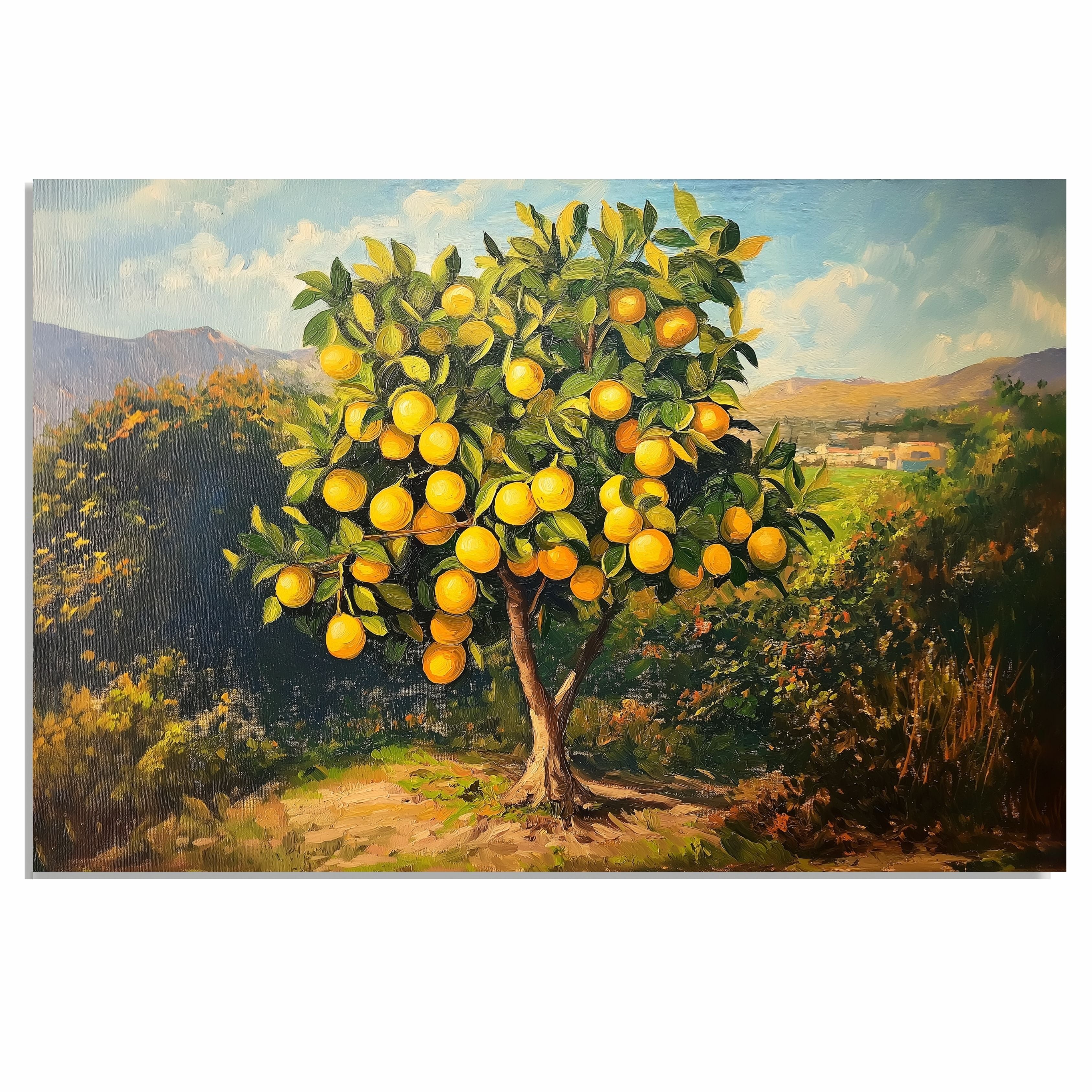 A beautiful vintage-style painting capturing the essence of a flourishing lemon tree in a sunlit countryside orchard. The rich texture and vibrant yellow lemons against lush greenery evoke the warmth and charm of Mediterranean landscapes.