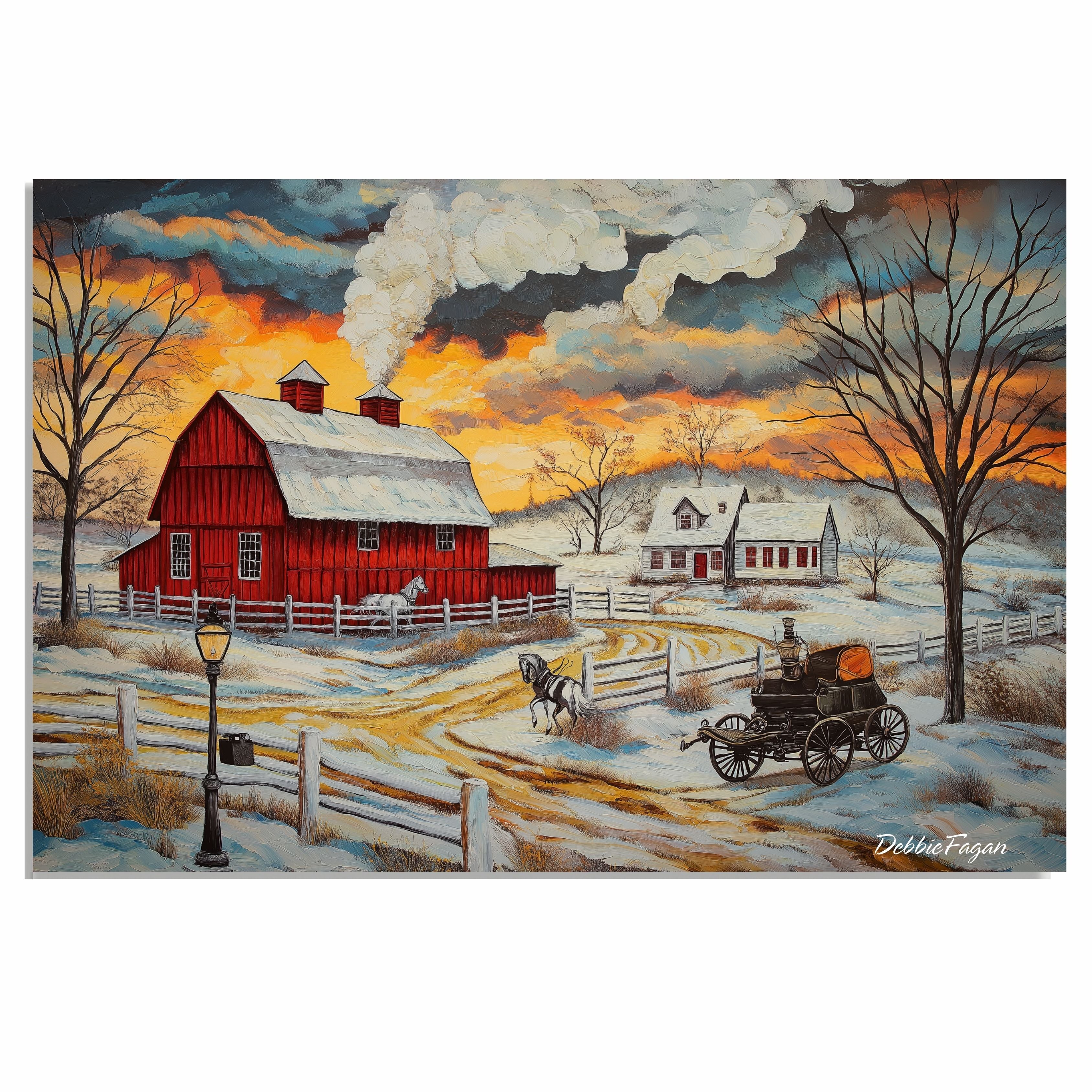 A charming winter painting featuring a snow-blanketed white farmhouse, red barn, and vintage sleigh parked under glowing...