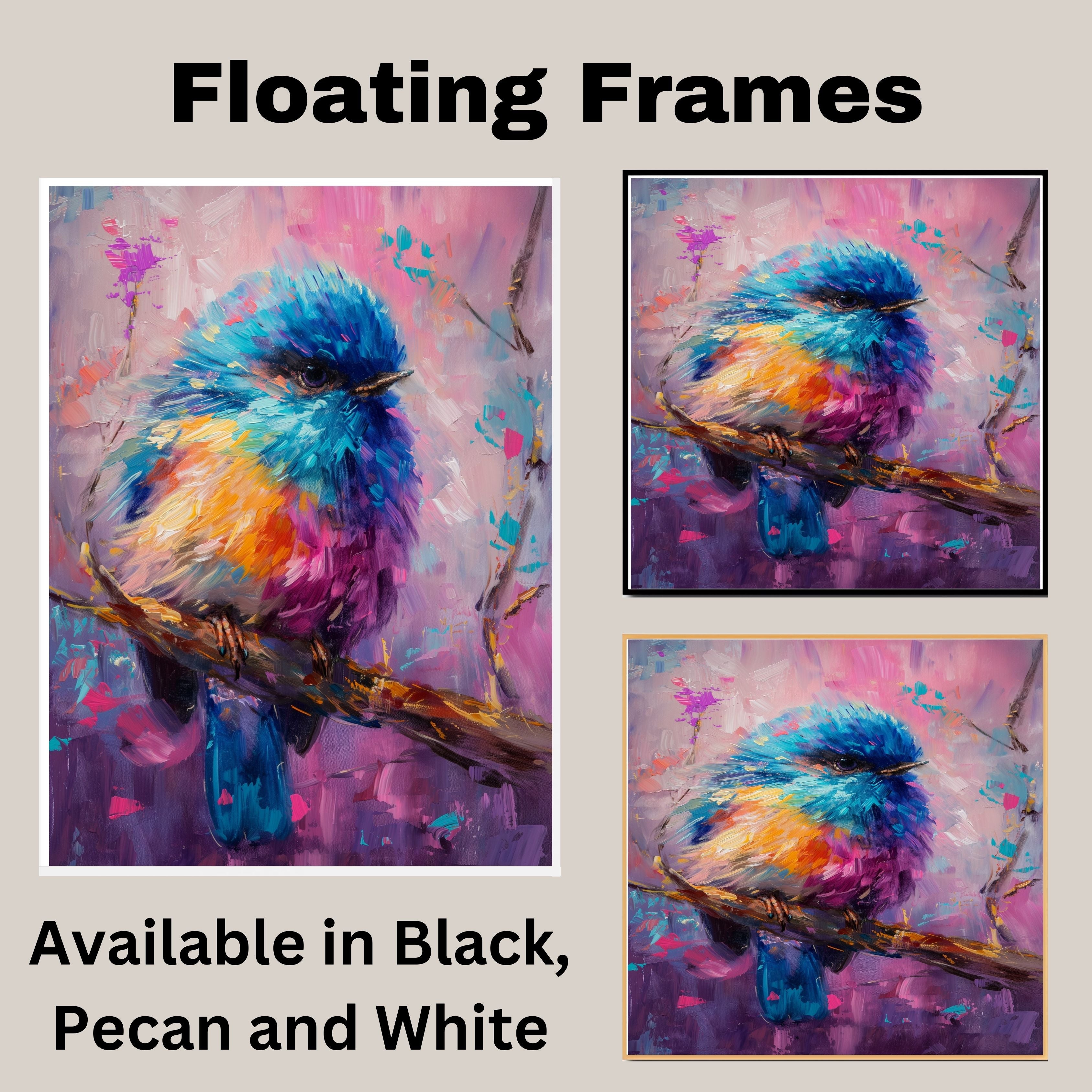 1.5" Thick Floating Framed Canvas: Available in Black, Pecan, and White Grain. Durable shrink-resistant frame. Comes with easy-to-install hanging kits, ready for immediate display.