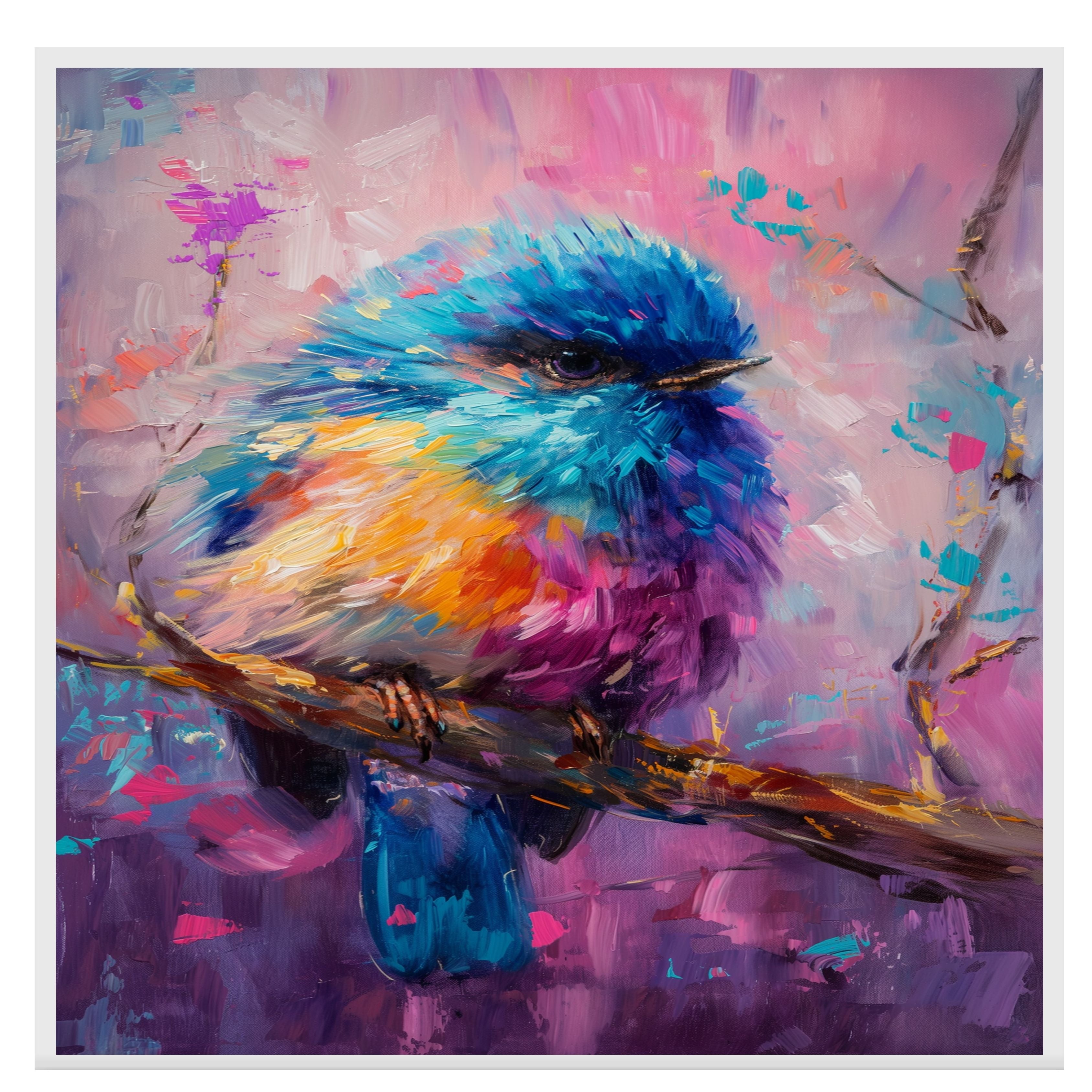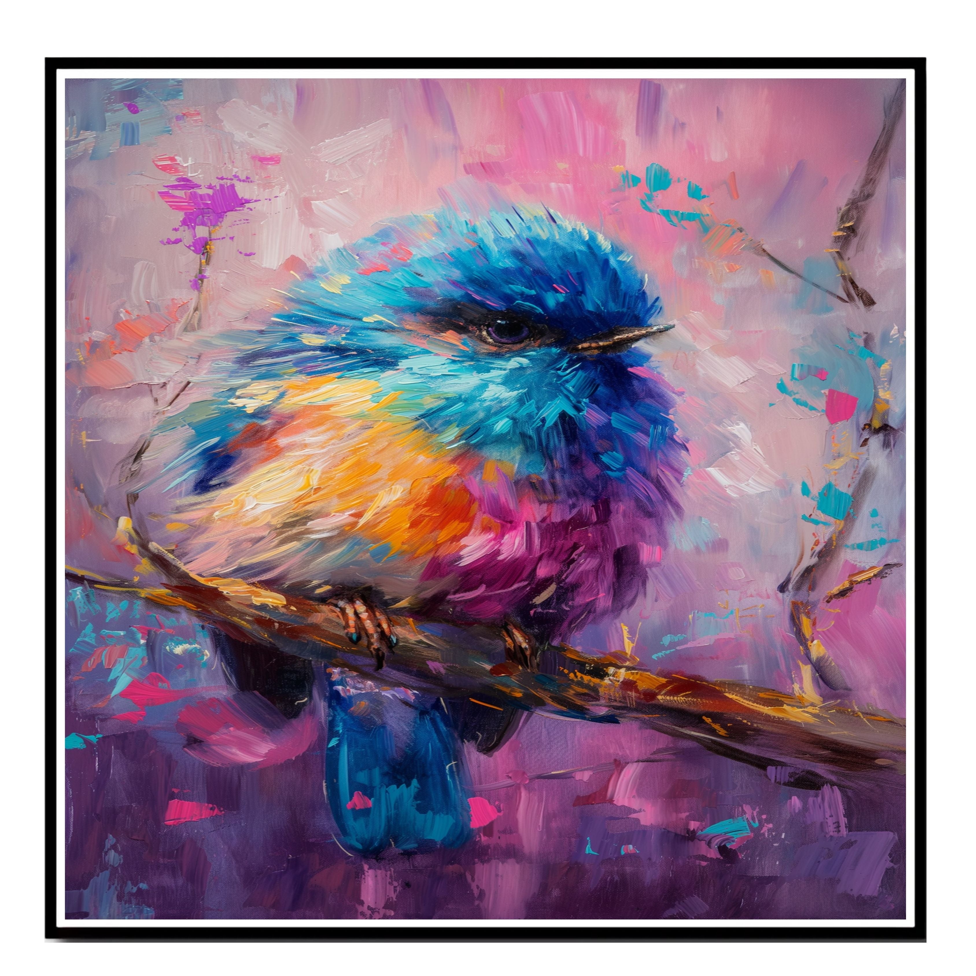 Brighten any room with this expressive painting of a plump baby bird in radiant hues of blue, pink, yellow, and purple. Perched gently on a branch, the artwork captures both innocence and artistic boldness with textured brushstrokes and vivid contrast. Ideal for those who love color, nature, and unique visual charm.