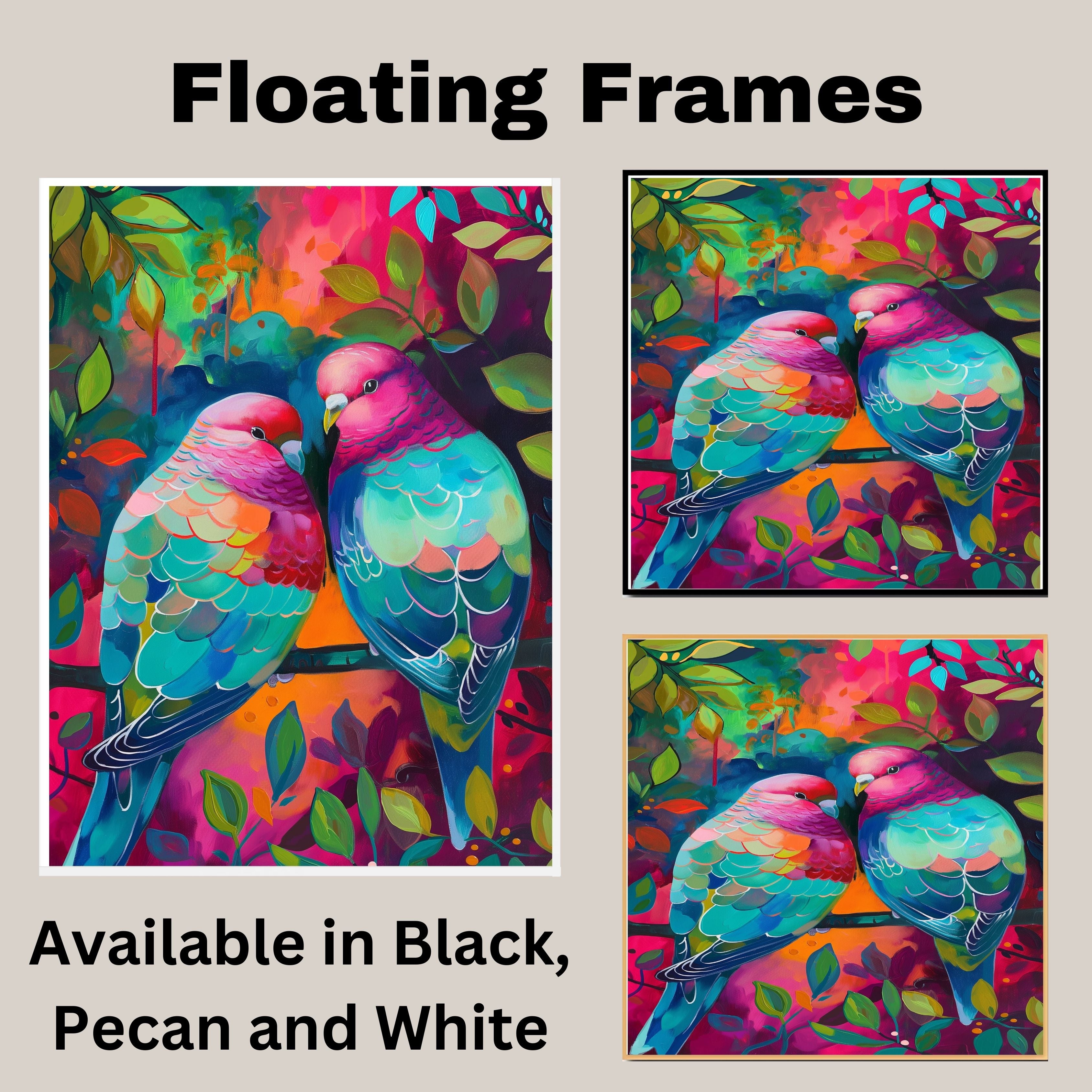 1.5" Thick Floating Framed Canvas: Available in Black, Pecan, and White Grain. Durable shrink-resistant frame. Comes with easy-to-install hanging kits, ready for immediate display.