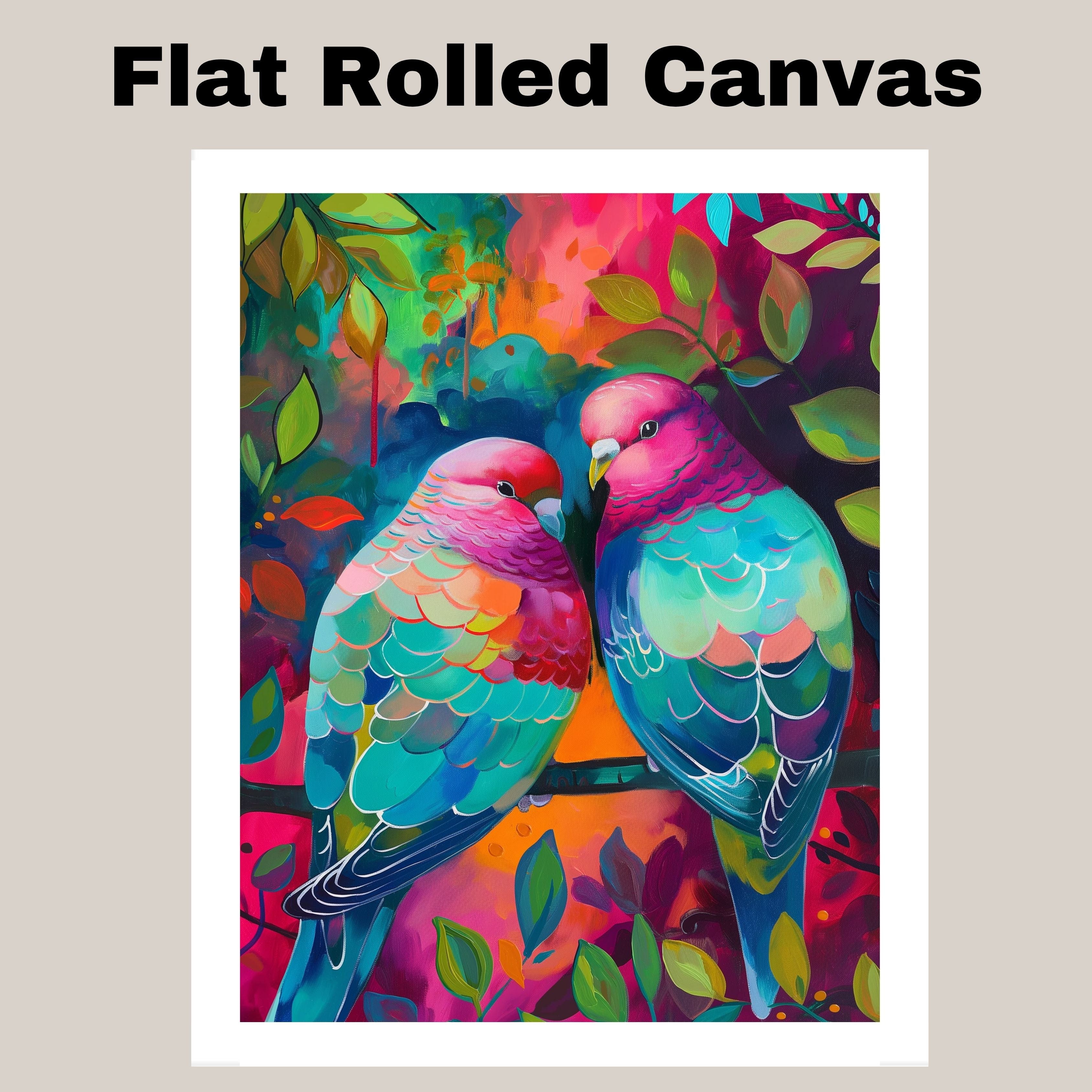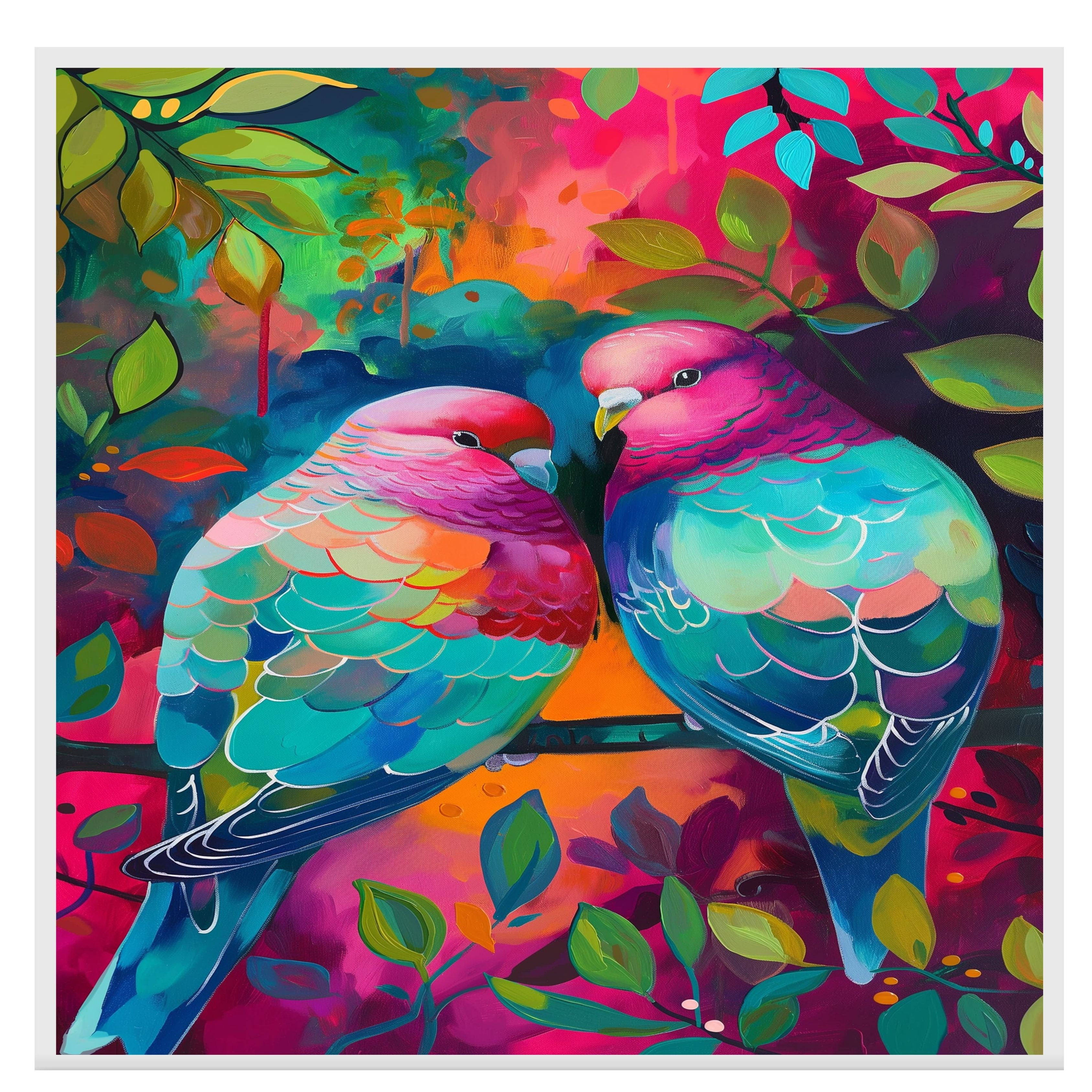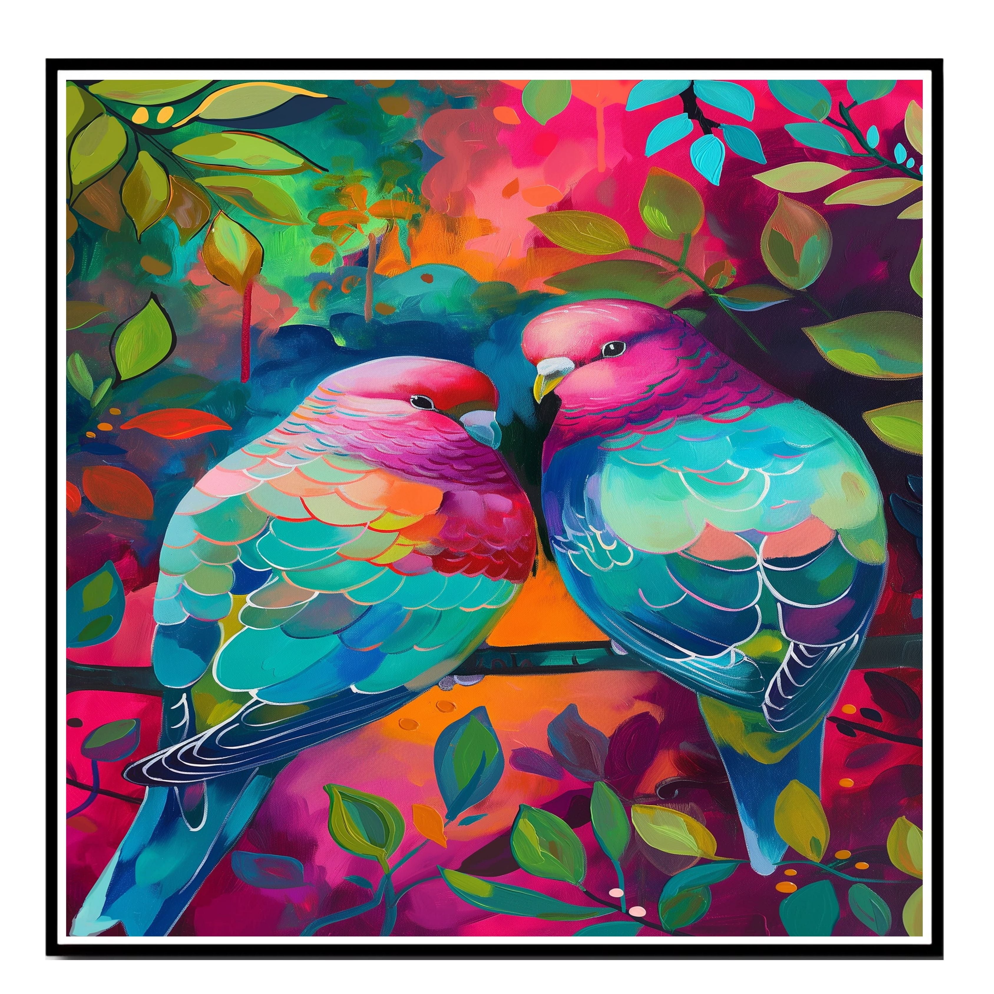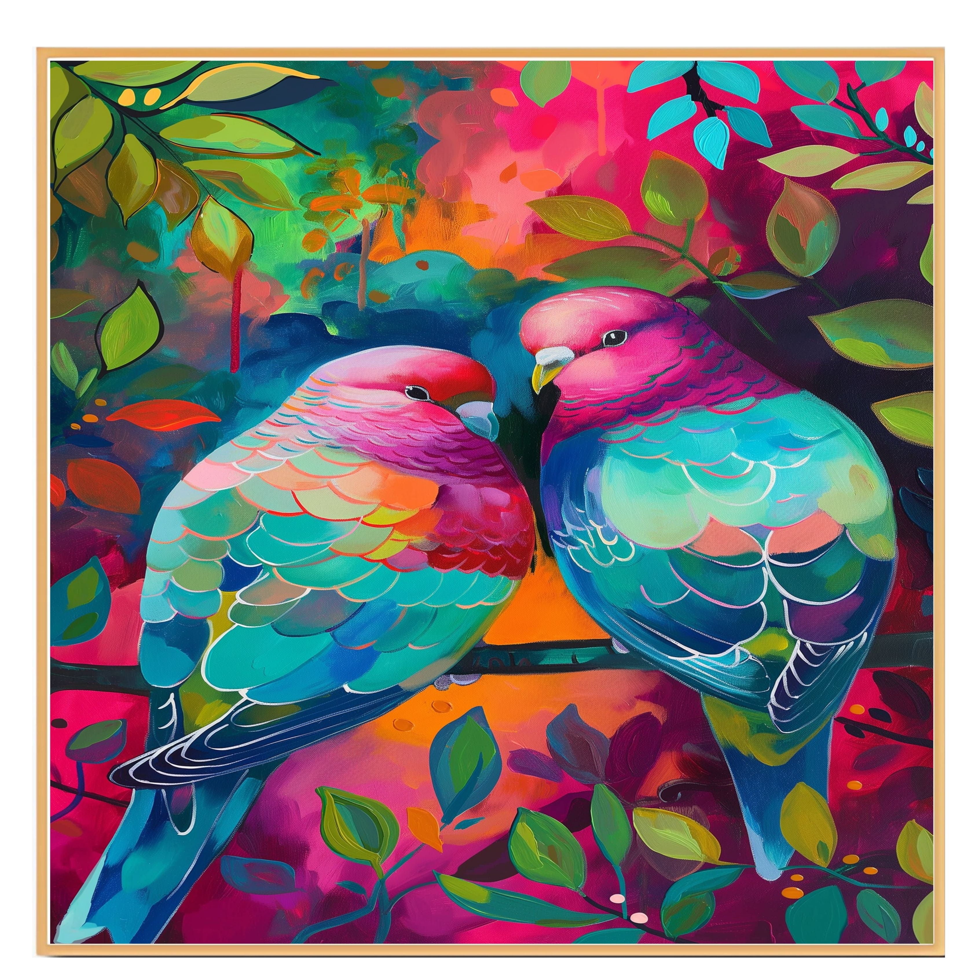 This eye-catching painting showcases two lovebirds with brilliantly colored feathers nestled in a lush, tropical forest. The bold, vivid palette and expressive brushwork make this piece perfect for adding energy, emotion, and a tropical vibe to any space.