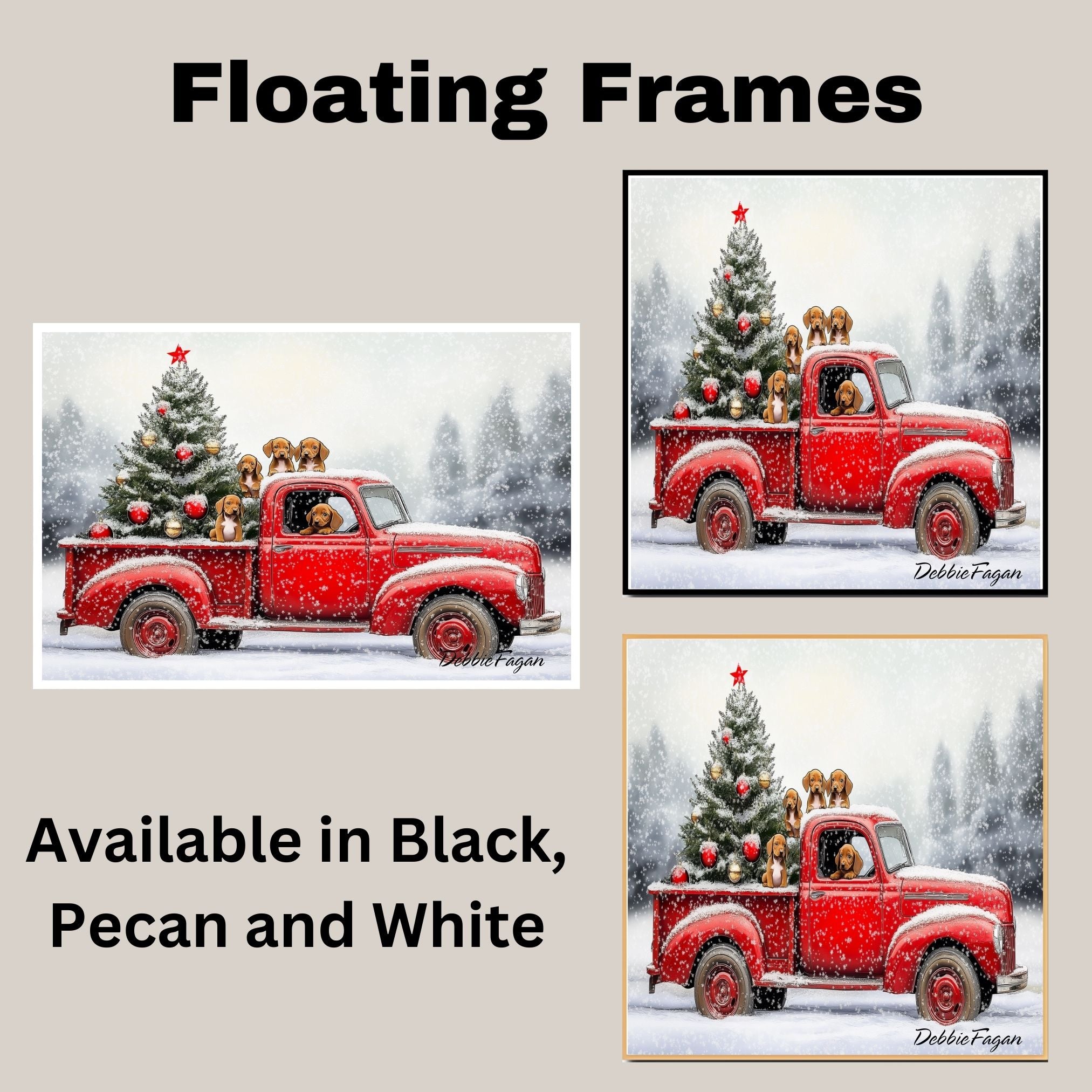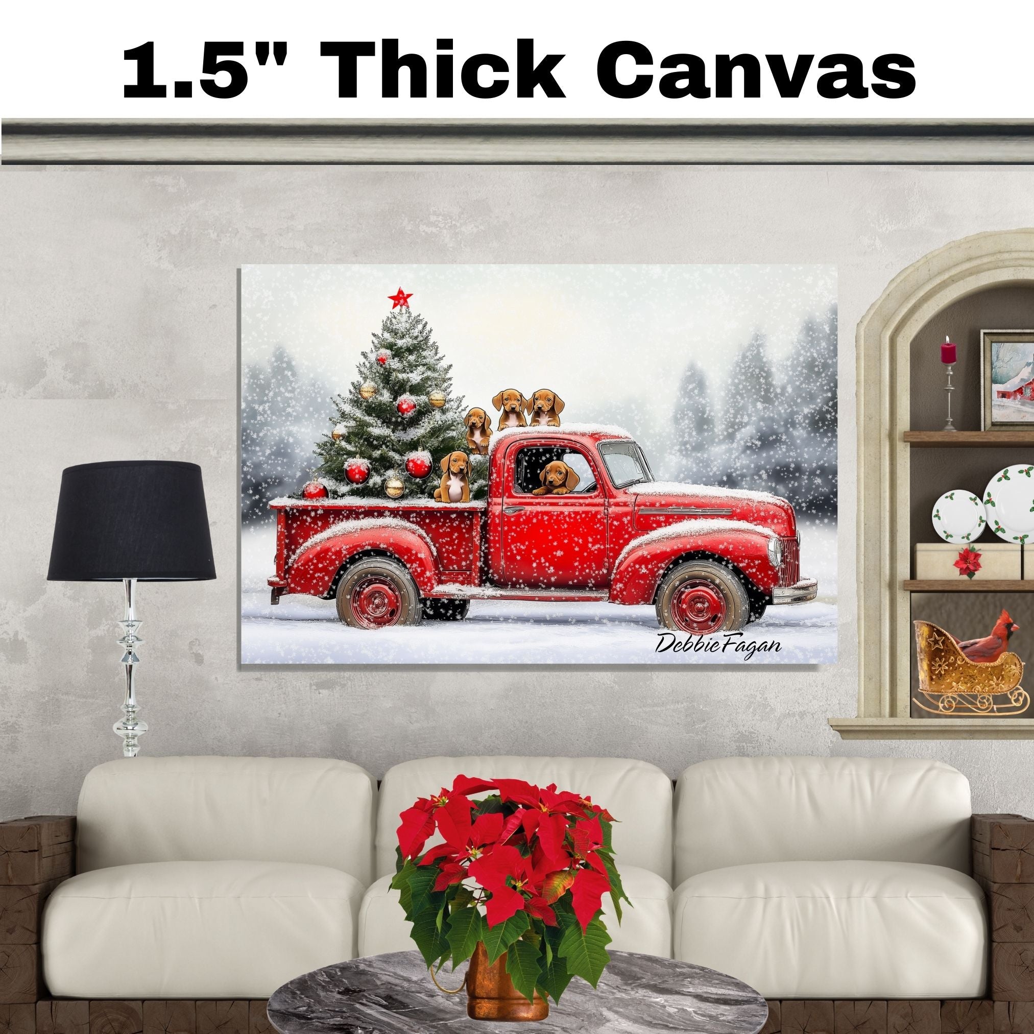 Vizsla Christmas Canvas - "Holiday Journey with Vizslas" - Puppies in a Festive Red Truck Canvas on Ready to Hang 1.5" Thick Canvas Wrap, Floating Framed Canvas, Flat Rolled Canvas