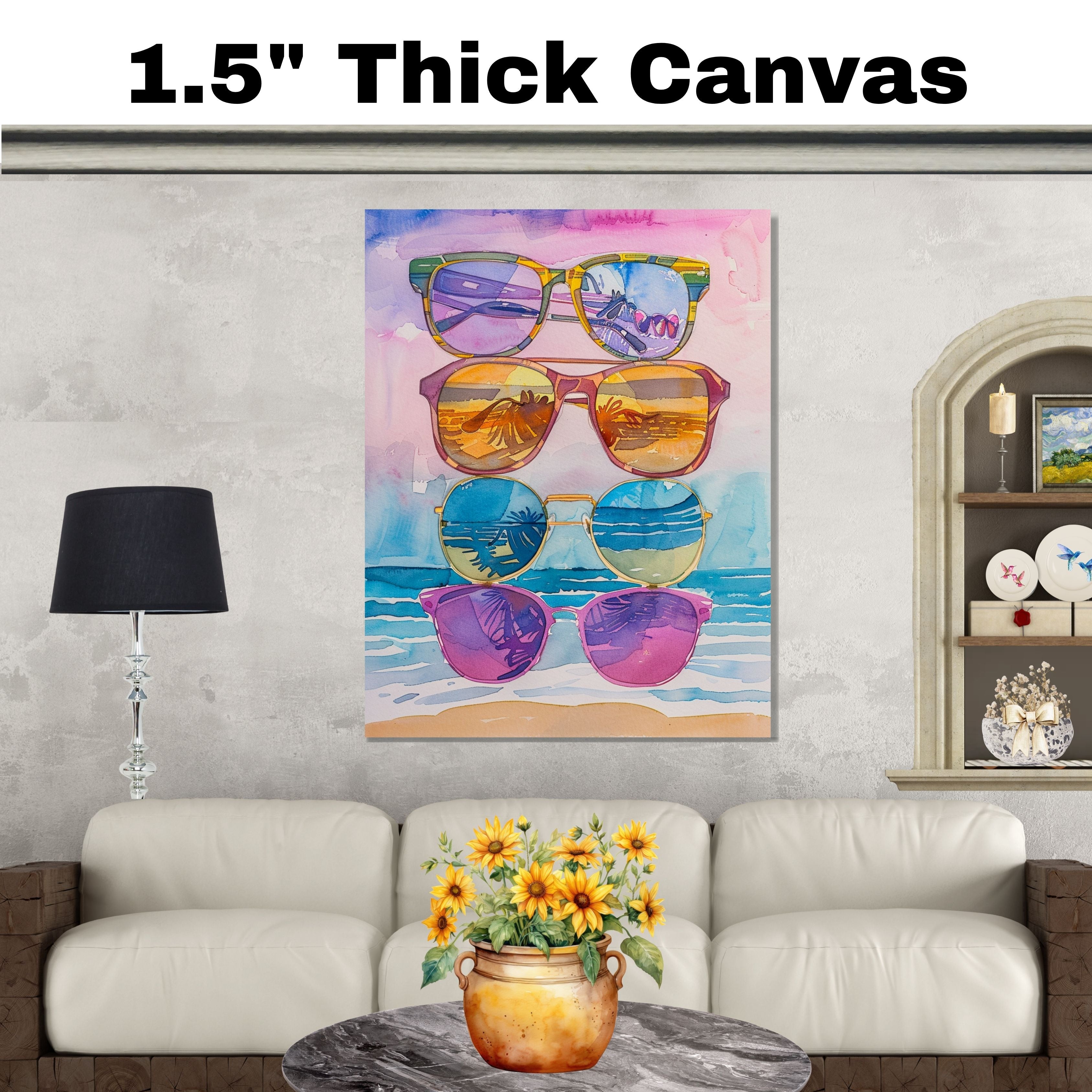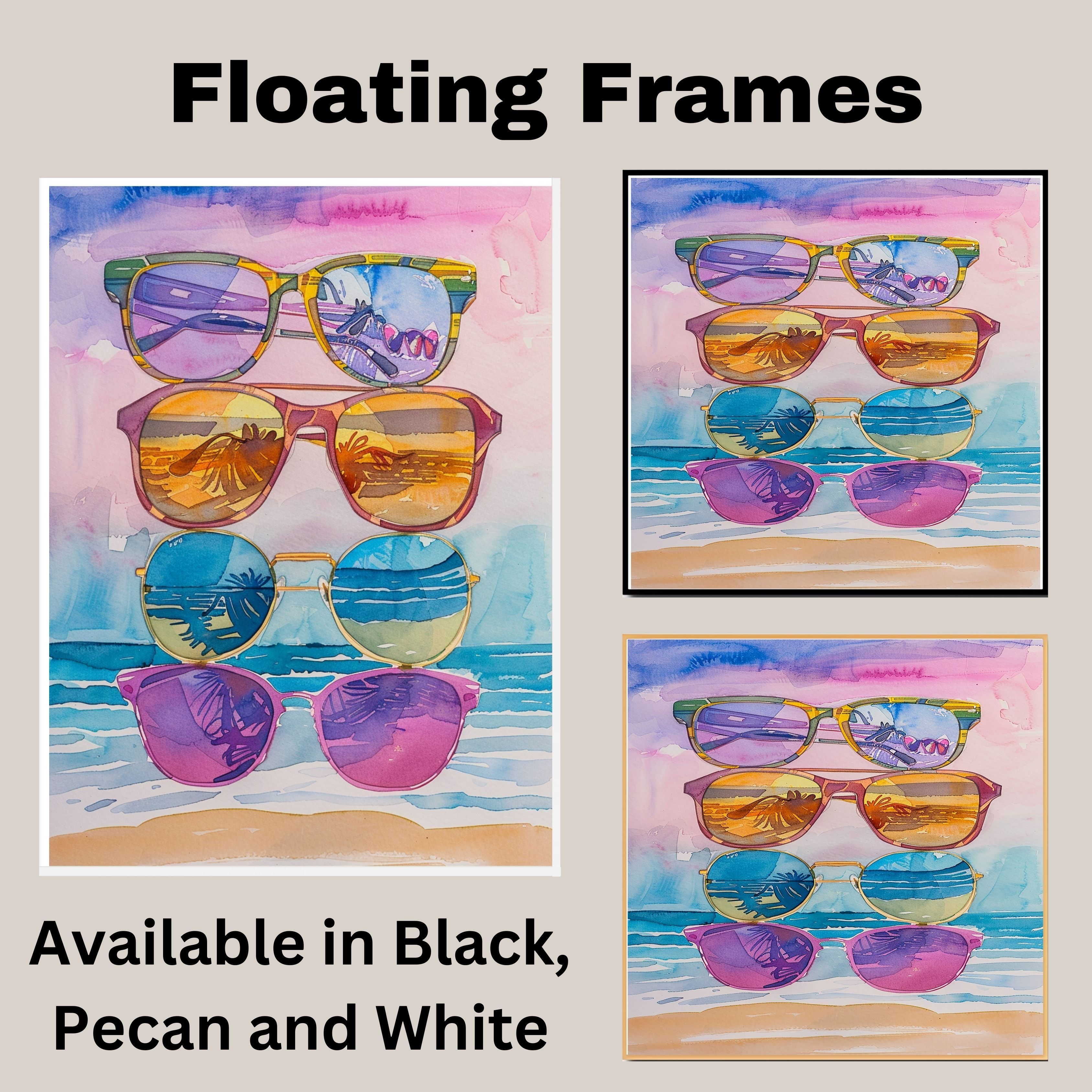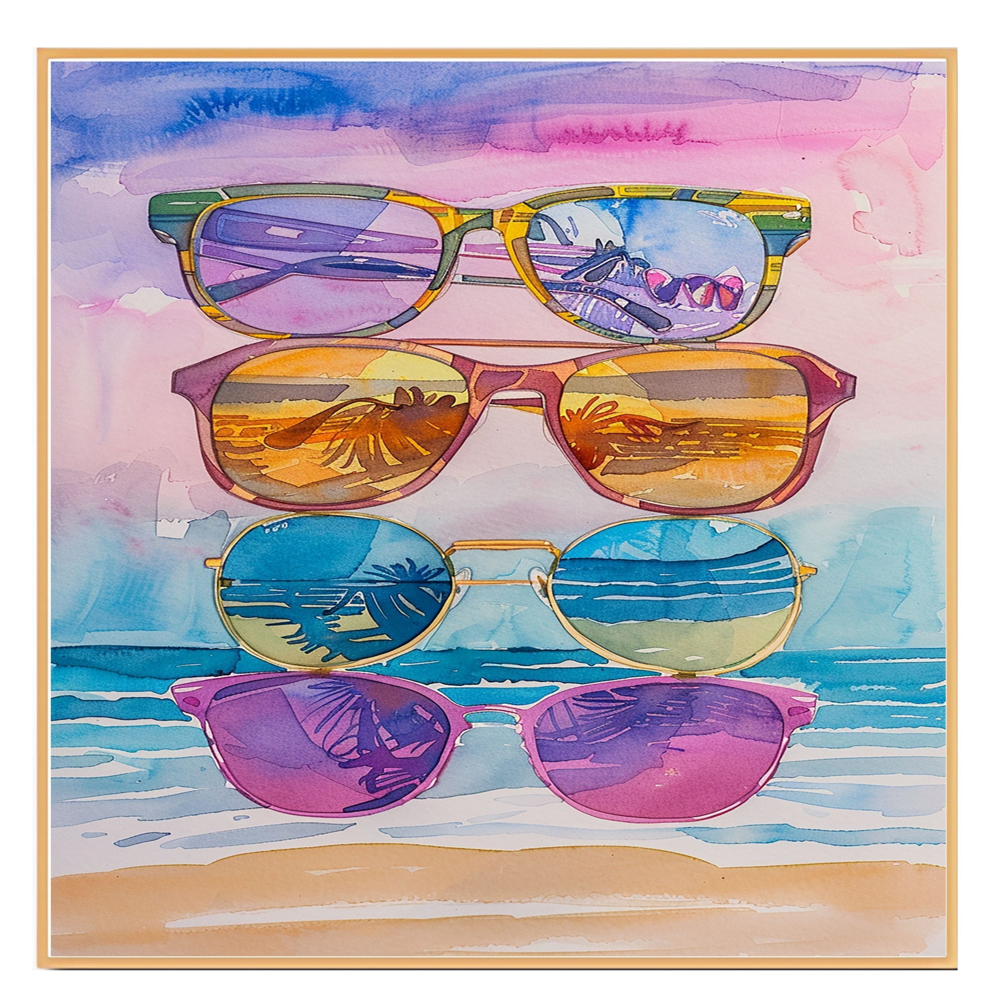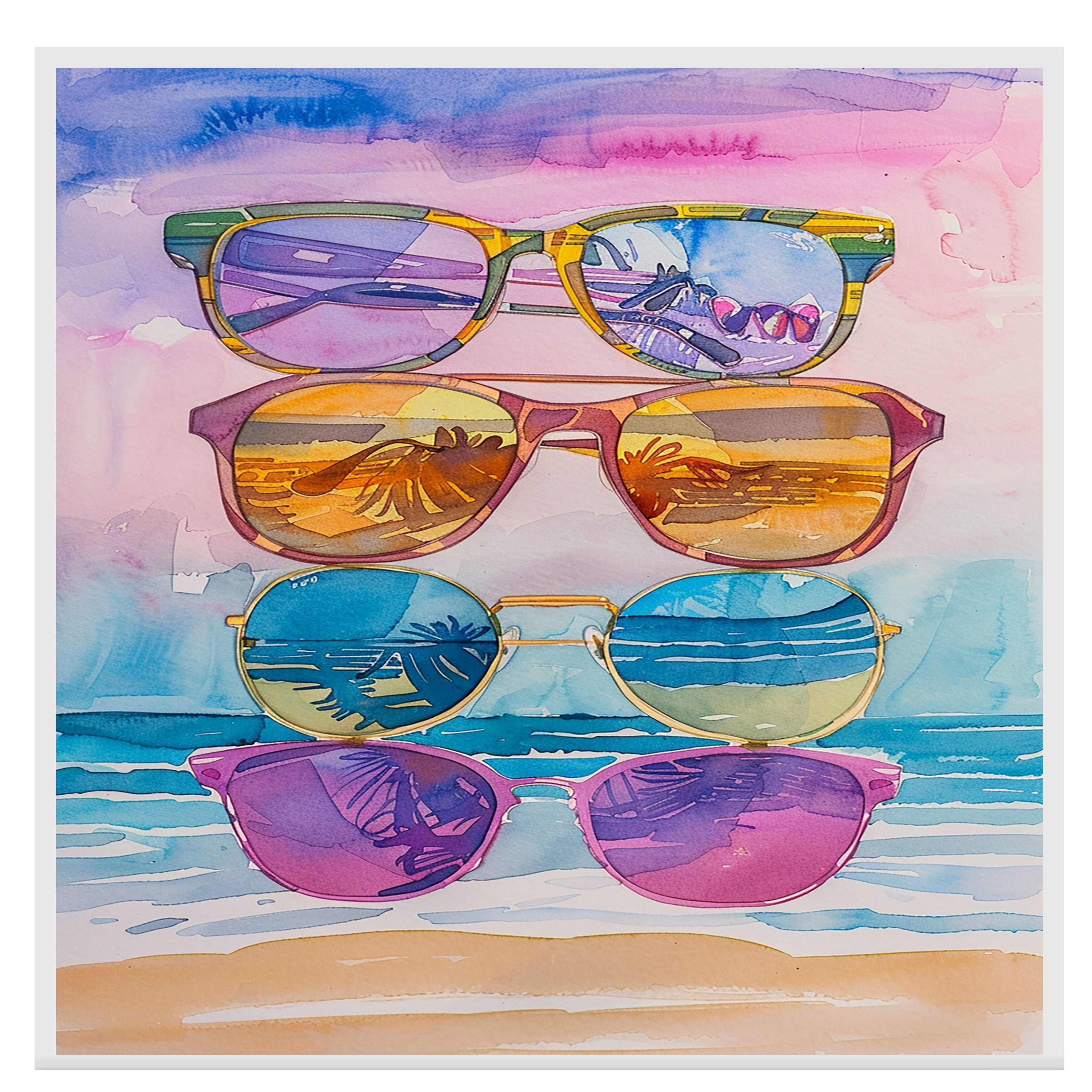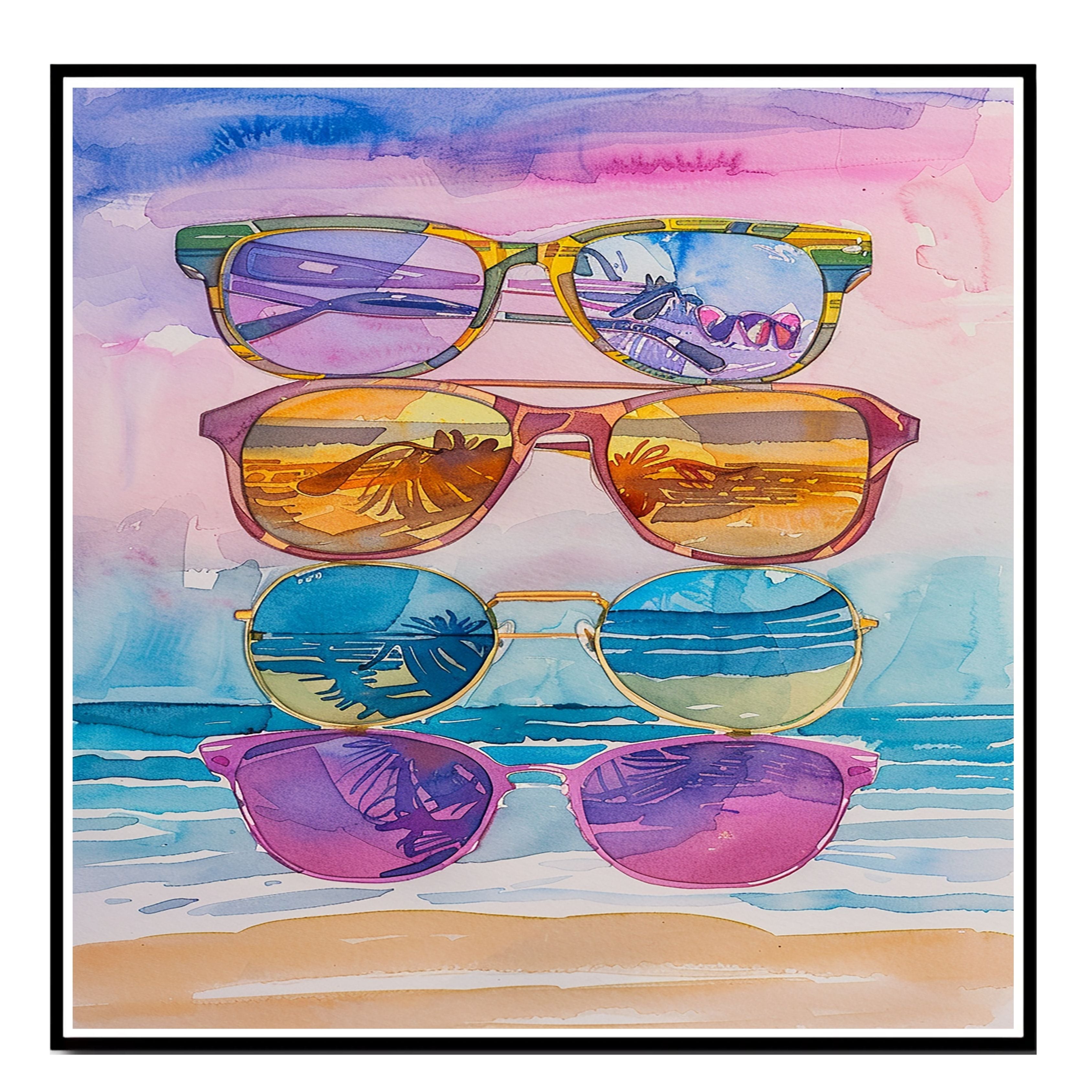 Bring tropical vibes into your space with this captivating watercolor painting featuring five stylish sunglasses stacked against a beach backdrop. Each lens reflects stunning views of palm trees, ocean waves, and golden sunsets, capturing the essence of a carefree summer day. Perfect for brightening up any room, this playful and colorful artwork is ideal for art lovers, beachgoers, and anyone who enjoys vibrant, coastal-inspired scenes.