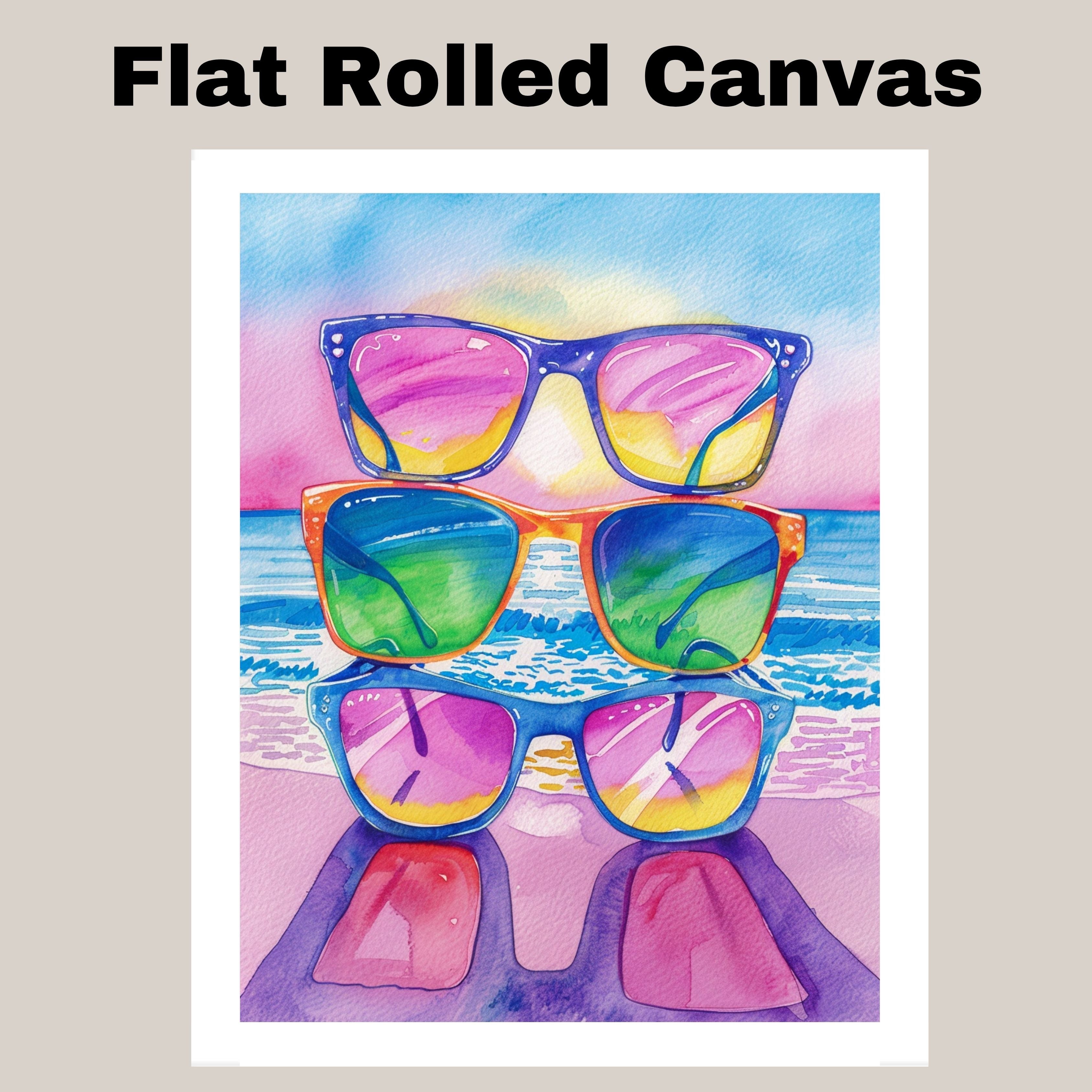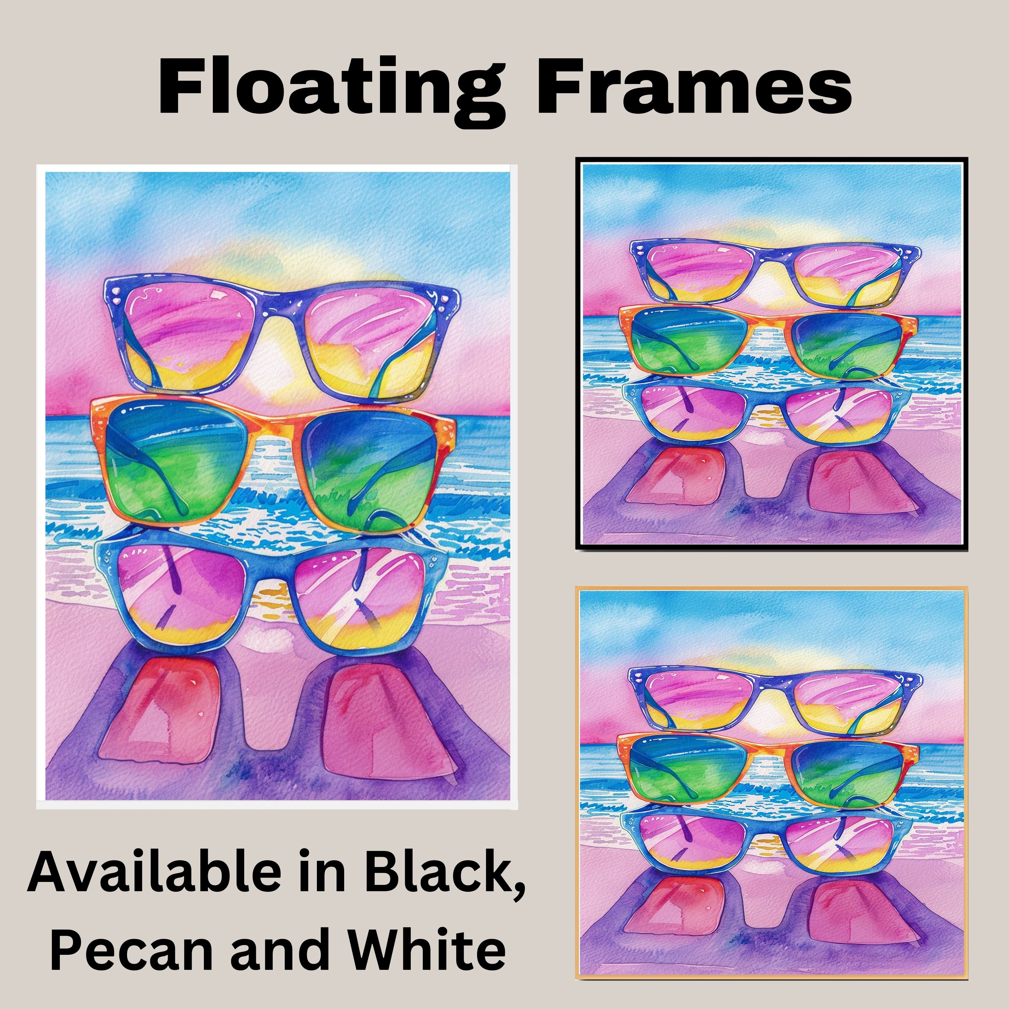 Watercolor Art of Three Vibrant Sunglasses Reflecting Ocean Sunset on a Tropical Beach in Summer Colors on Ready to Hang 1.5" Thick Canvas Wrap, Floating Framed Canvas, Flat Rolled Canvas