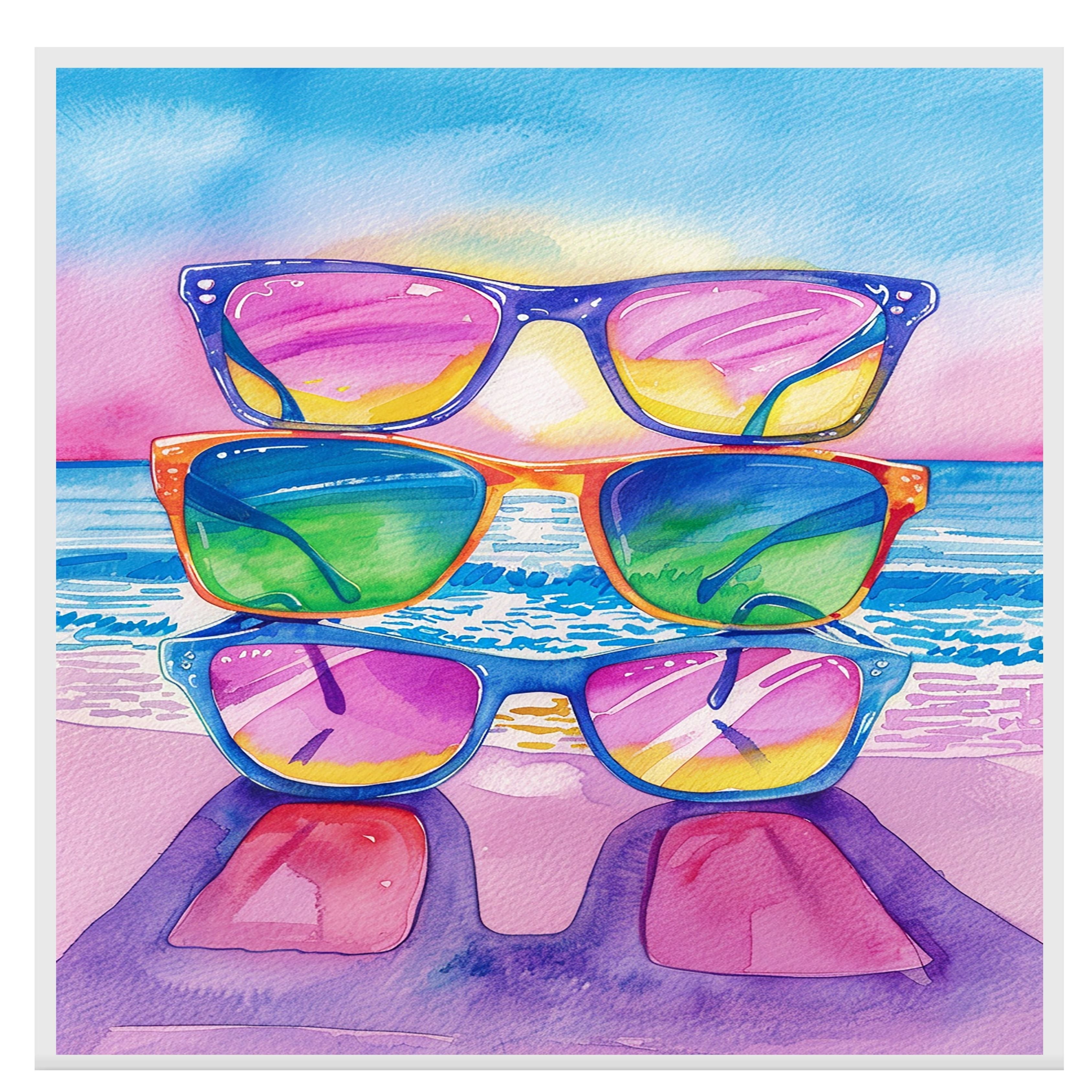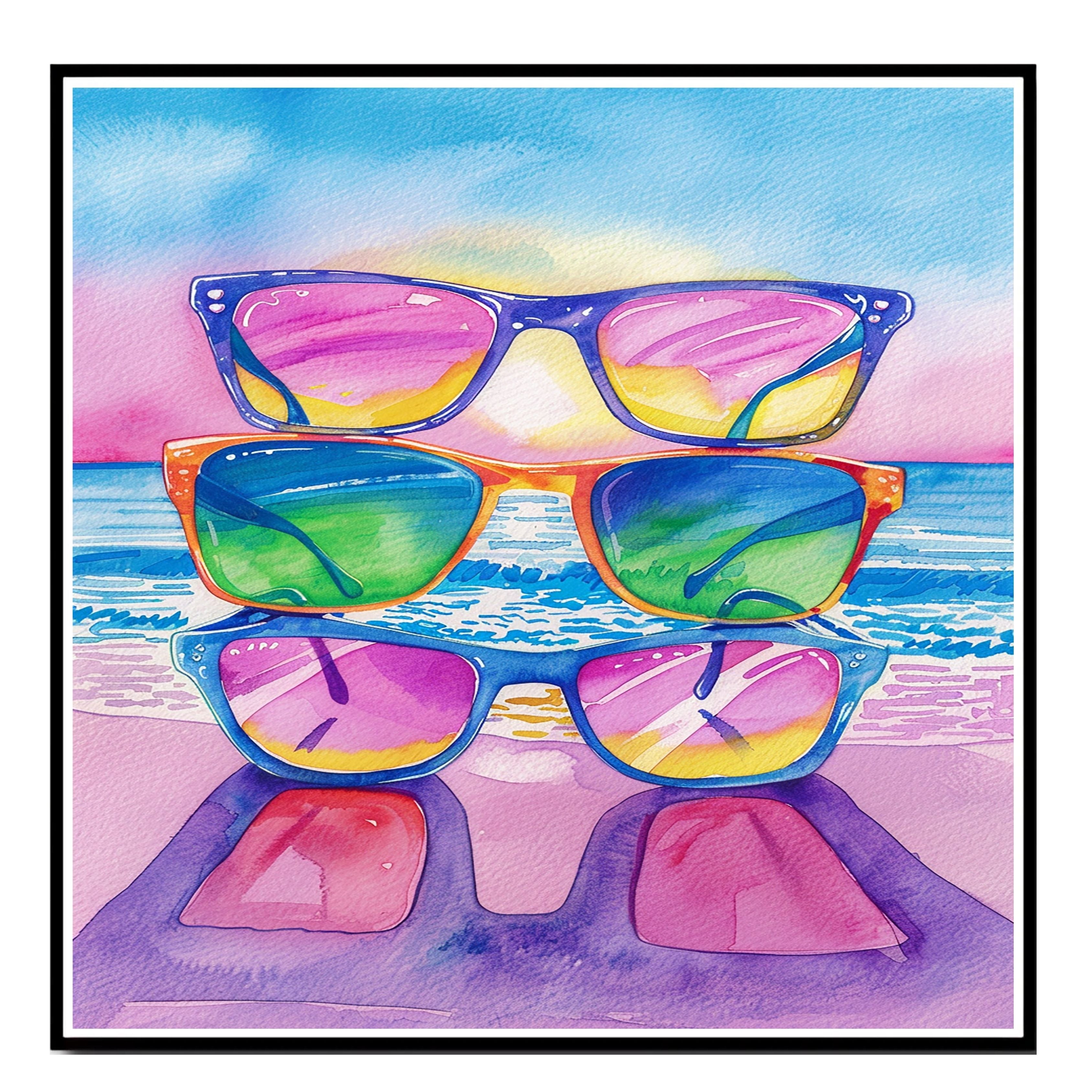 Brighten your space with this cheerful watercolor illustration showcasing three stylish sunglasses stacked in front of a glowing ocean sunset. The bold colors and reflections capture the playful essence of a beachside summer day. Ideal for adding a pop of color and a relaxed coastal vibe to any room, this artwork is a unique gift idea for sun seekers, travelers, or anyone who loves beach aesthetics and artistic flair.