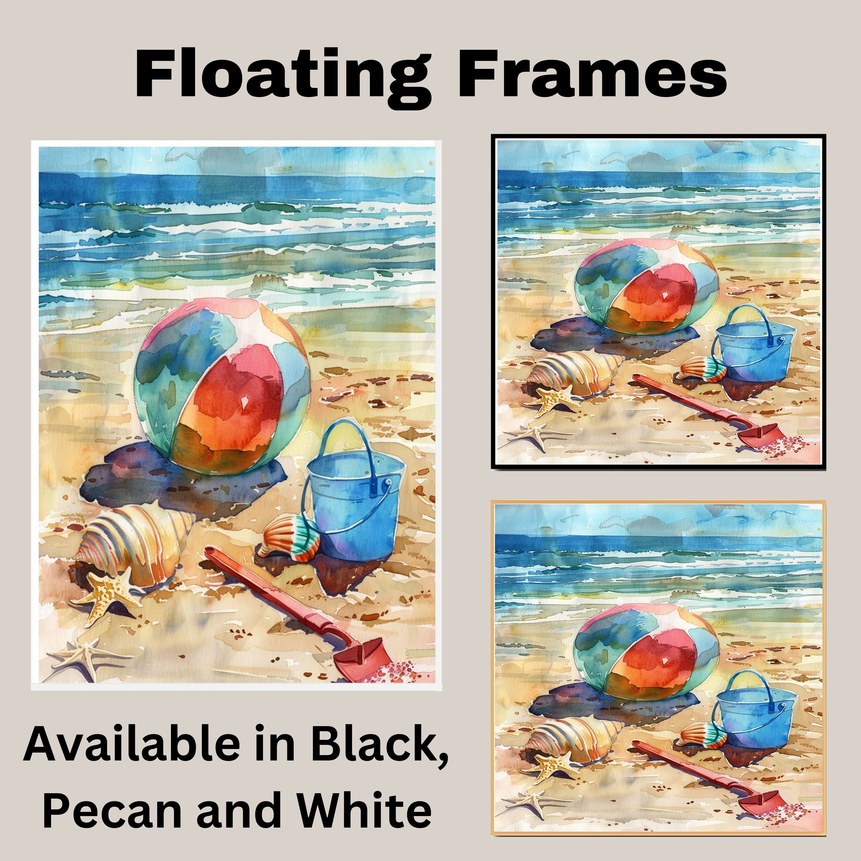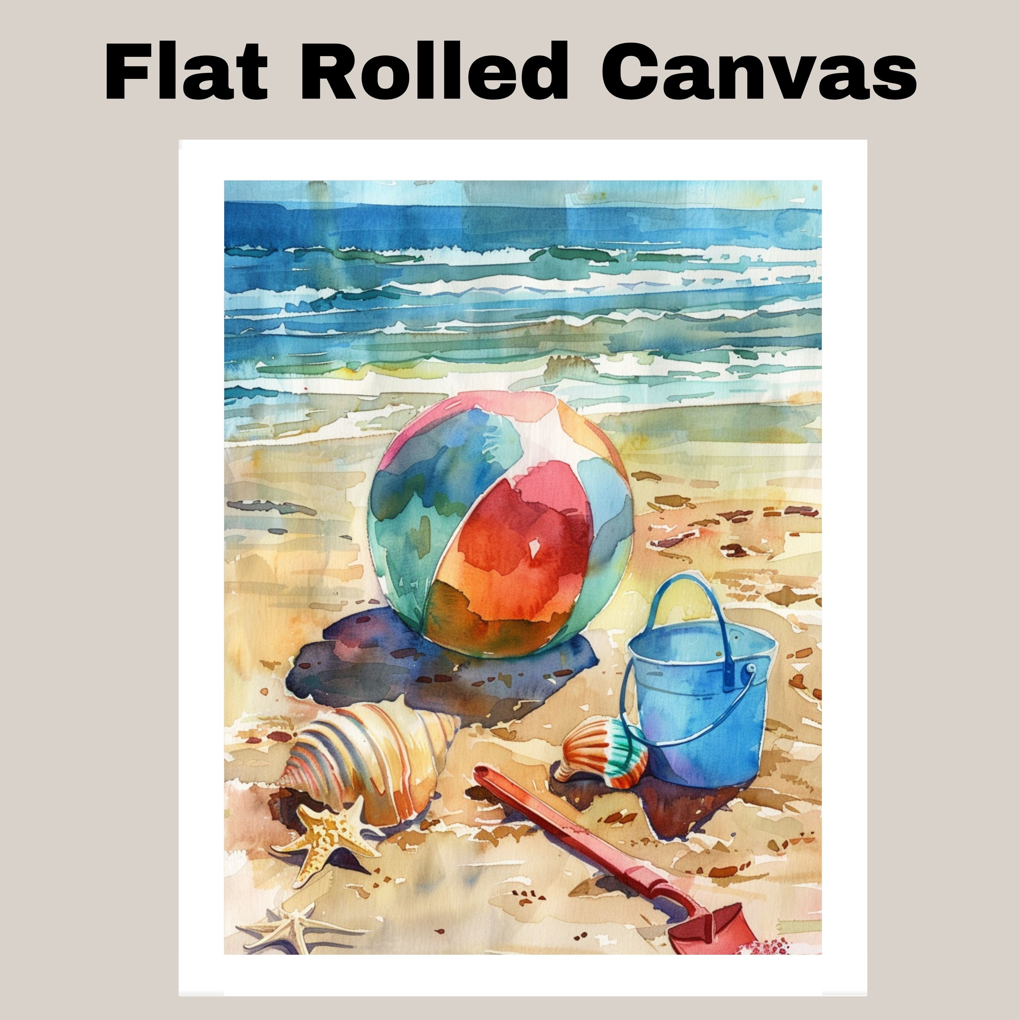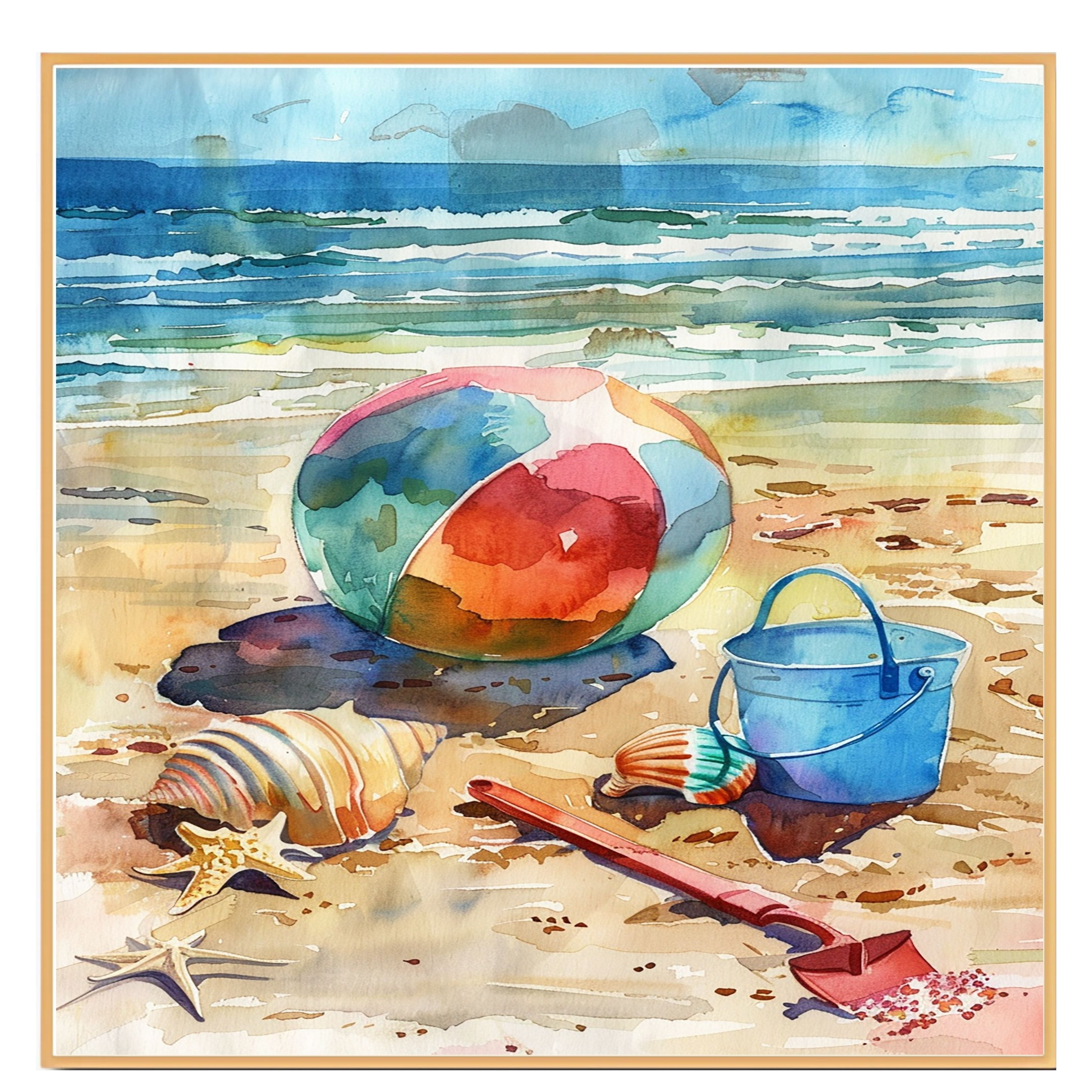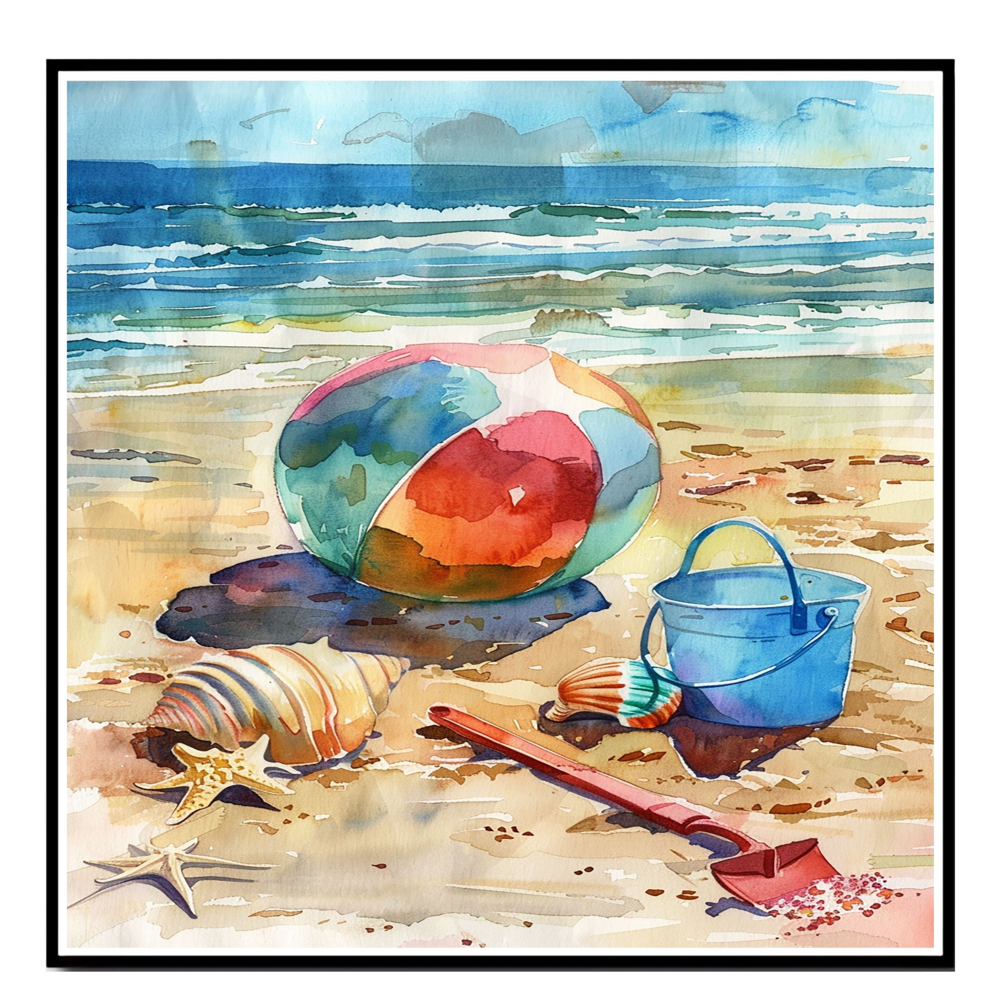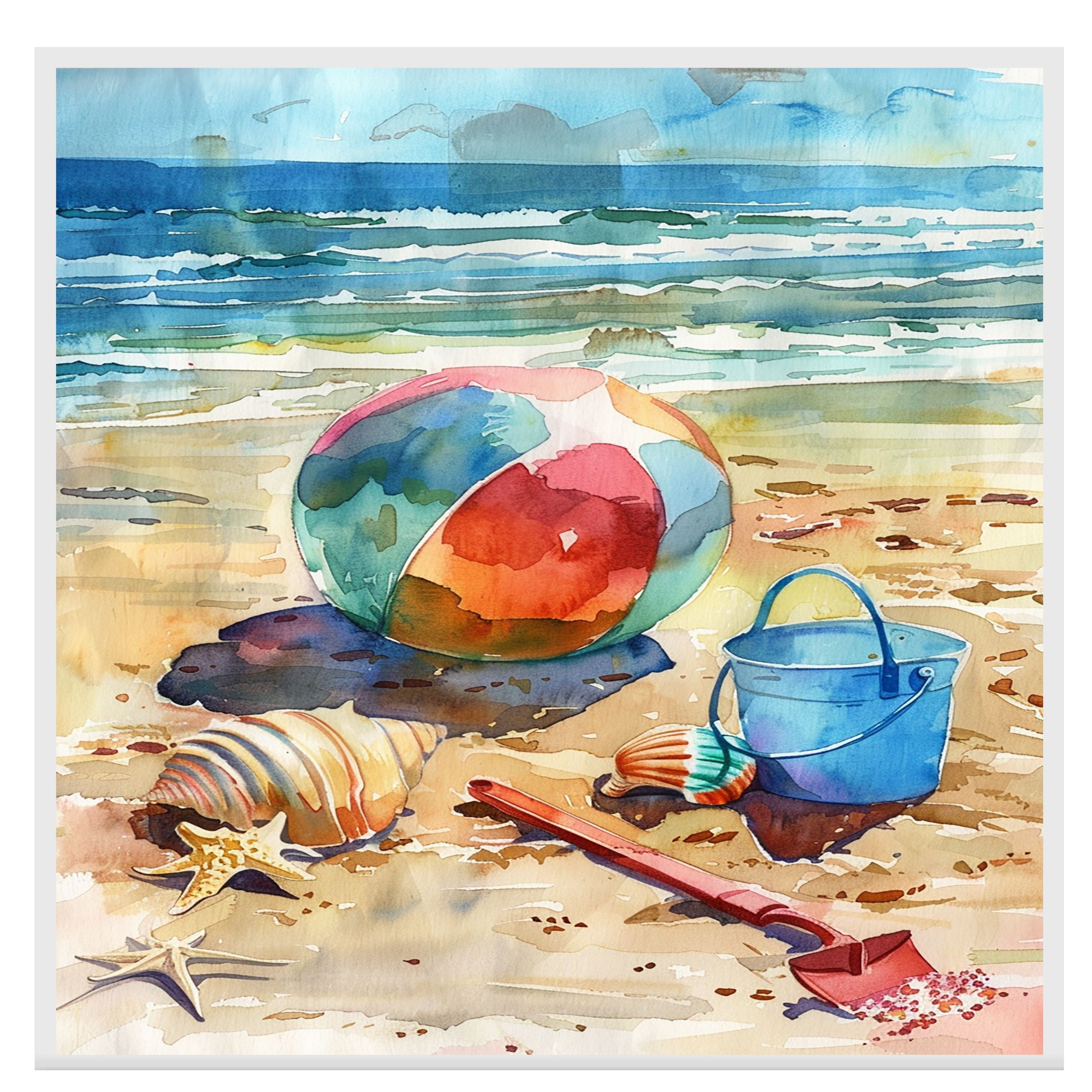 Enjoy the relaxing vibe of summer with this charming watercolor painting featuring a beach ball, starfish, seashells, a blue bucket, and a red shovel on a sandy shore. The vivid colors and gentle waves in the background capture the joy of a sunny beach day. Perfect for adding a splash of fun and warmth to any space, this artwork celebrates the beauty and nostalgia of seaside adventures.