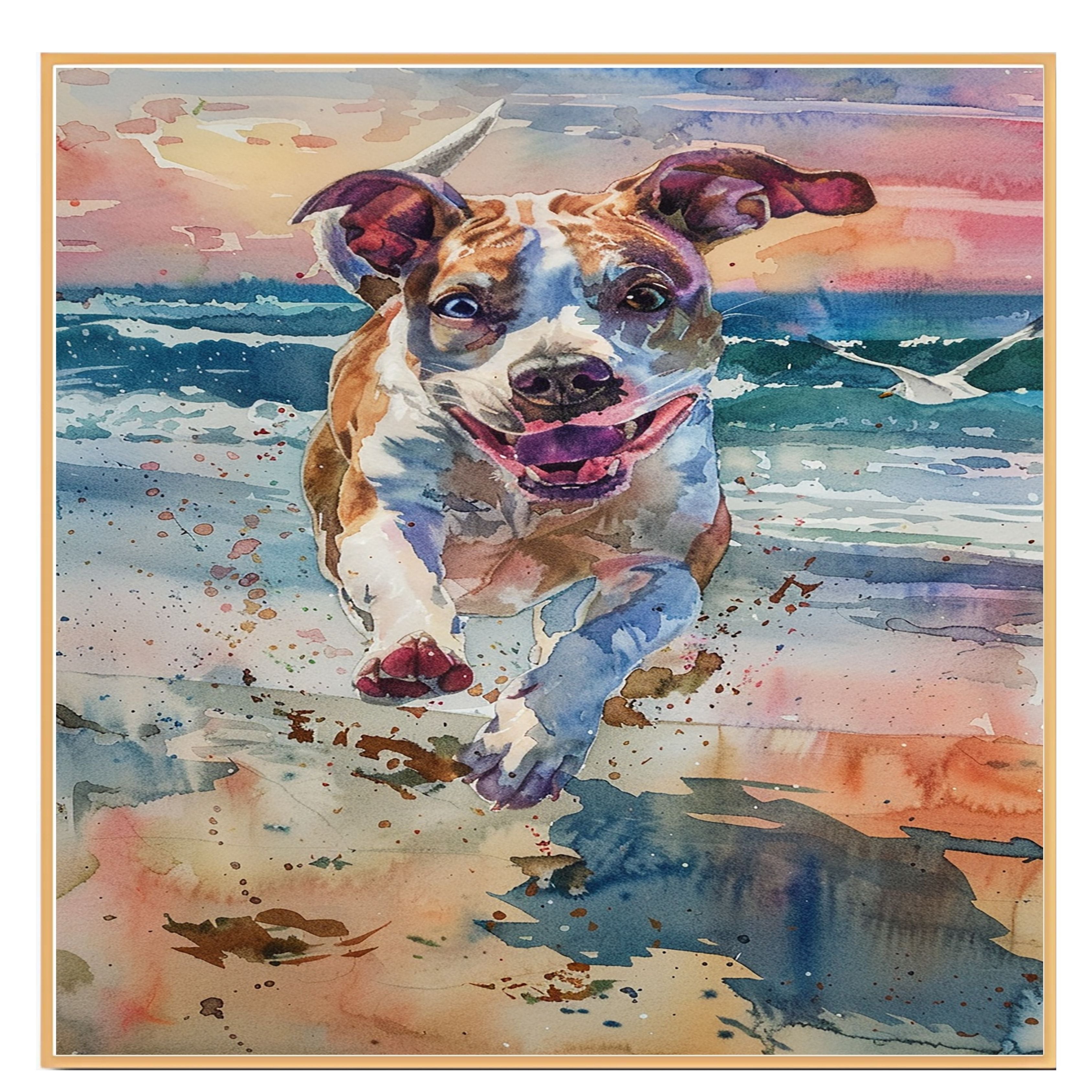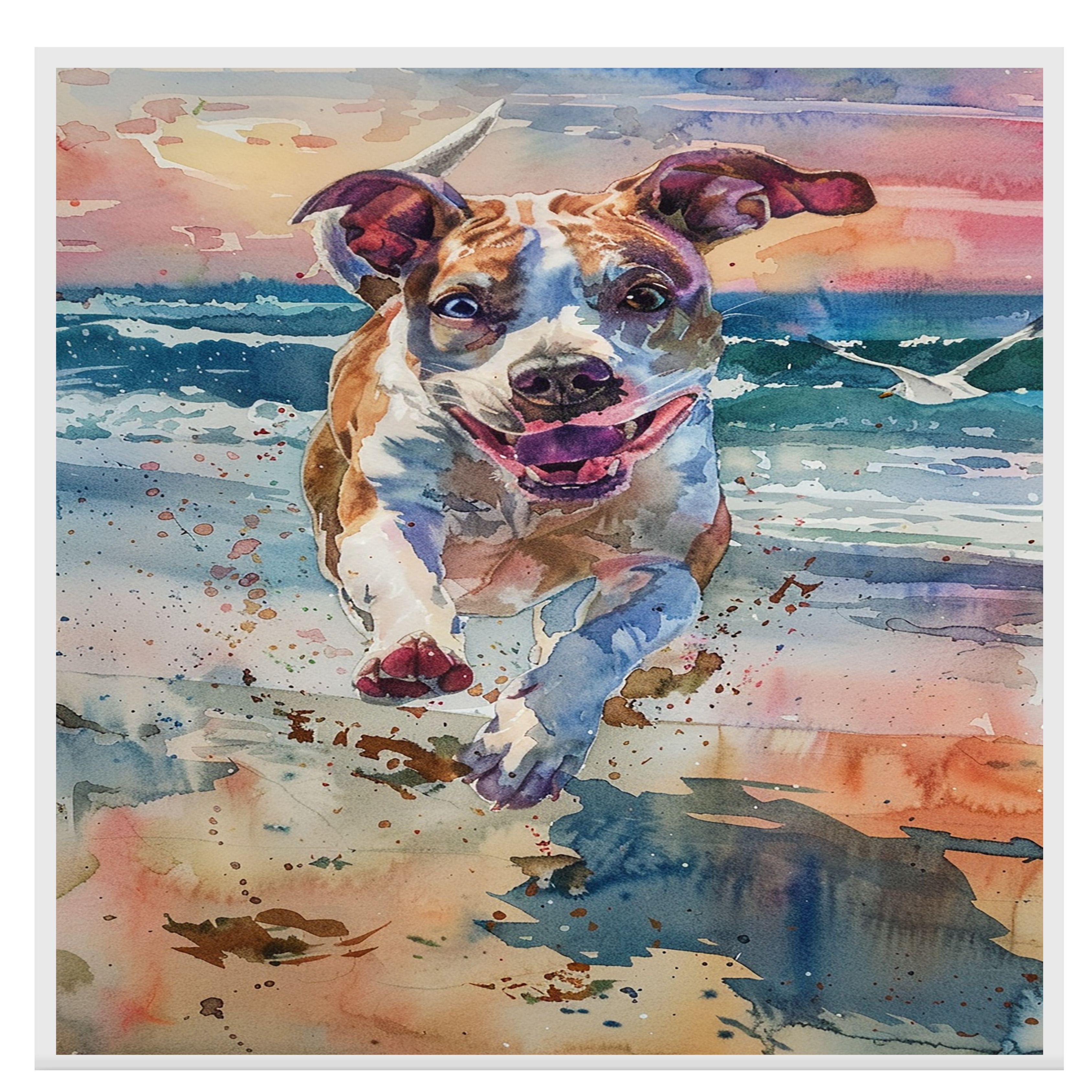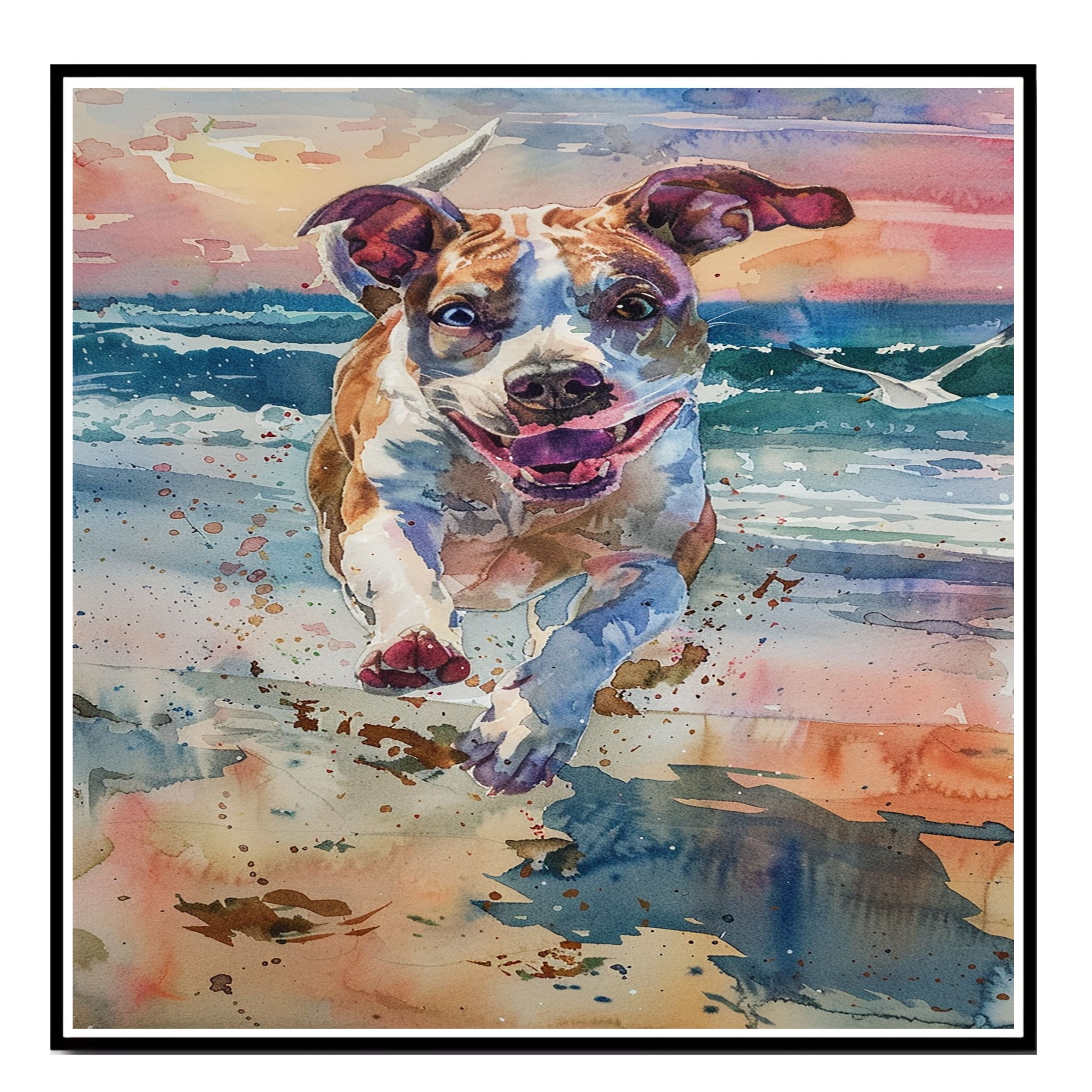 This lively watercolor artwork features a cheerful dog running full-speed along the beach with waves crashing behind and a stunning sky above. Rich in color and movement, this piece perfectly captures beachside joy—ideal for pet lovers and coastal-themed interiors.