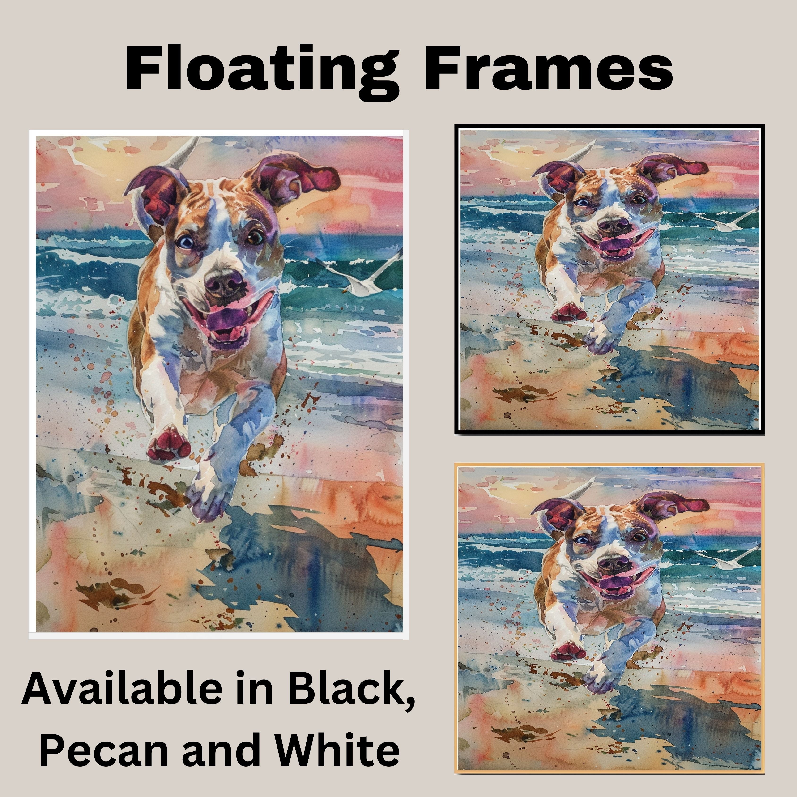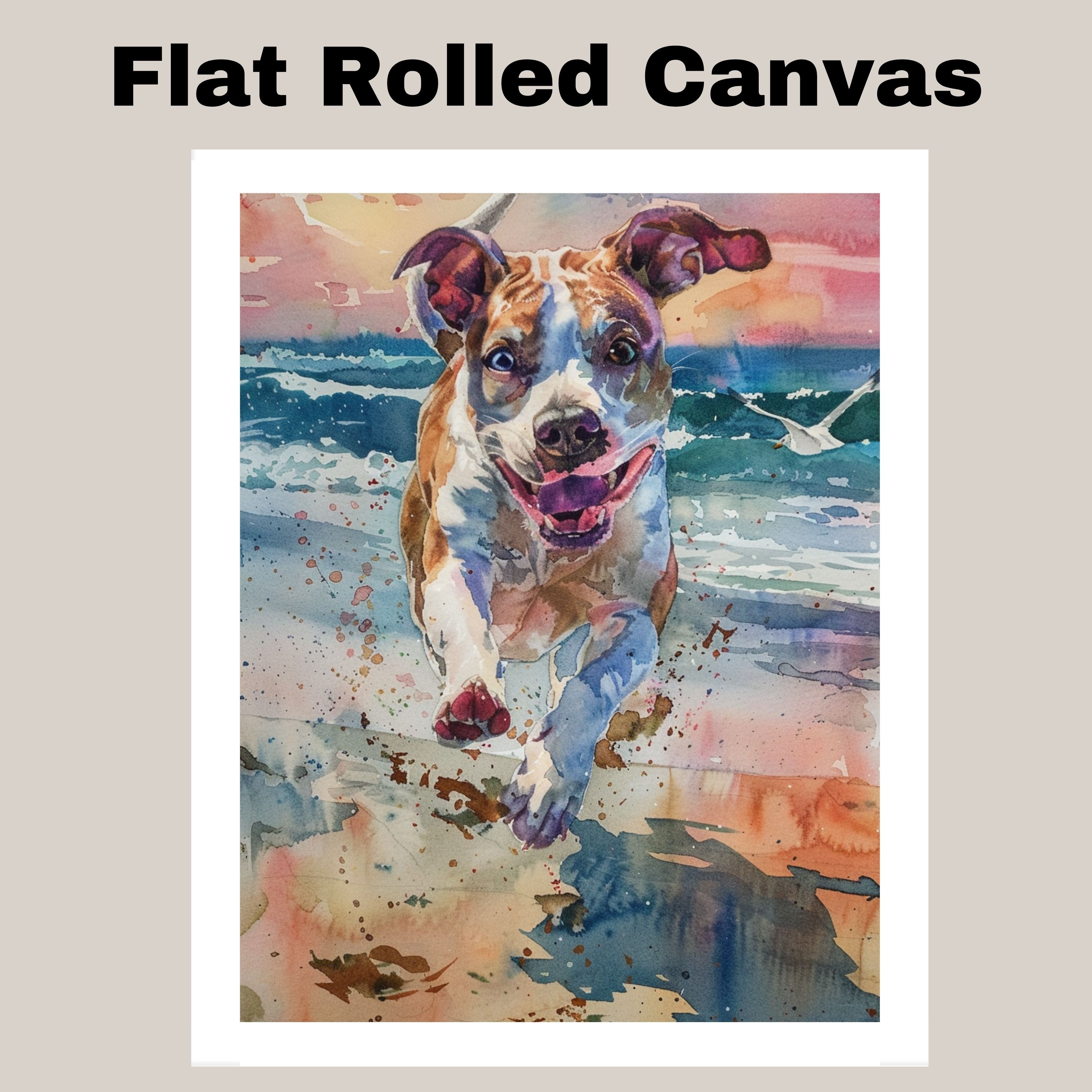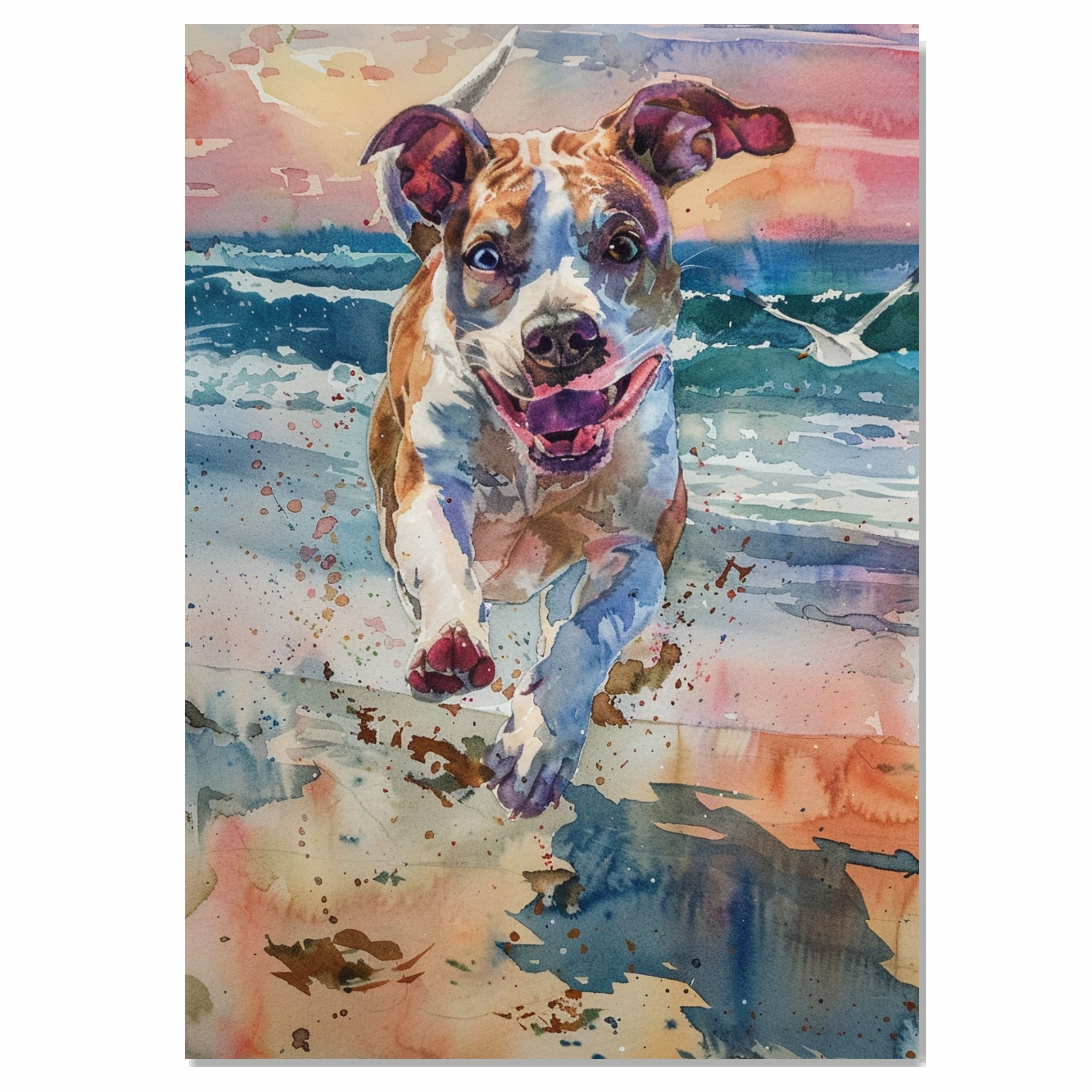 This lively watercolor artwork features a cheerful dog running full-speed along the beach with waves crashing behind and a stunning sky above. Rich in color and movement, this piece perfectly captures beachside joy—ideal for pet lovers and coastal-themed interiors.