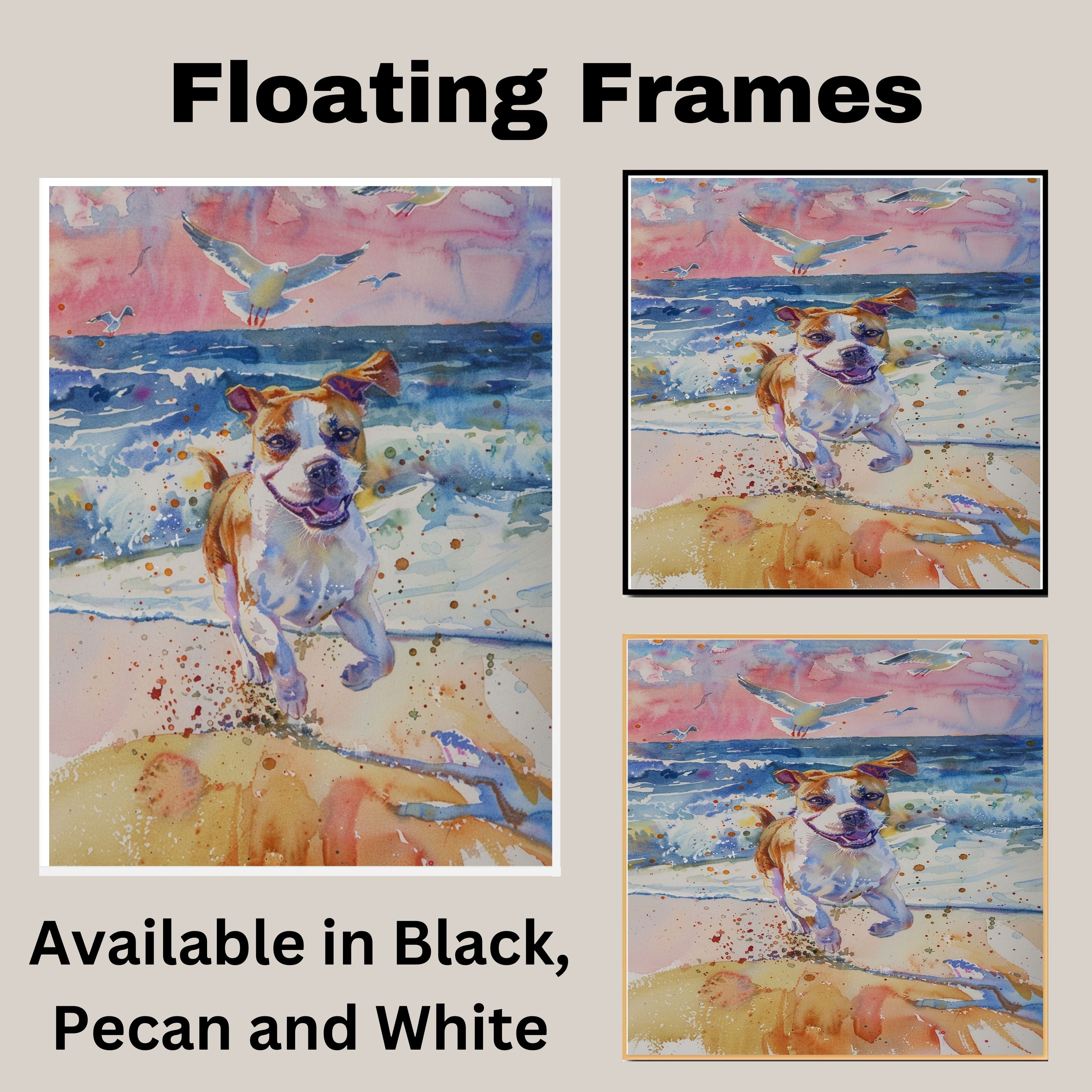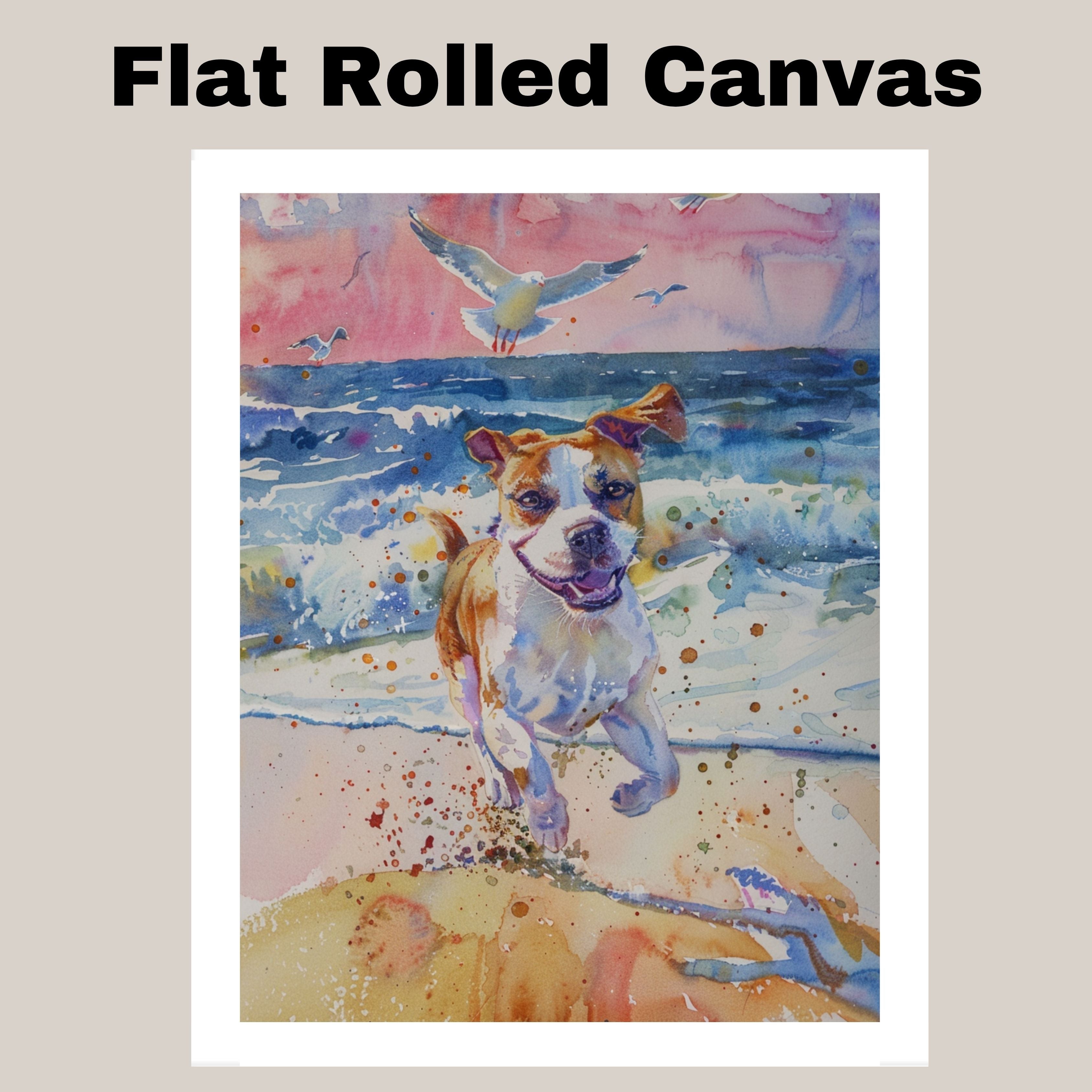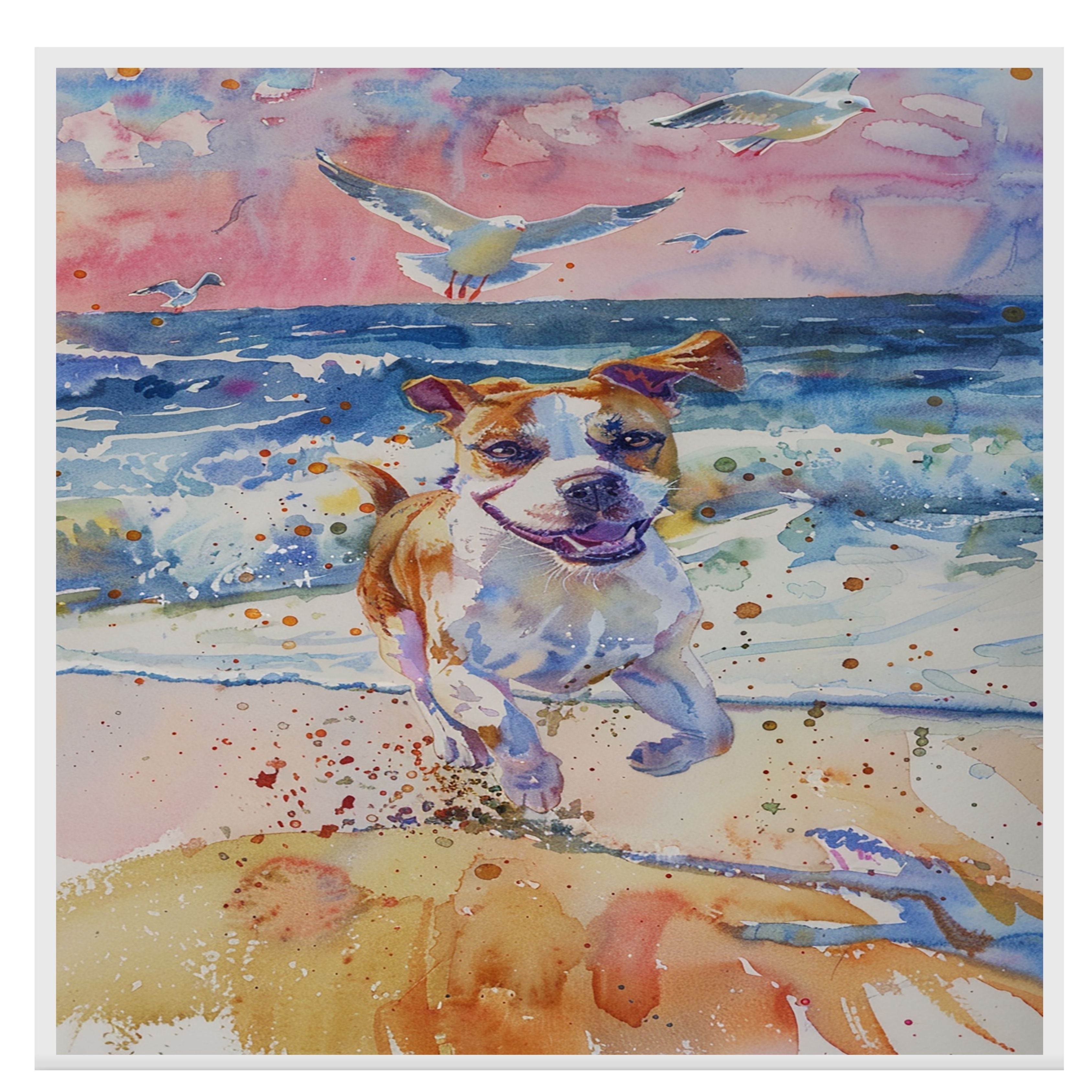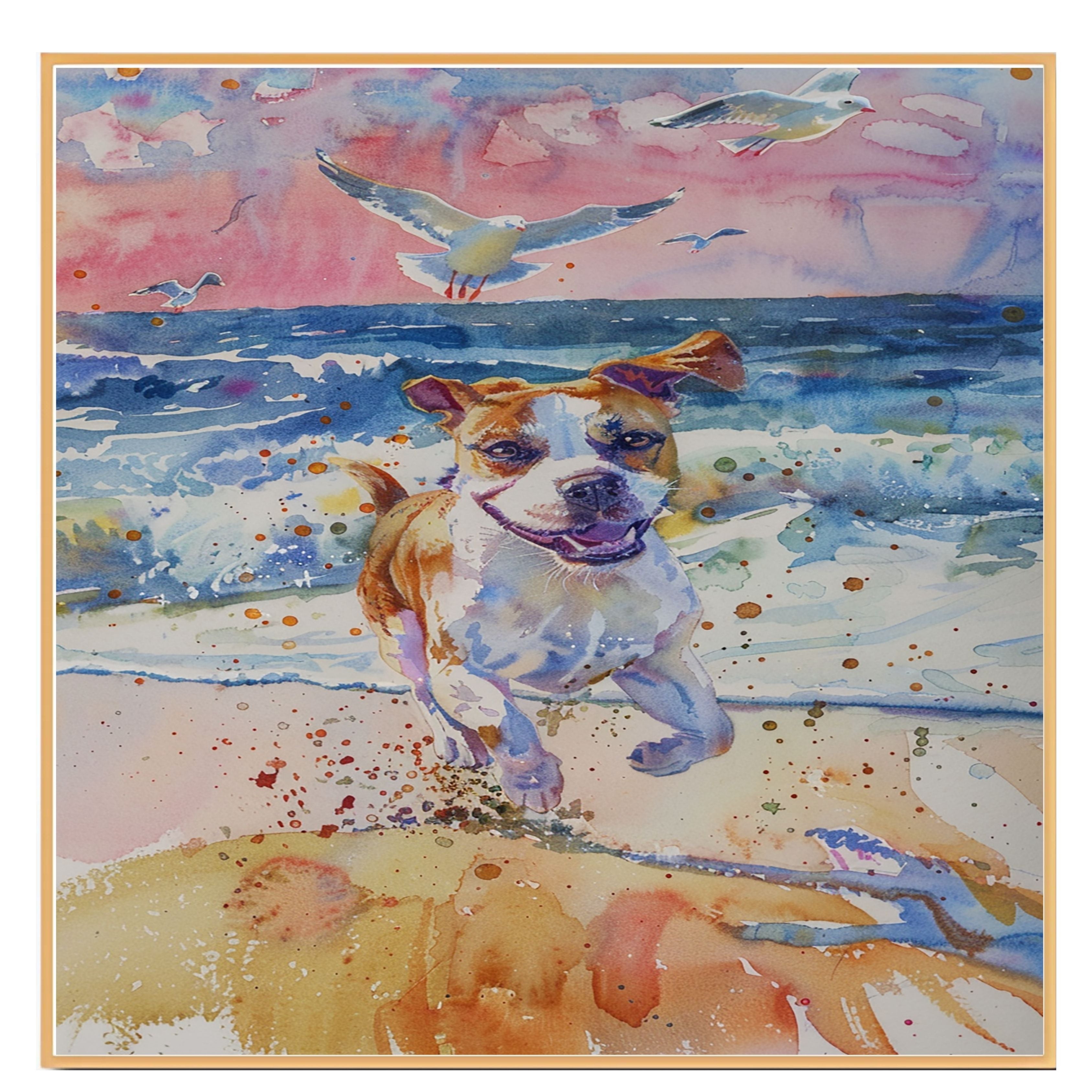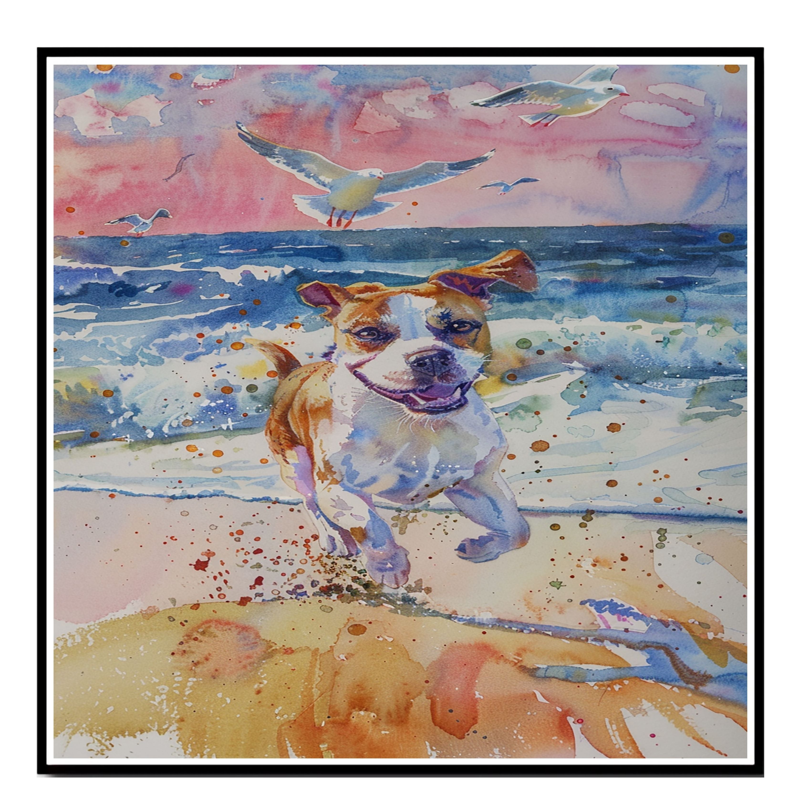 Full of motion and joy, this watercolor captures a playful dog dashing along the surf with waves crashing and birds soaring overhead. Bright, energetic, and beautifully detailed, it’s the perfect artwork for dog lovers, beach homes, or anyone who loves the spirit of the seaside.