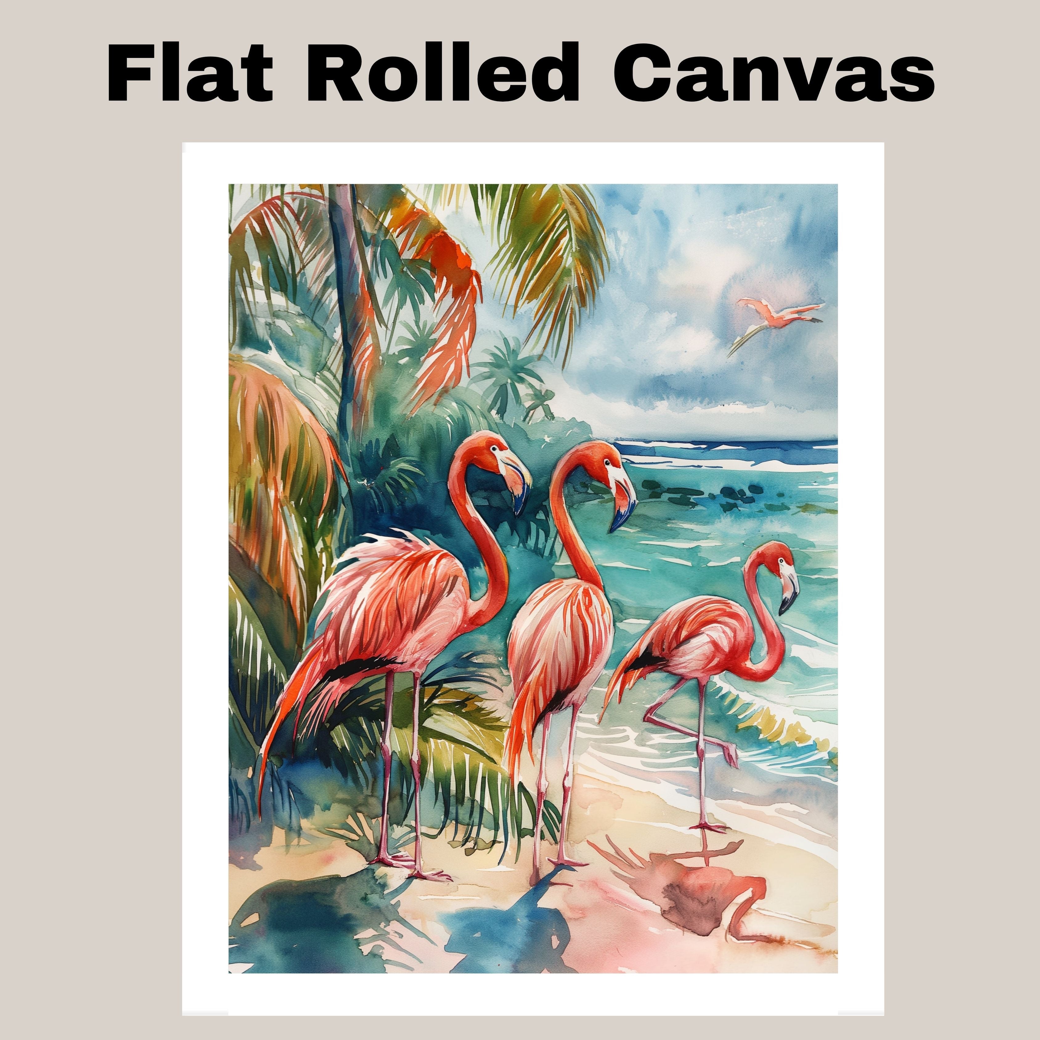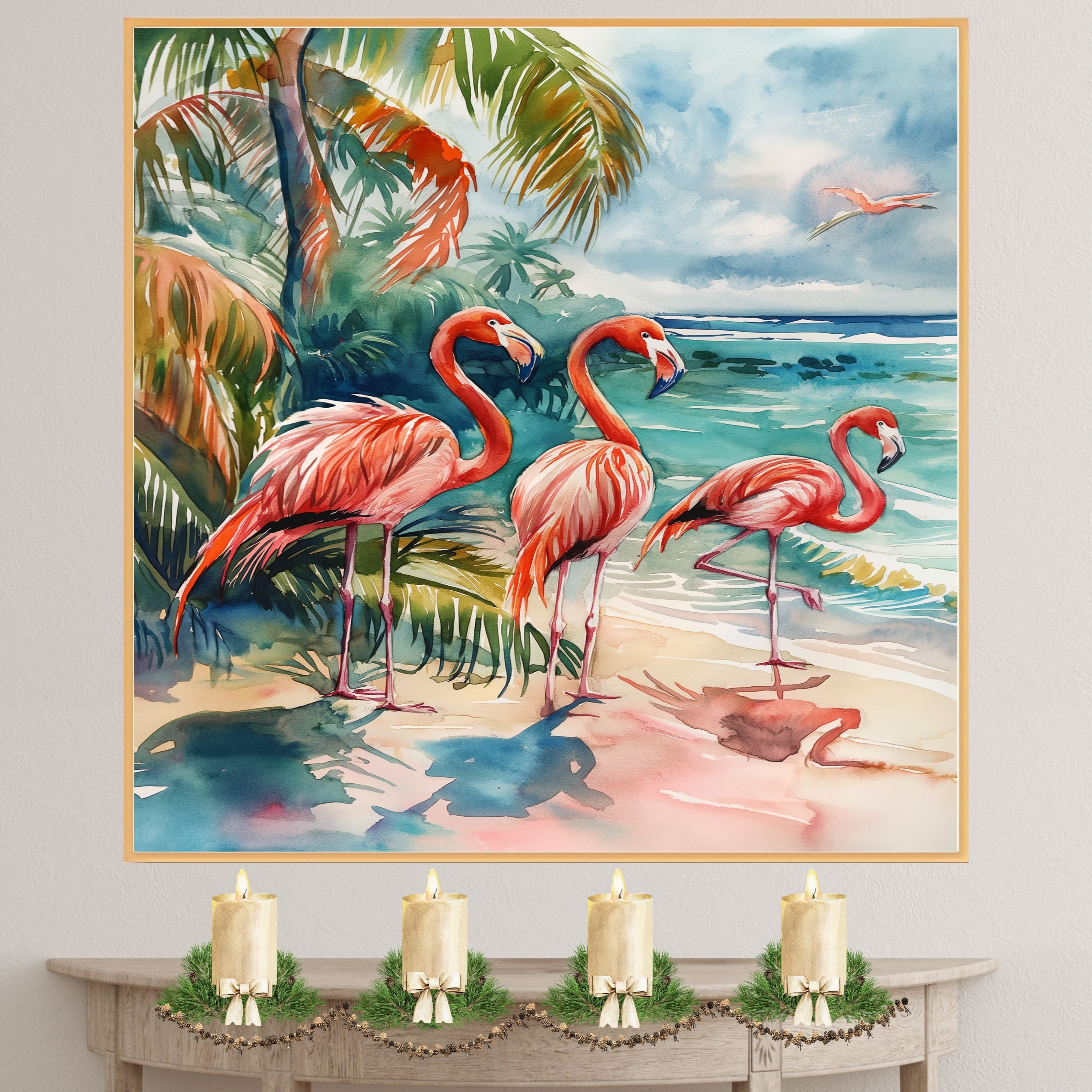 Immerse yourself in coastal serenity with this vibrant watercolor of flamingos wading along a tropical shoreline. Surrounded by palm trees and ocean waves, this artwork evokes the beauty and calm of the seaside, making it a perfect statement for any coastal or beach-inspired space.