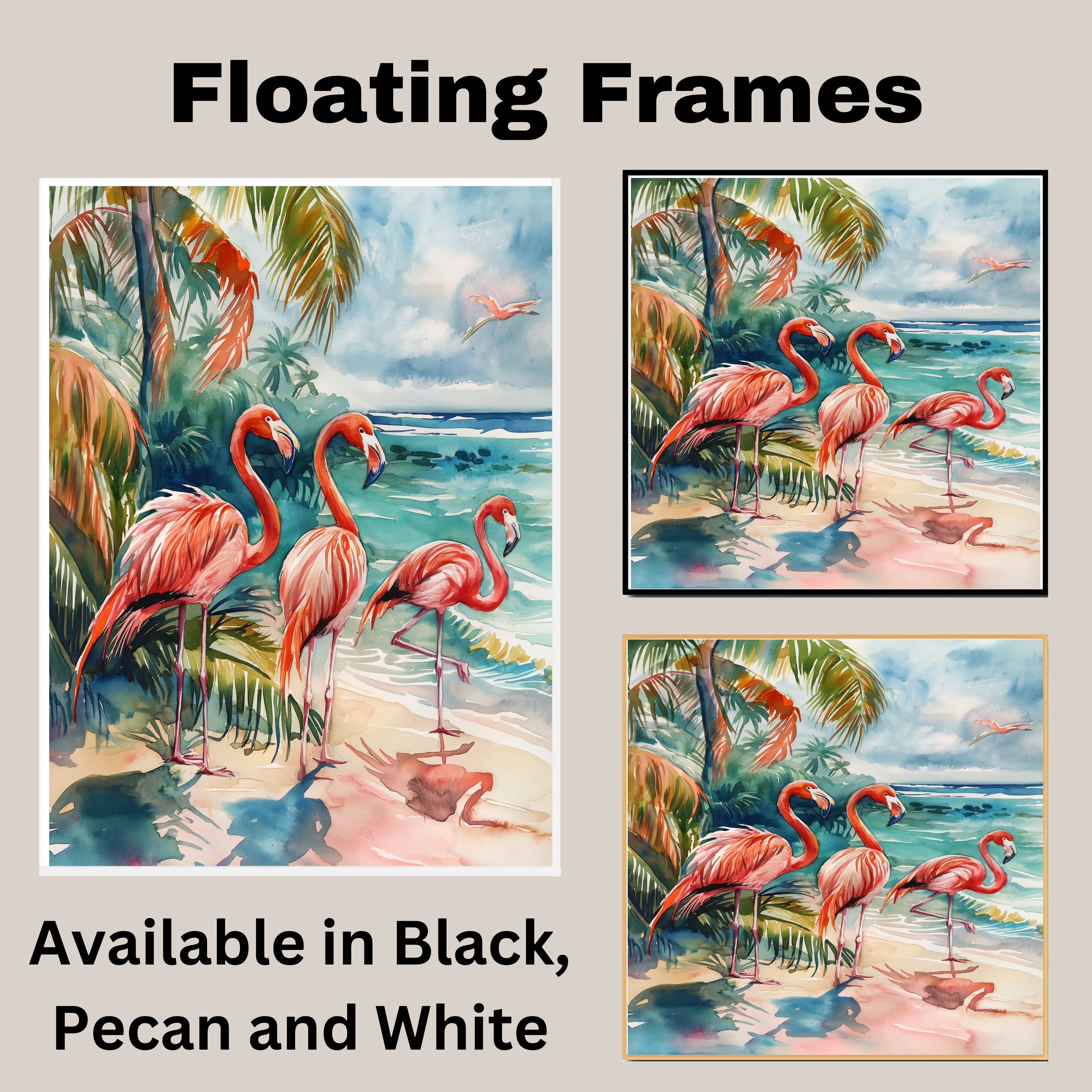 1.5" Thick Floating Framed Canvas: Available in Black, Pecan, and White Grain. Durable shrink-resistant frame. Comes with easy-to-install hanging kits, ready for immediate display.