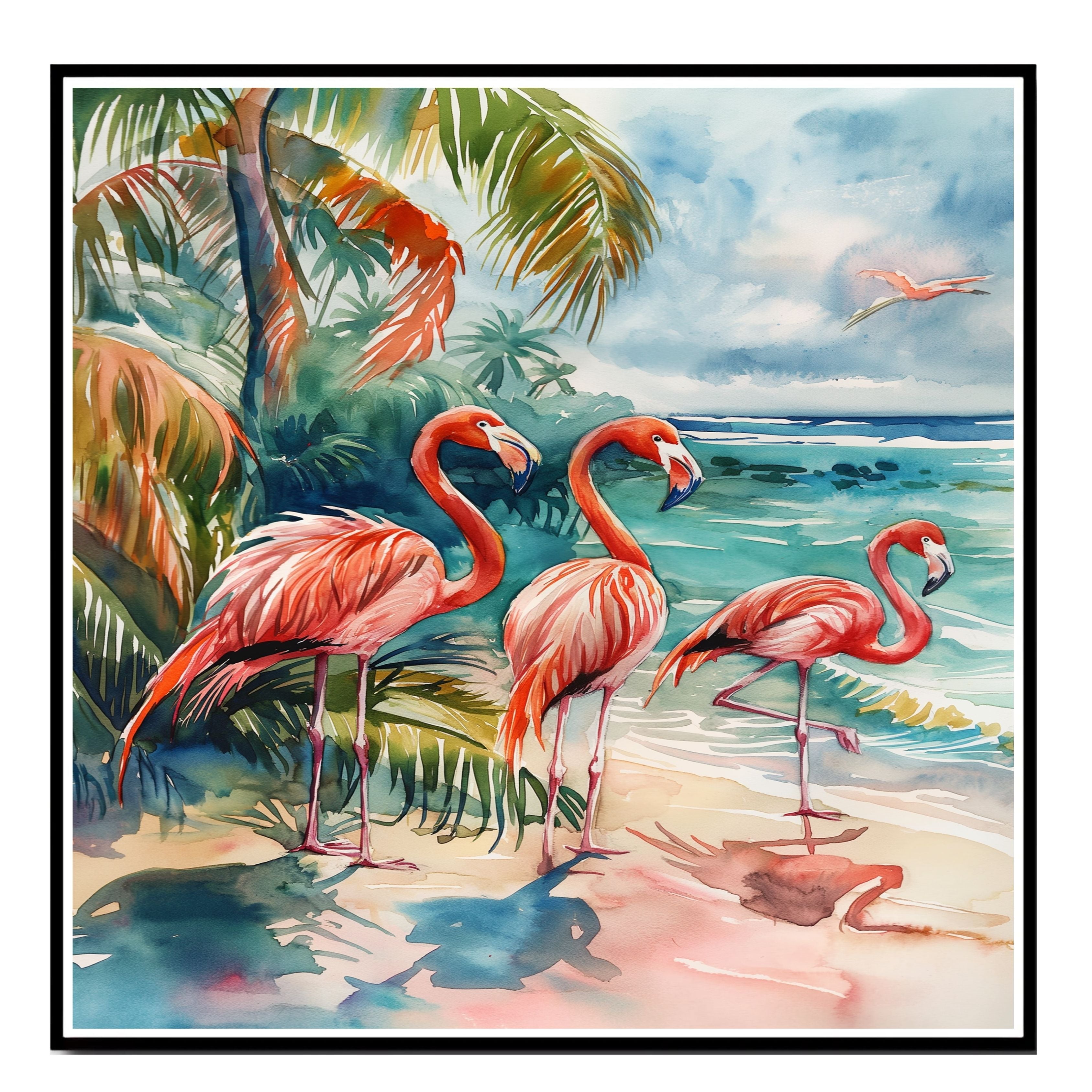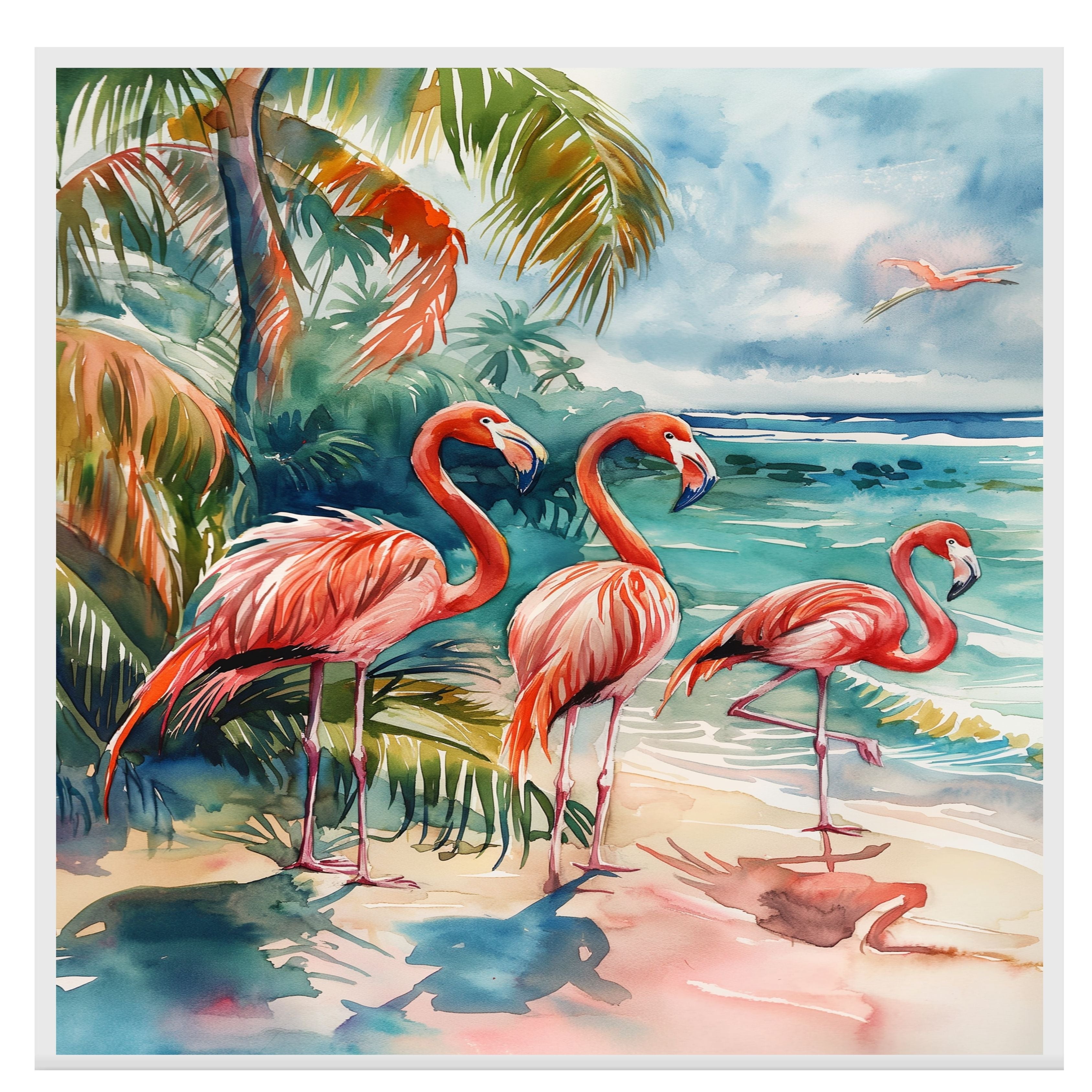 Immerse yourself in coastal serenity with this vibrant watercolor of flamingos wading along a tropical shoreline. Surrounded...