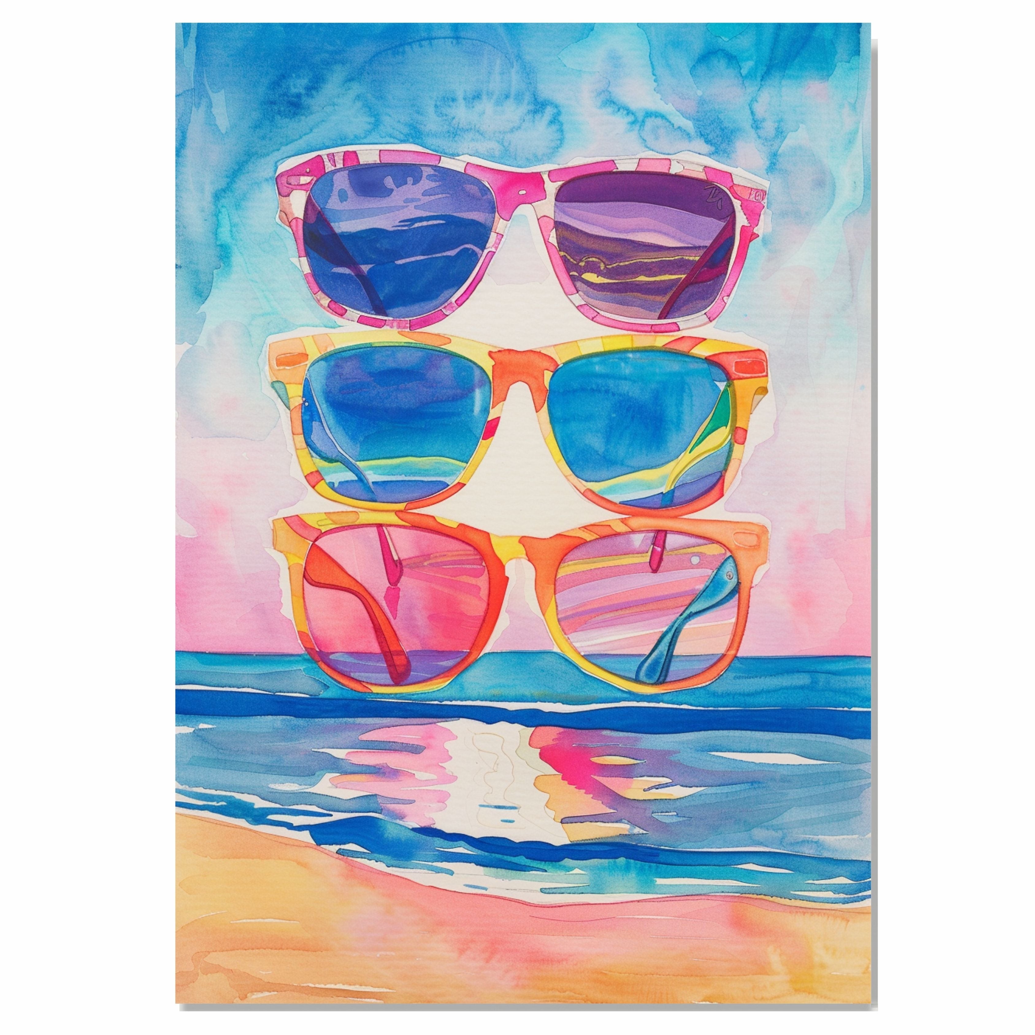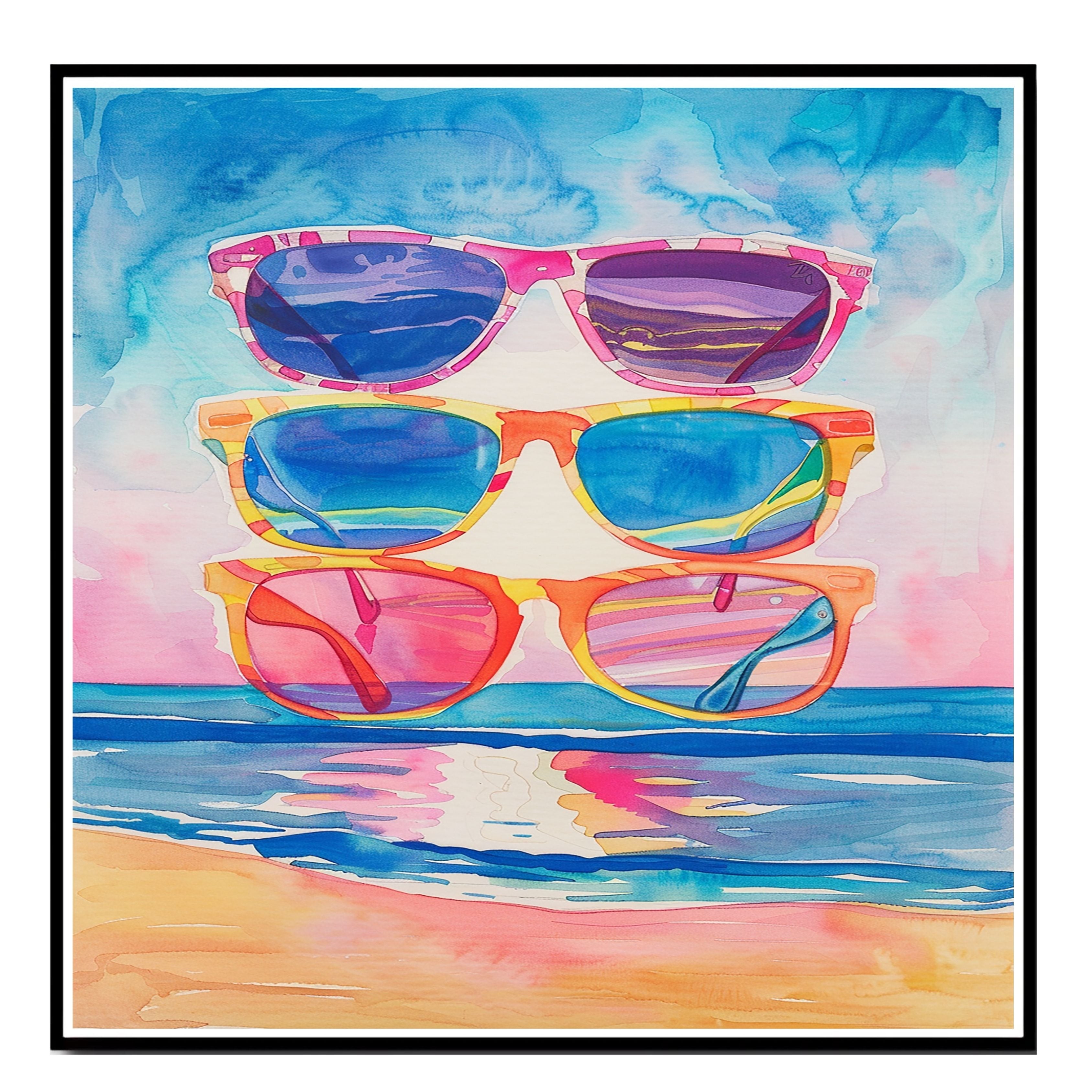This vibrant watercolor art features three uniquely patterned sunglasses stacked over a serene beachscape, with soft ocean...