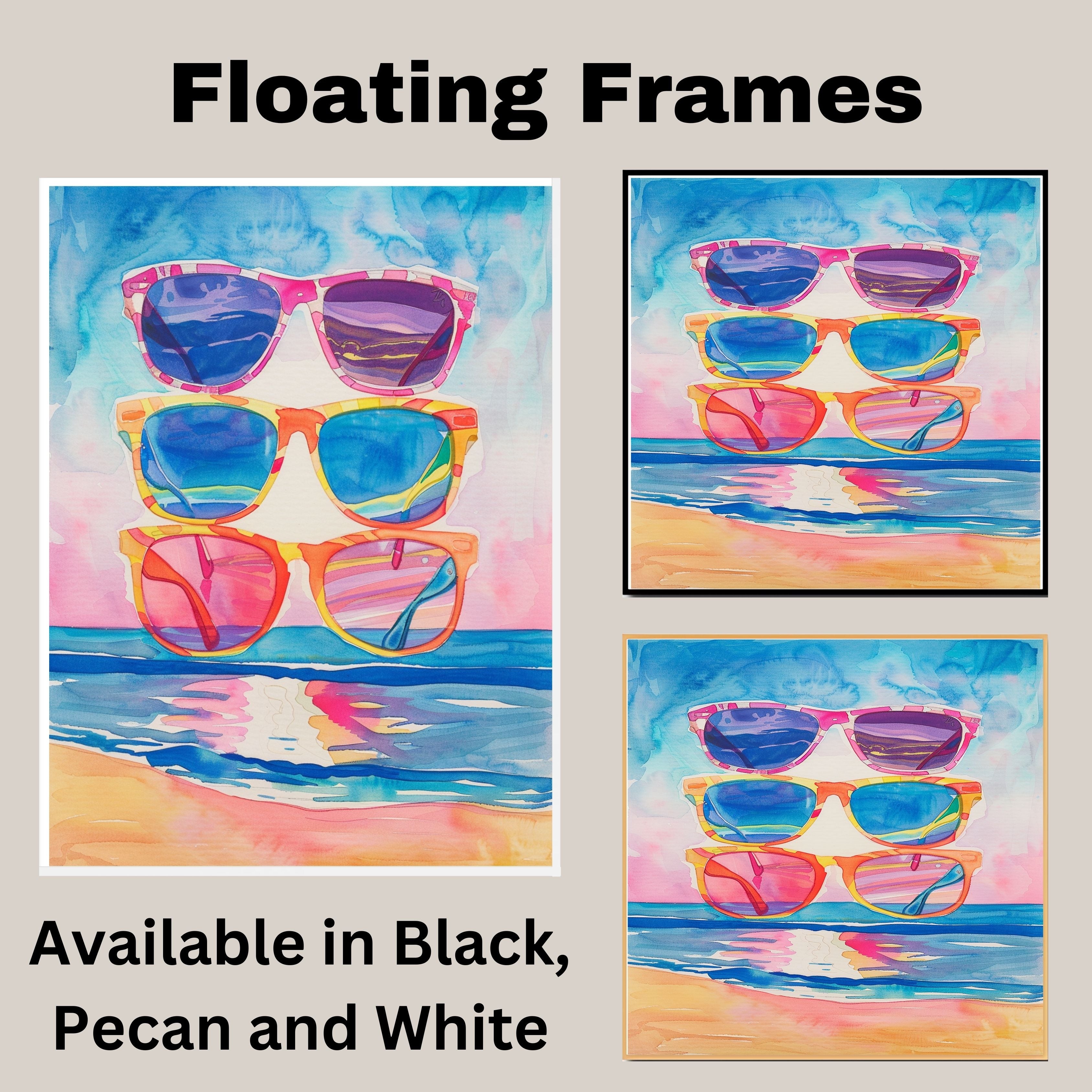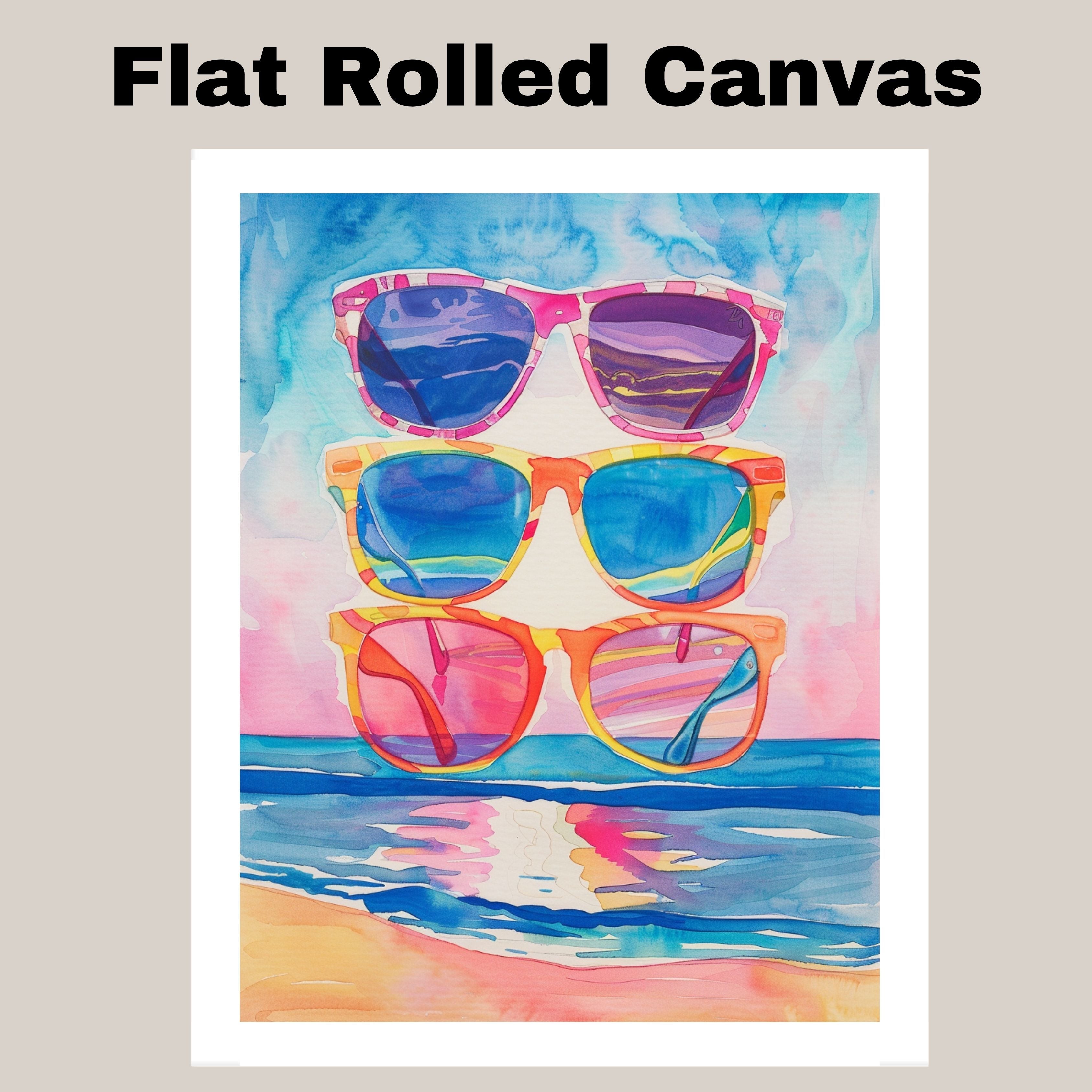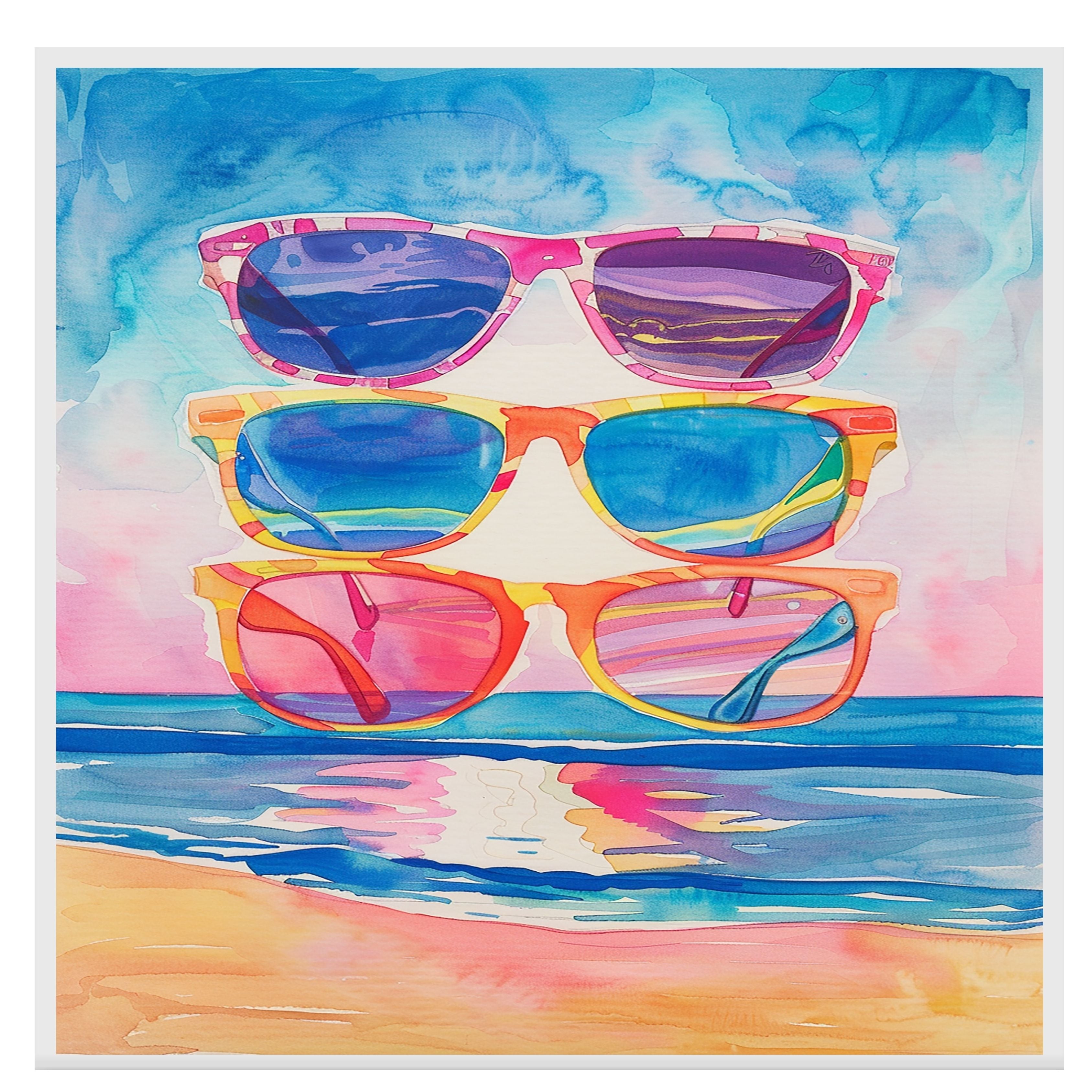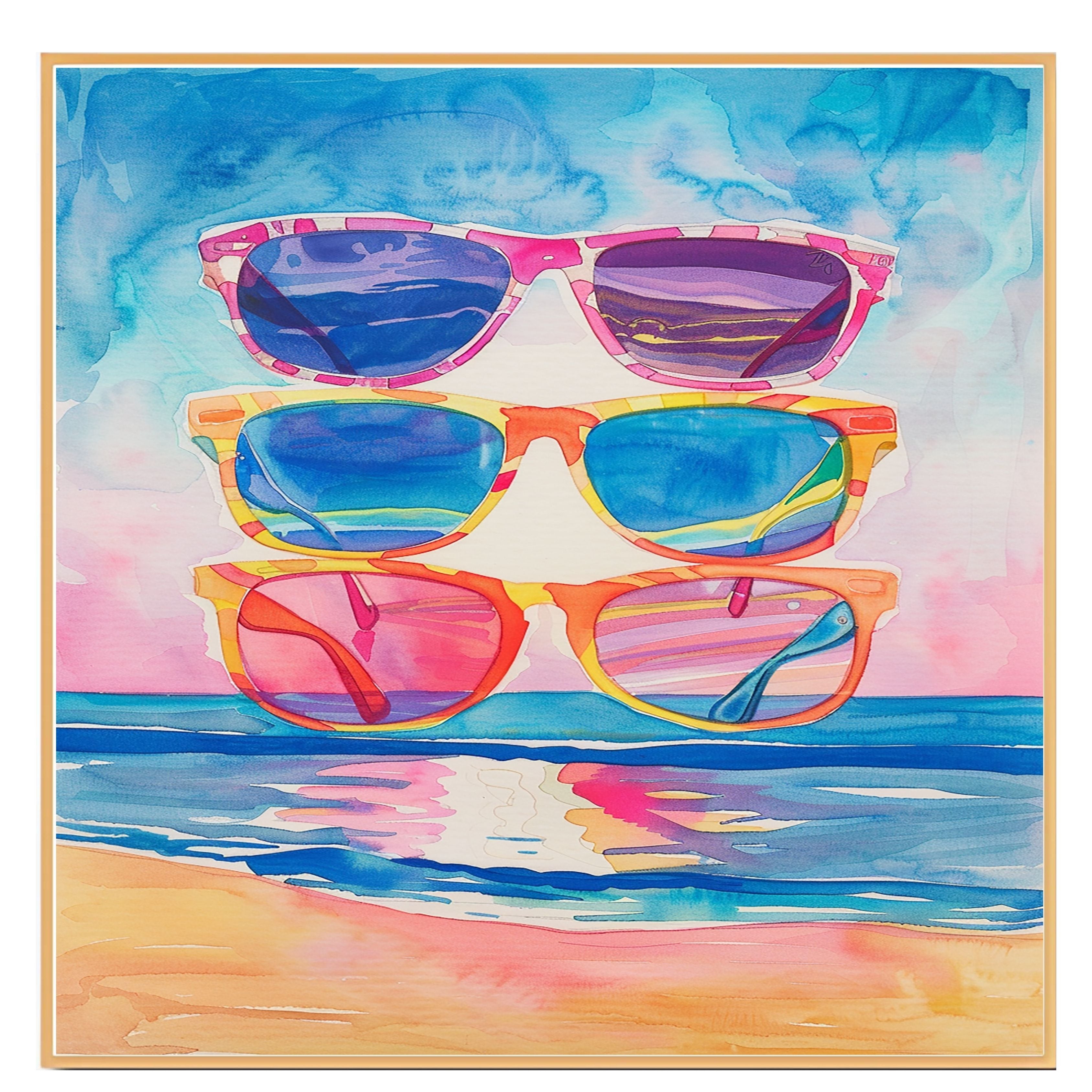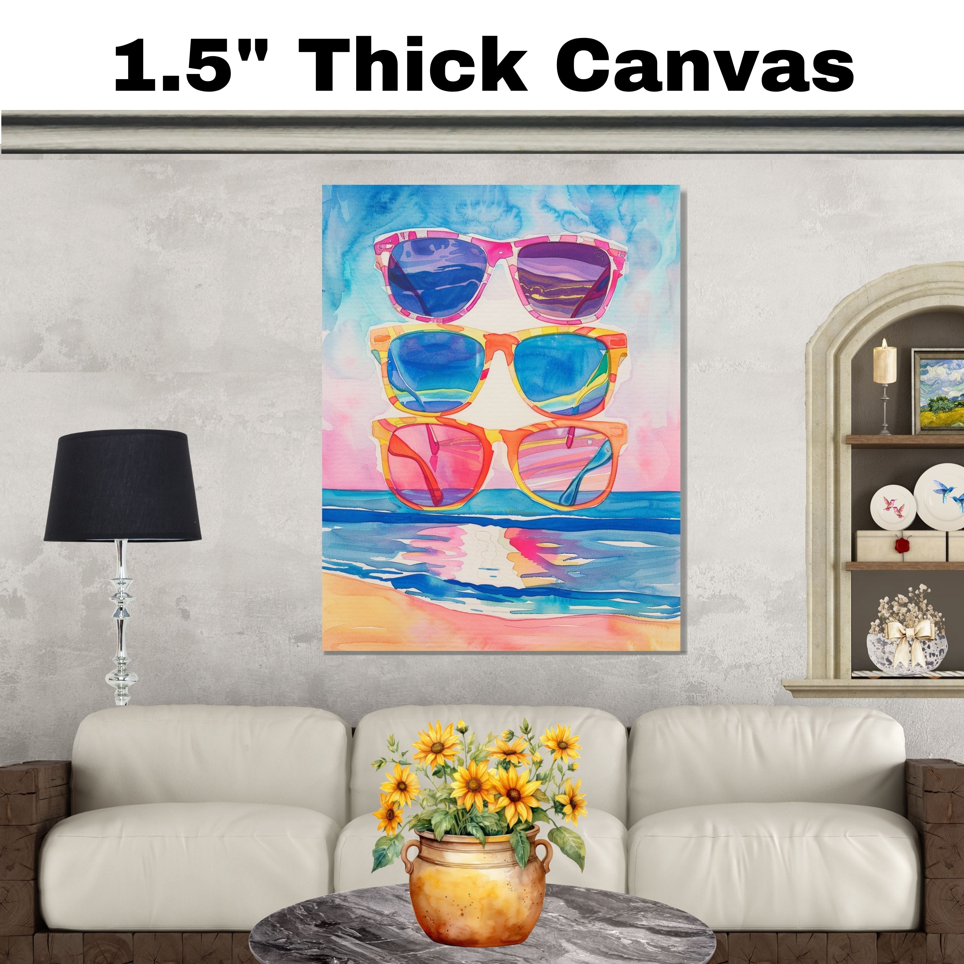 Watercolor Illustration of Three Colorful Sunglasses Stacked with Ocean Reflections and Vibrant Beach Background on Ready to Hang 1.5" Thick Canvas Wrap, Floating Framed Canvas, Flat Rolled Canvas