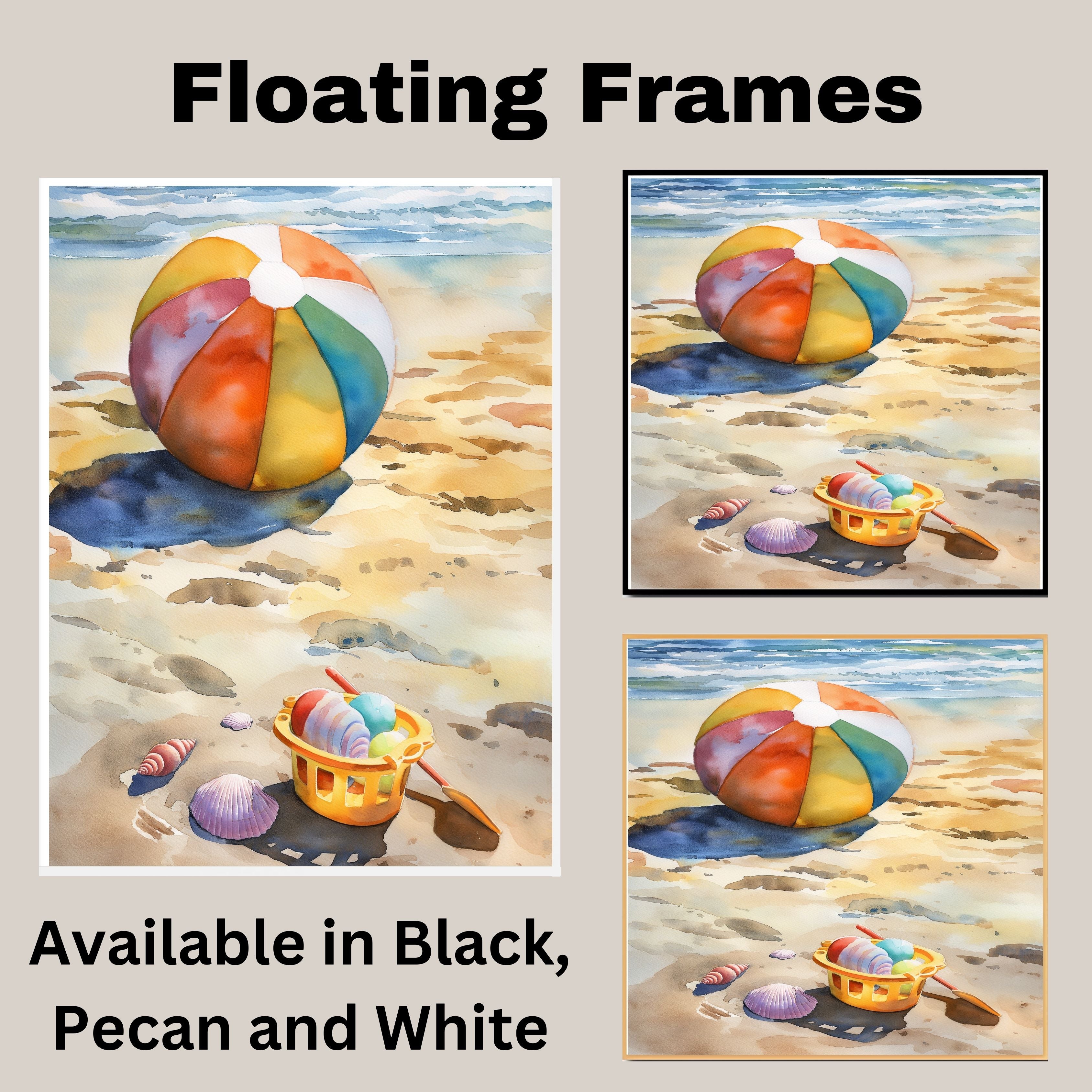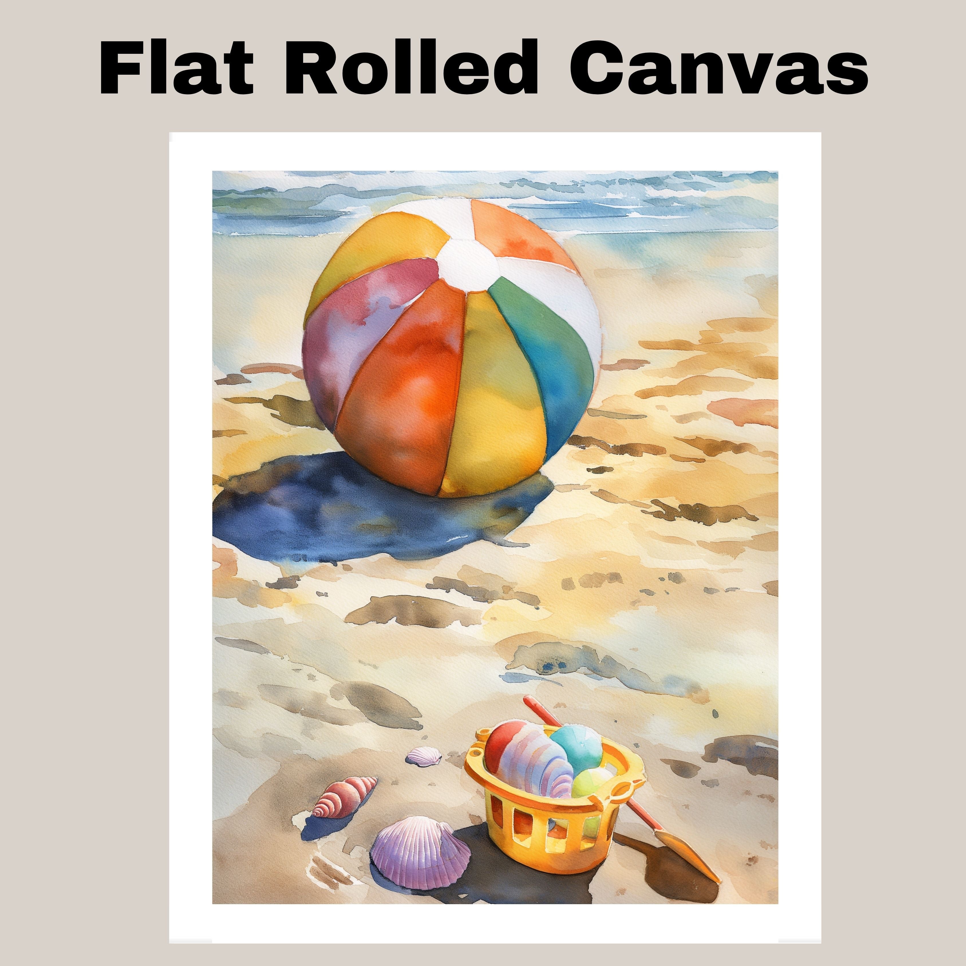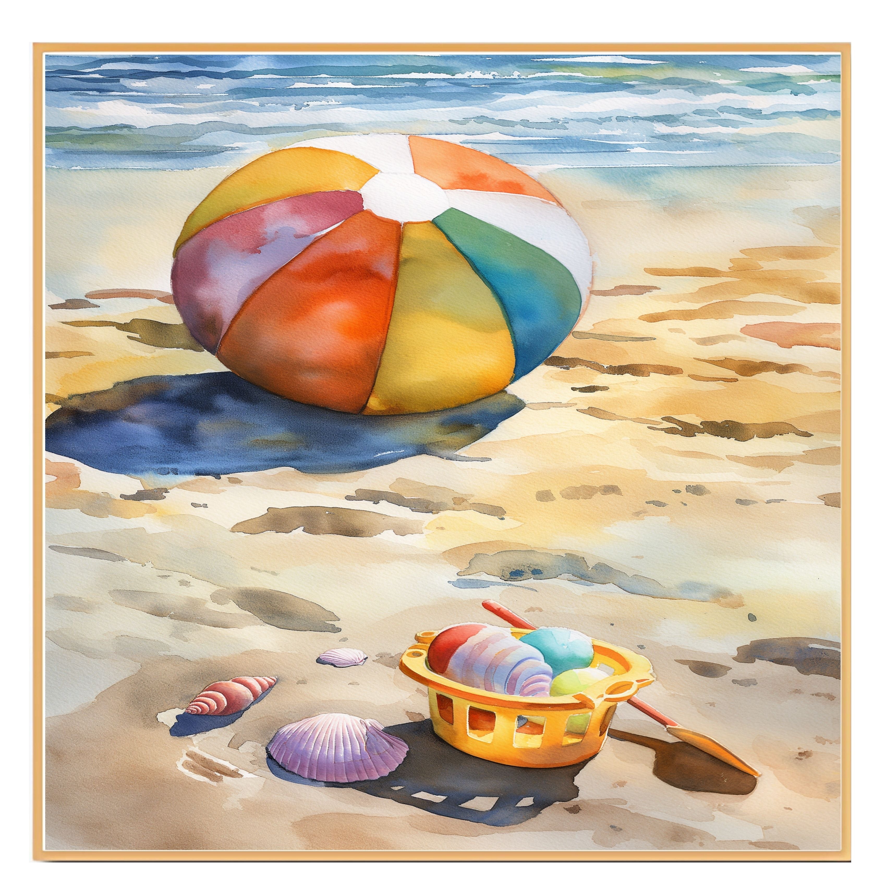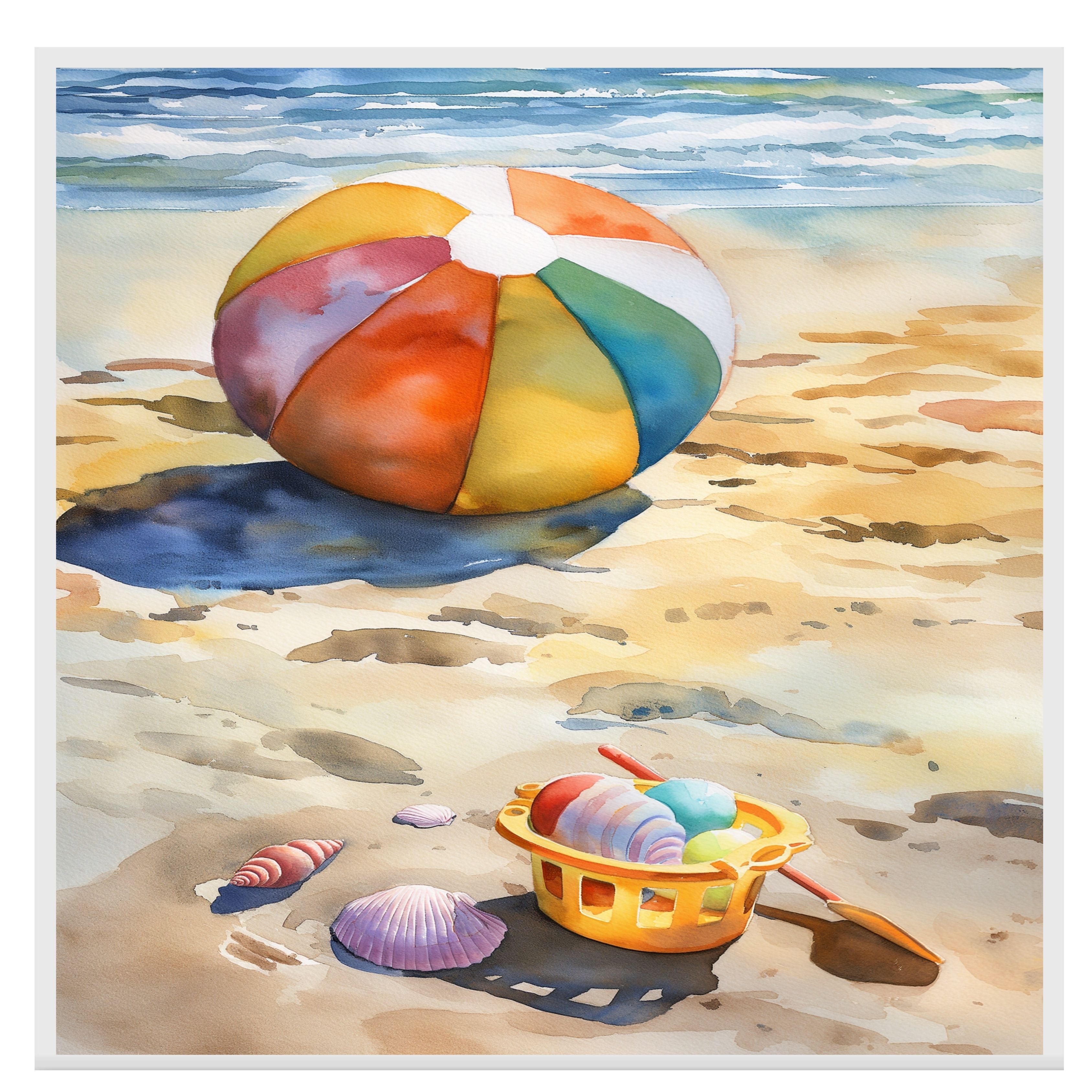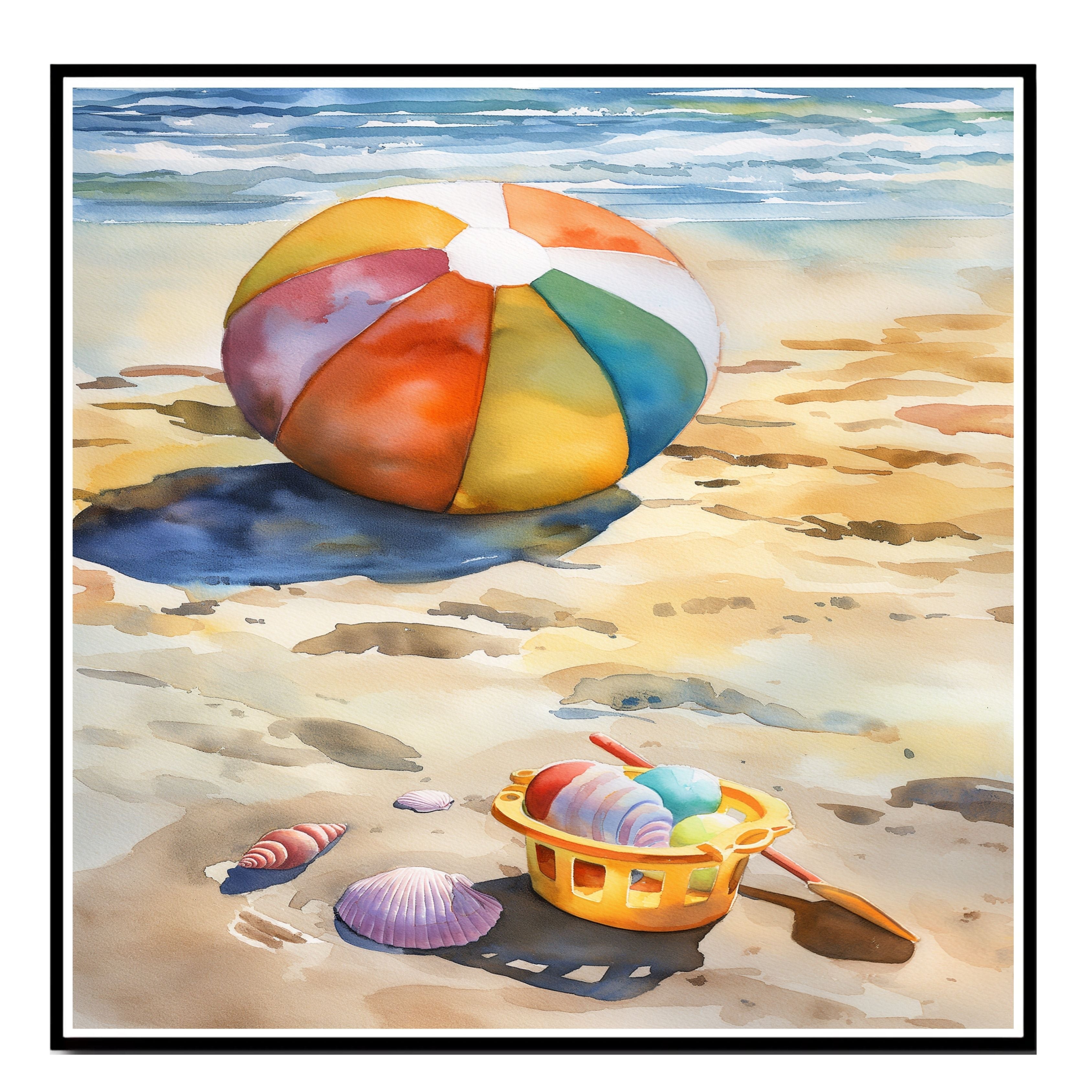Celebrate carefree summer days with this joyful watercolor artwork featuring a vibrant beach ball beside a toy bucket filled with shells and a shovel. Set against a serene ocean backdrop and sunlit sandy shore, this piece captures the playful energy and nostalgia of beach vacations. Perfect for brightening up a child's room, beach house, or any space that embraces coastal charm and warm-weather memories.