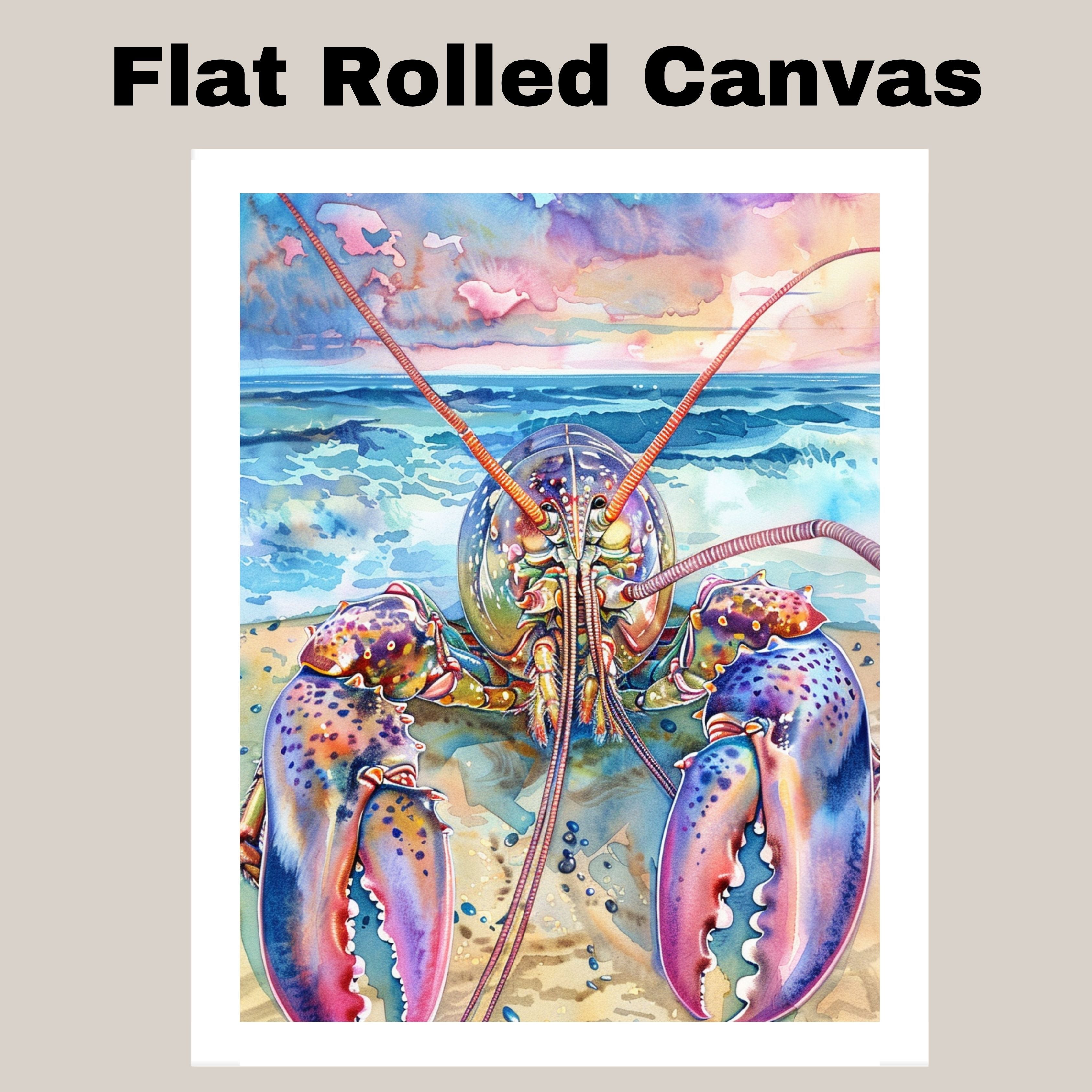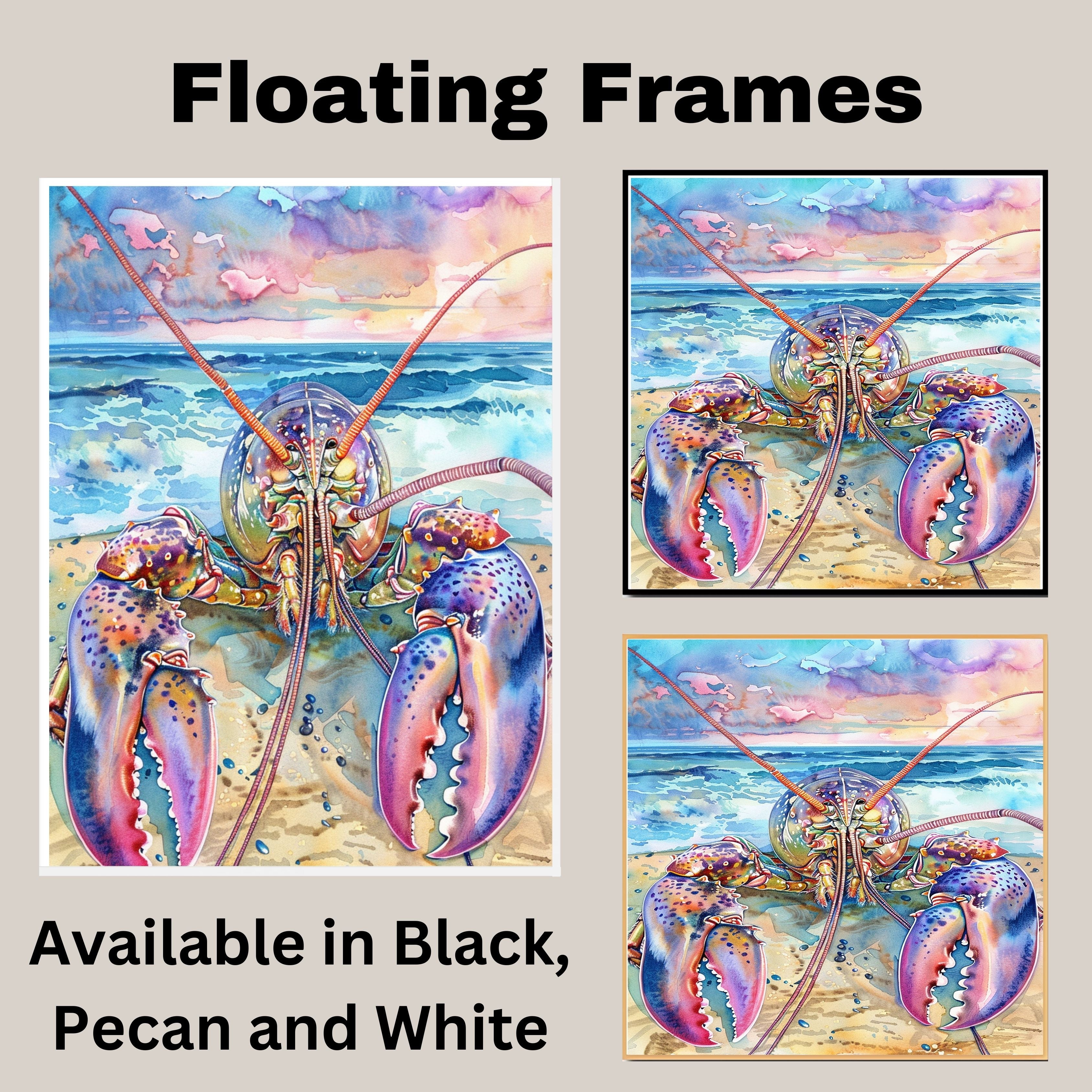 Watercolor Painting of a Colorful Lobster Facing Ocean Waves Under a Vibrant Coastal Sky at Sunset on Ready to Hang 1.5" Thick Canvas Wrap, Floating Framed Canvas, Flat Rolled Canvas