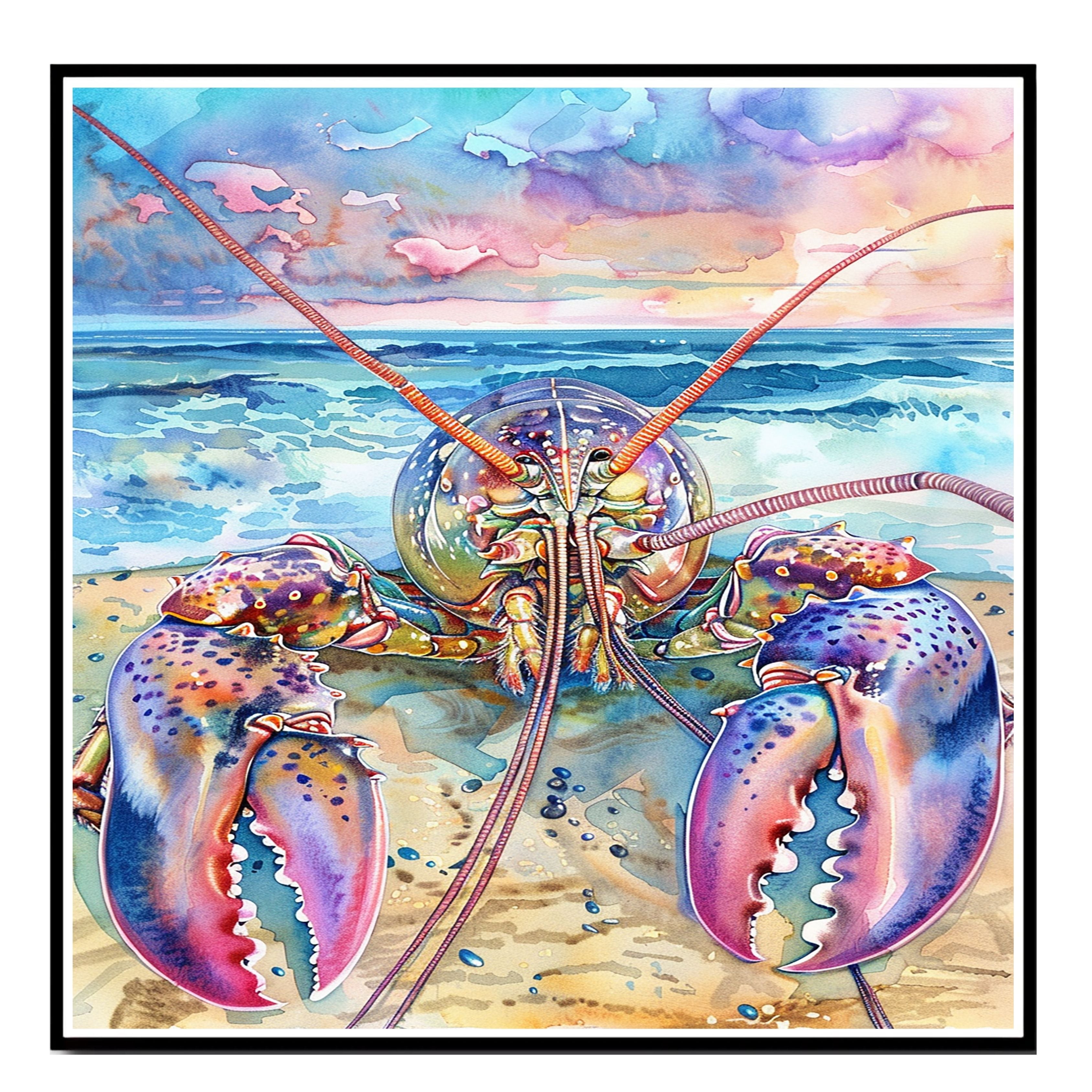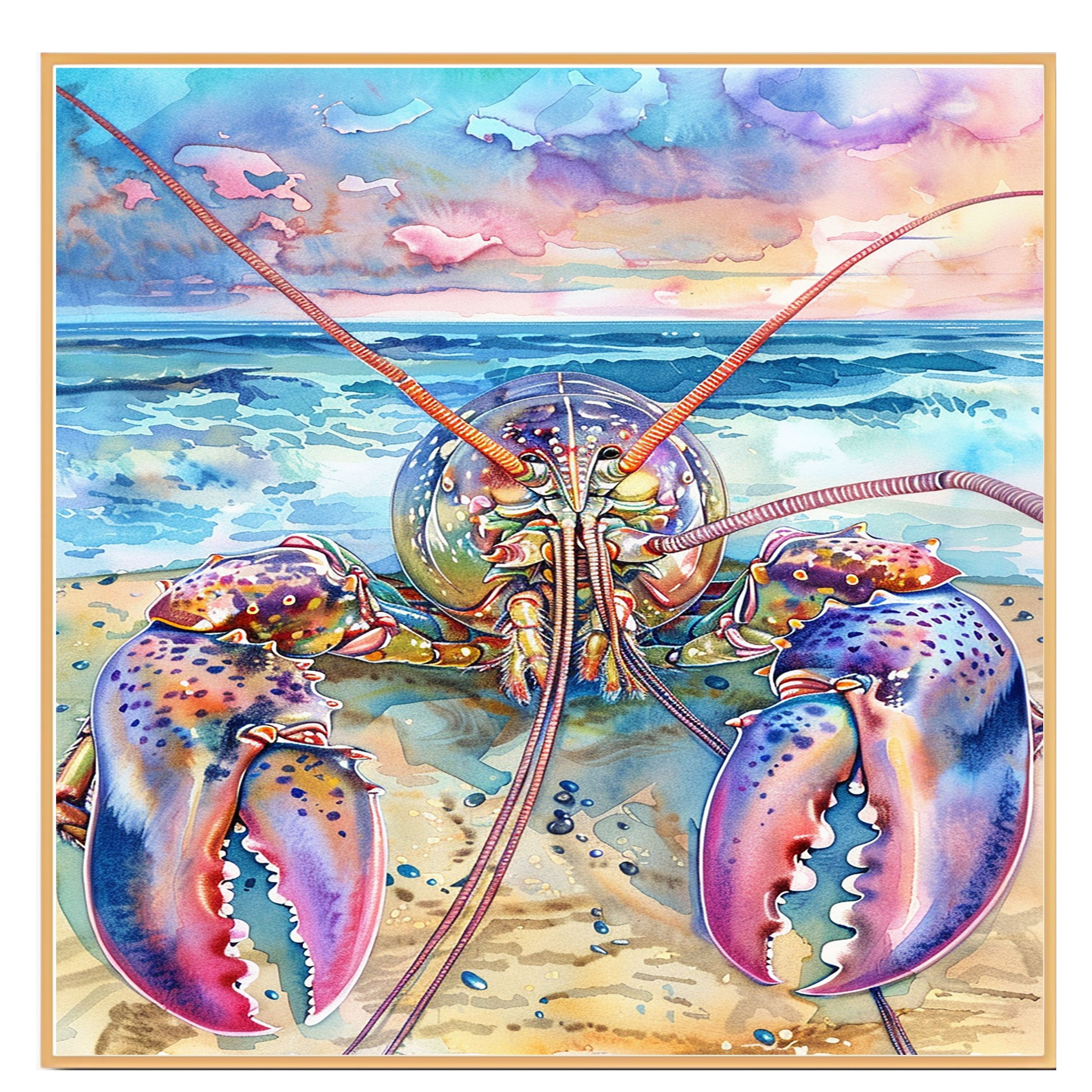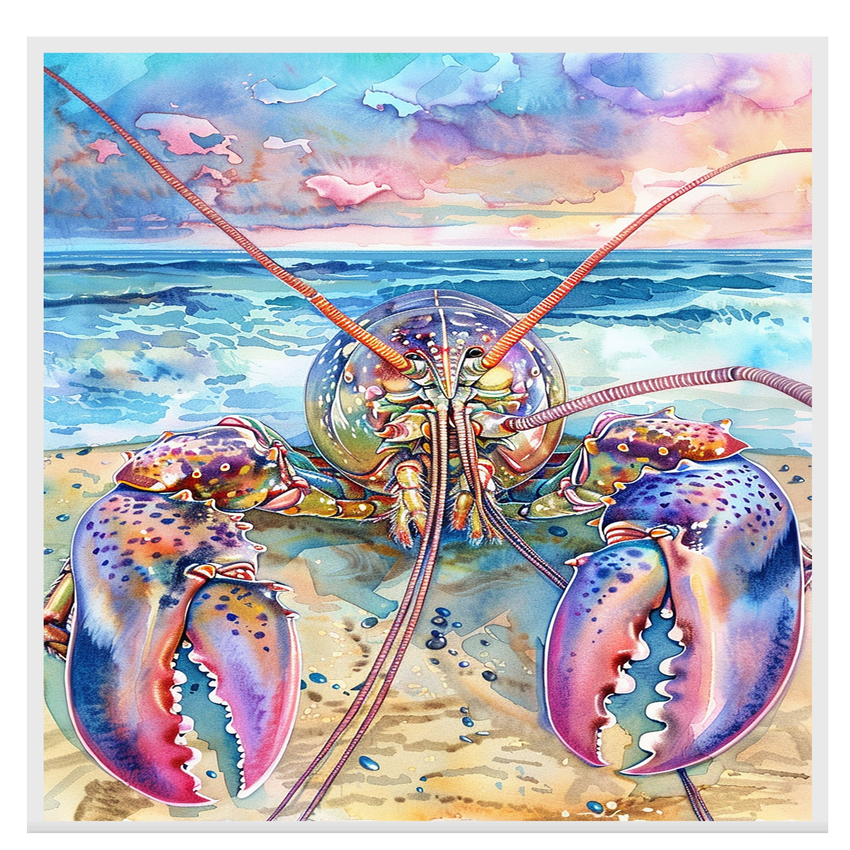 This expressive watercolor artwork features a brilliantly colored lobster on the sandy shore, facing the waves of a shimmering ocean. The piece is alive with radiant blues, purples, and warm coral tones, bringing personality and vibrancy to this striking marine subject. The dramatic sky and crisp wave detail make this painting ideal for ocean enthusiasts, seafood lovers, or anyone seeking bold coastal art that sparks conversation and creativity.