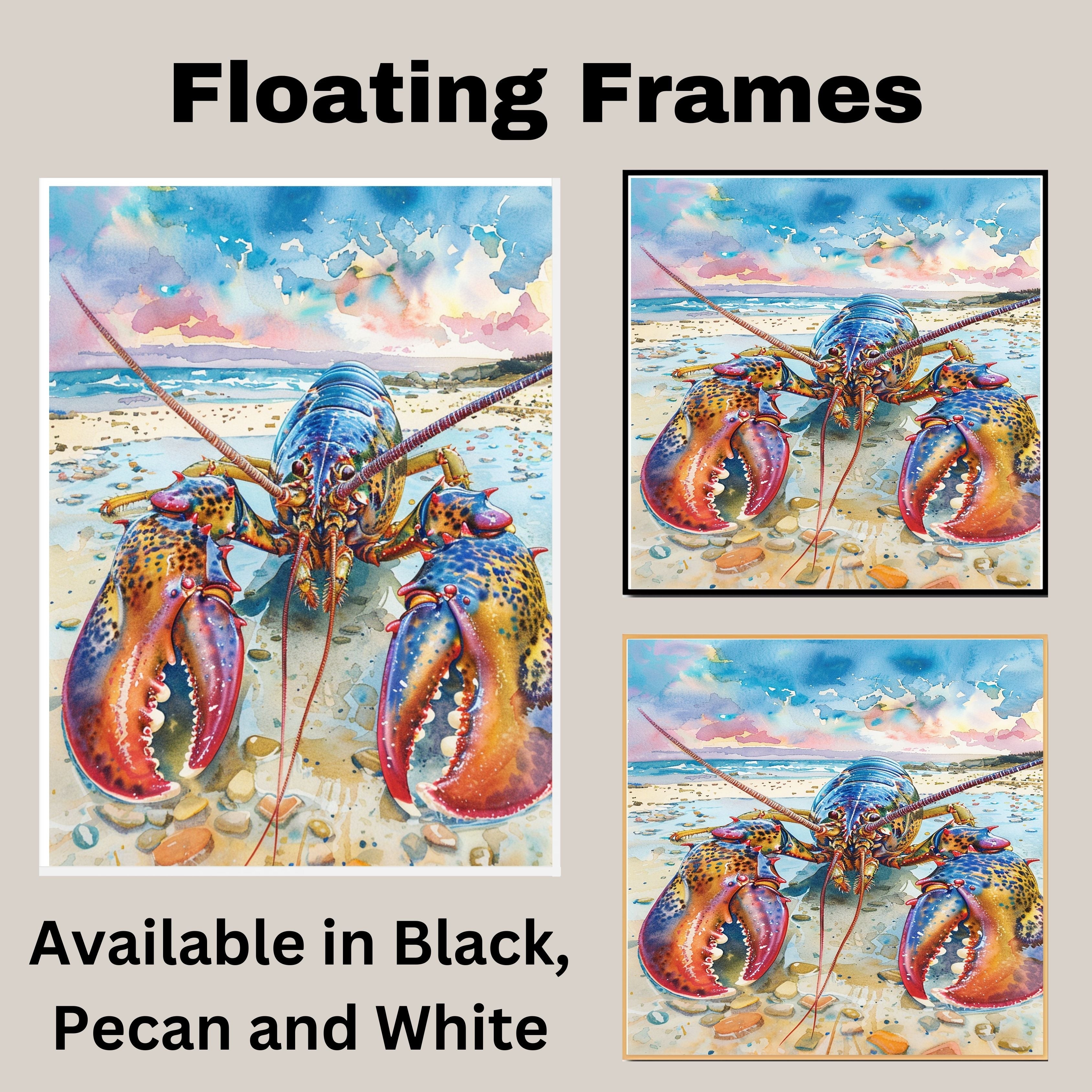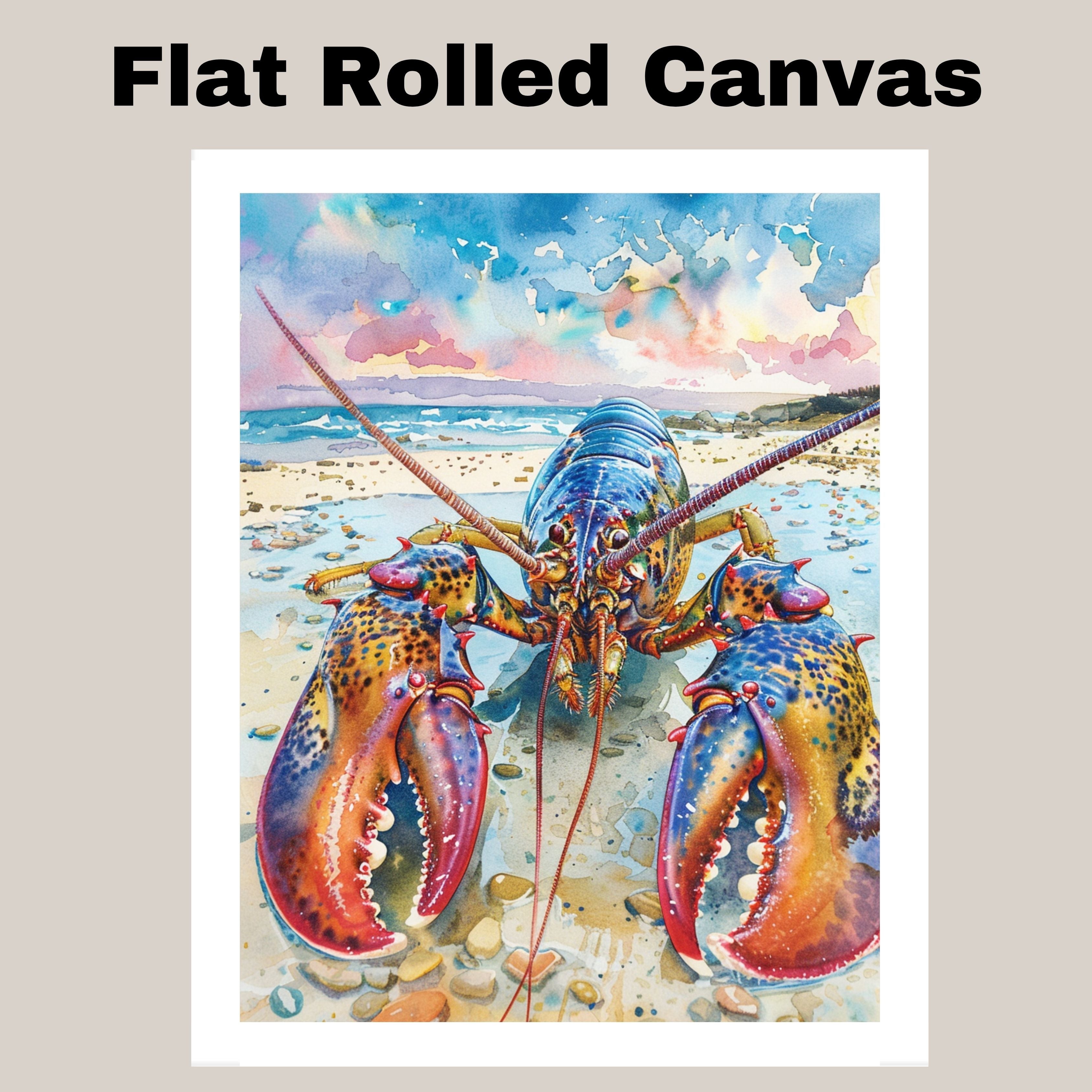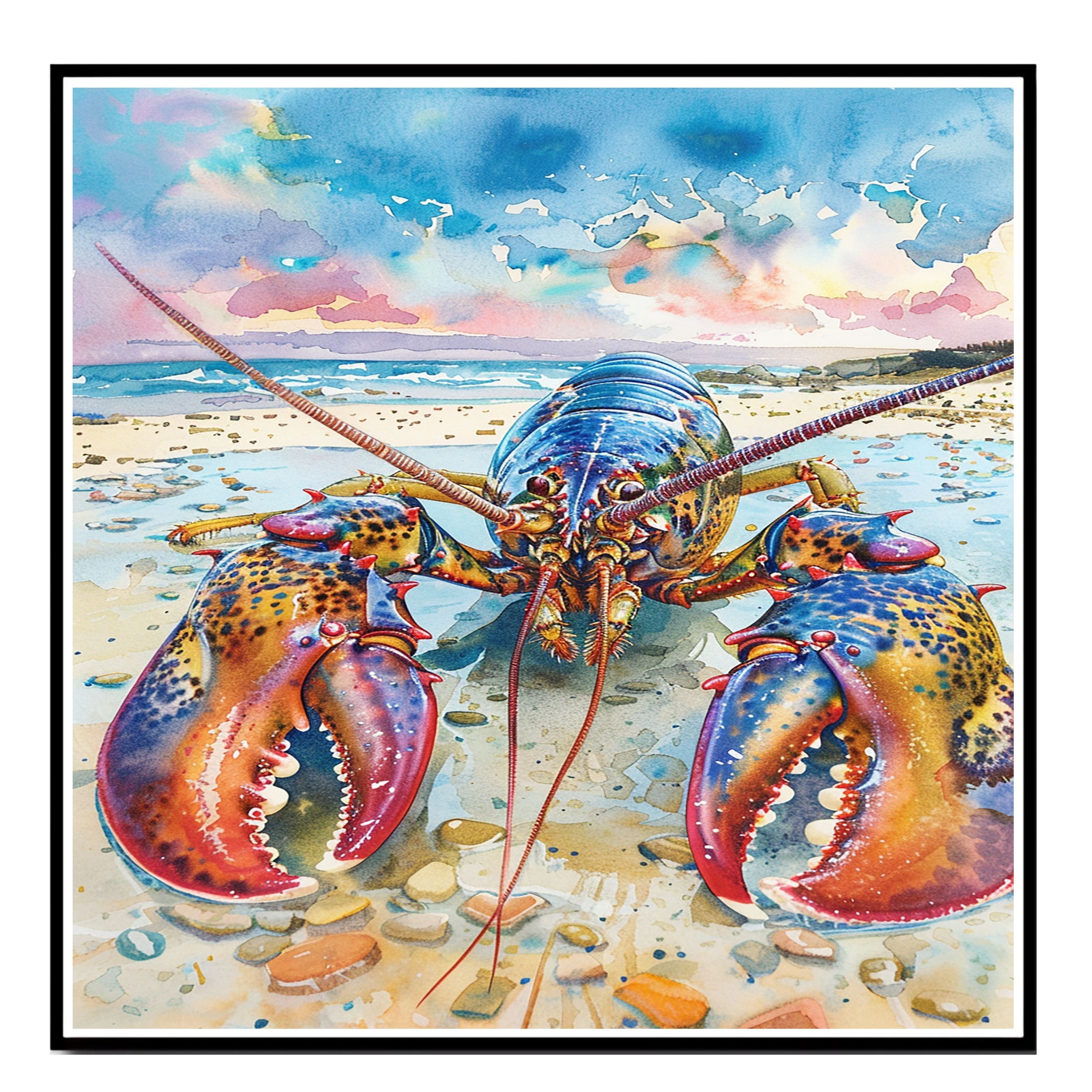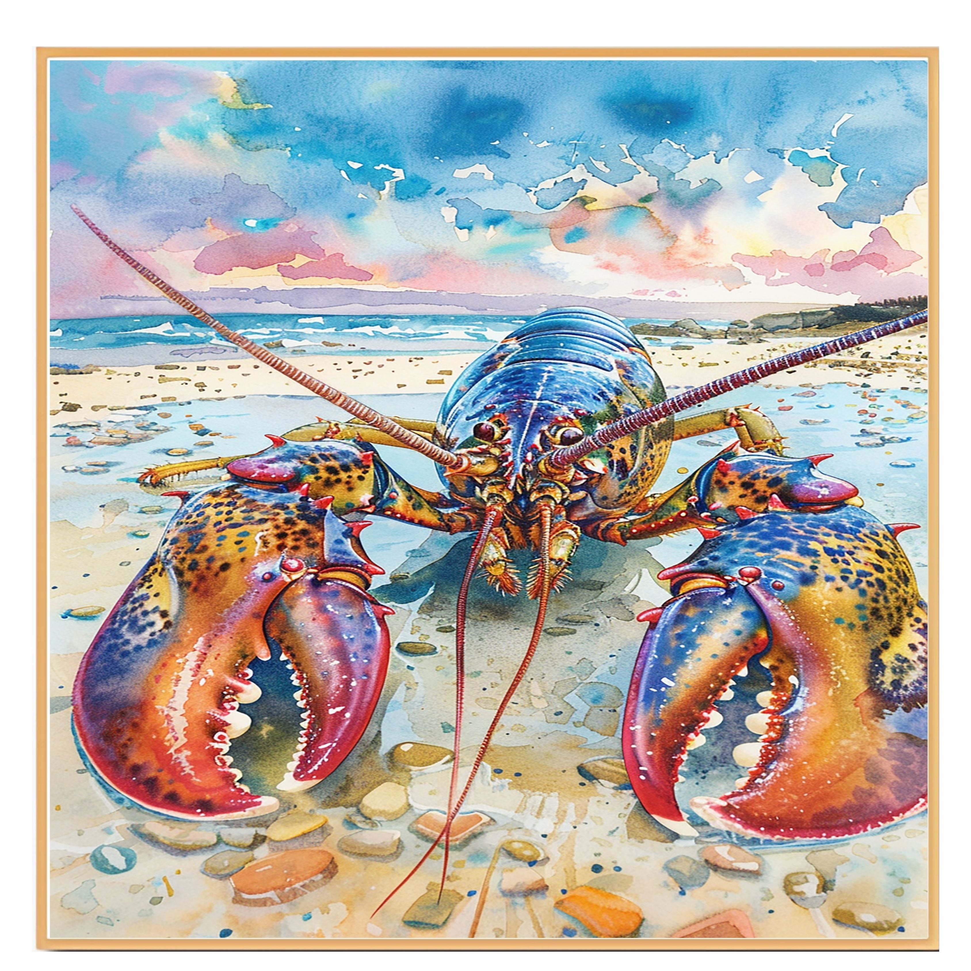 This stunning watercolor artwork features a boldly painted lobster on a rocky shoreline, captured in vivid detail and radiant colors. With its vibrant claws and lifelike textures, the lobster is framed by gentle waves and a dynamic, pastel-hued sky. This piece blends marine biology and coastal beauty, making it an ideal statement for seafood lovers, beach house aesthetics, or nautical collections.