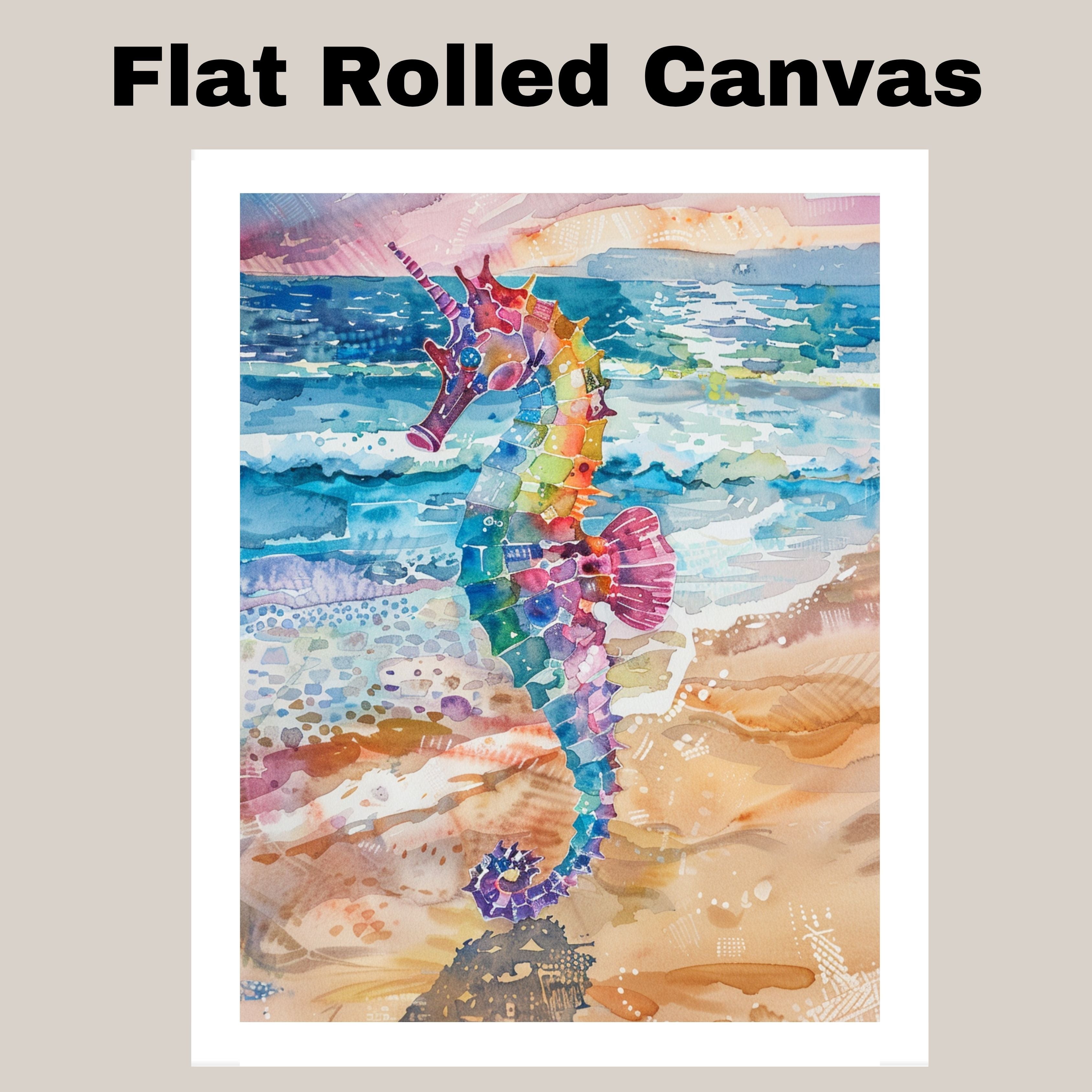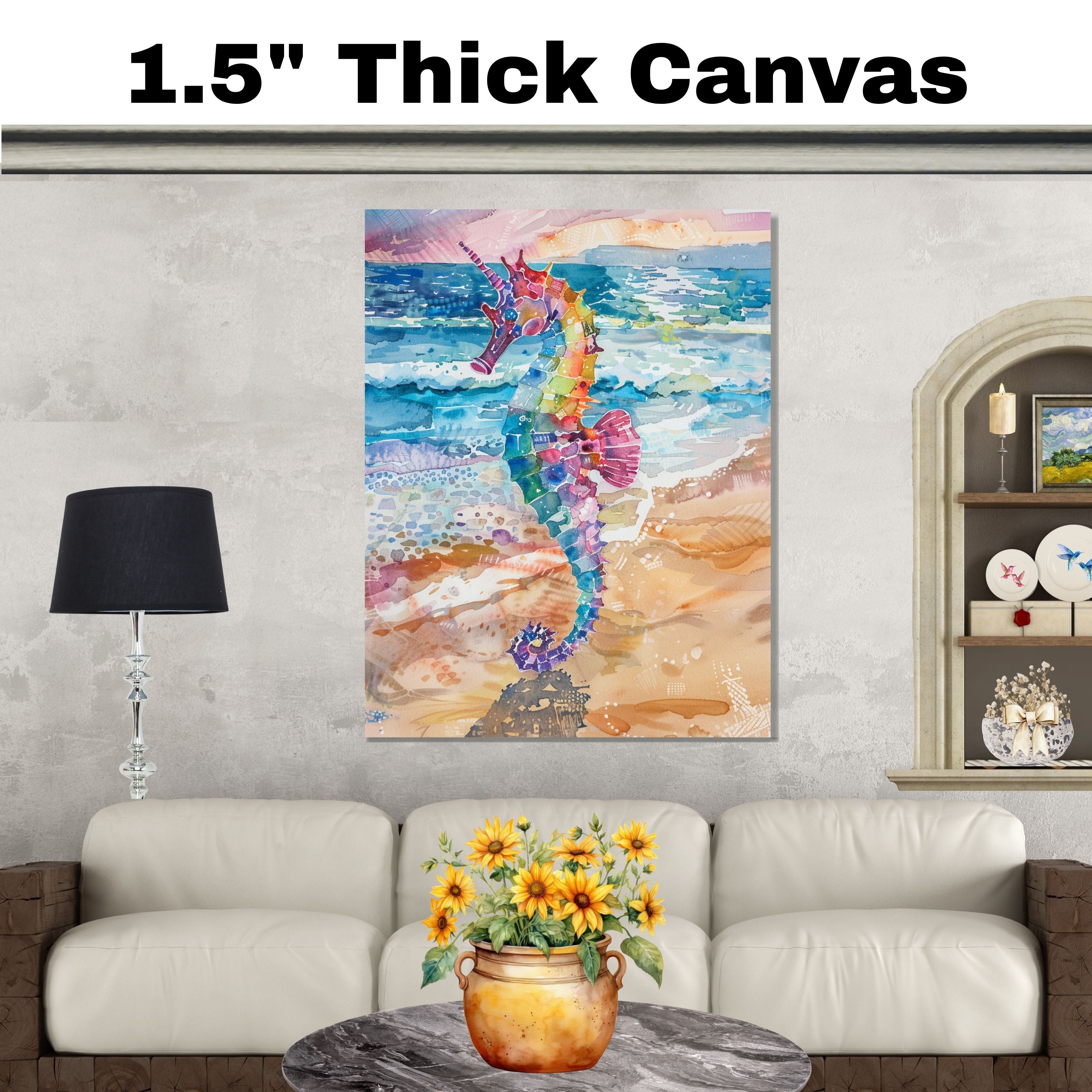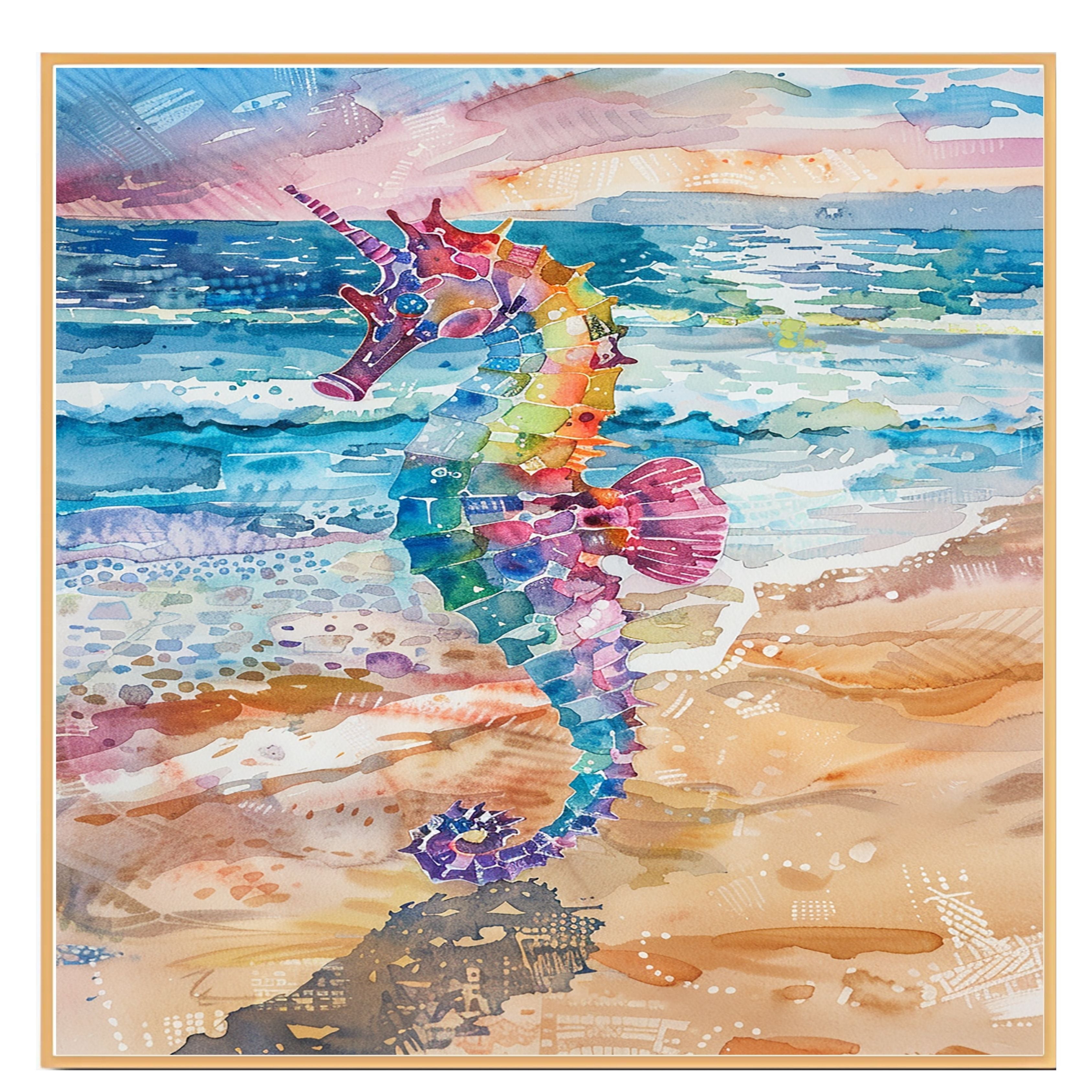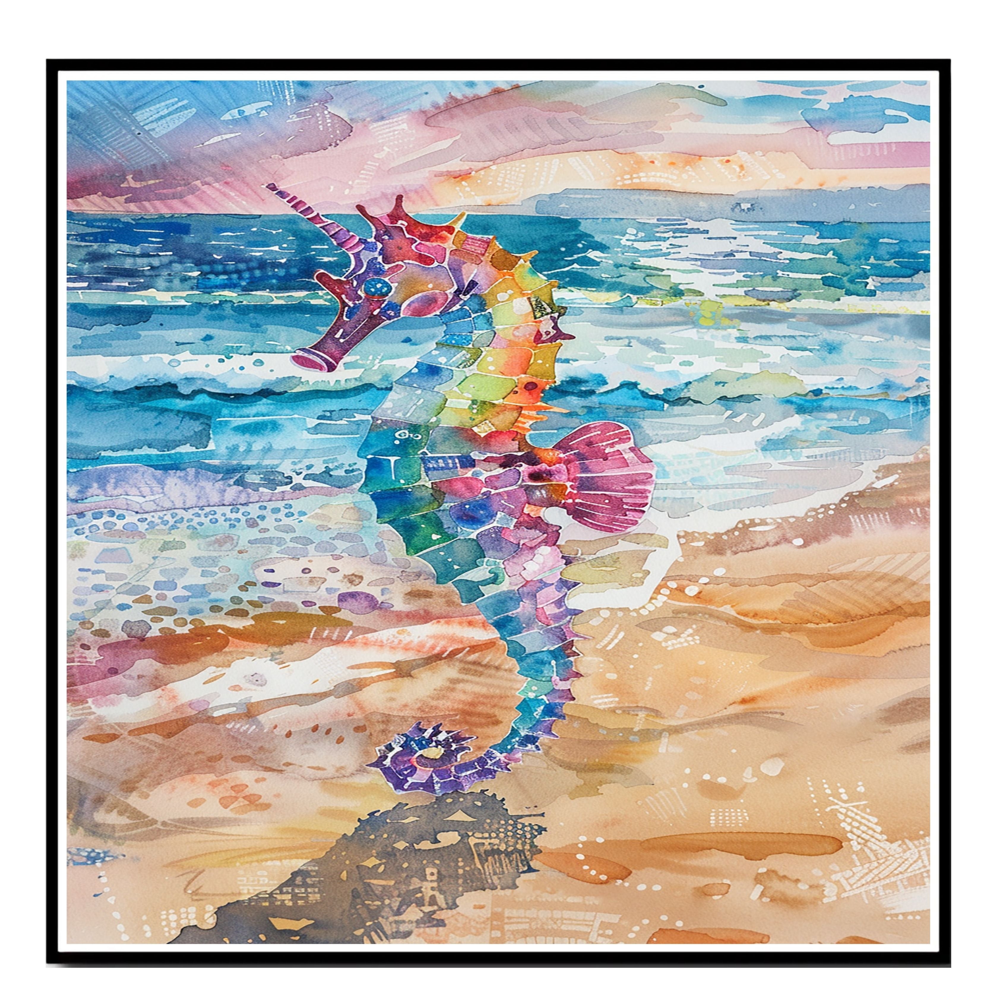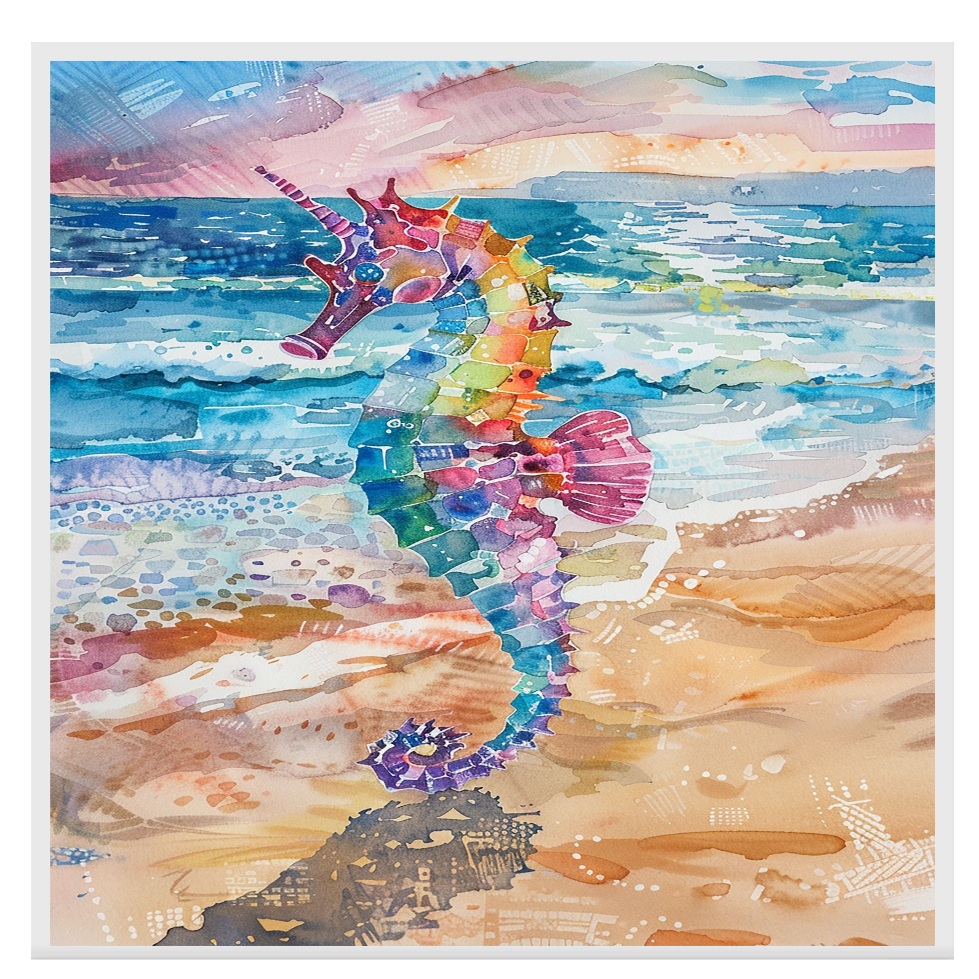 Celebrate ocean life with this whimsical watercolor painting of a multicolored seahorse at the beach. Bursting with vibrant hues and aquatic texture, the seahorse stands out against a backdrop of shimmering sea waves and soft sands. A playful yet elegant coastal scene perfect for marine life lovers and beach-inspired spaces.