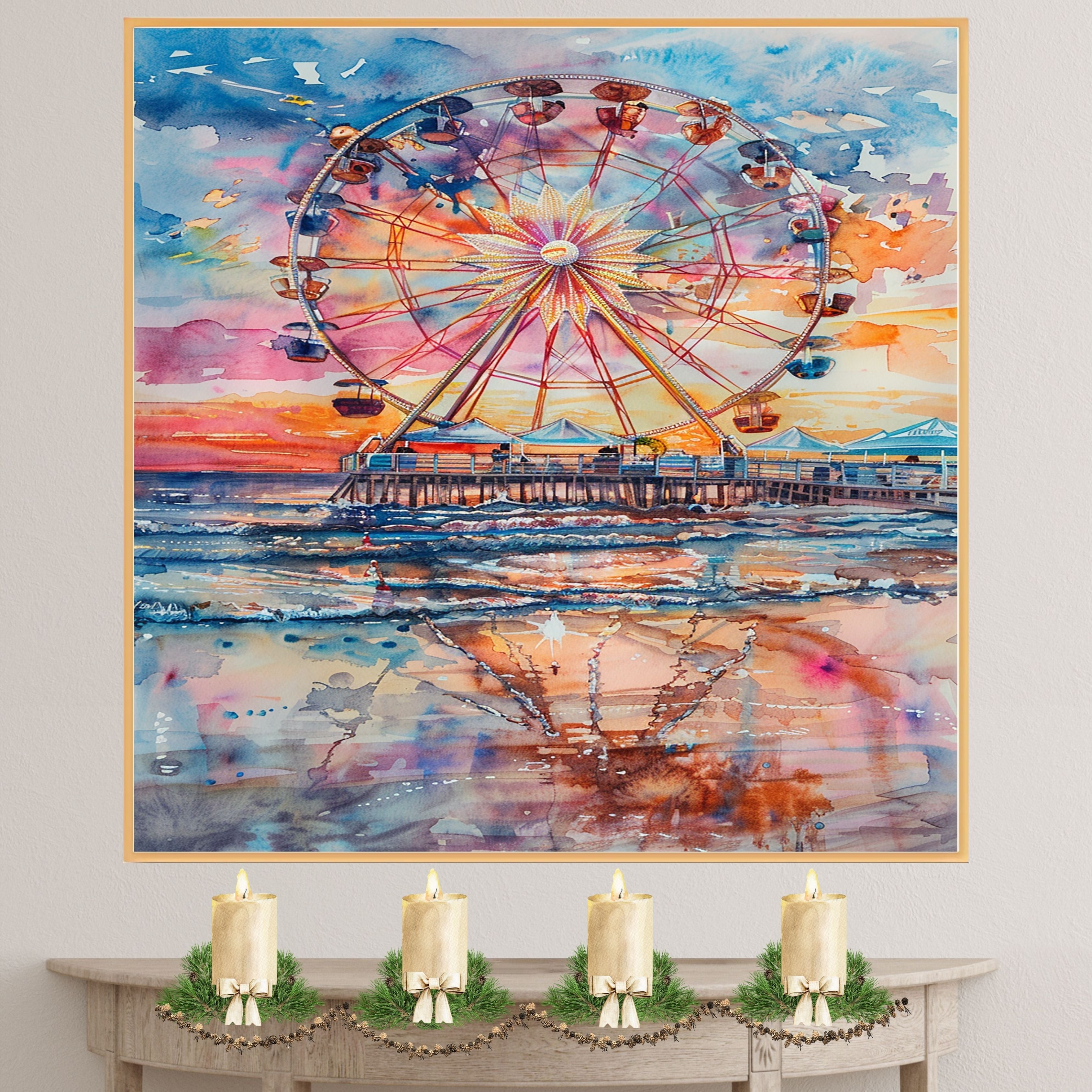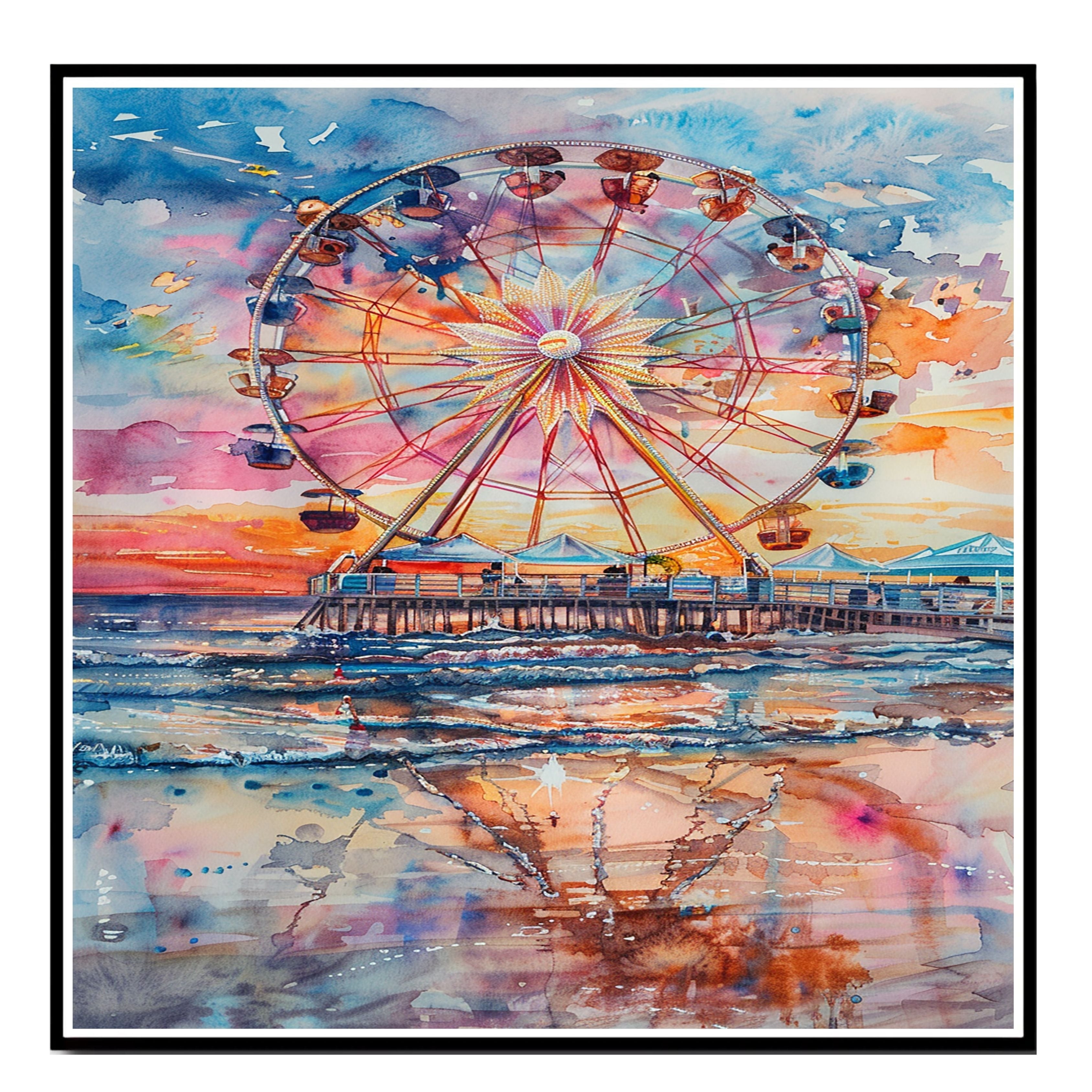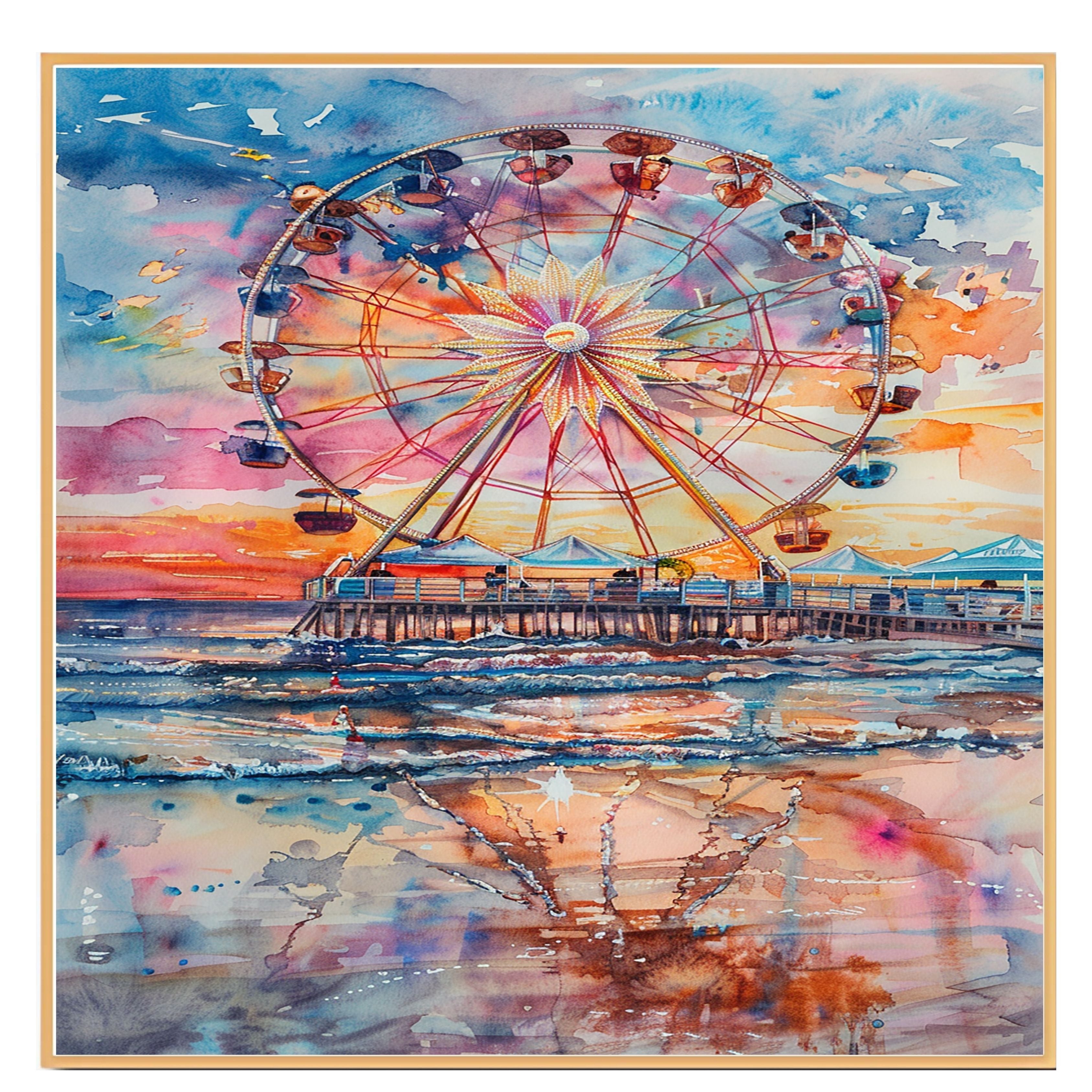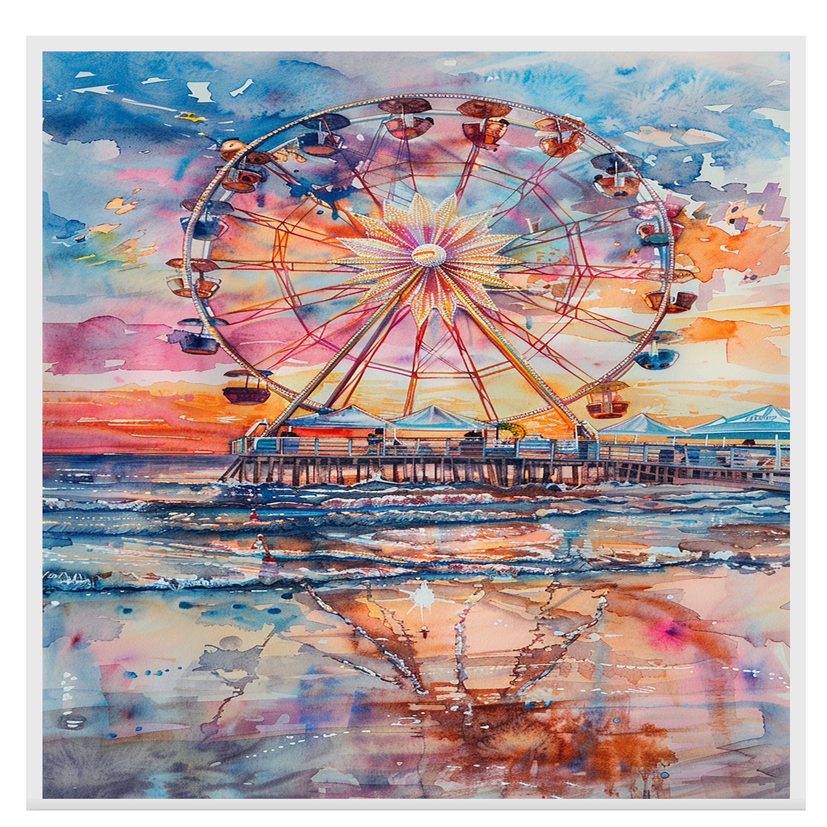 This stunning watercolor artwork captures a ferris wheel towering over a seaside pier as the sun sets...