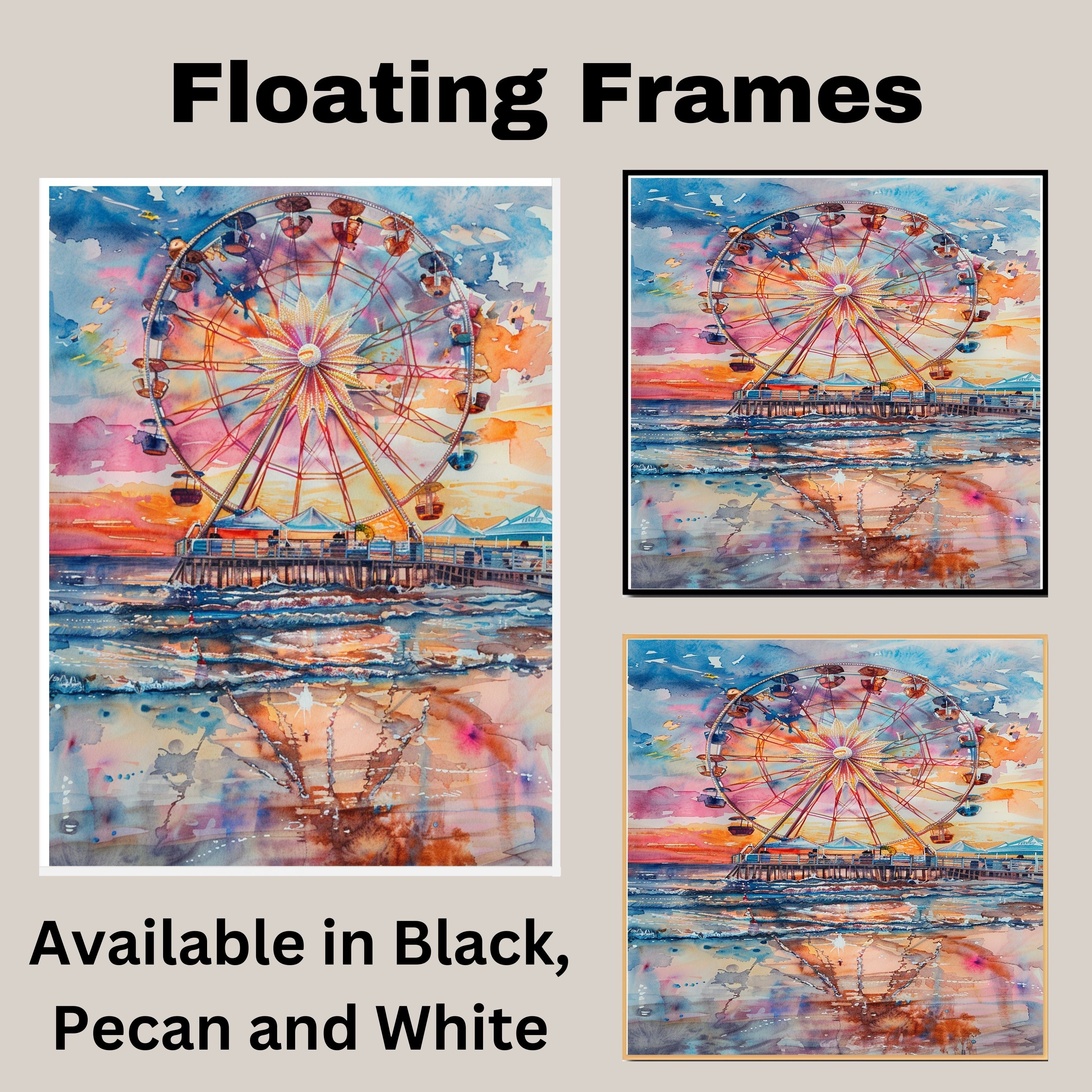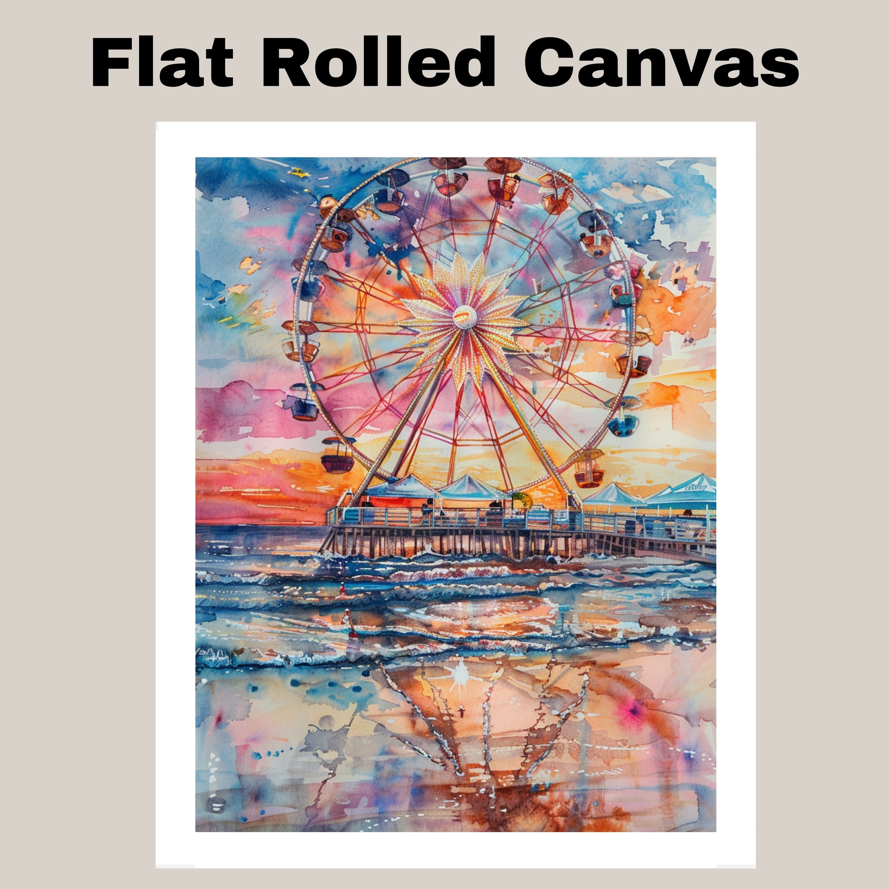 Watercolor Painting of a Ferris Wheel on a Pier at Sunset with Ocean Reflections and Vibrant Sky in Coastal Theme on Ready to Hang 1.5" Thick Canvas Wrap, Floating Framed Canvas, Flat Rolled Canvas