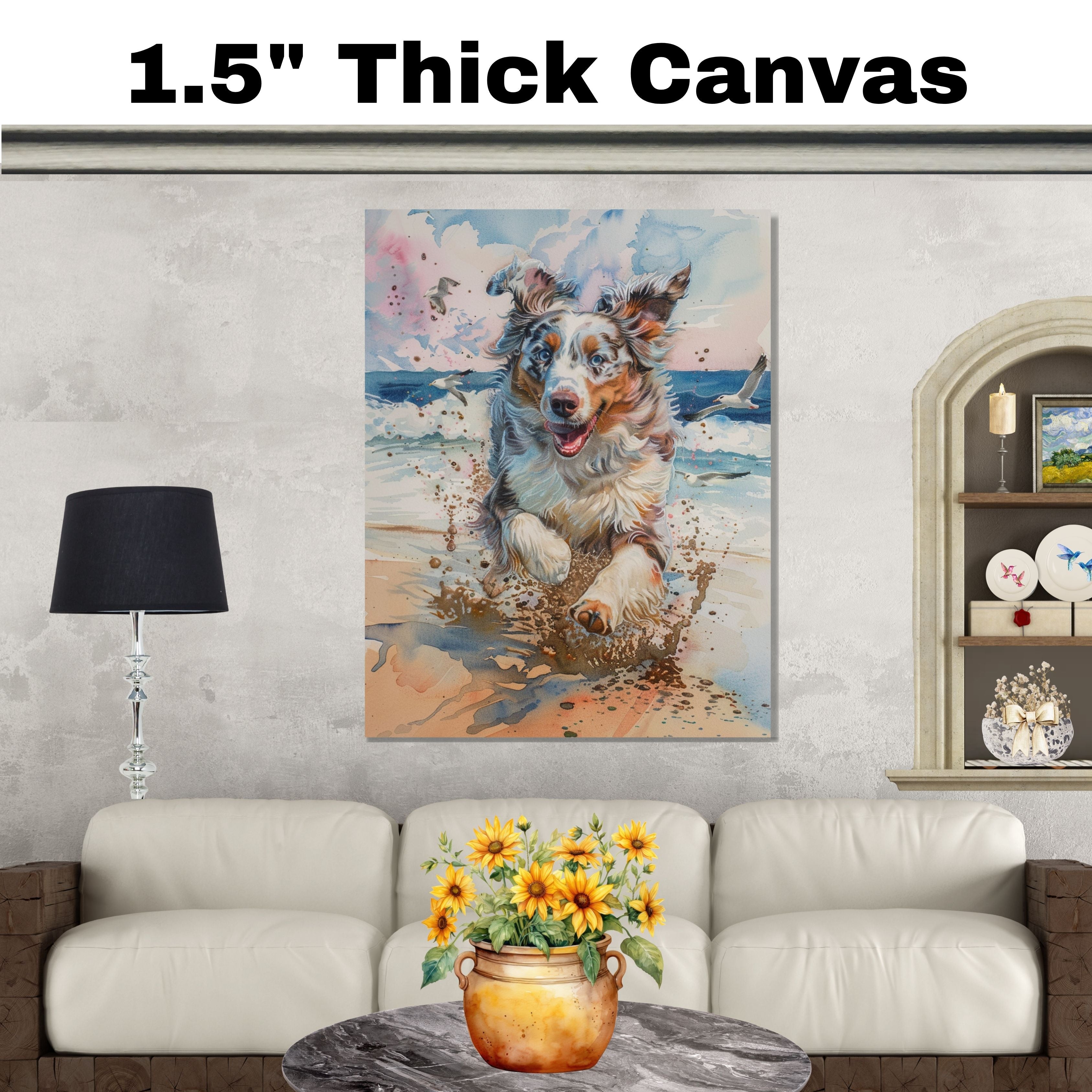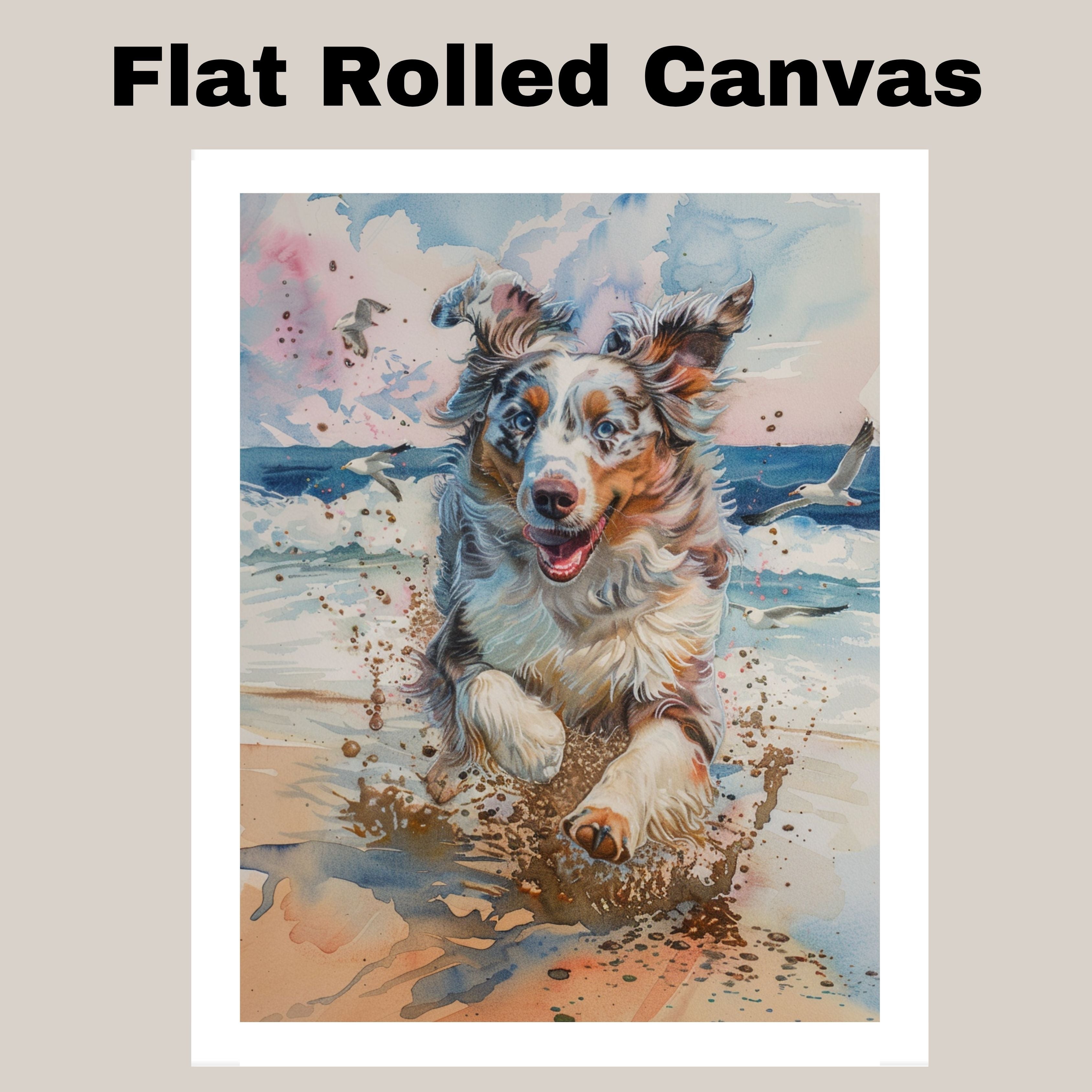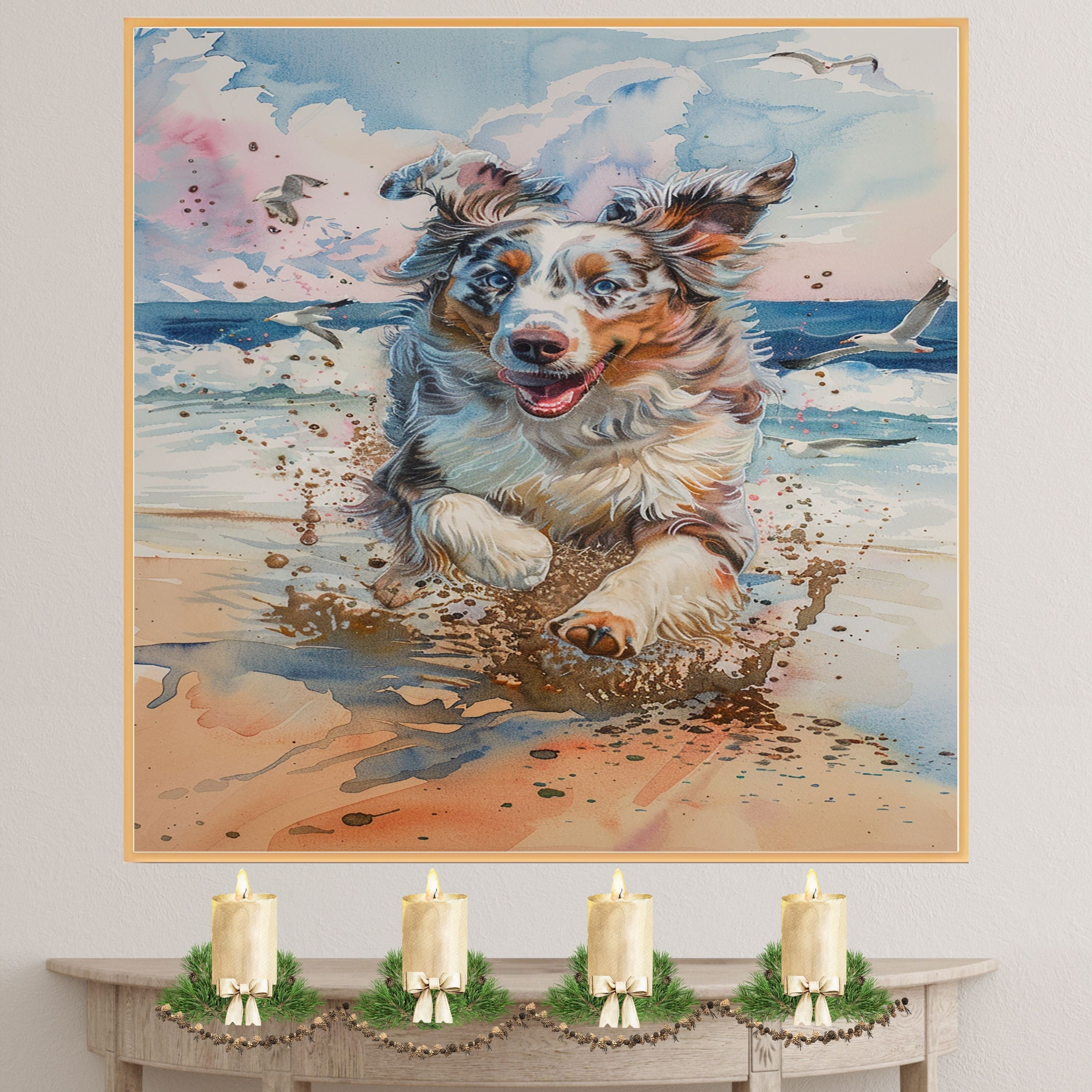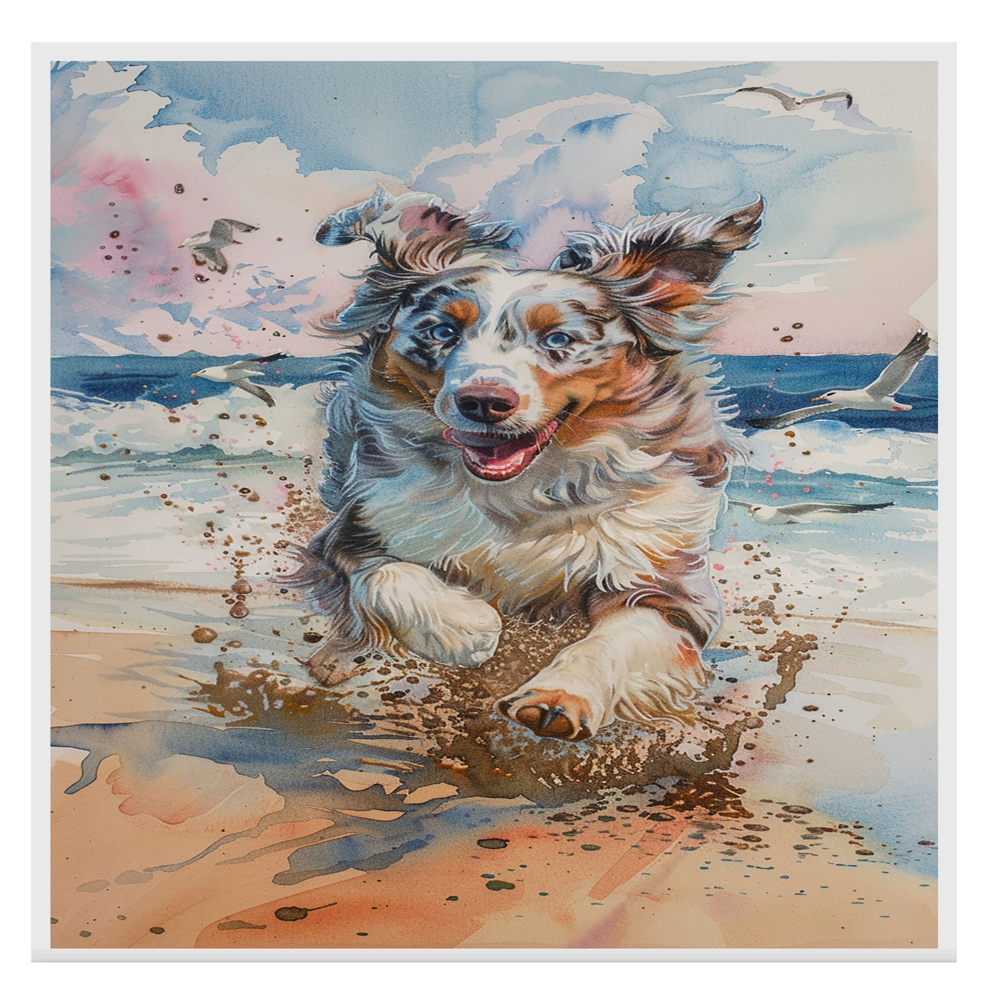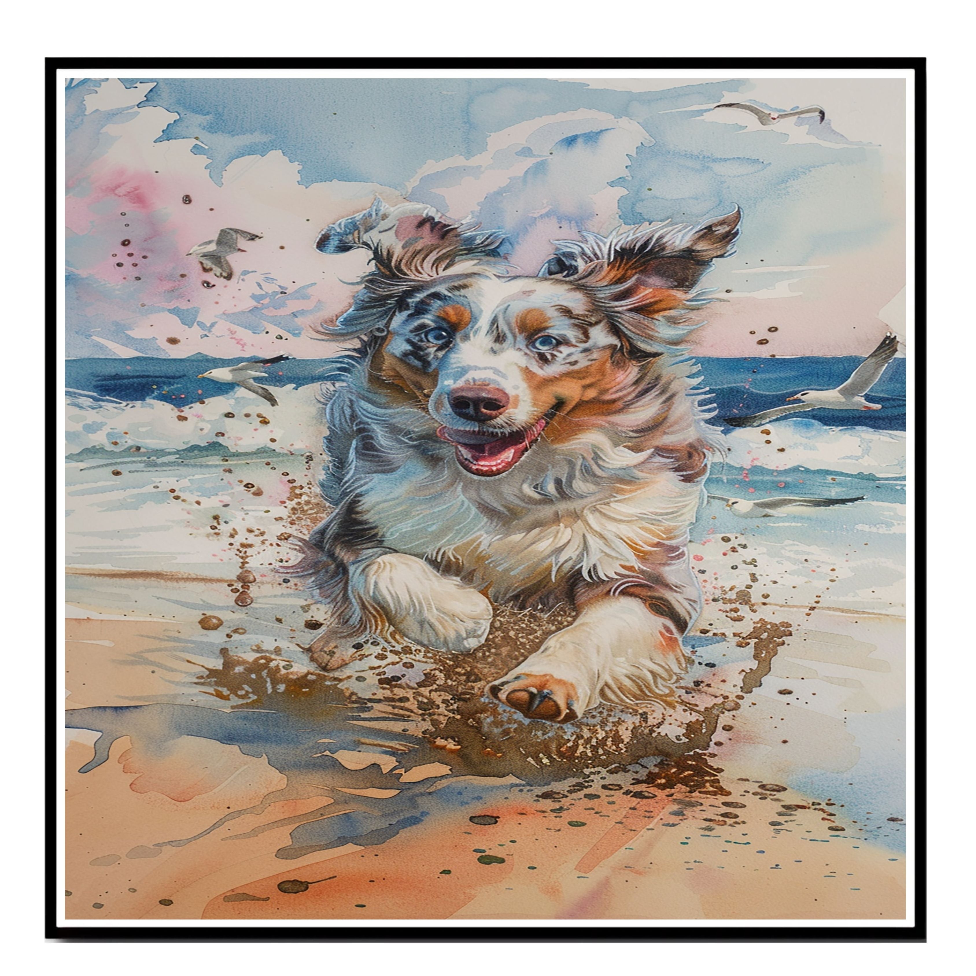 This energetic watercolor painting features a fluffy dog joyfully bounding across the beach, kicking up sand with every step. Behind the pup, rolling ocean waves and a dreamy pastel sky set the perfect seaside backdrop. This artwork radiates motion, personality, and the unfiltered joy of a dog’s day at the beach. A perfect gift or decor piece for animal lovers and beach dreamers alike.