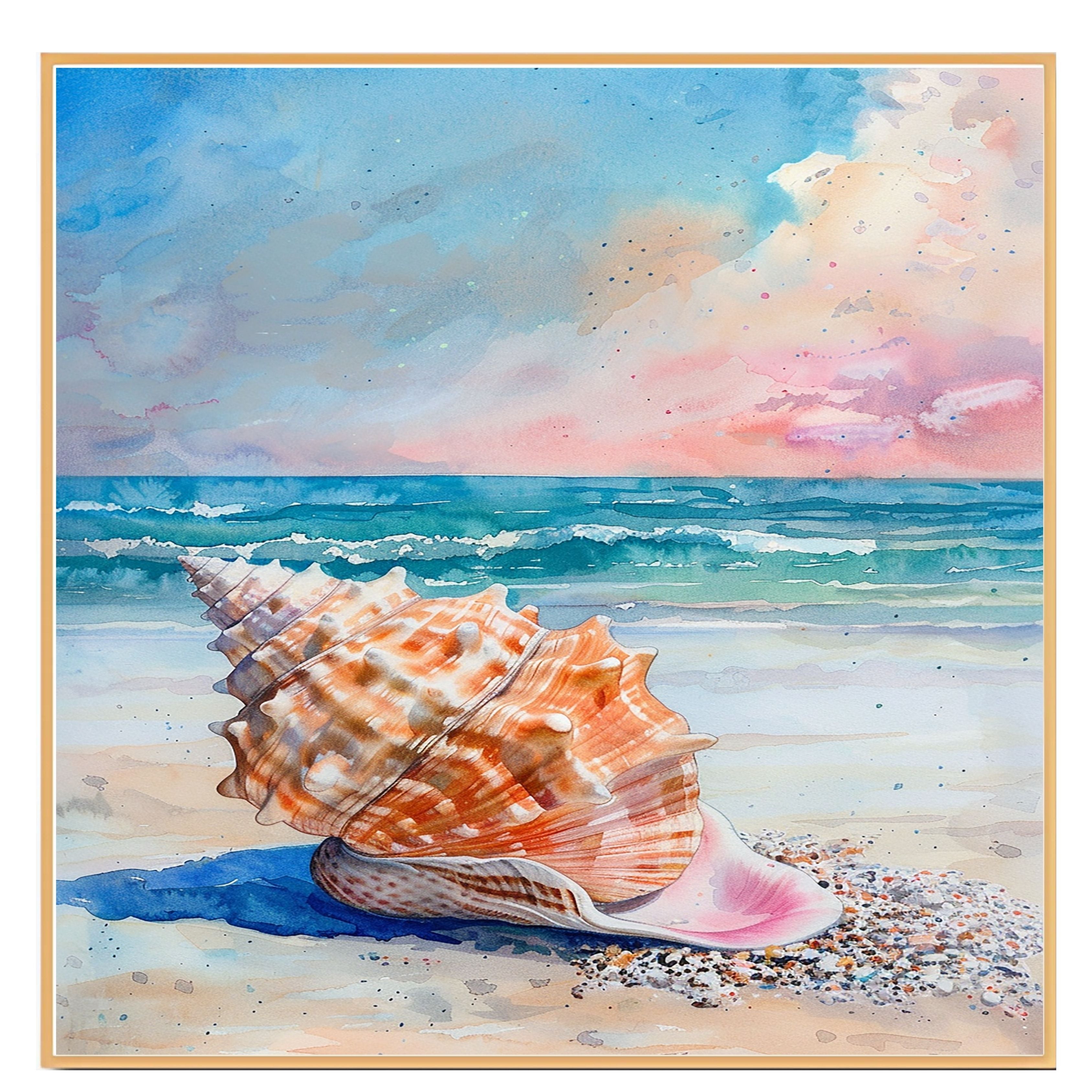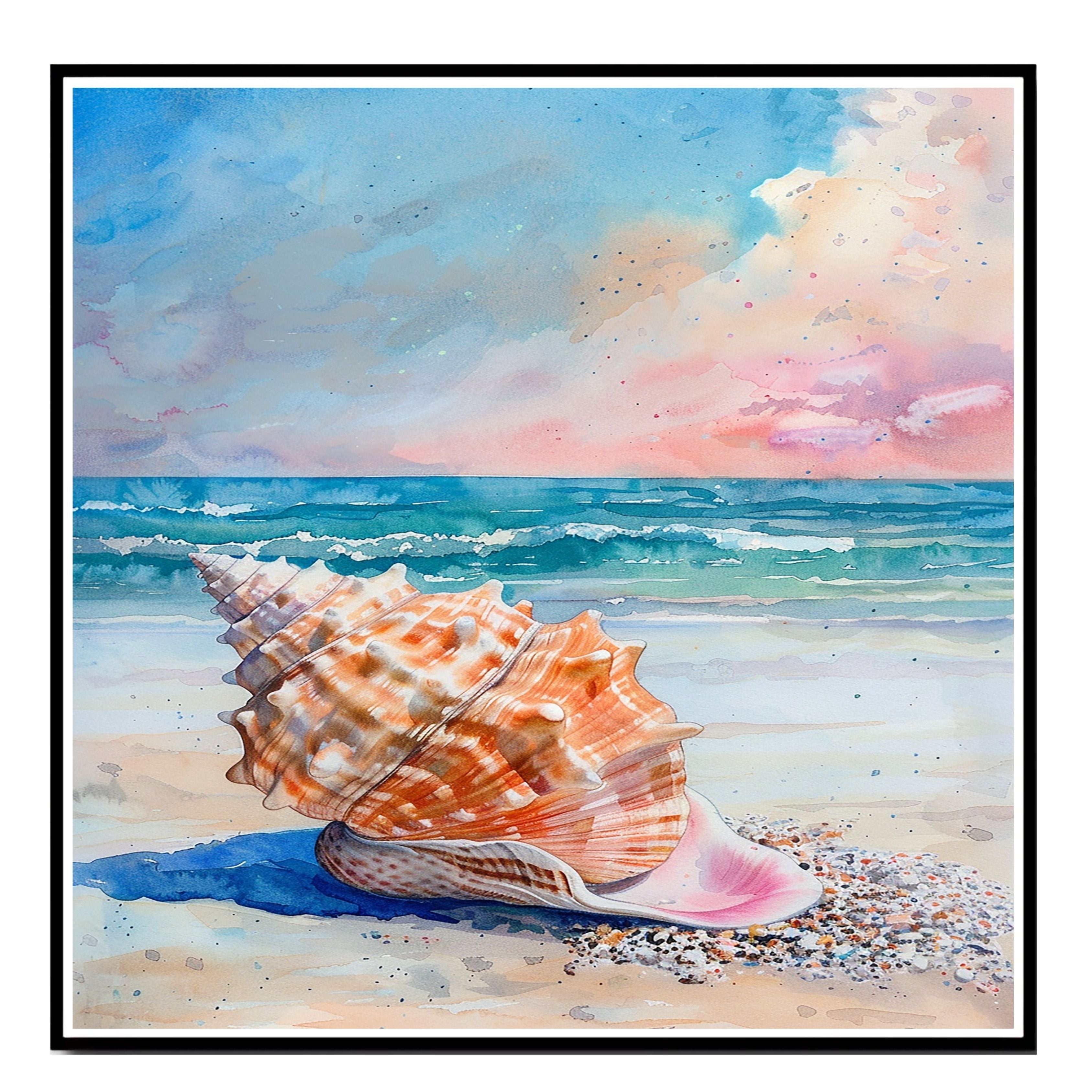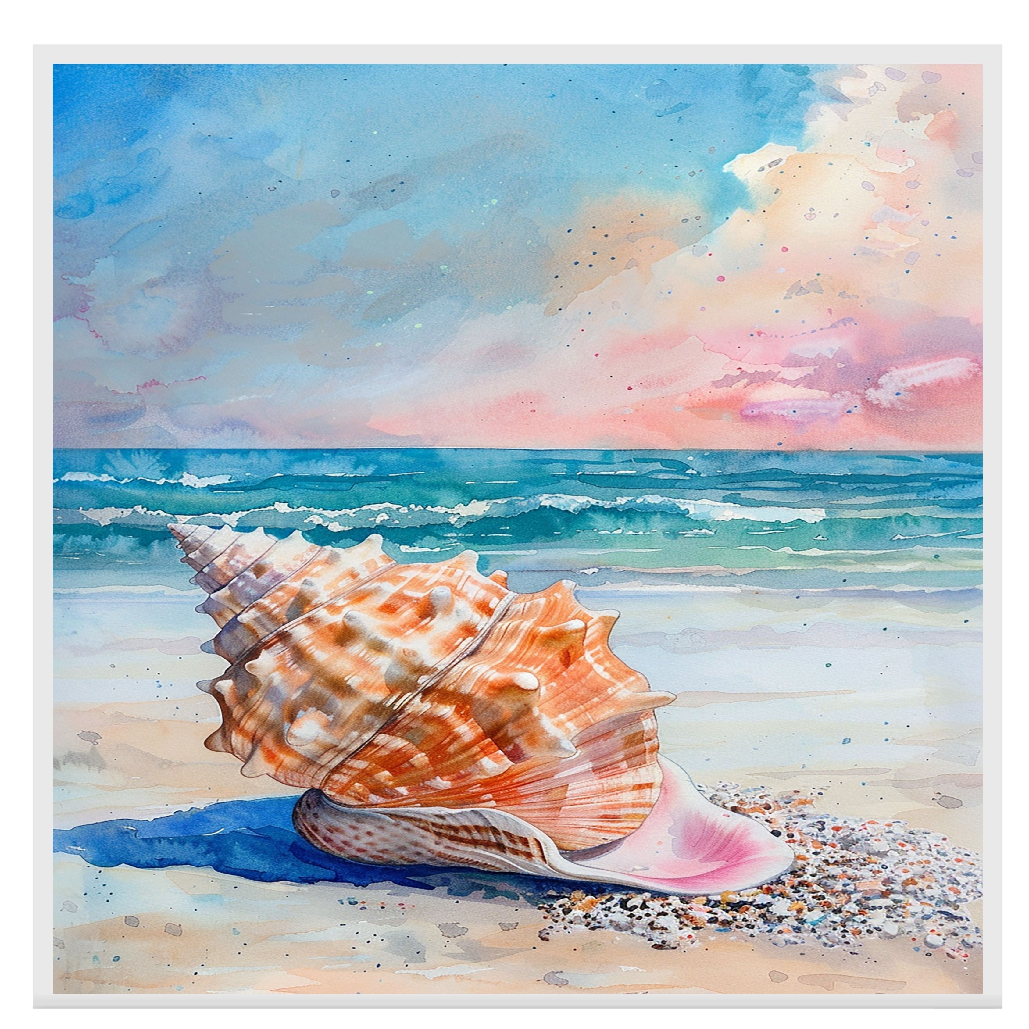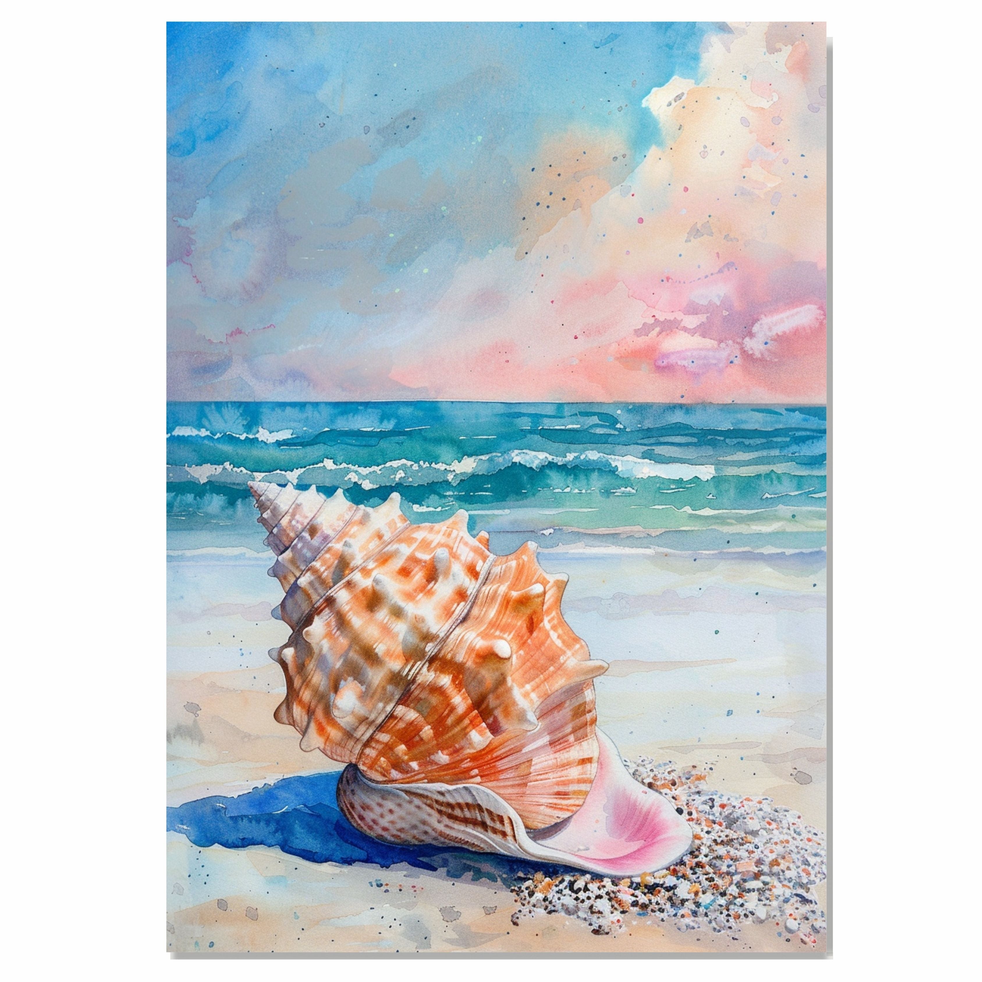 This stunning watercolor artwork captures a close-up of a large, textured seashell resting on the sandy shore as gentle waves roll in beneath a vibrant sky. Shades of coral, blue, and soft lavender bring warmth and tranquility to the scene, making it a perfect representation of seaside serenity. Ideal for coastal-themed interiors, beach house decor, or anyone who finds beauty in nature’s quiet moments, this piece radiates calm and ocean charm.