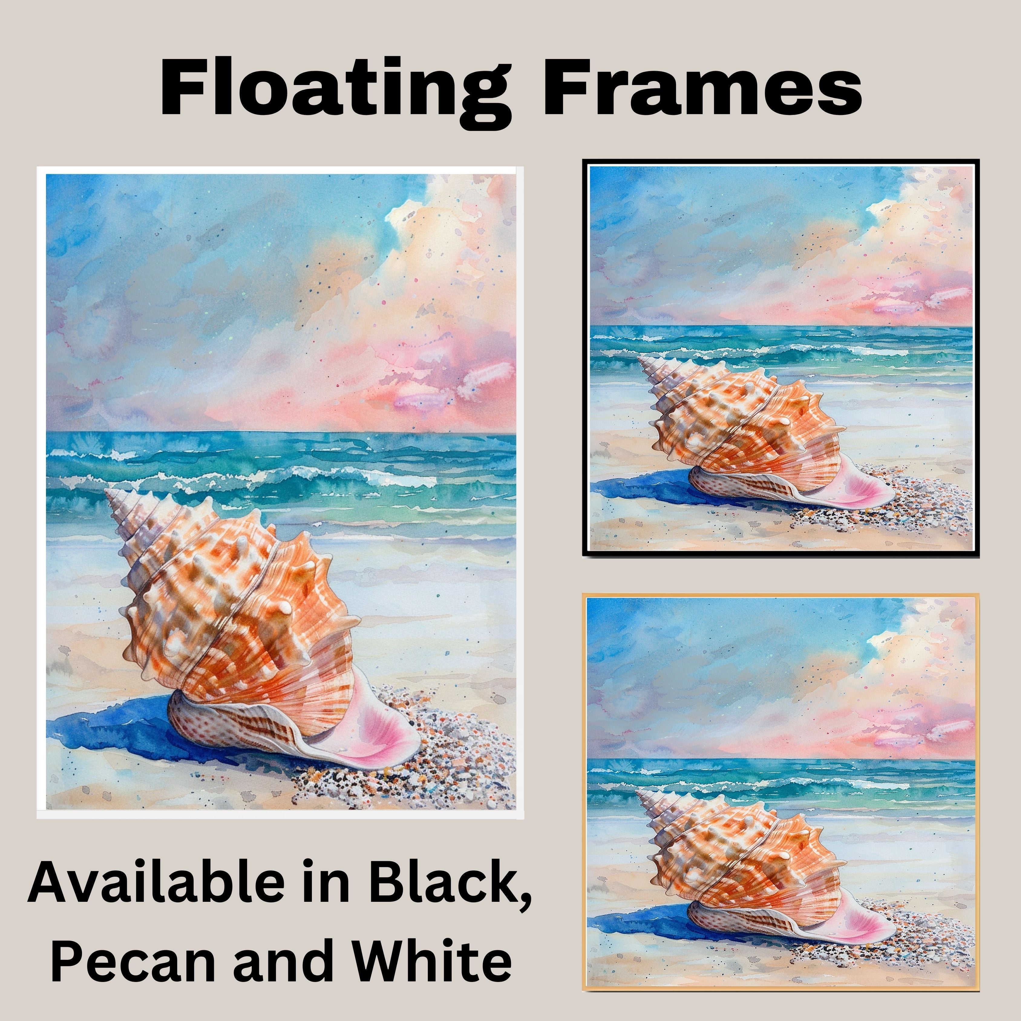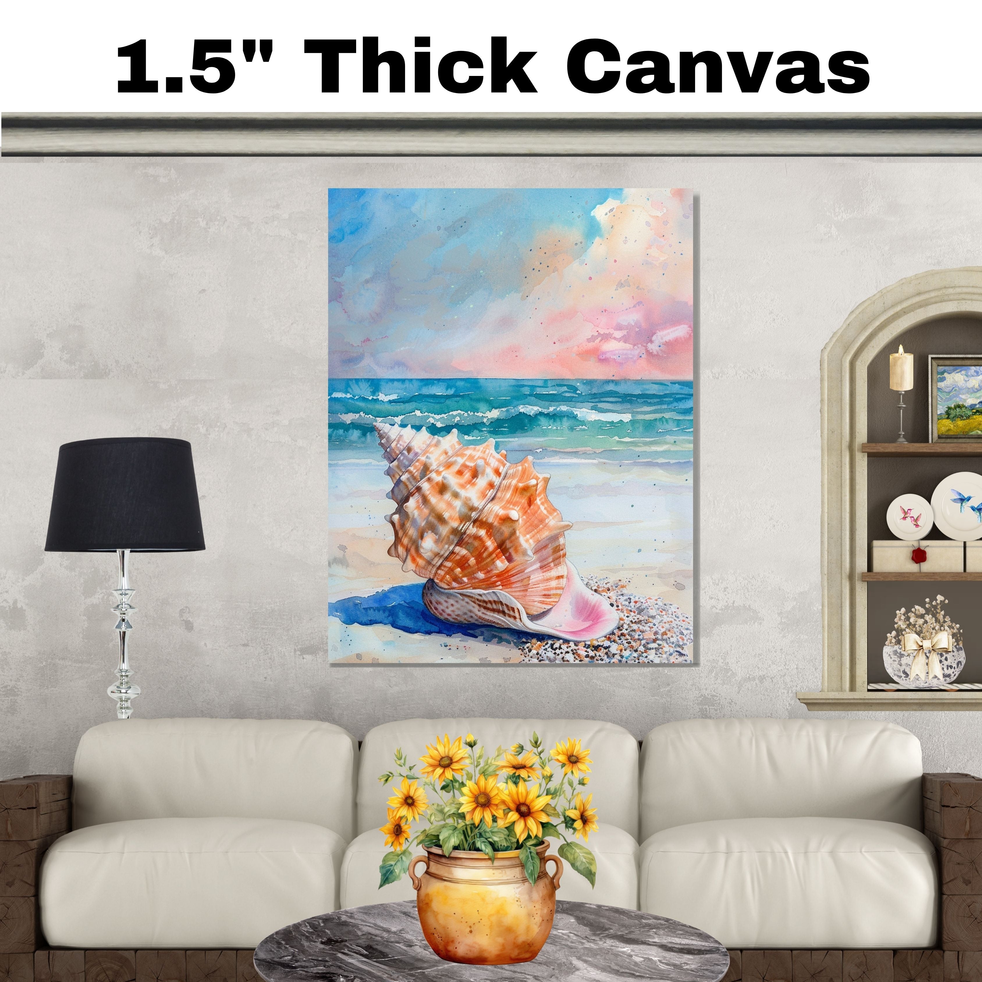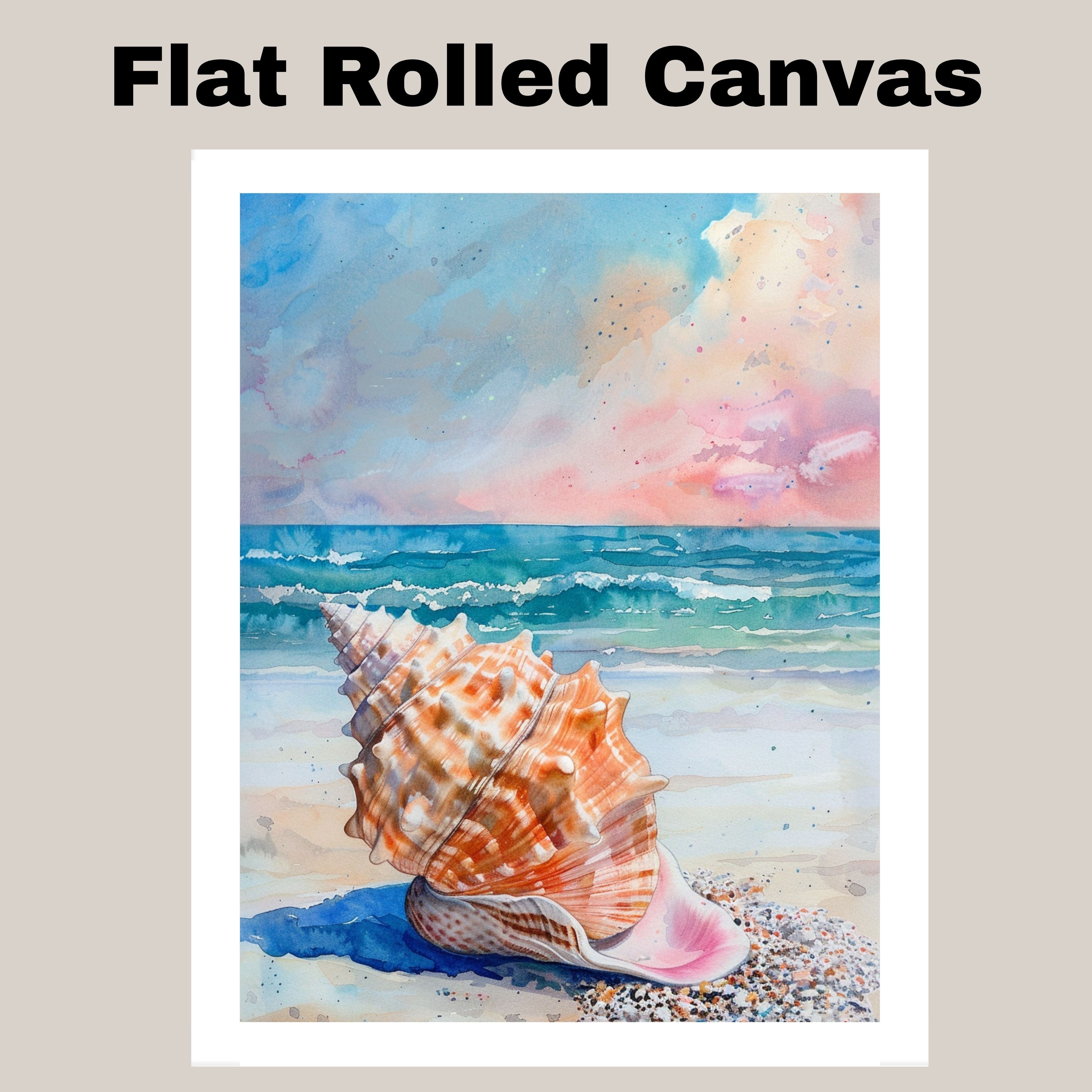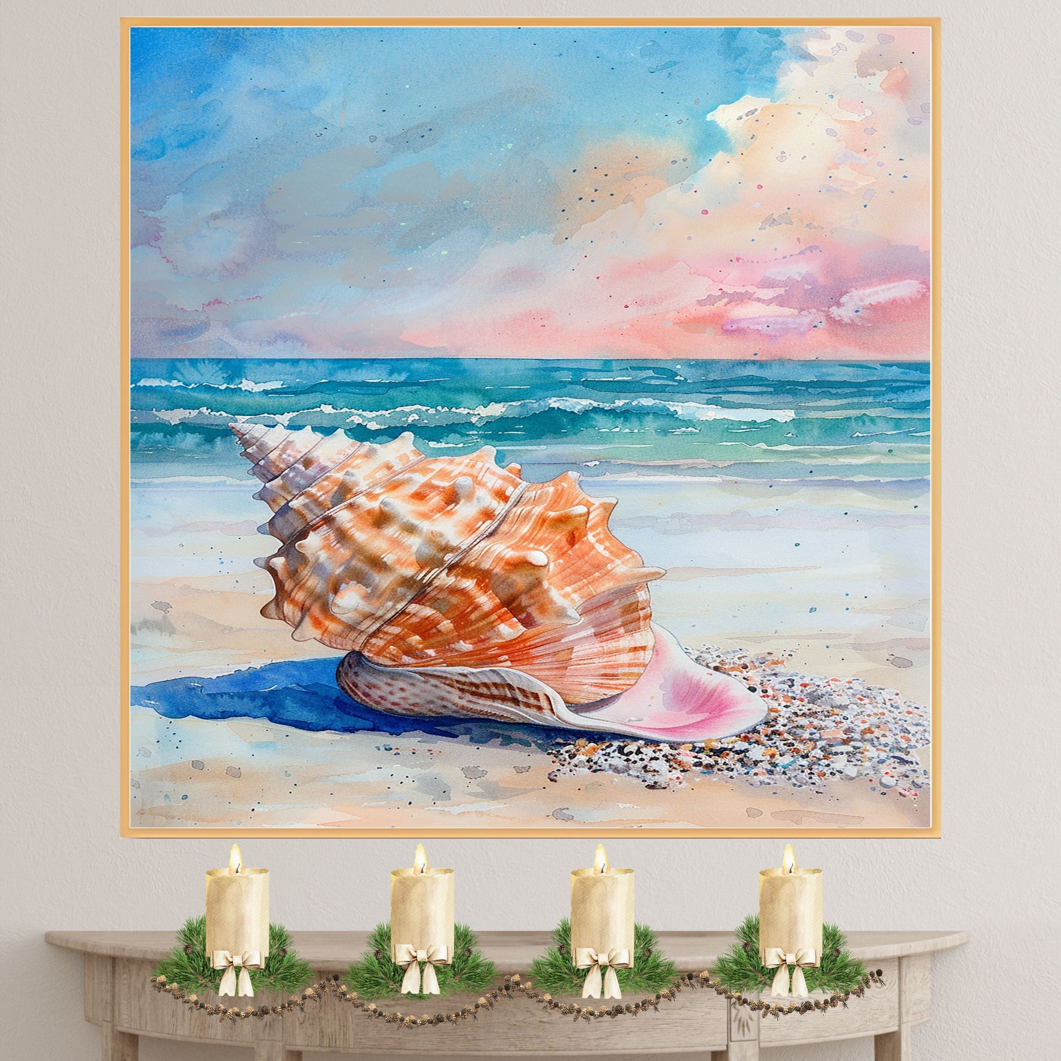 This stunning watercolor artwork captures a close-up of a large, textured seashell resting on the sandy shore as gentle waves roll in beneath a vibrant sky. Shades of coral, blue, and soft lavender bring warmth and tranquility to the scene, making it a perfect representation of seaside serenity. Ideal for coastal-themed interiors, beach house decor, or anyone who finds beauty in nature’s quiet moments, this piece radiates calm and ocean charm.