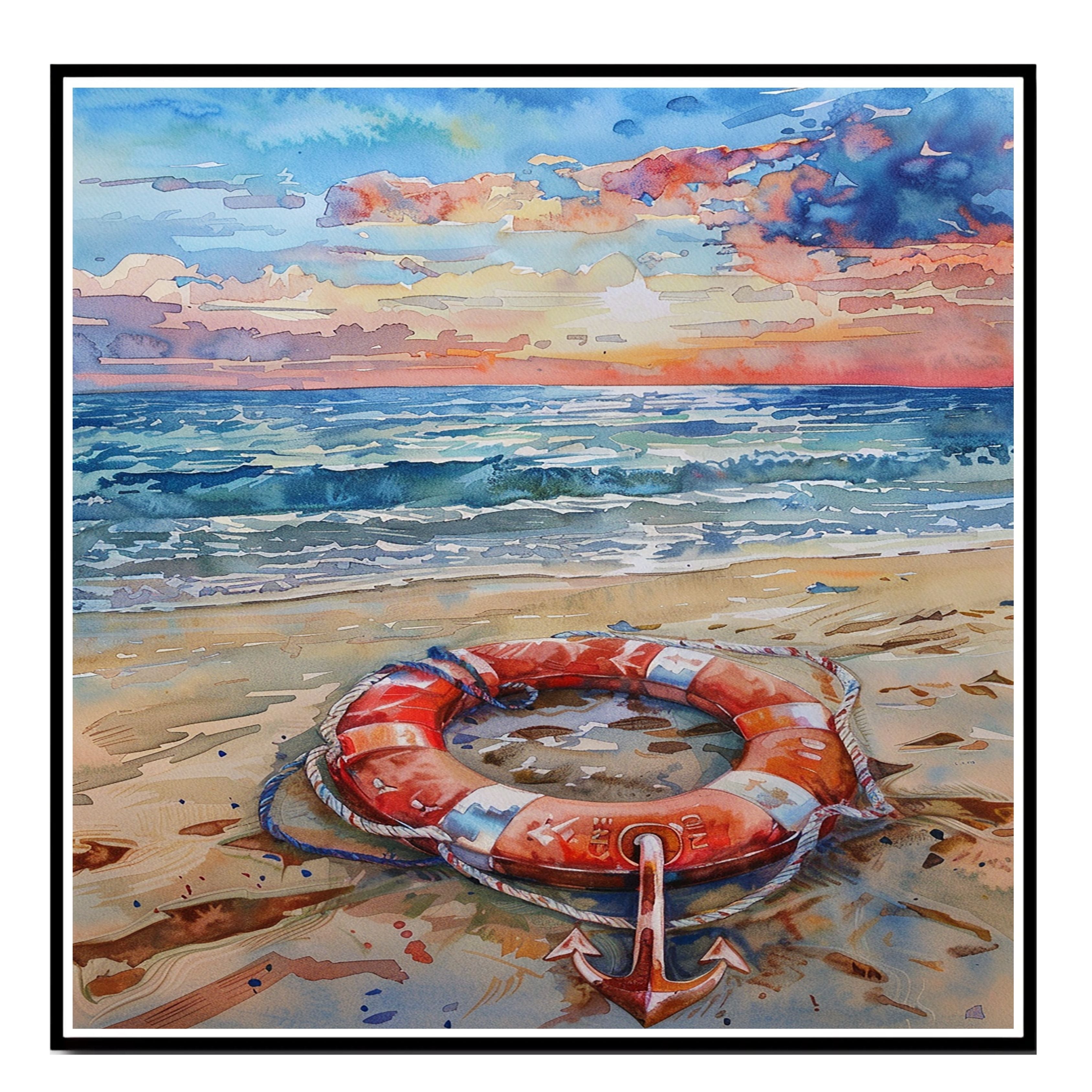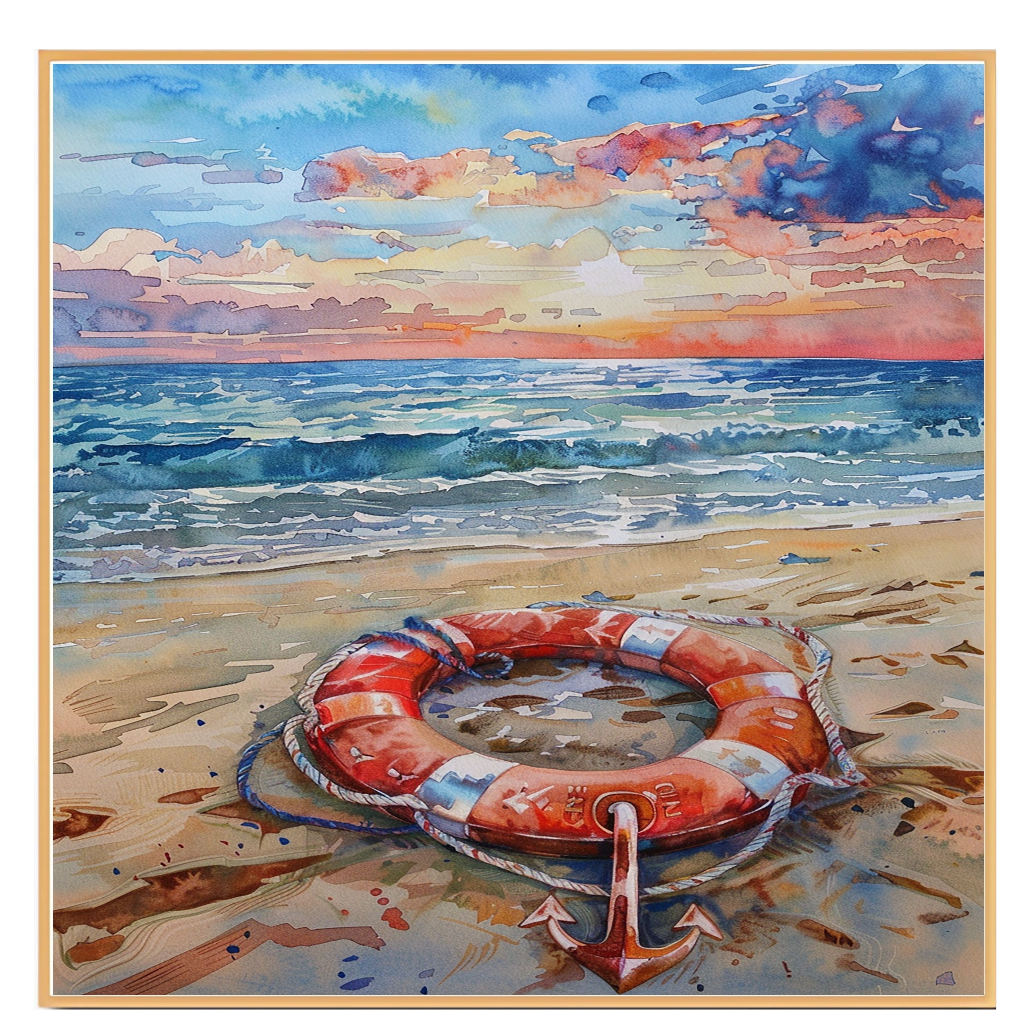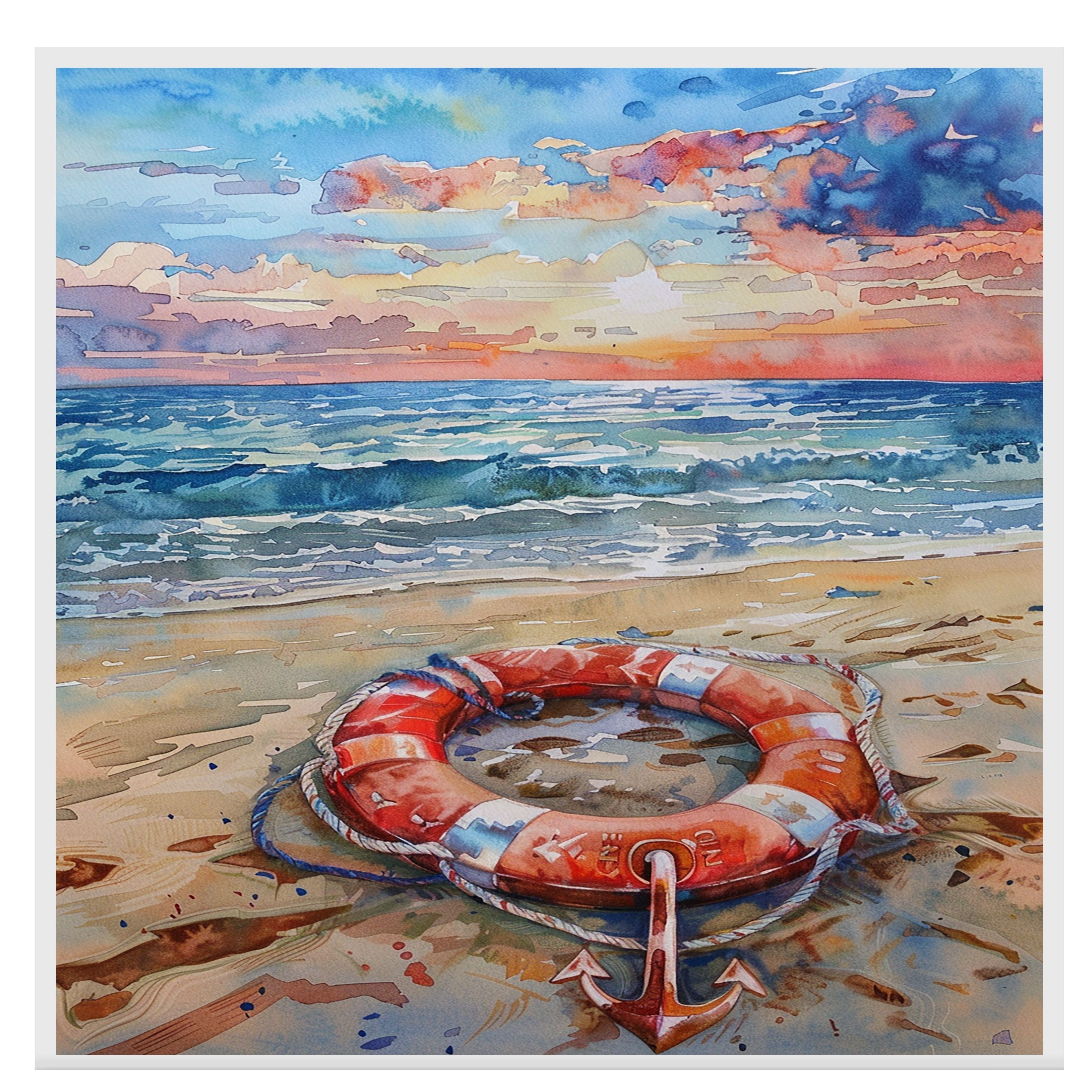 Capture the calm of the coast with this detailed watercolor painting featuring a life ring and anchor resting on a sandy beach. The ocean waves roll gently beneath a dramatic sunset sky painted in warm hues of orange, pink, and blue. This scene evokes a serene nautical atmosphere and adds a sense of adventure and maritime charm to any space. A perfect piece for beach lovers, sailors, or anyone who appreciates sea-inspired art.