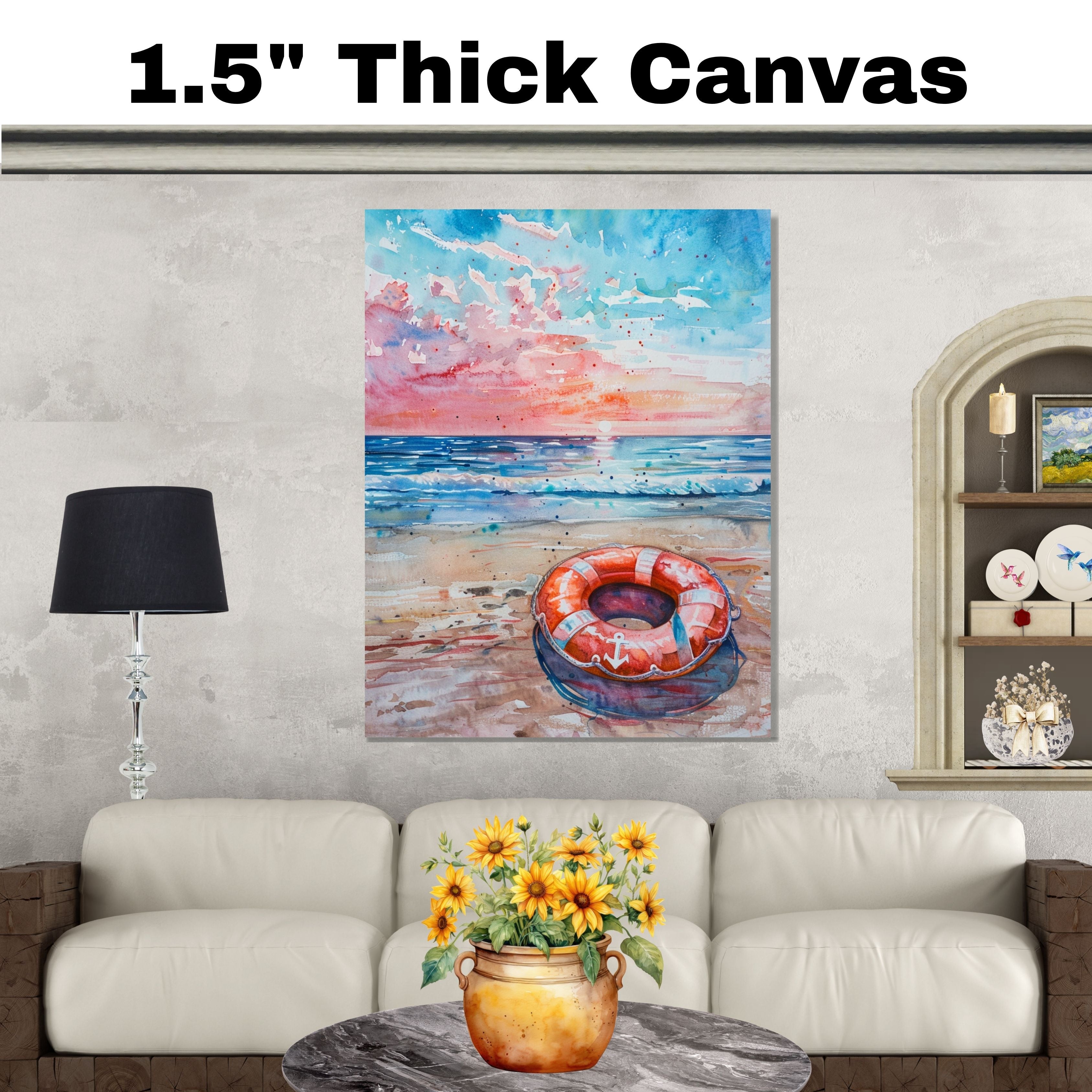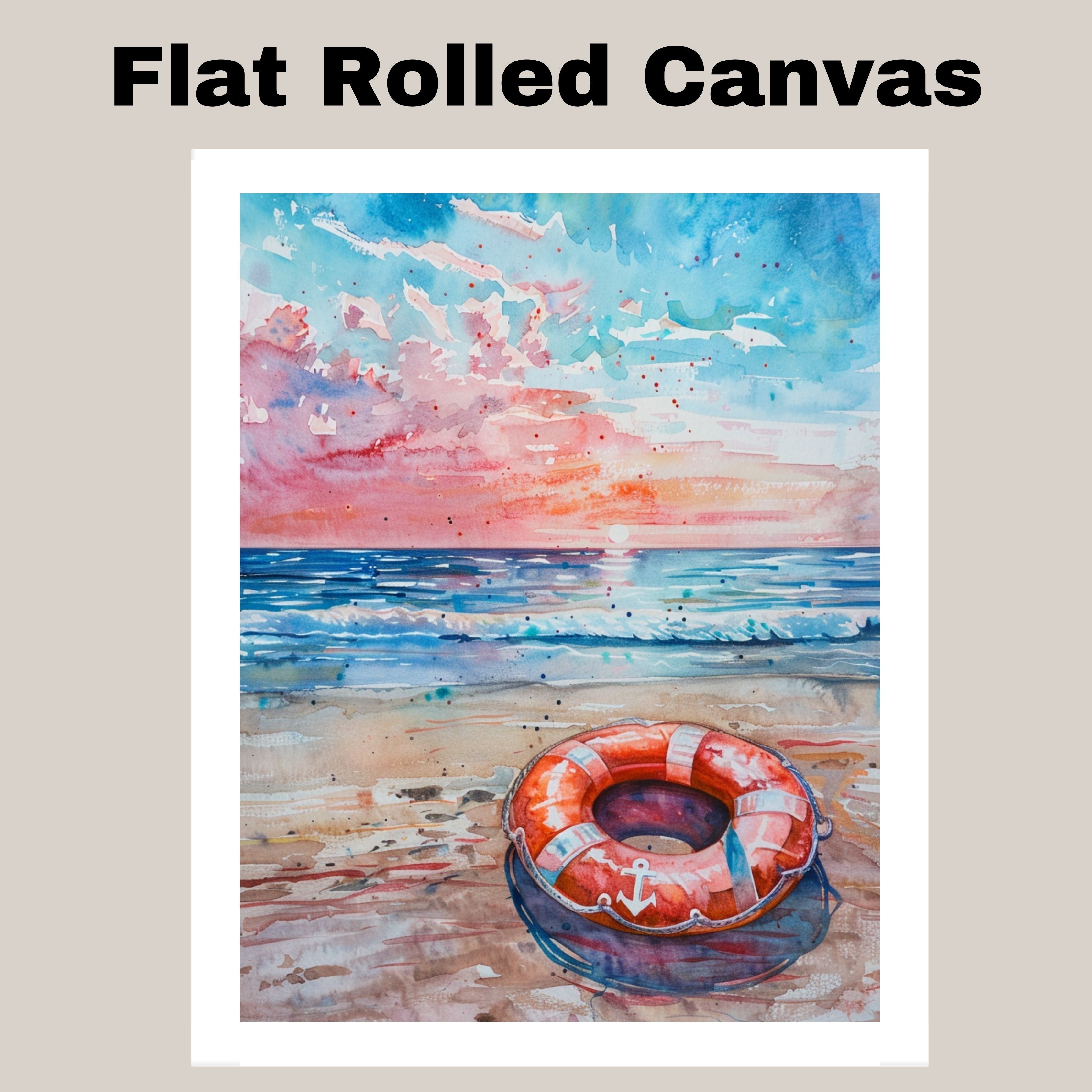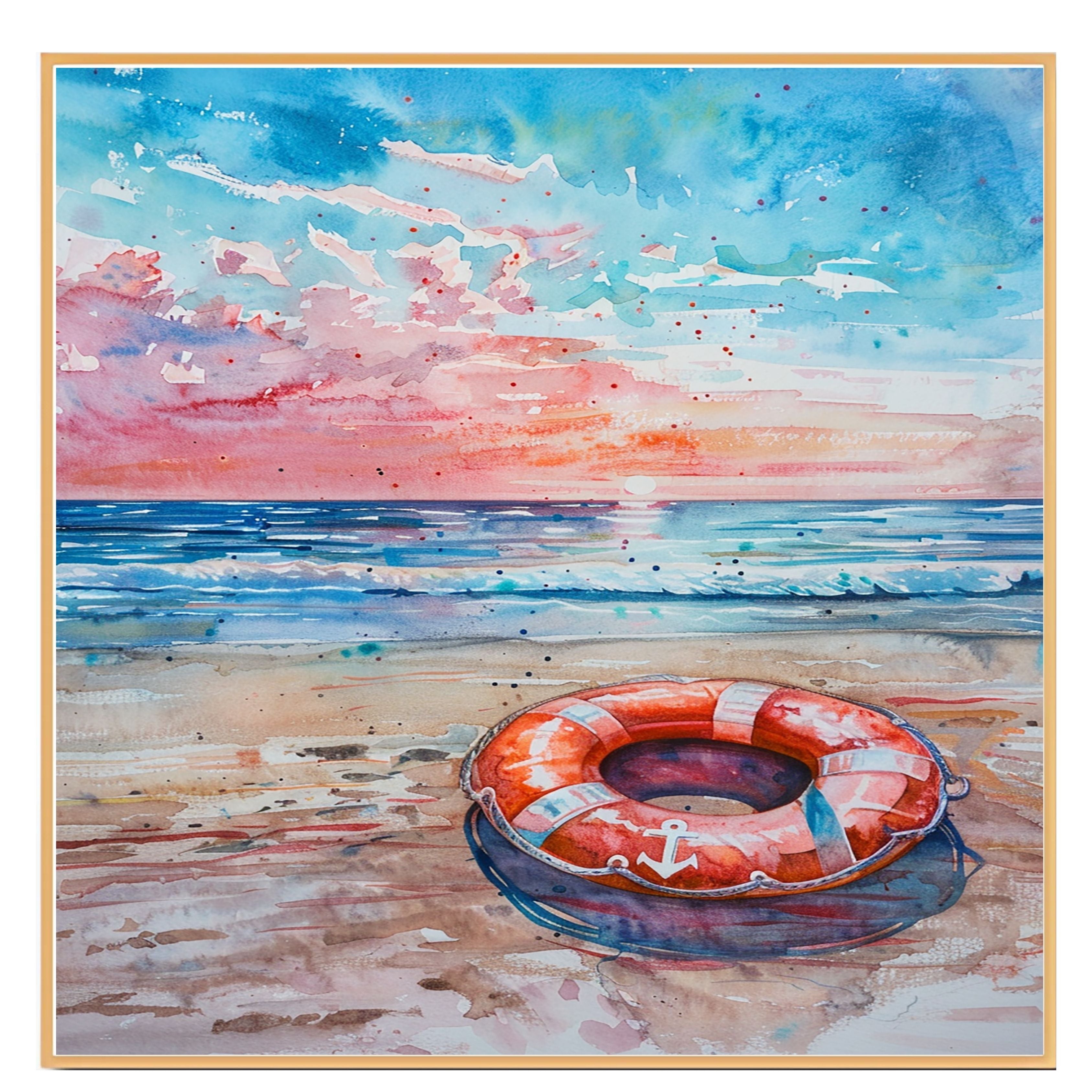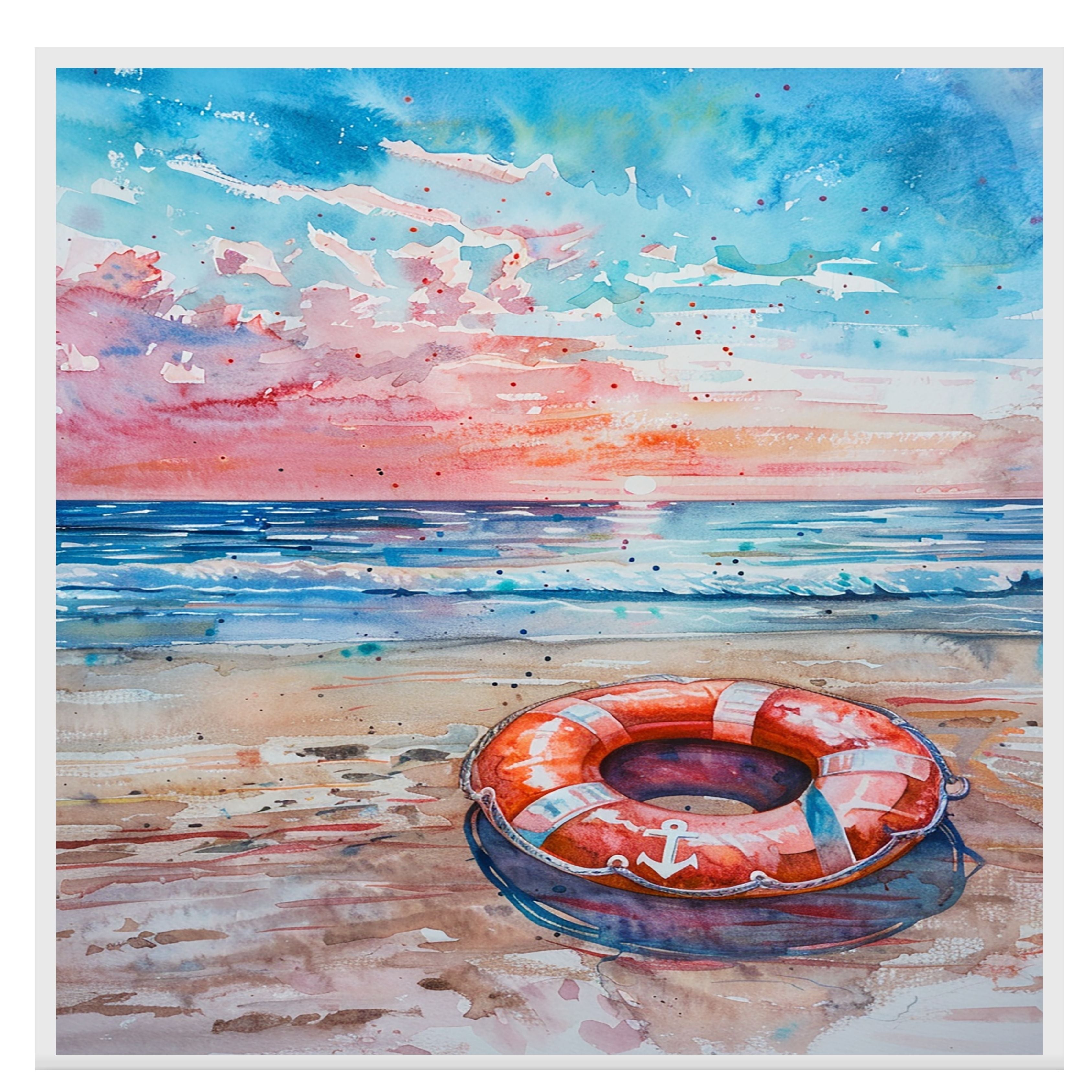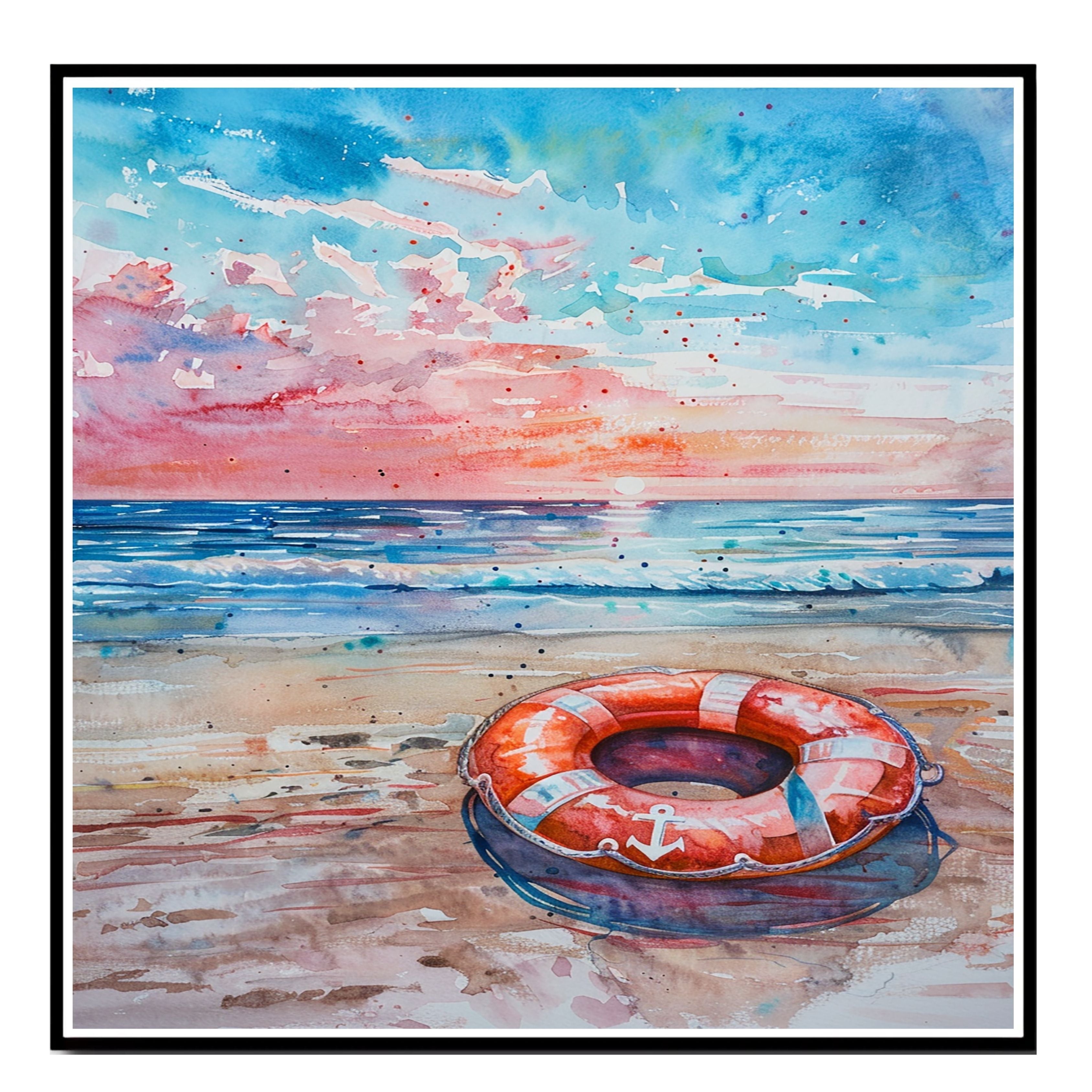 Bring the serenity of the shore into your space with this peaceful watercolor artwork featuring a lifebuoy resting on the sandy beach. Behind it, the ocean waves shimmer under a stunning sunset sky in warm tones of coral, blue, and lavender. Perfect for evoking the calming essence of coastal living, this painting makes a thoughtful gift for beach lovers or anyone who appreciates tranquil seascapes and nautical themes.