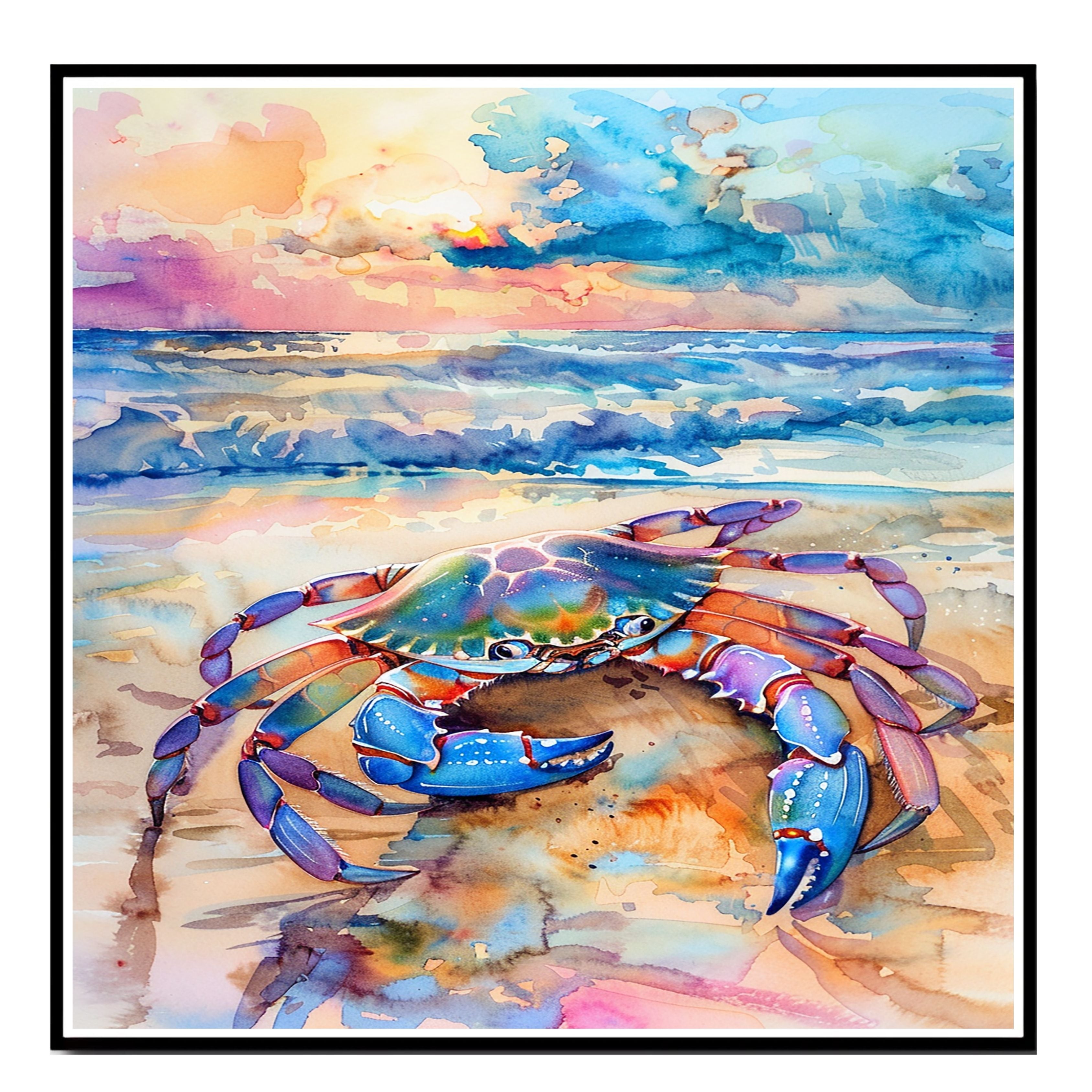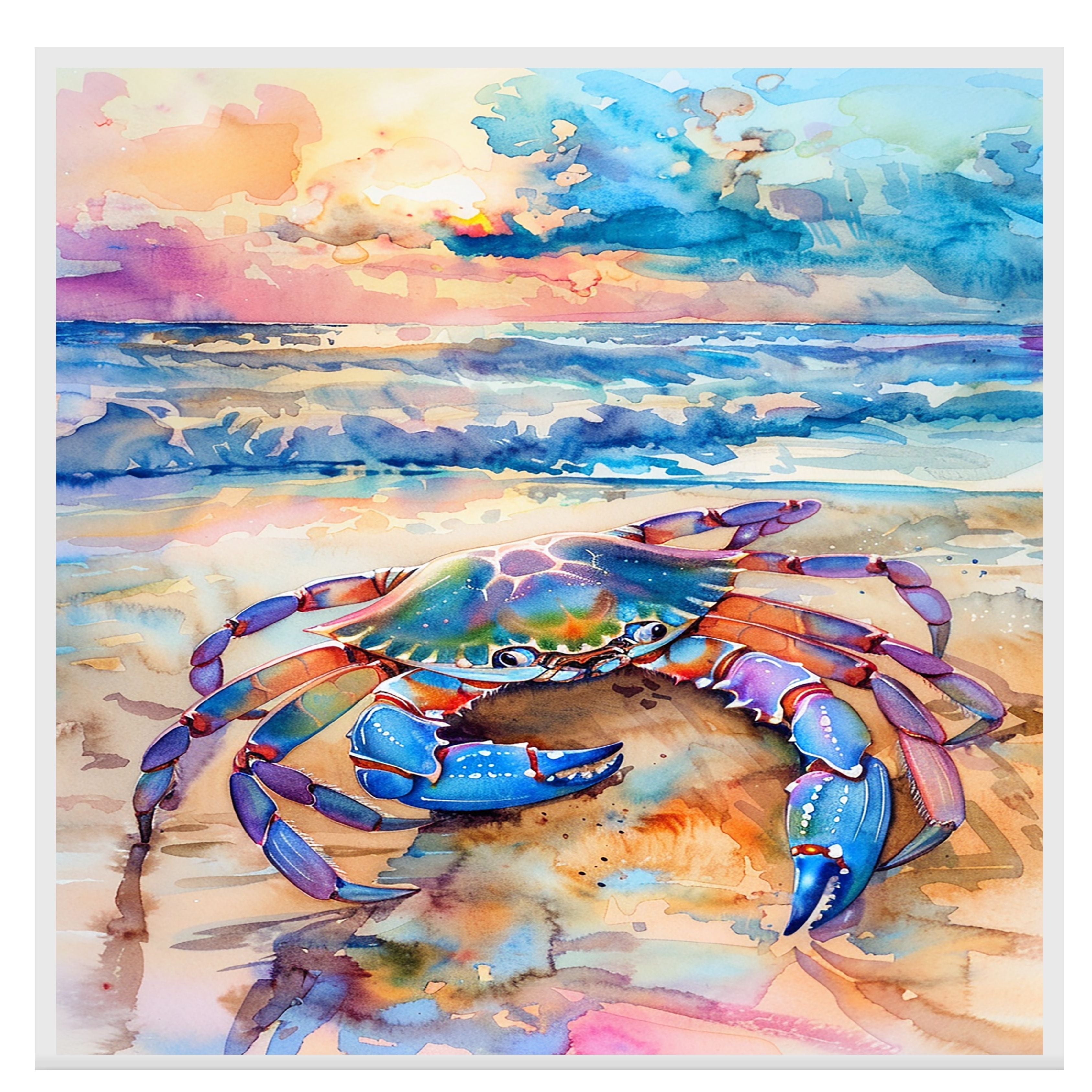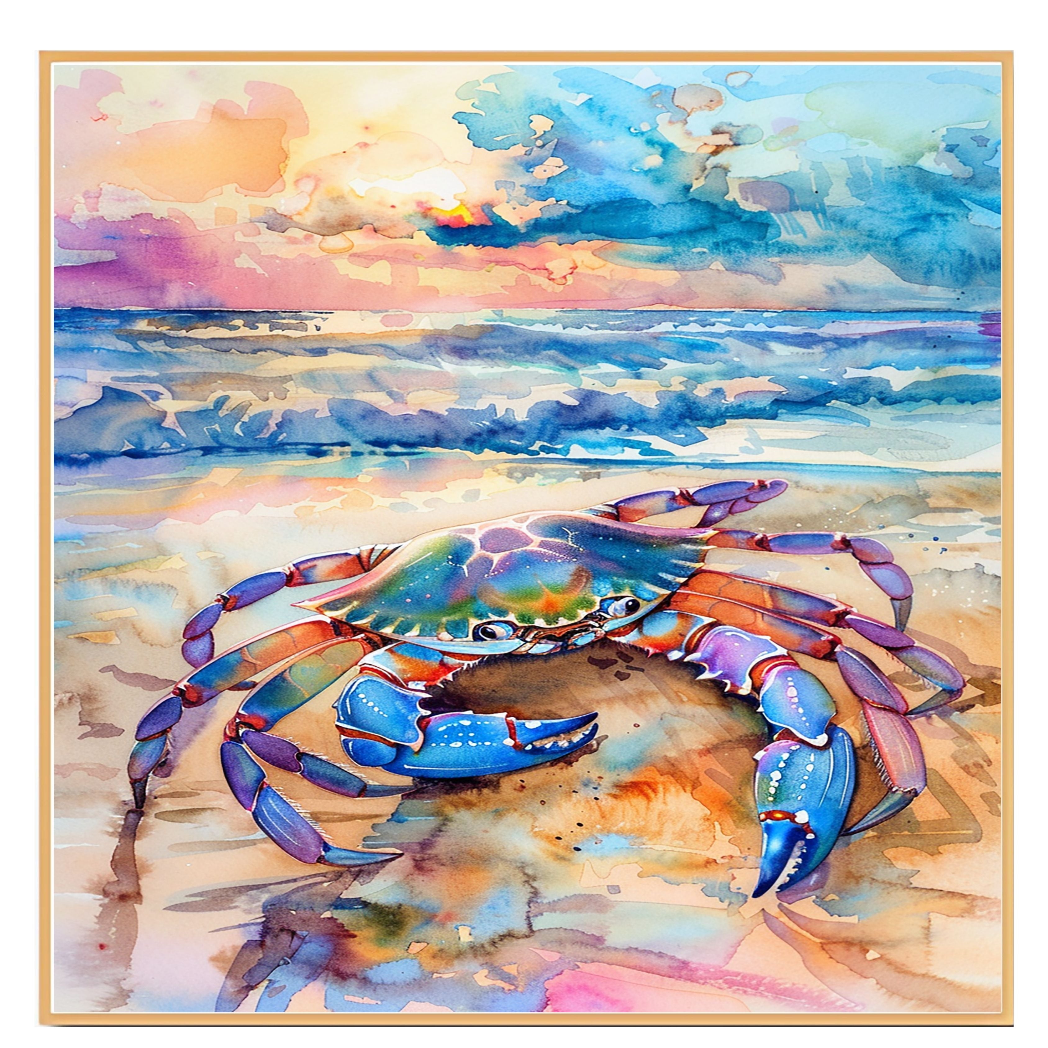 This vivid watercolor painting captures a multicolored crab on a sandy beach at sunset. With expressive hues of blue, purple, and orange, it celebrates the beauty of marine life and coastal serenity. Perfect for ocean lovers and beach-themed décor.