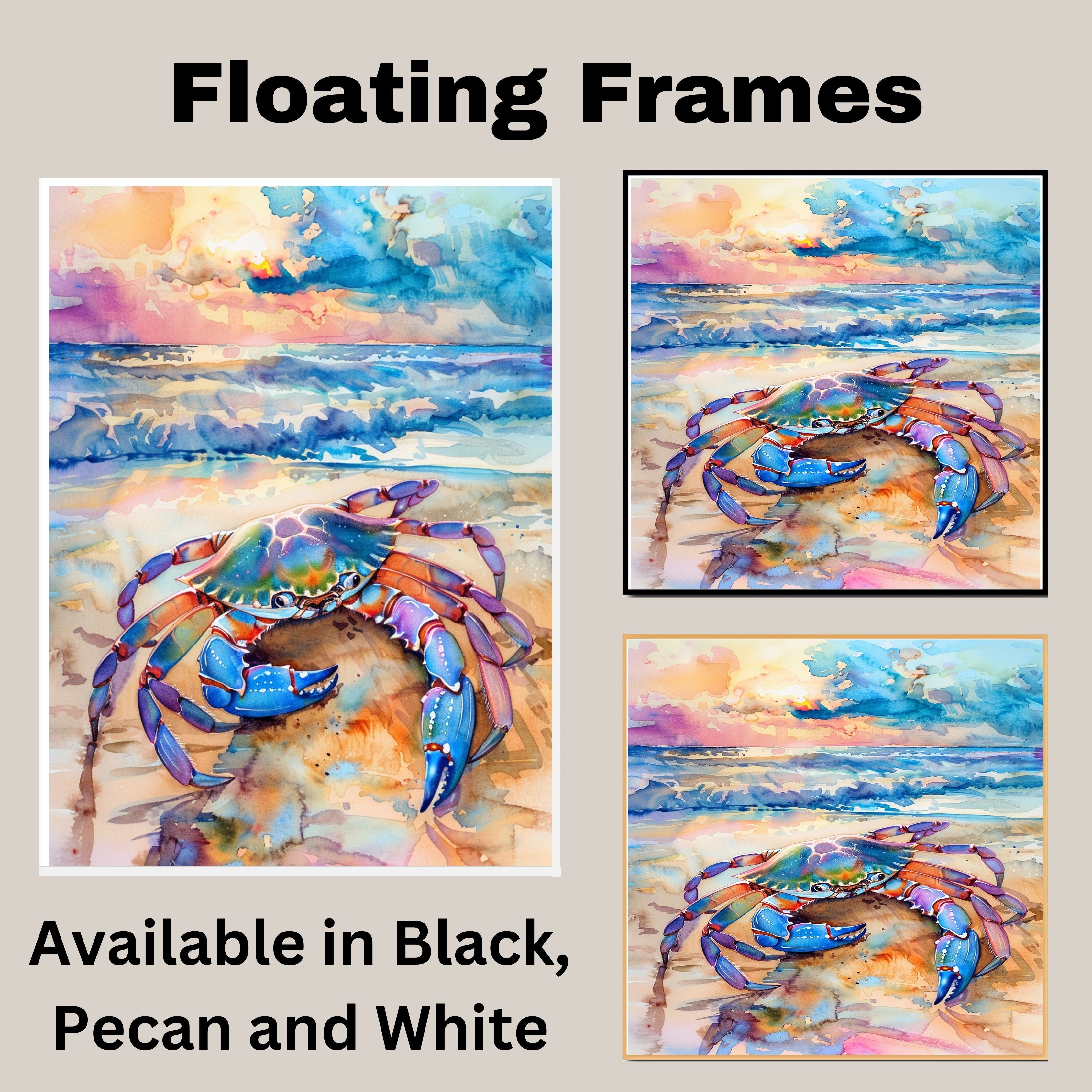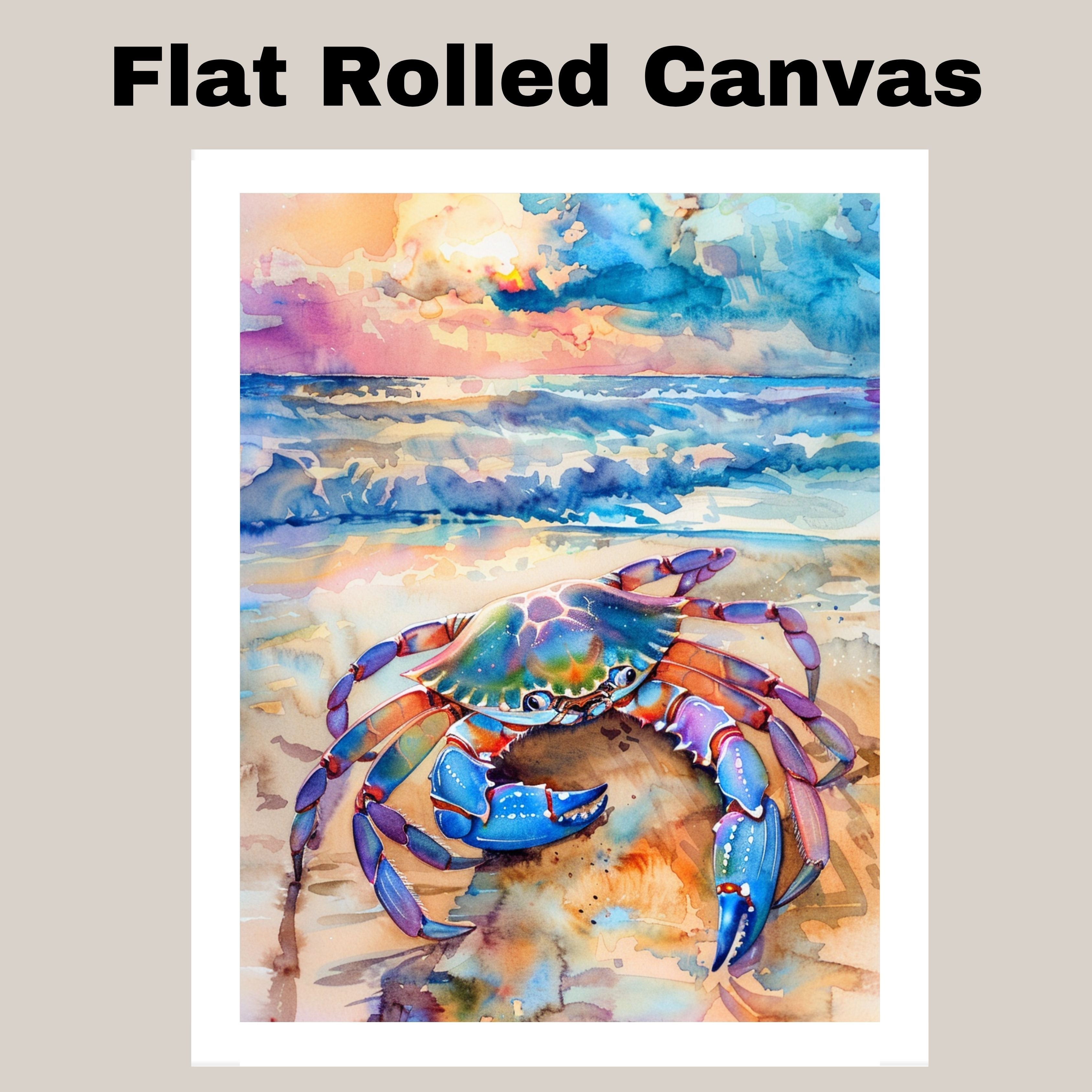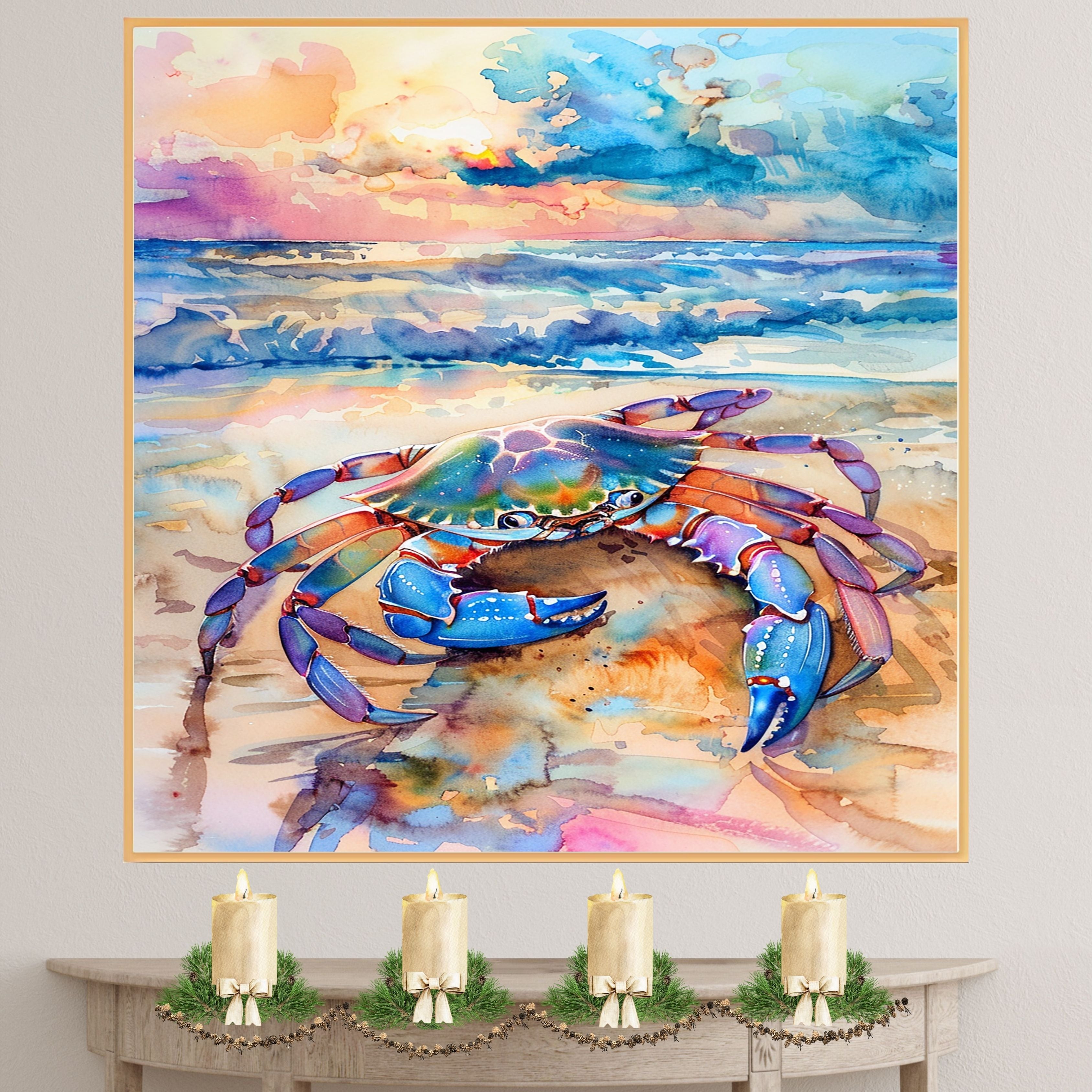 This vivid watercolor painting captures a multicolored crab on a sandy beach at sunset. With expressive hues of blue, purple, and orange, it celebrates the beauty of marine life and coastal serenity. Perfect for ocean lovers and beach-themed décor.