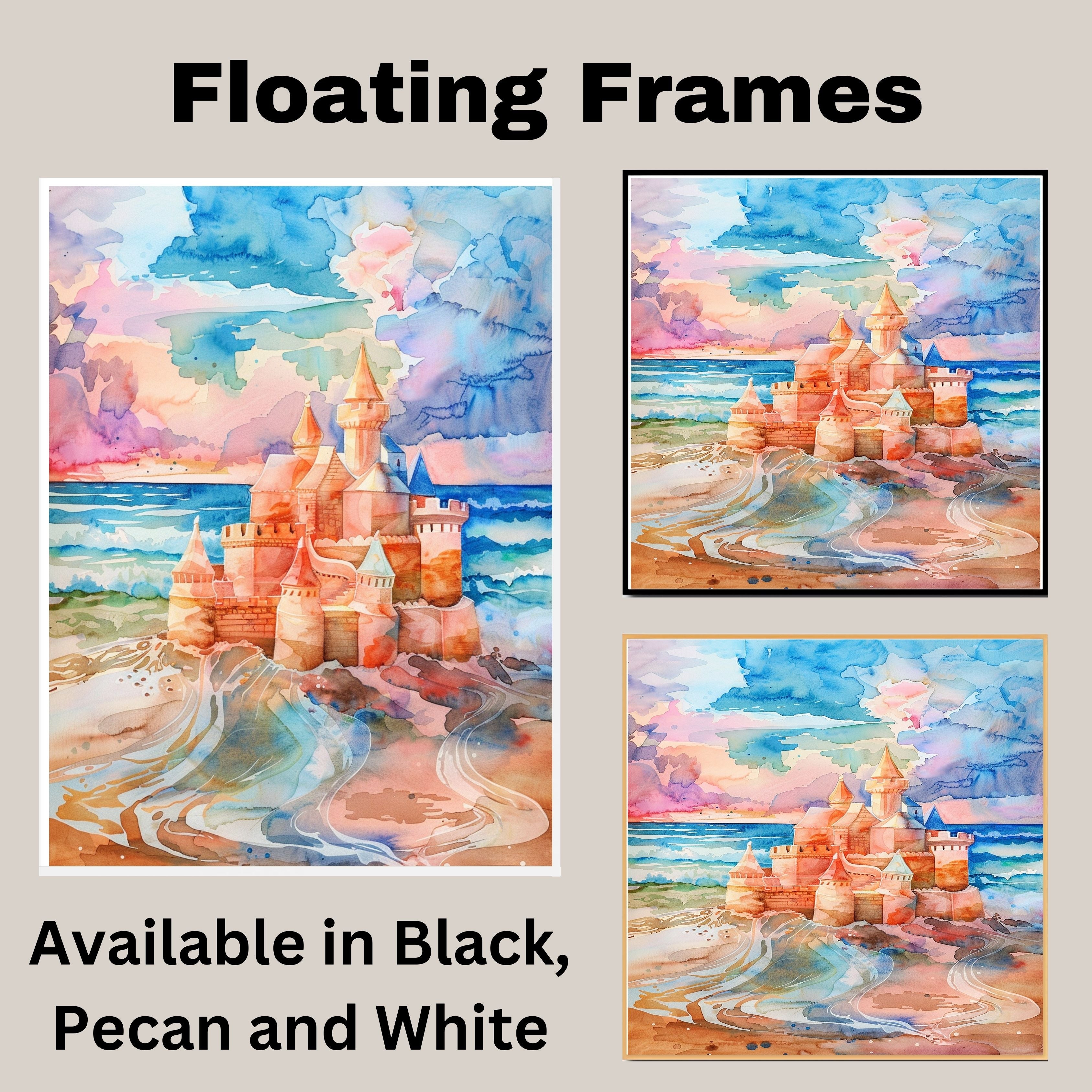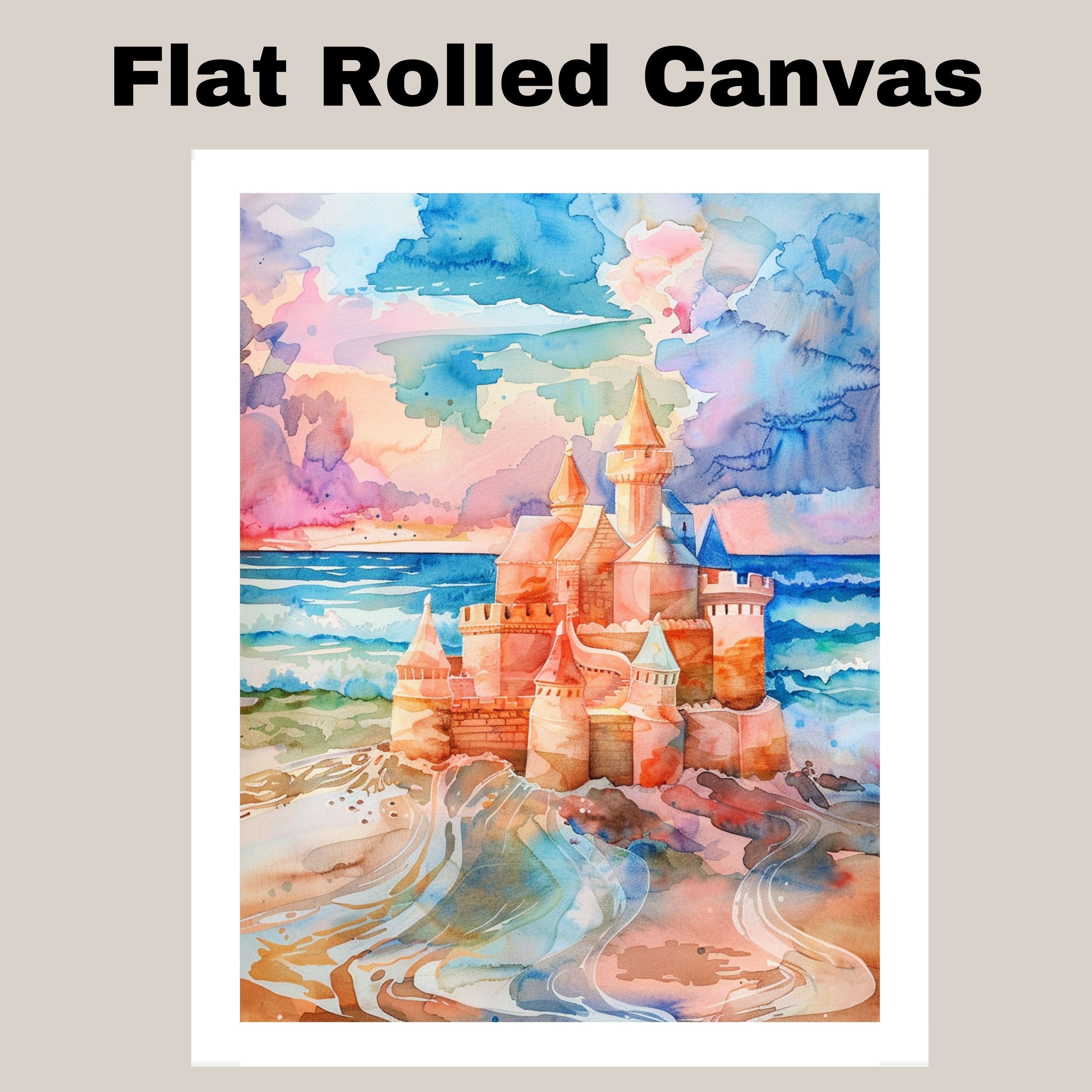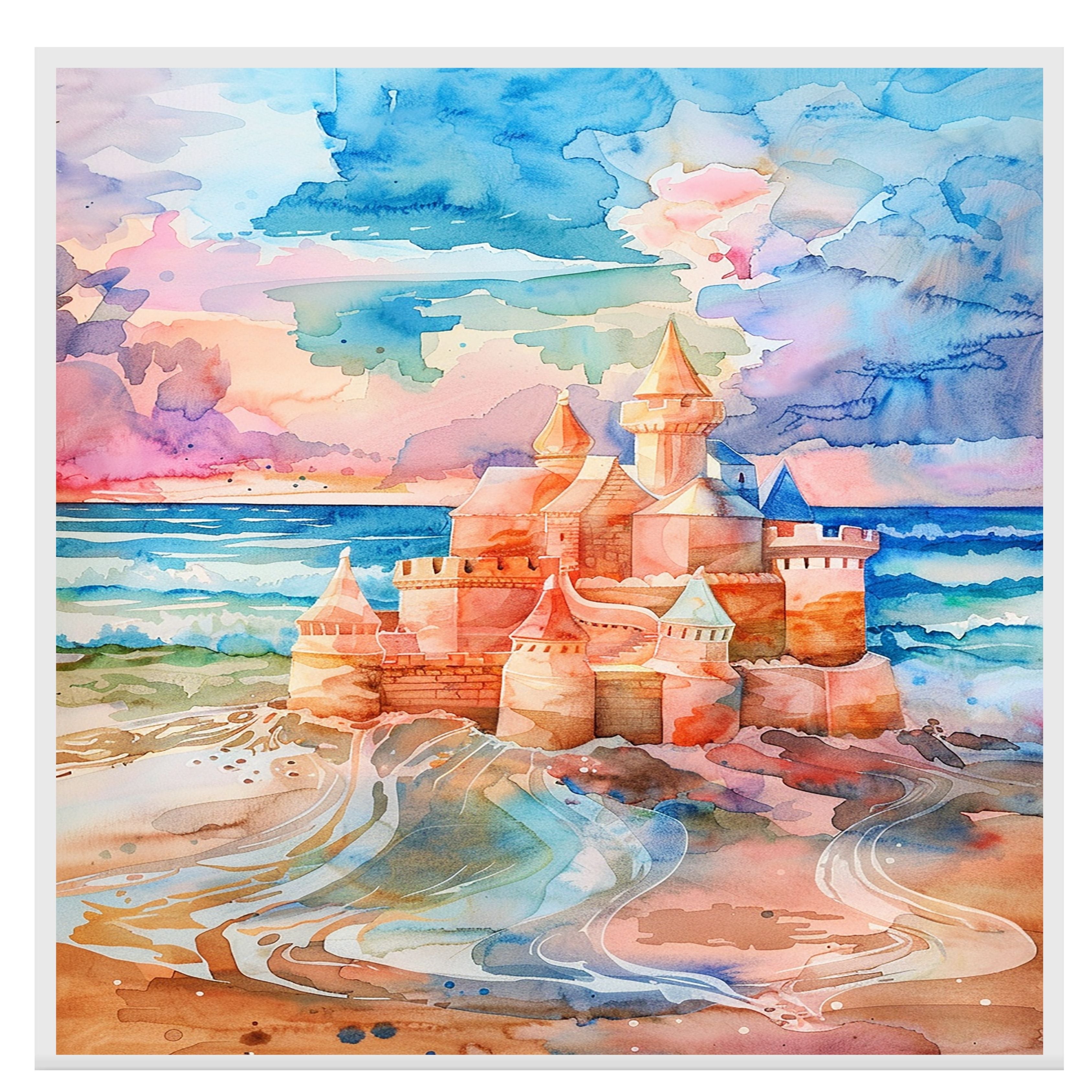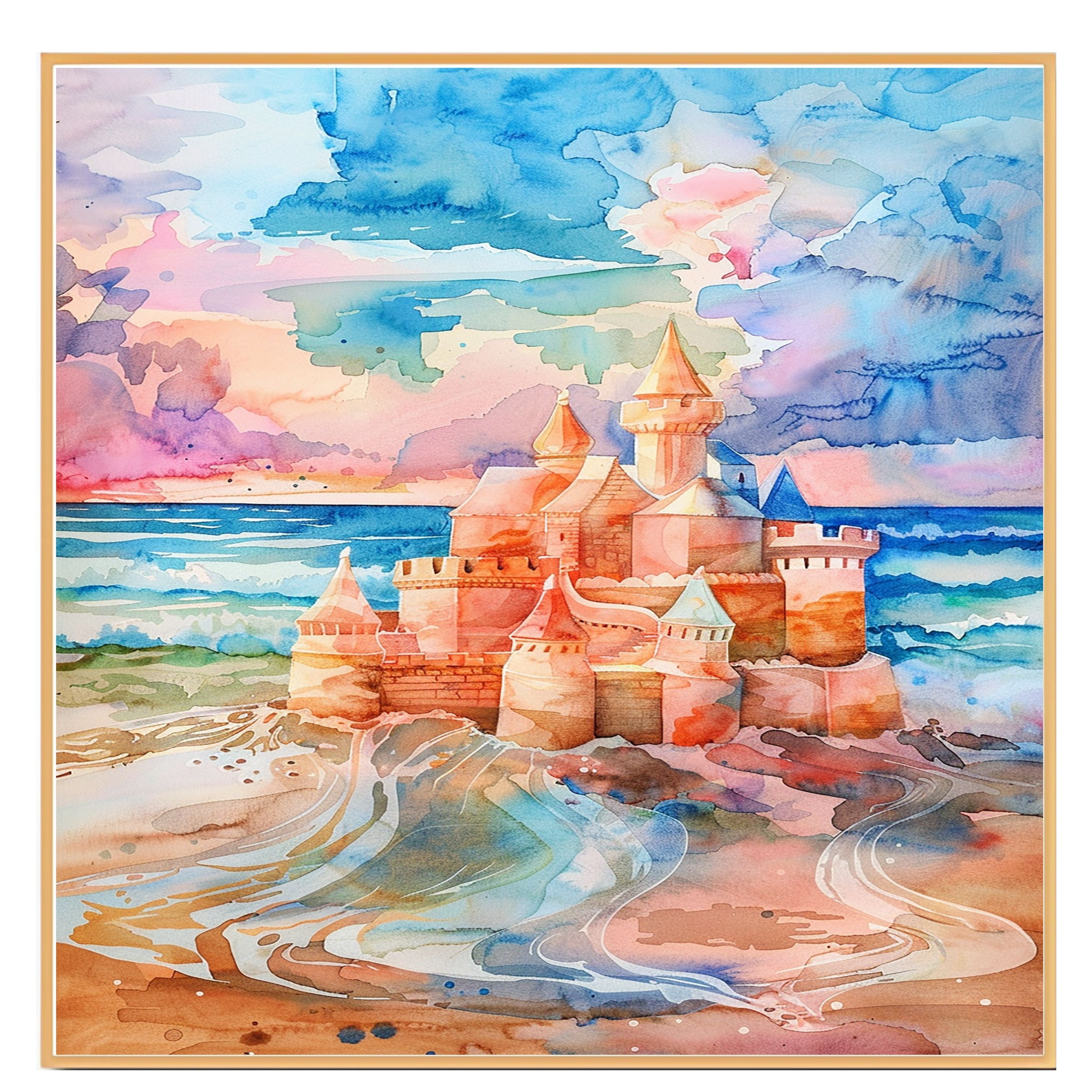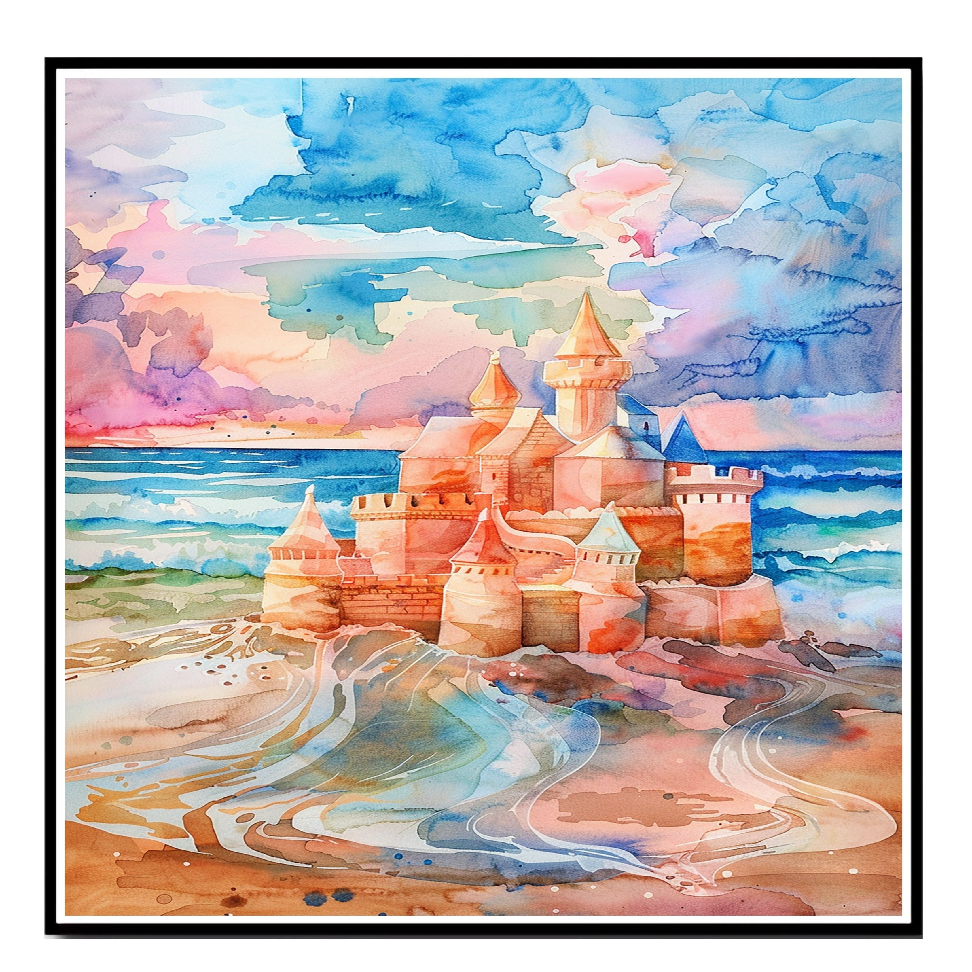 This enchanting watercolor artwork features a dreamy sandcastle nestled at the water's edge. Painted in soft, vibrant tones of coral, gold, and seafoam blue, the whimsical architecture stands tall against a colorful sky and gently rolling waves. Perfect for coastal-themed spaces, beach nurseries, or anyone who loves imaginative seaside scenes, this piece evokes childlike wonder and magical beach days.