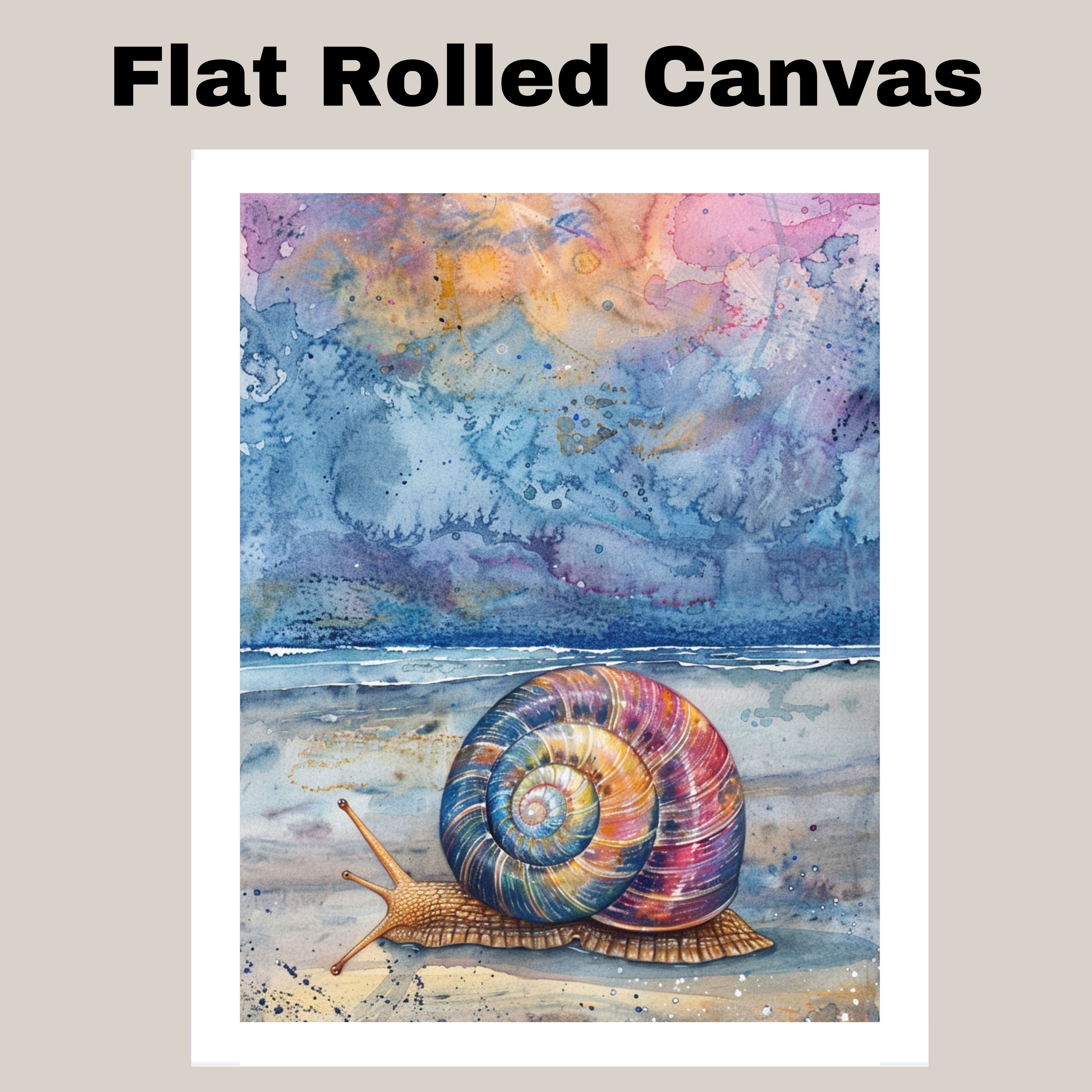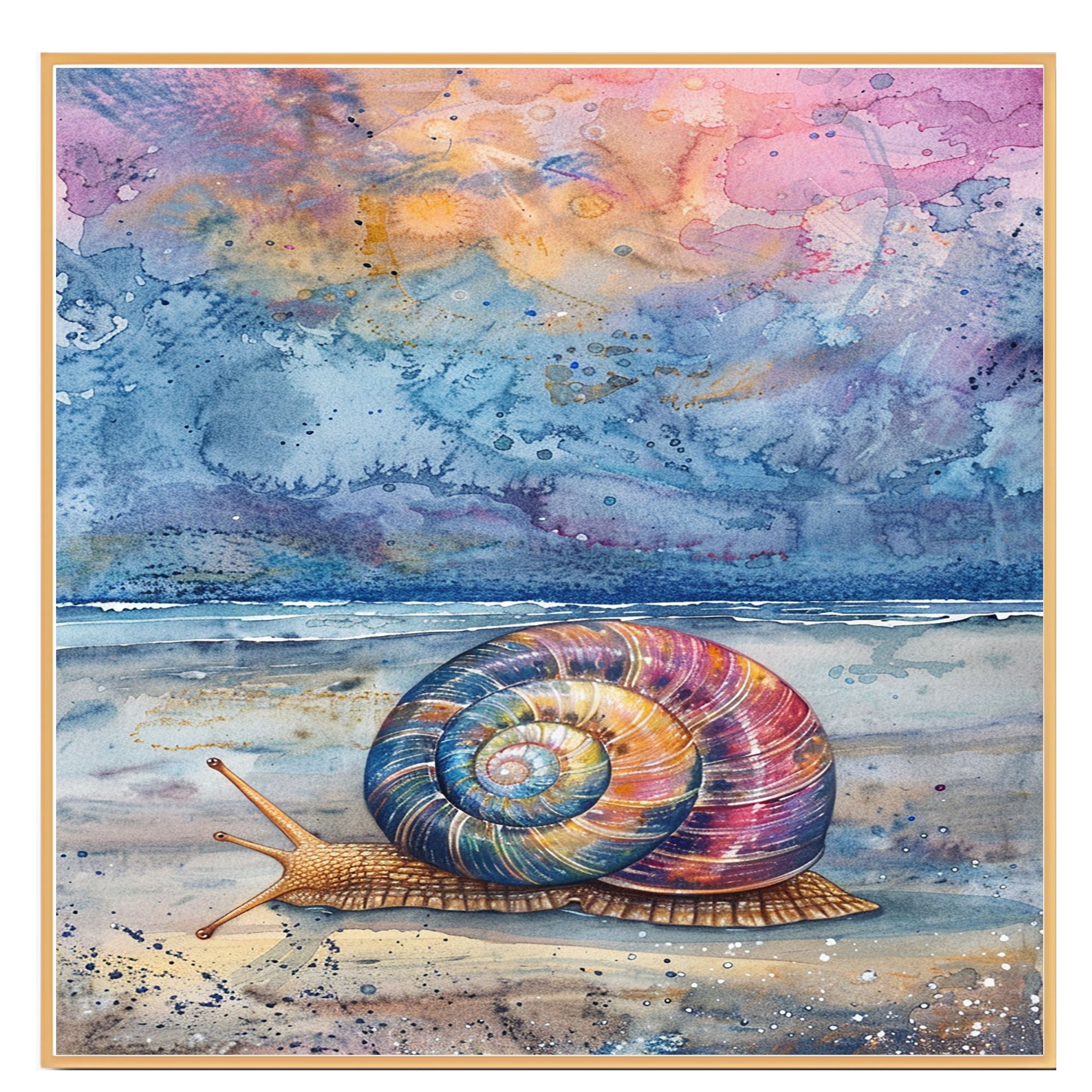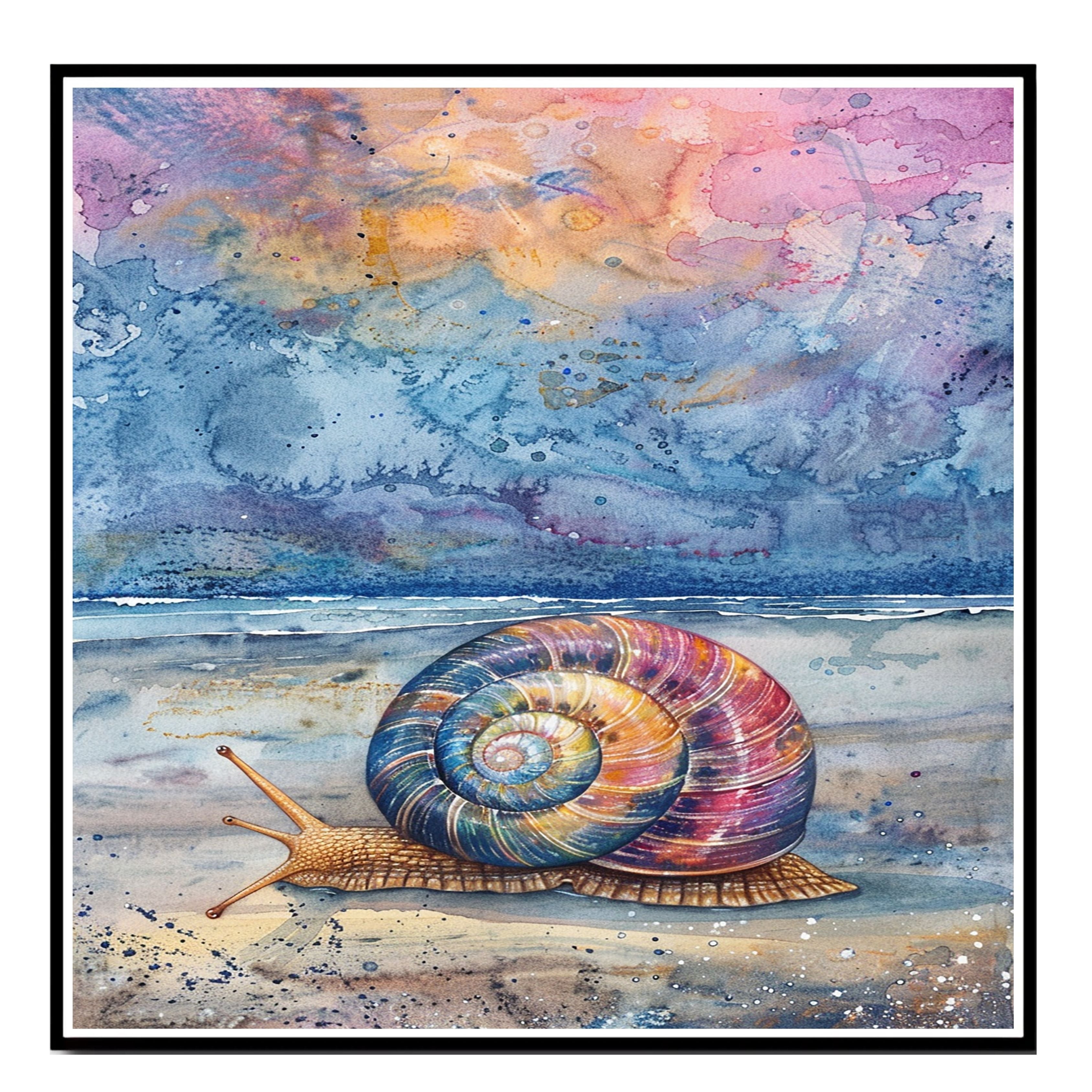 This mesmerizing watercolor artwork features a multicolored snail slowly making its way across a tranquil beach at dusk. With a cosmic-inspired sky and gentle ocean waves in the background, this painting blends nature and imagination in a stunning coastal composition. A perfect piece to bring whimsical marine life and serene twilight colors into any room.
