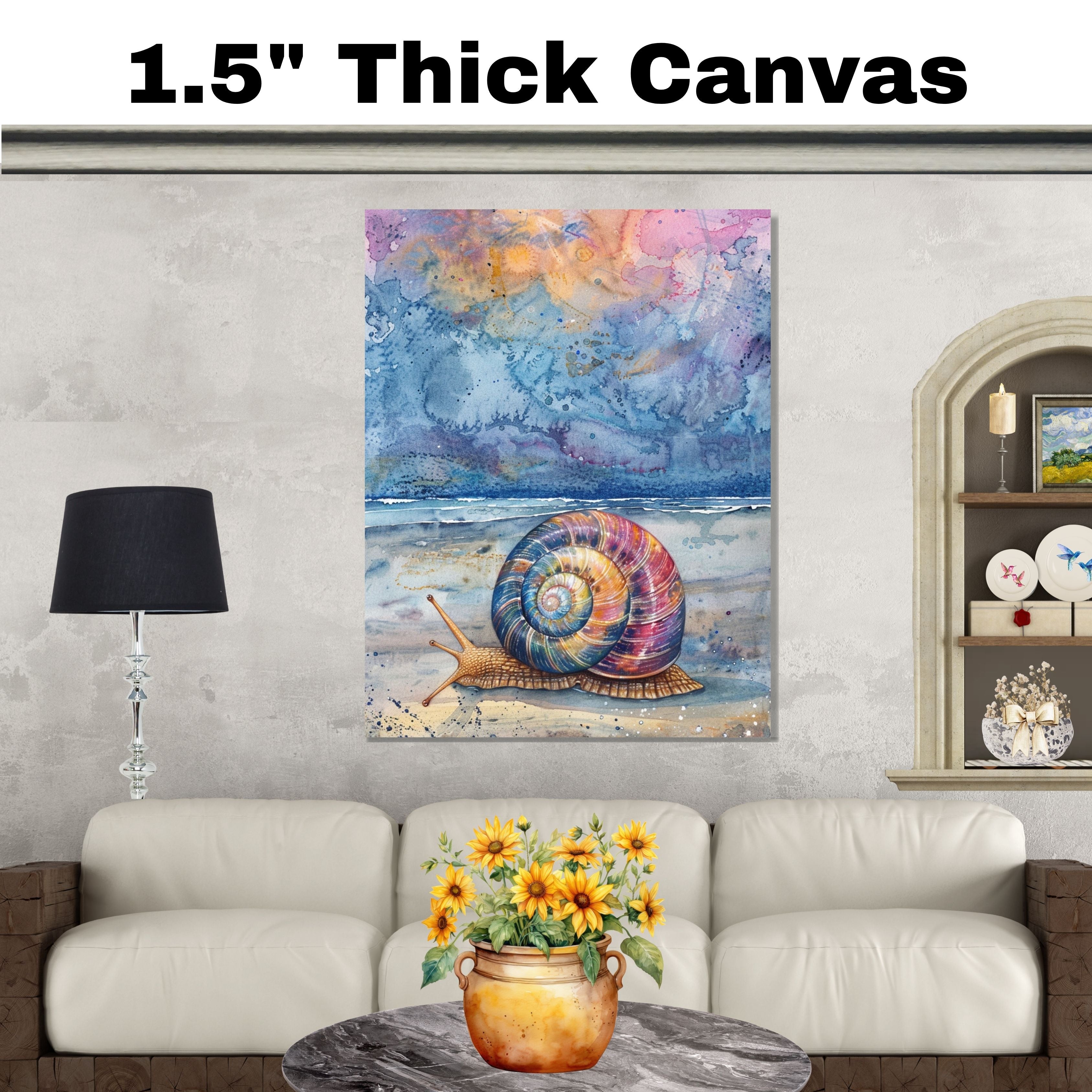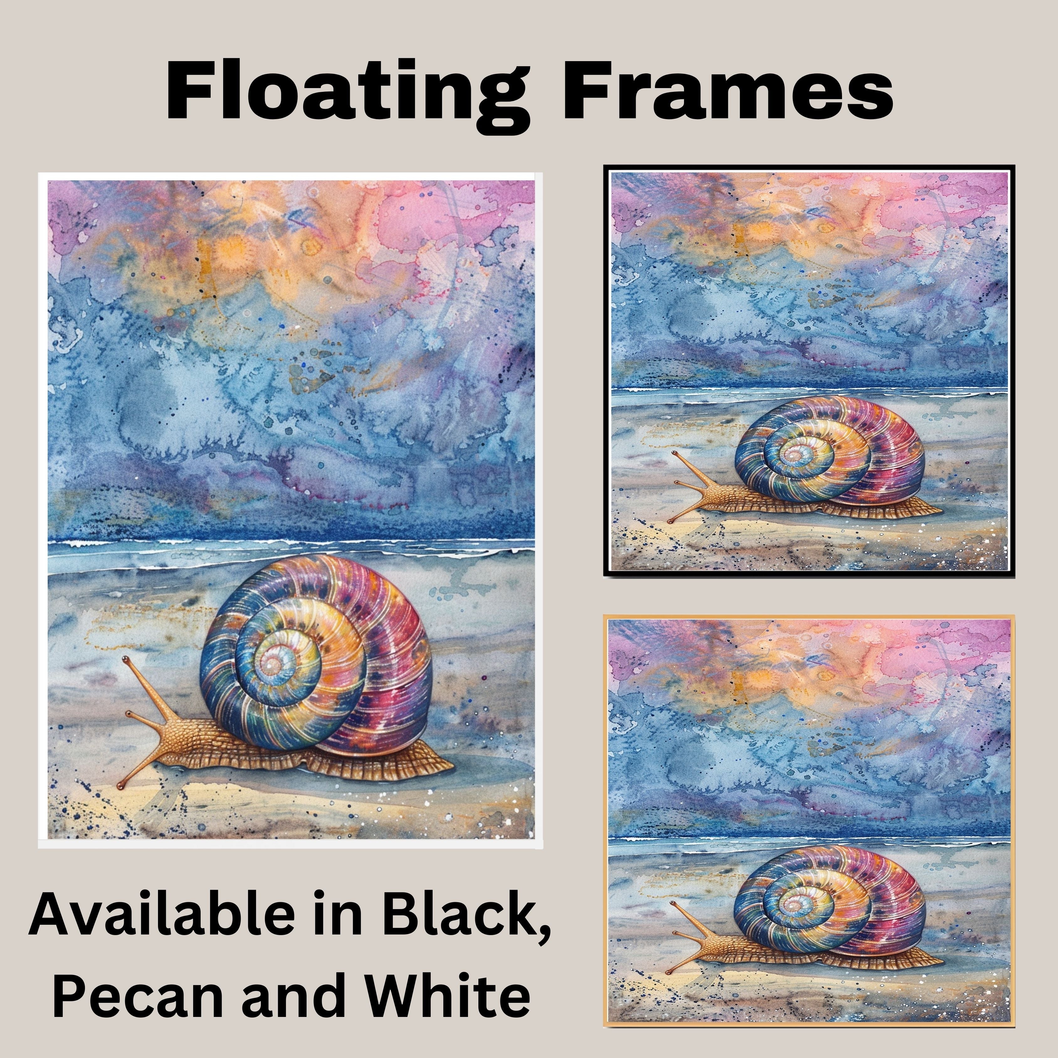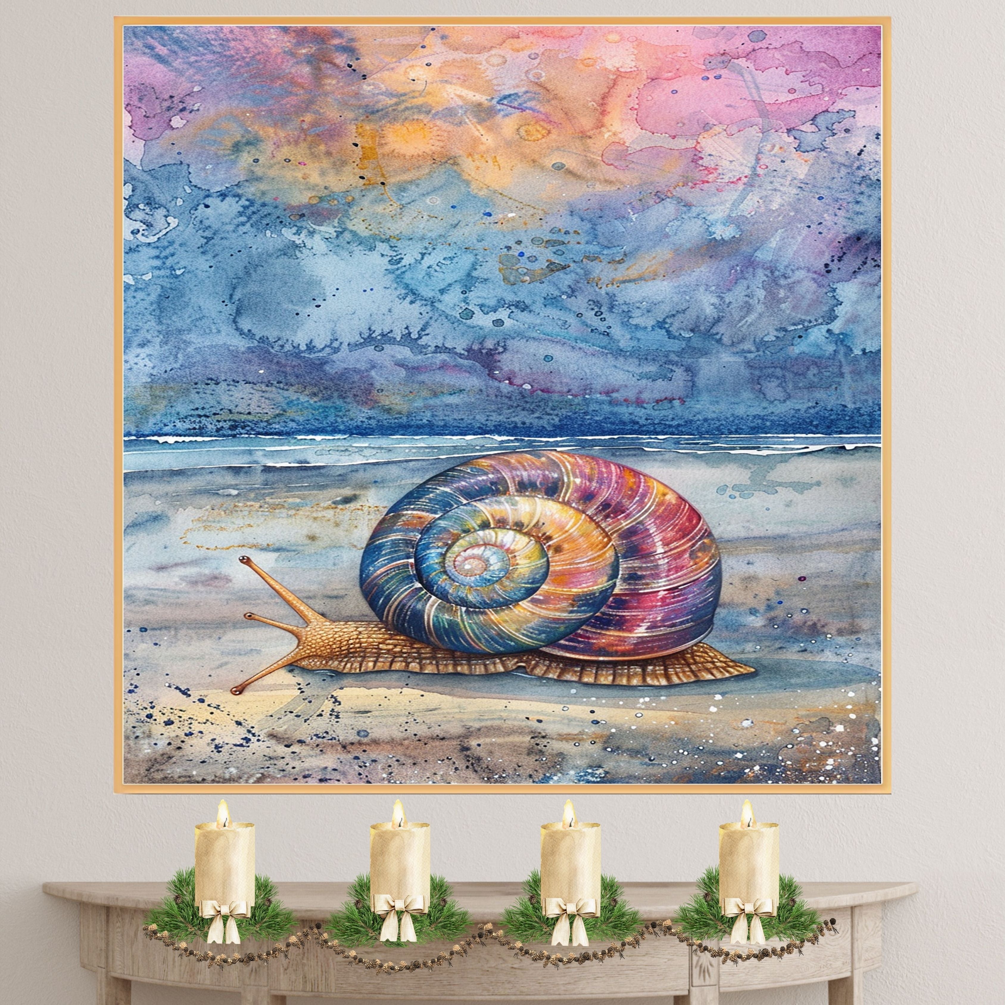 This mesmerizing watercolor artwork features a multicolored snail slowly making its way across a tranquil beach at dusk. With a cosmic-inspired sky and gentle ocean waves in the background, this painting blends nature and imagination in a stunning coastal composition. A perfect piece to bring whimsical marine life and serene twilight colors into any room.
