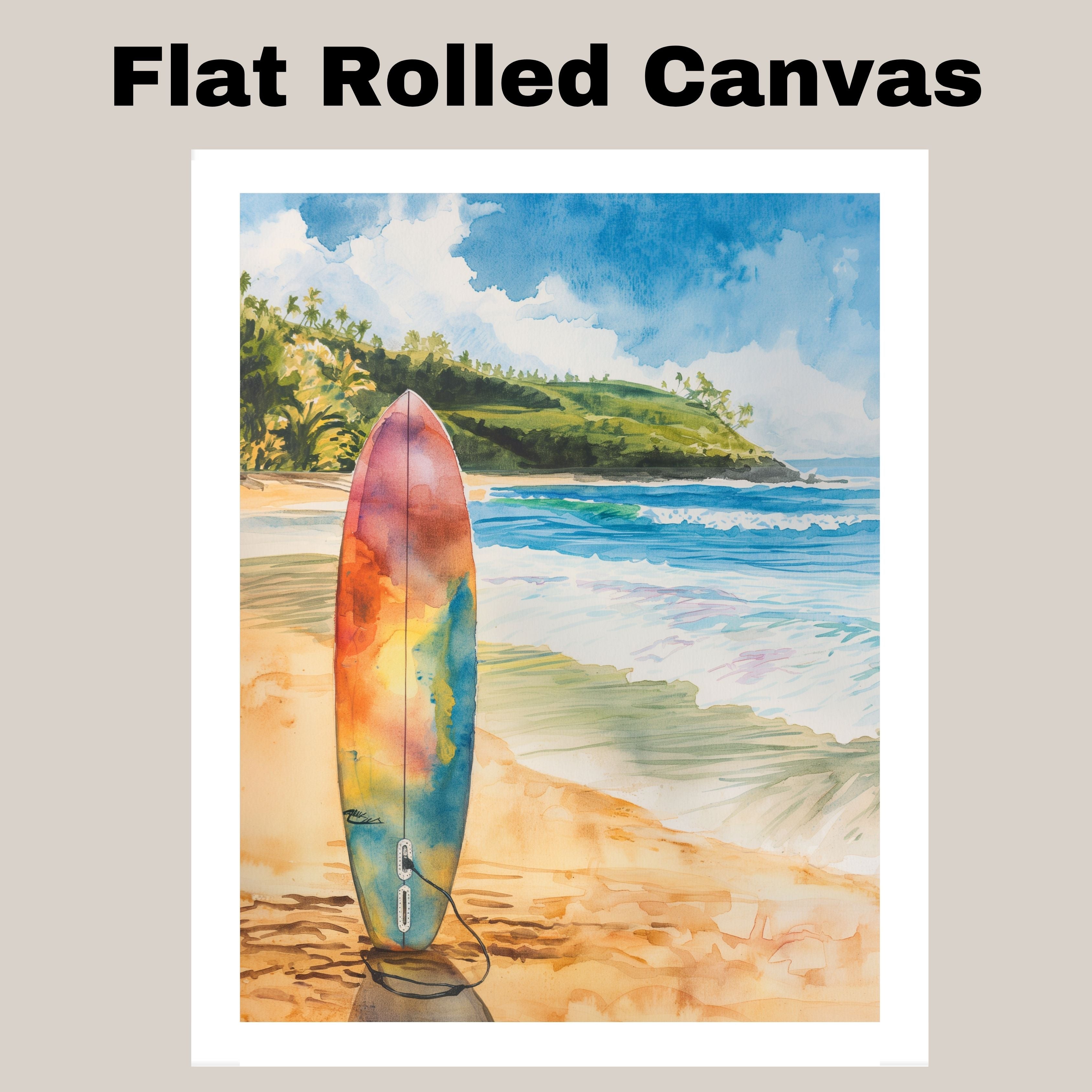 Watercolor Painting of a Multicolored Surfboard on a Sunny Beach with Ocean Waves and Palm-Covered Green Hills in the Background on Ready to Hang 1.5" Thick Canvas Wrap, Floating Framed Canvas, Flat Rolled Canvas
