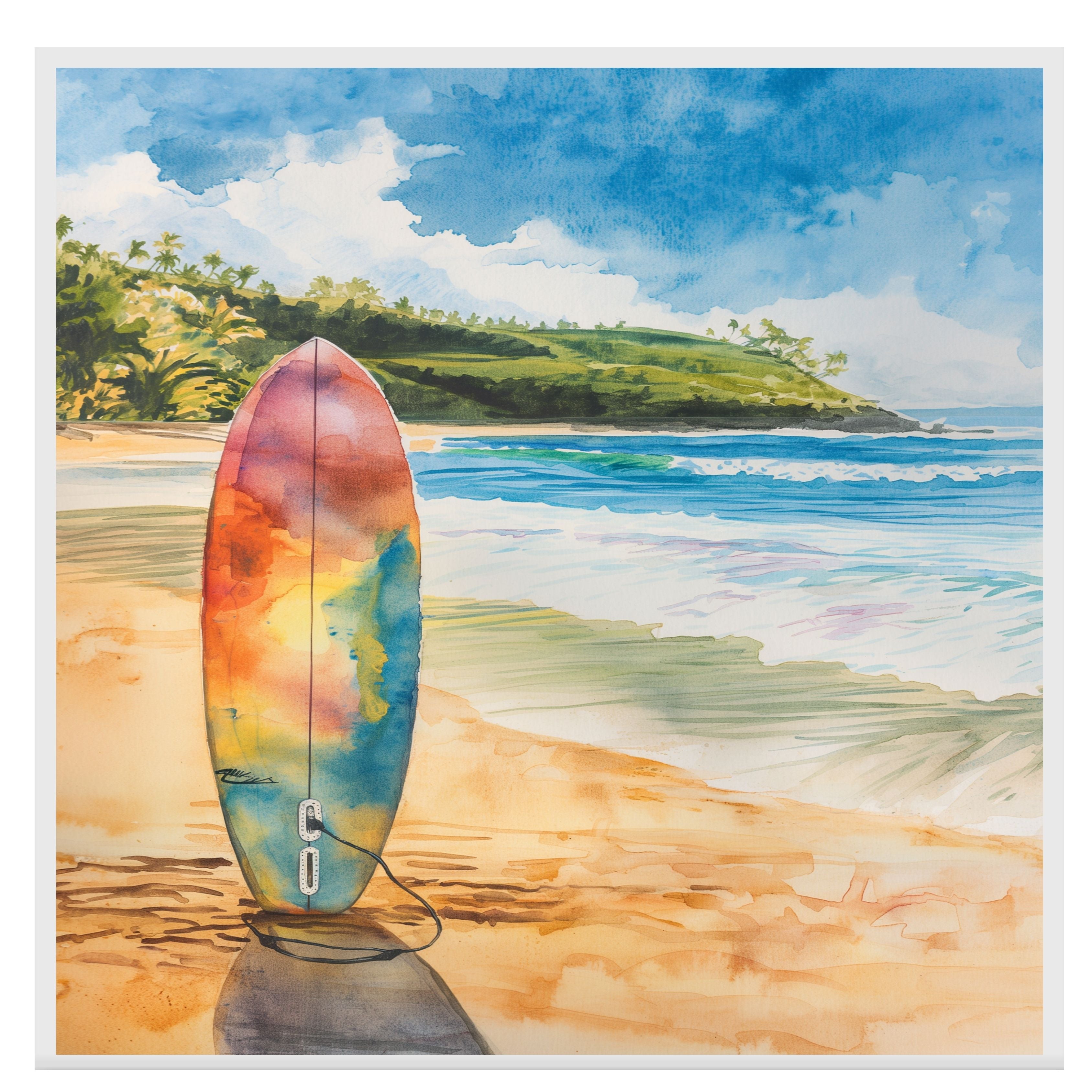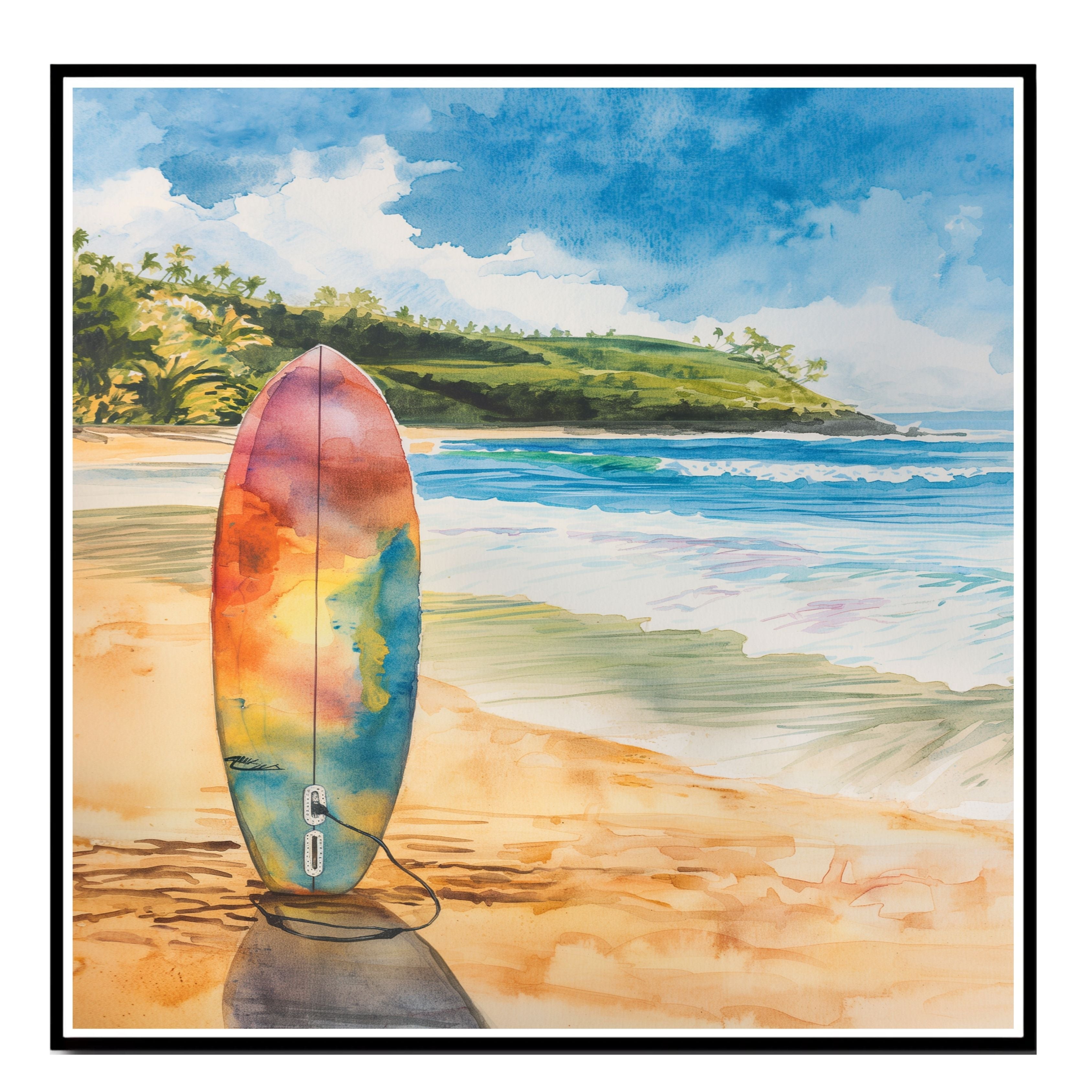 Capture the spirit of a tropical escape with this vivid watercolor of a multicolored surfboard on a golden beach. Set against vibrant blue waves and lush green hills, this artwork evokes feelings of summer, surf, and serenity. Ideal for coastal and surf-themed collections.