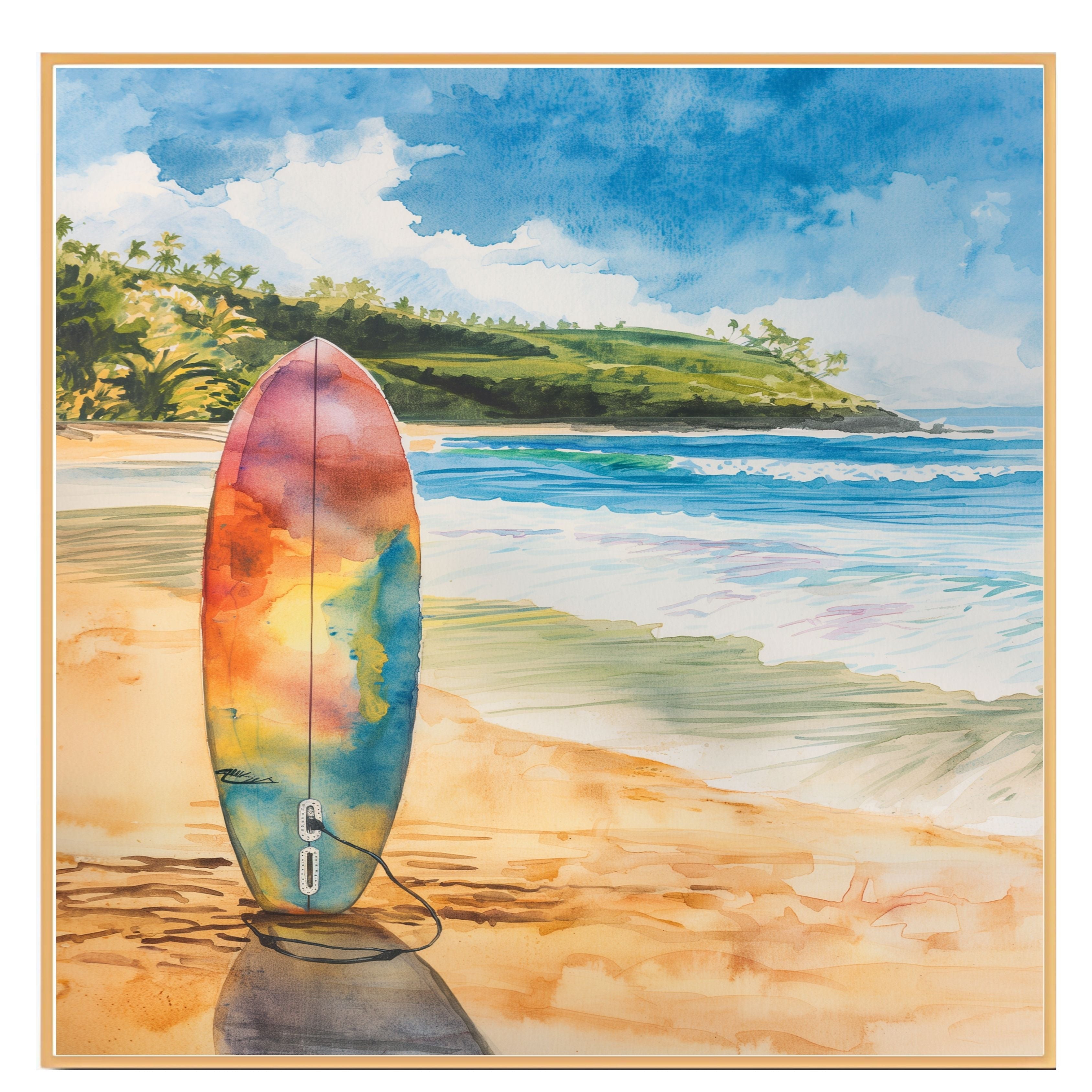 Capture the spirit of a tropical escape with this vivid watercolor of a multicolored surfboard on a...