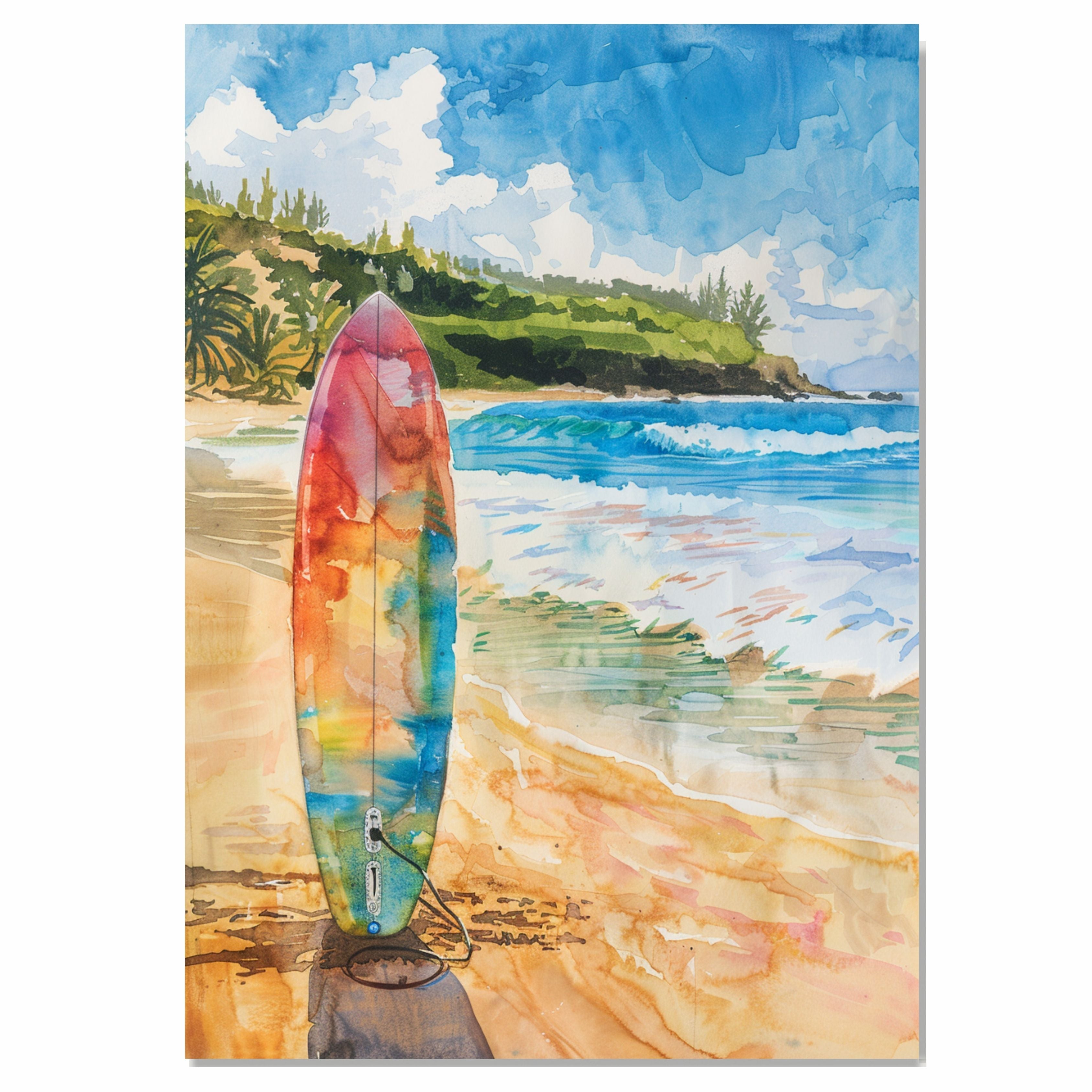 Experience the essence of a tropical paradise with this stunning watercolor of a multicolored surfboard resting on a sunlit beach. The lush green hills and ocean waves create a serene and adventurous atmosphere. A perfect piece for surf lovers and coastal dreamers.