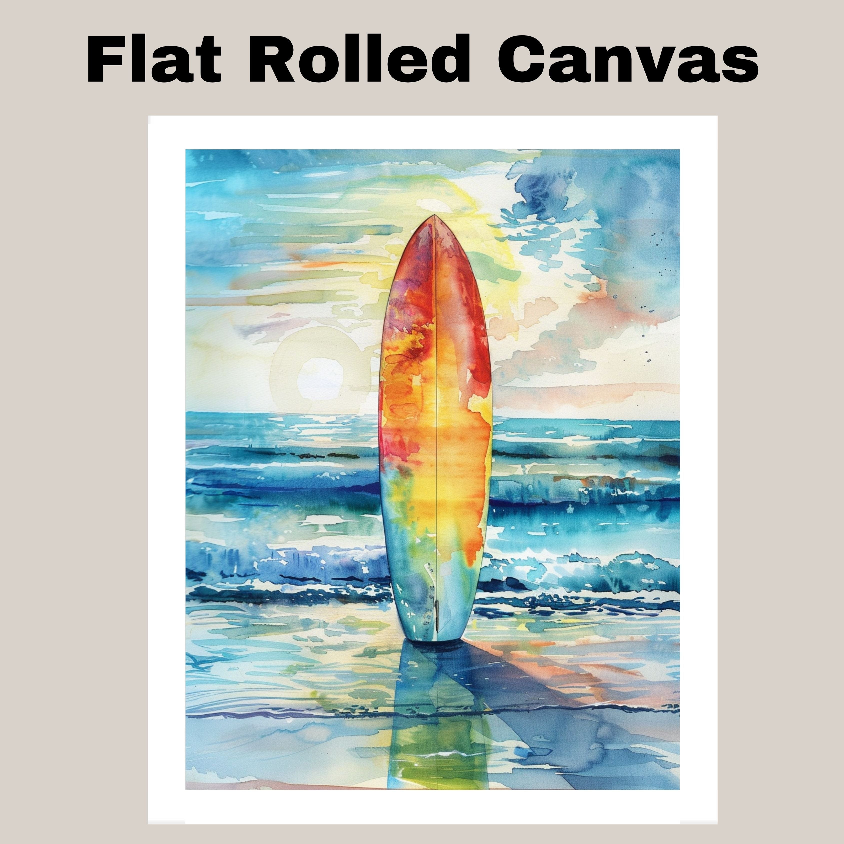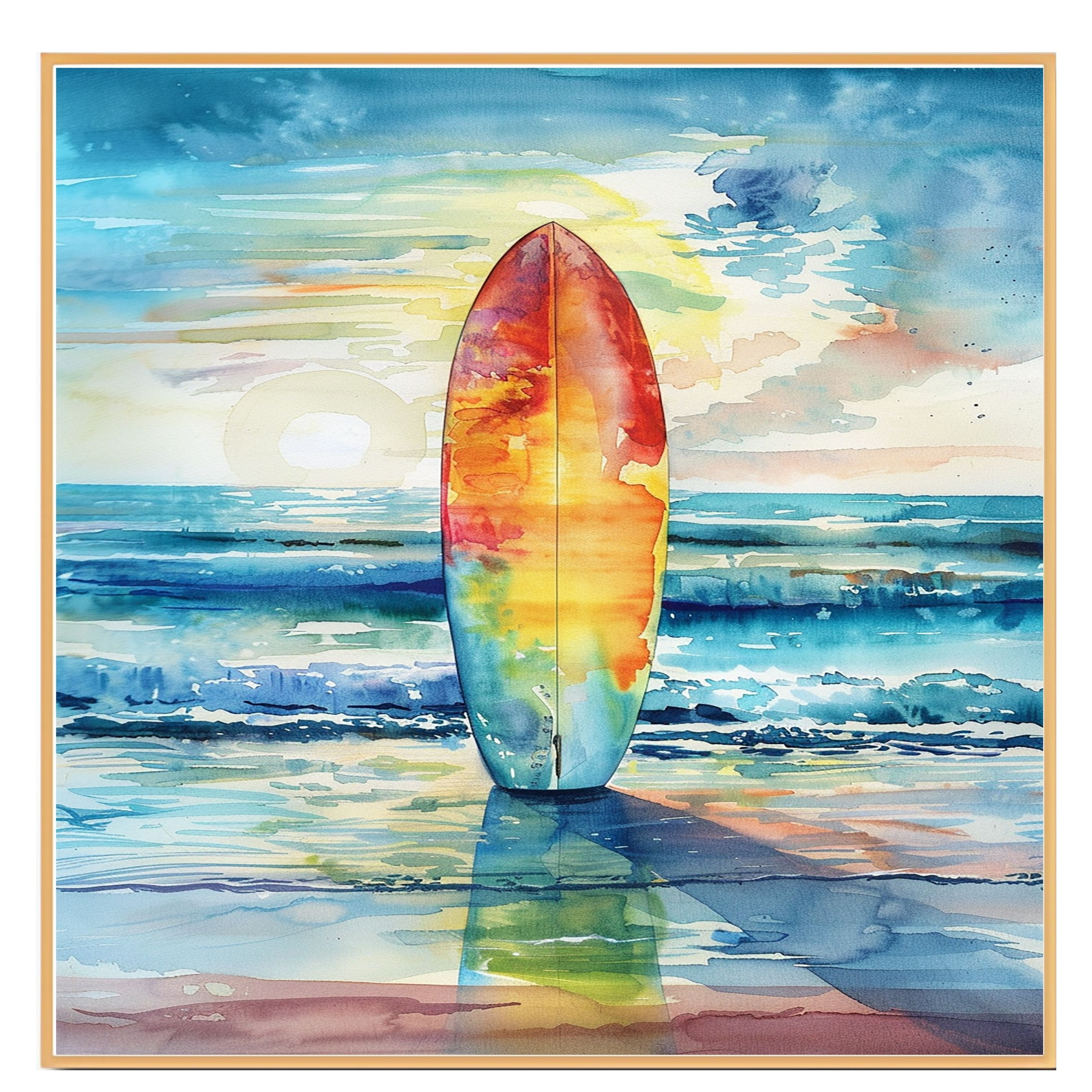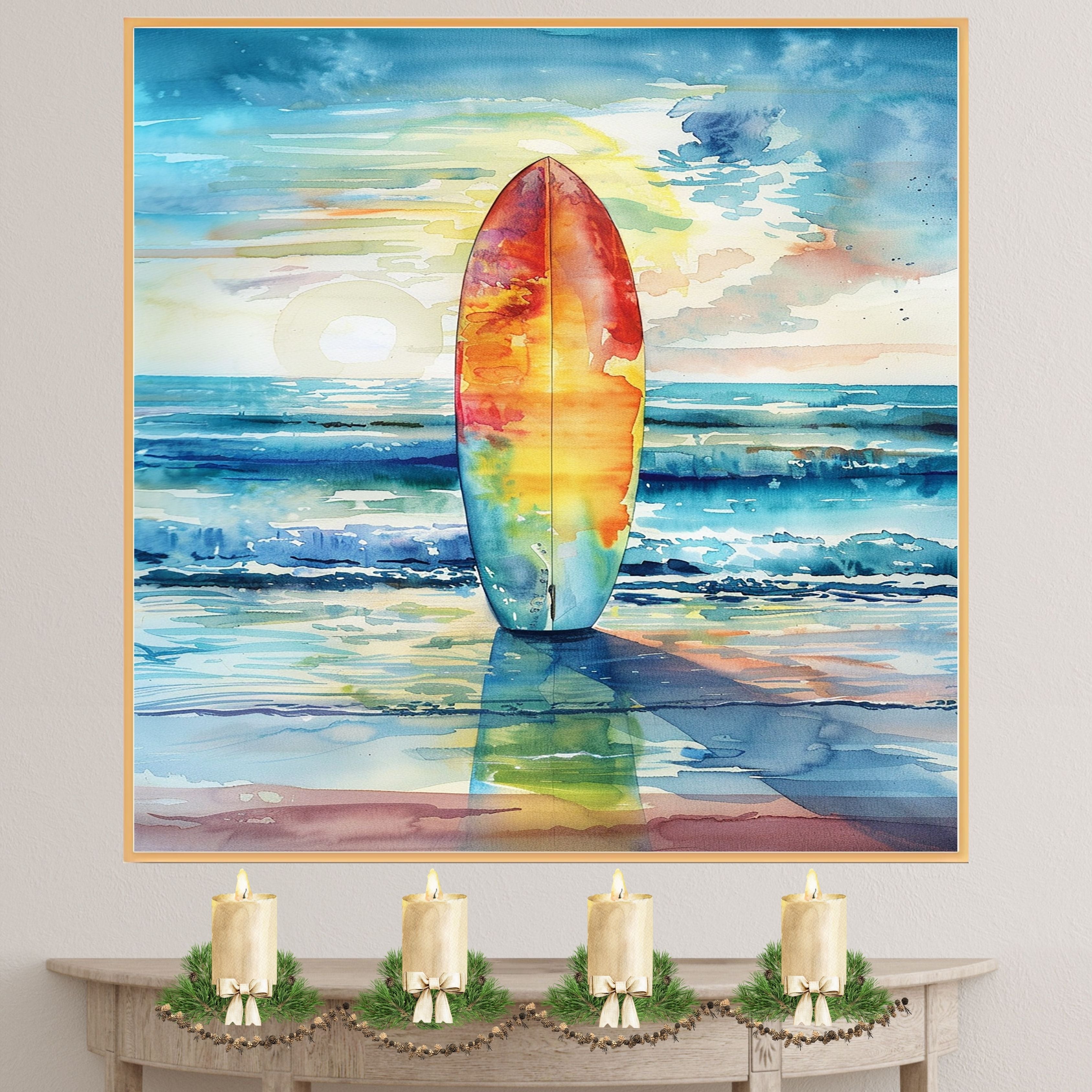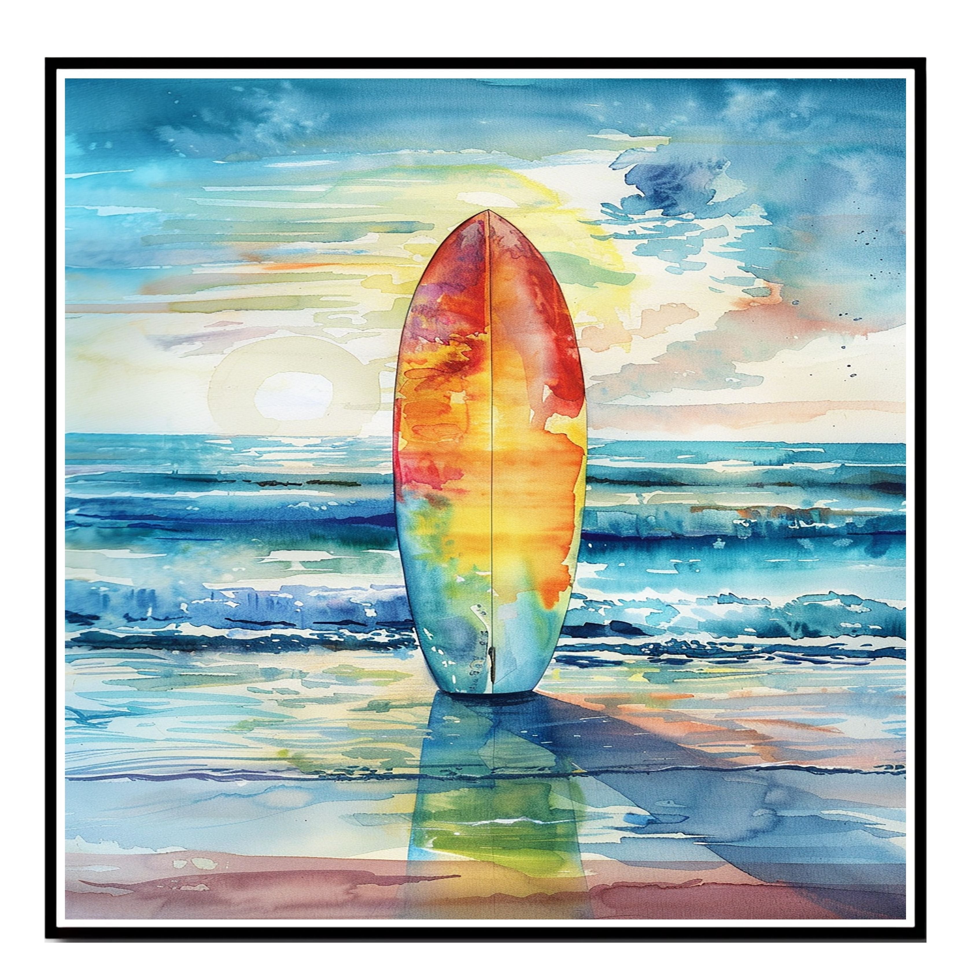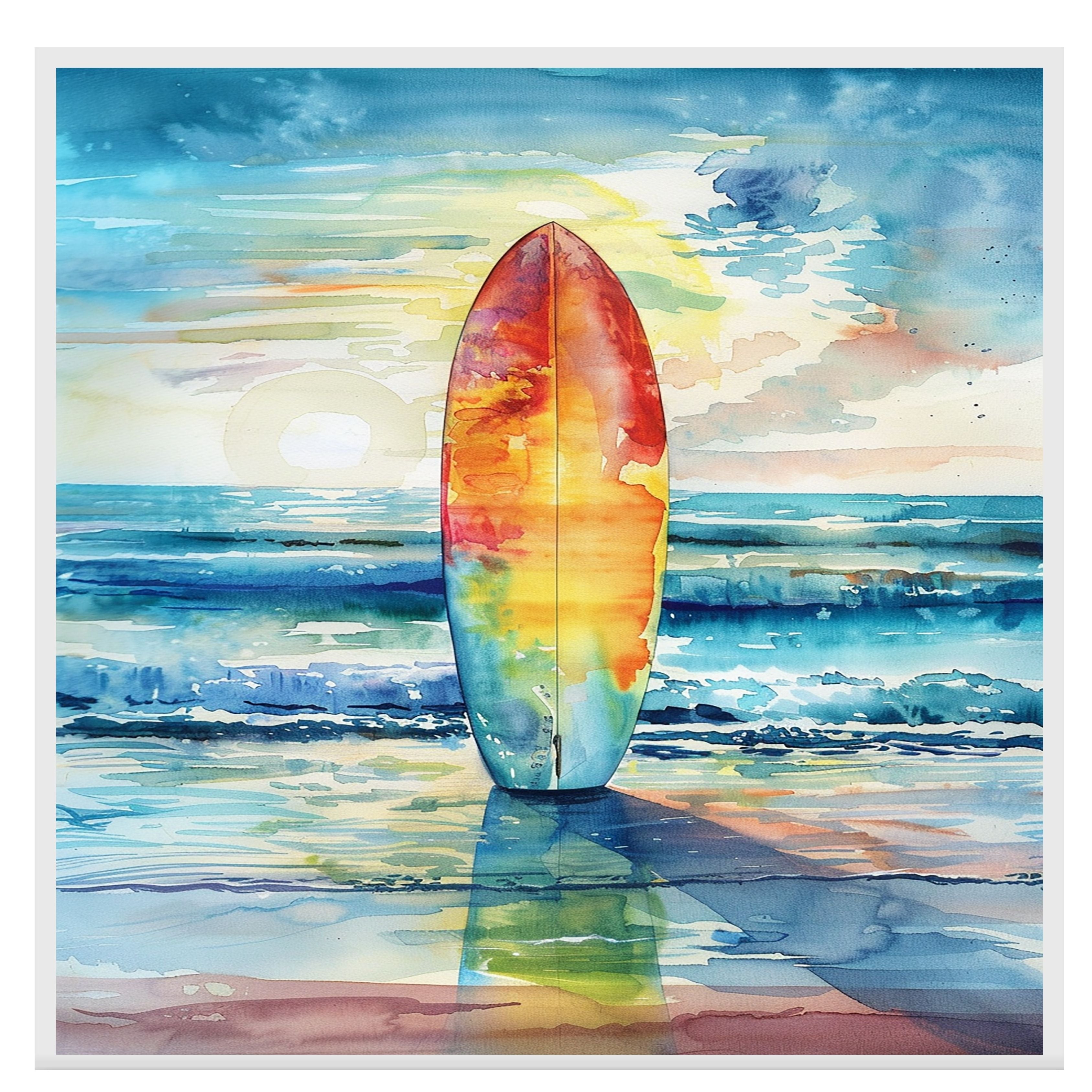 Immerse yourself in coastal serenity with this vibrant watercolor of a surfboard standing on a reflective beach as the sun sets. The brilliant blend of warm and cool tones captures the magic of a peaceful surf scene. Ideal for surf lovers and beach enthusiasts.