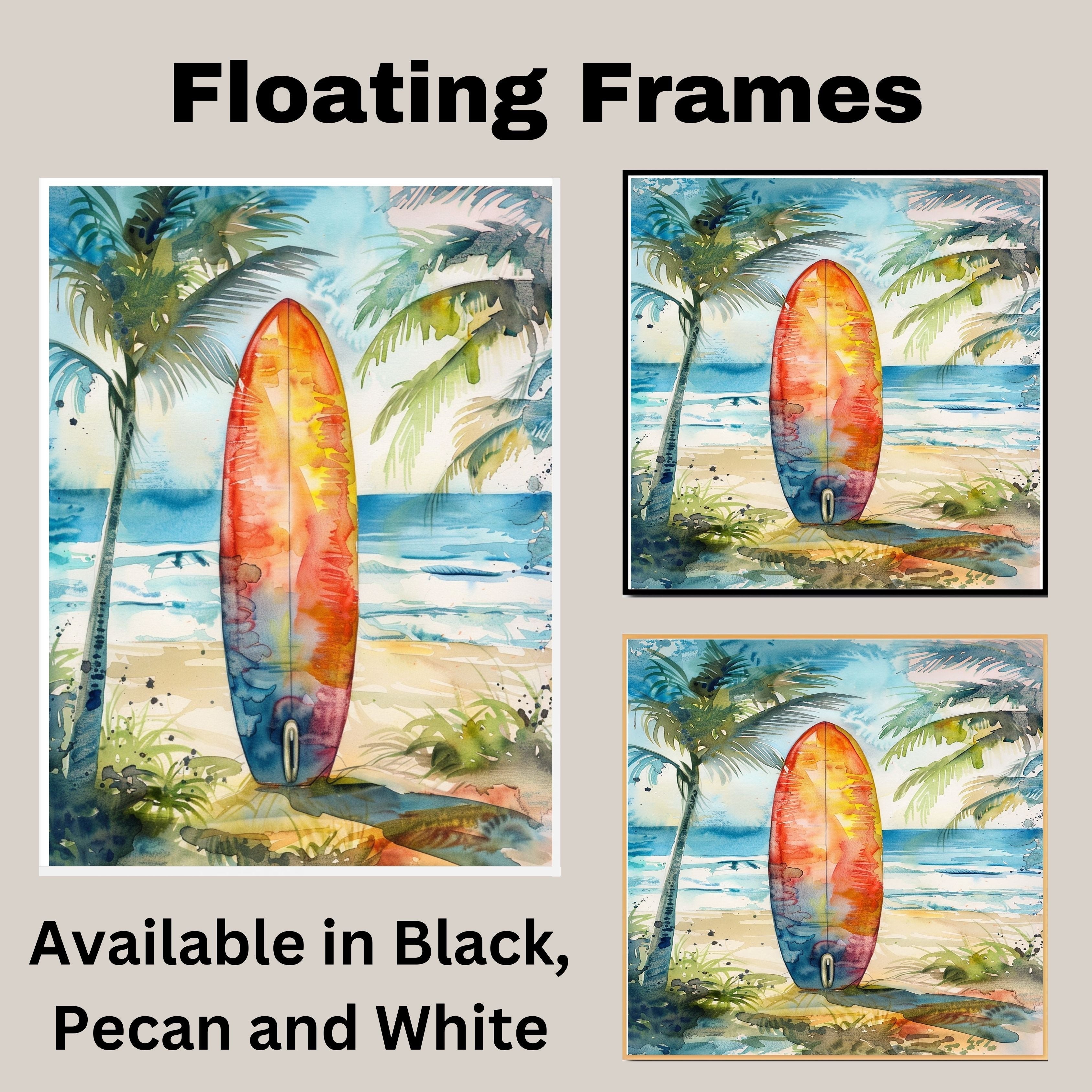 1.5" Thick Floating Framed Canvas: Available in Black, Pecan, and White Grain. Durable shrink-resistant frame. Comes with easy-to-install hanging kits, ready for immediate display.