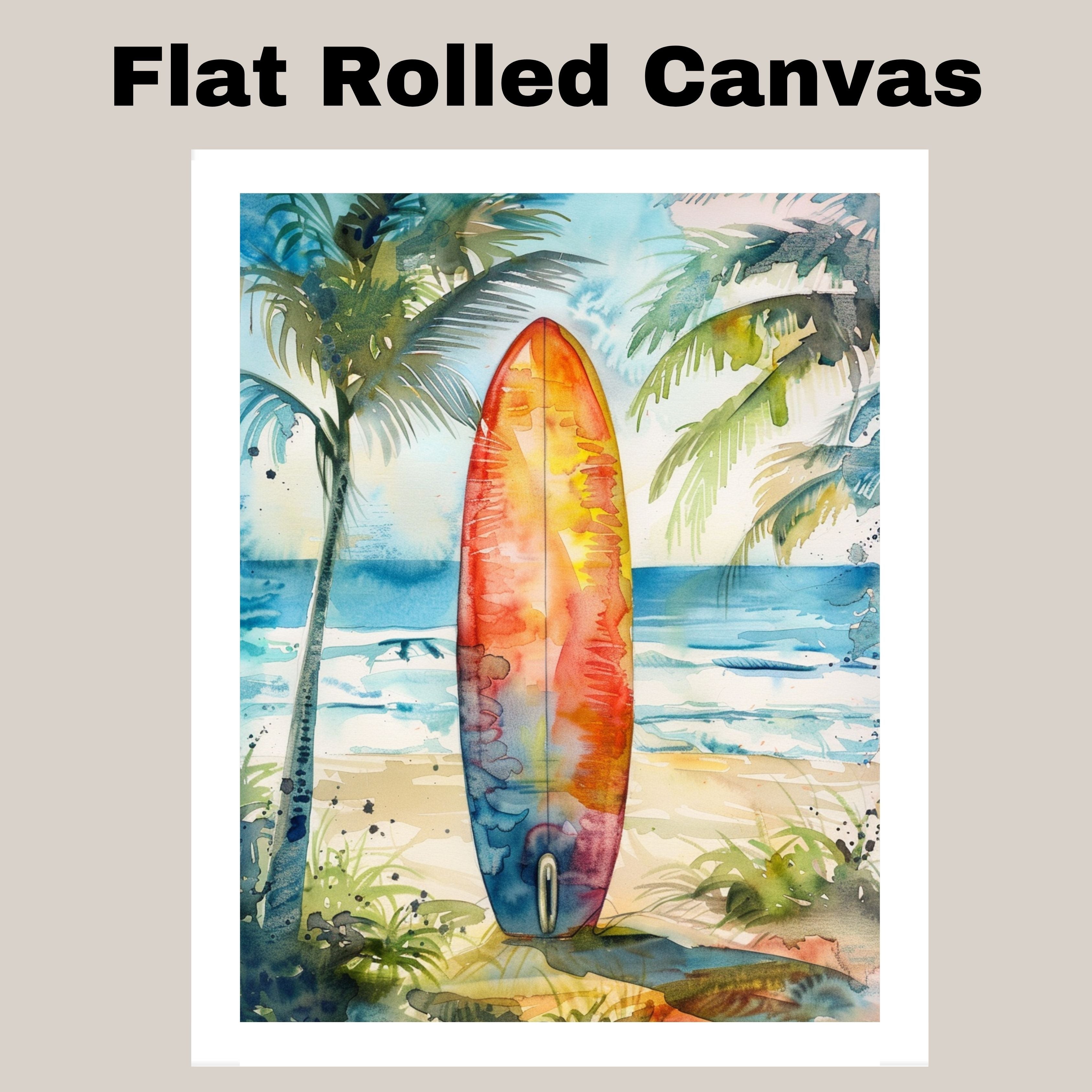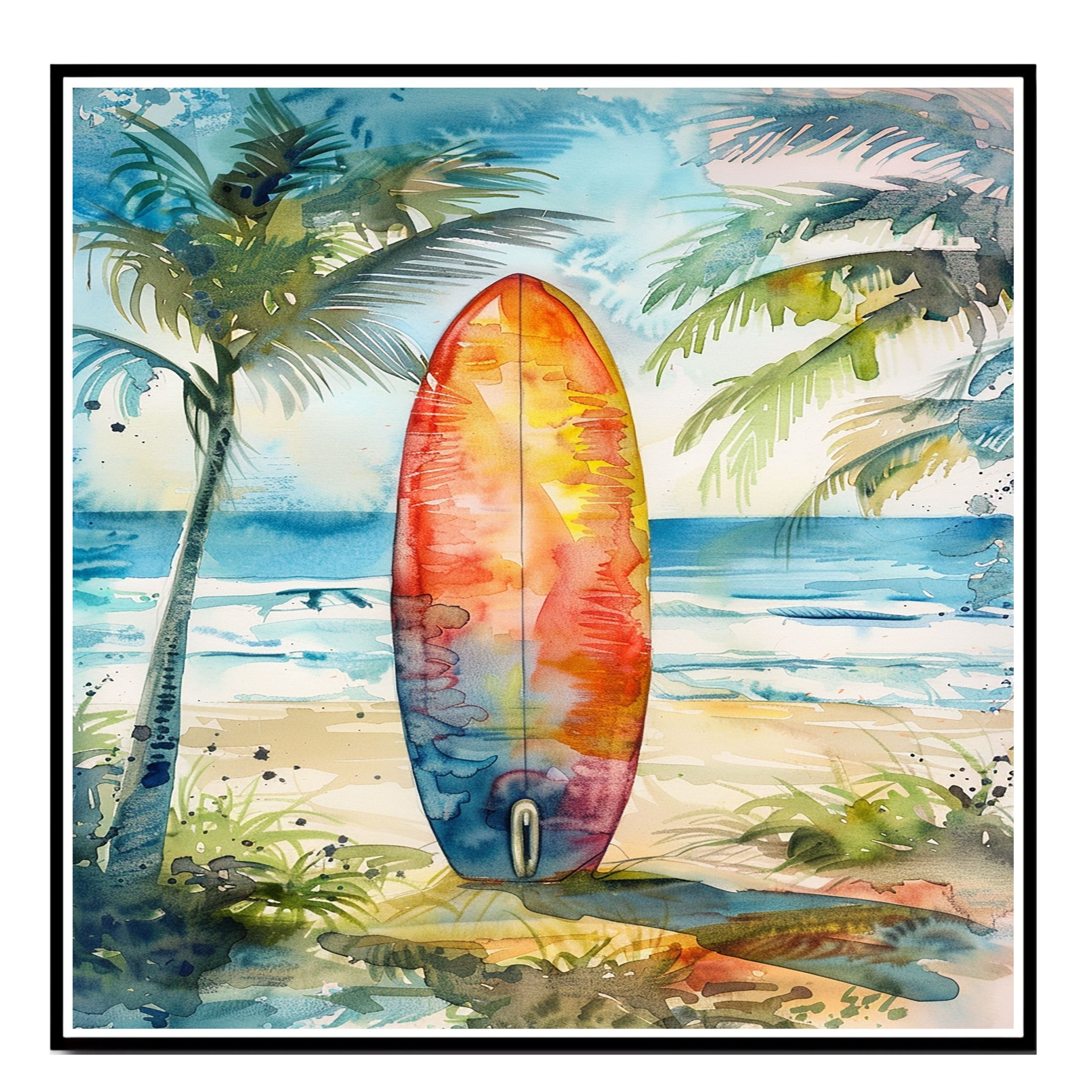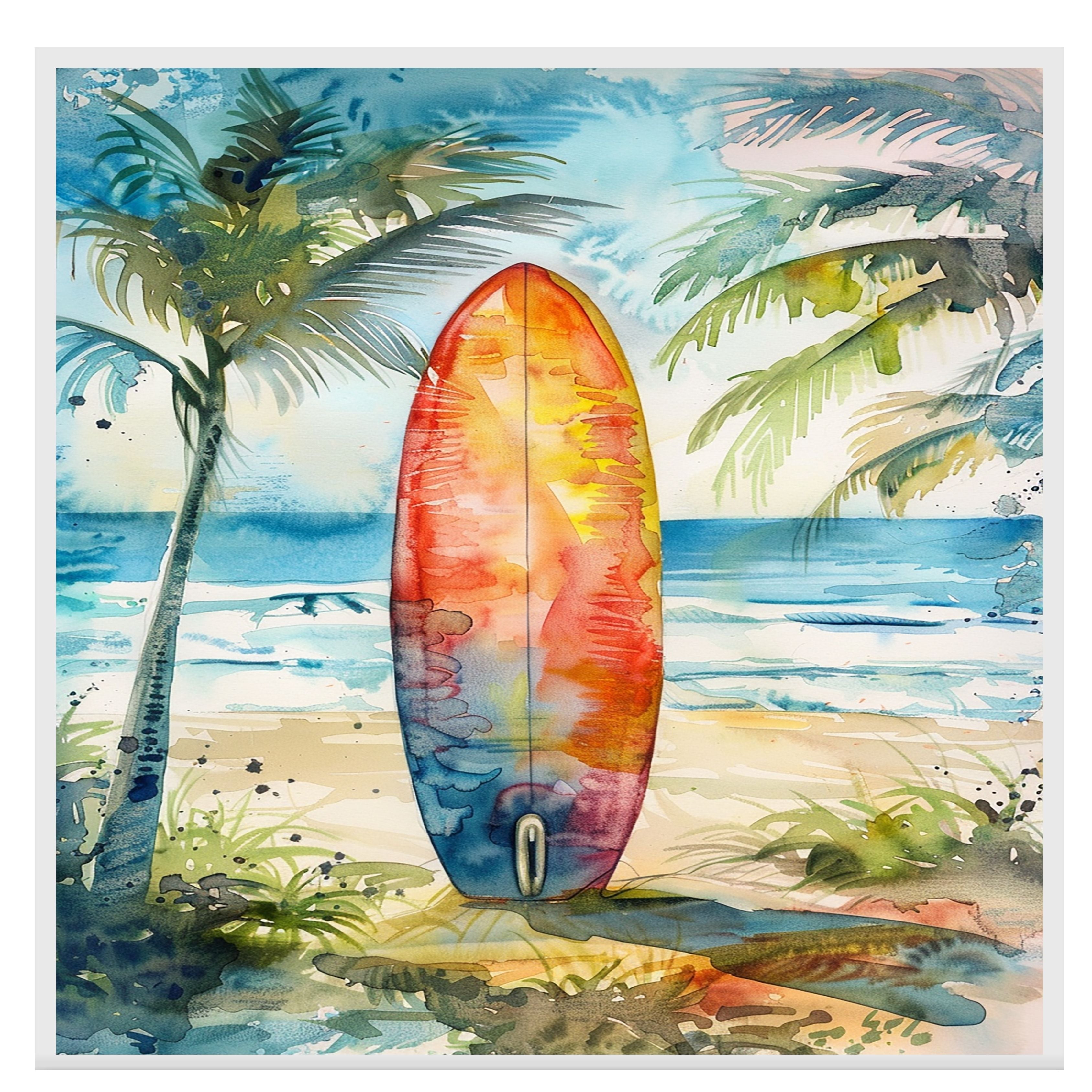 Capture the laid-back surf spirit with this watercolor painting by Debbie Afagan featuring a colorful surfboard framed by tropical palms and rolling ocean waves. Perfect for beach lovers, surfers, or anyone inspired by coastal life, it brings warmth and island energy to your space.