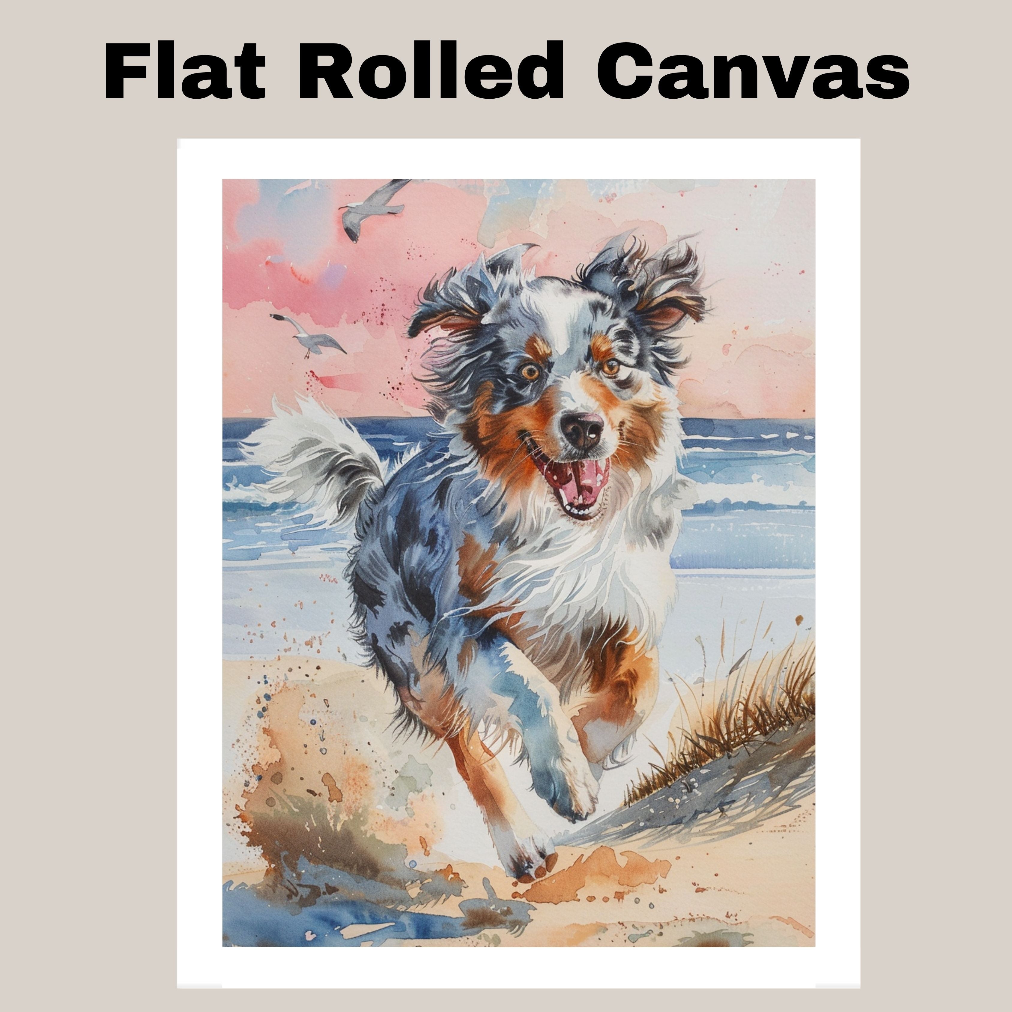 Watercolor Painting of a Playful Dog Running on the Beach with Ocean Waves and Pink Sunset in a Fun Coastal Scene on Ready to Hang 1.5" Thick Canvas Wrap, Floating Framed Canvas, Flat Rolled Canvas