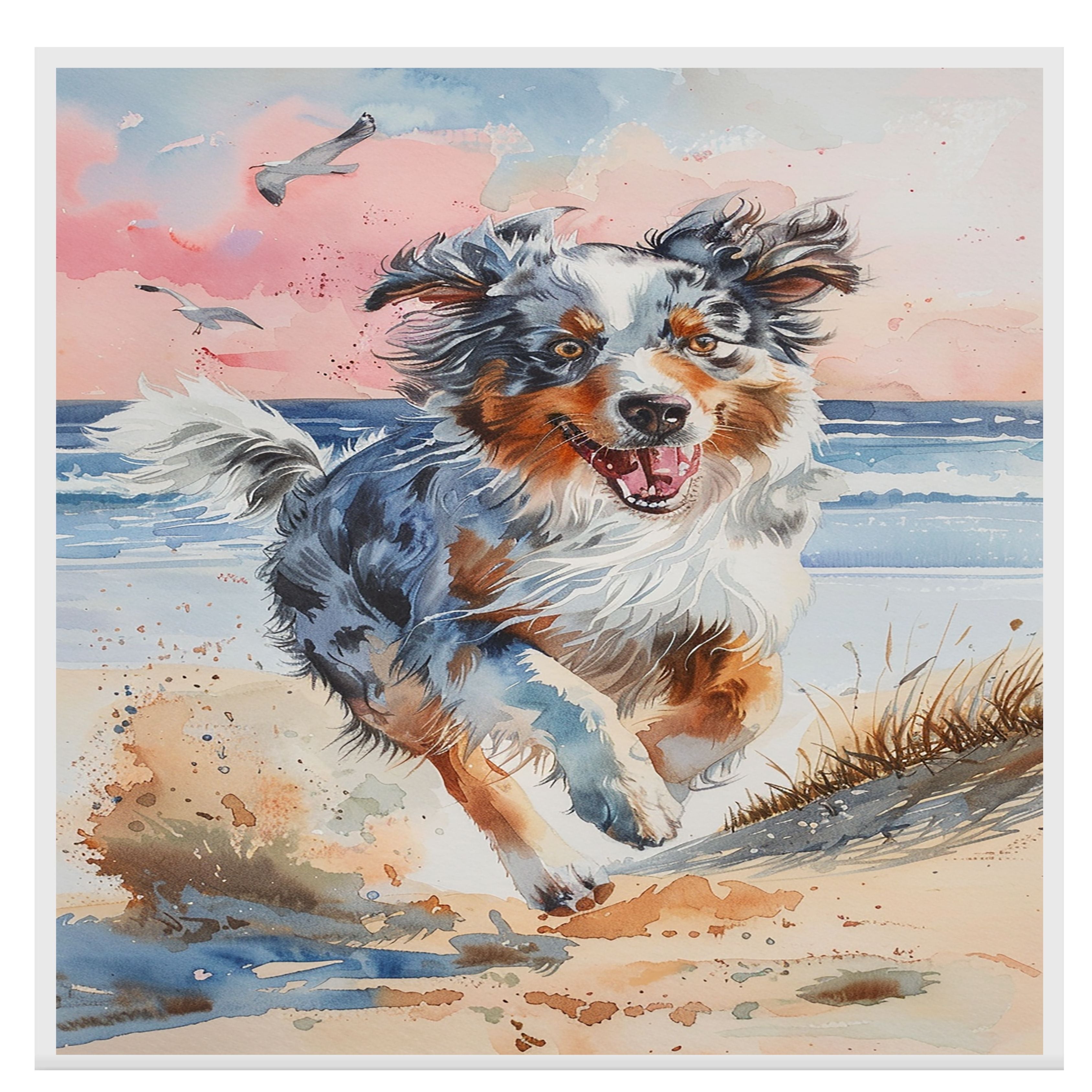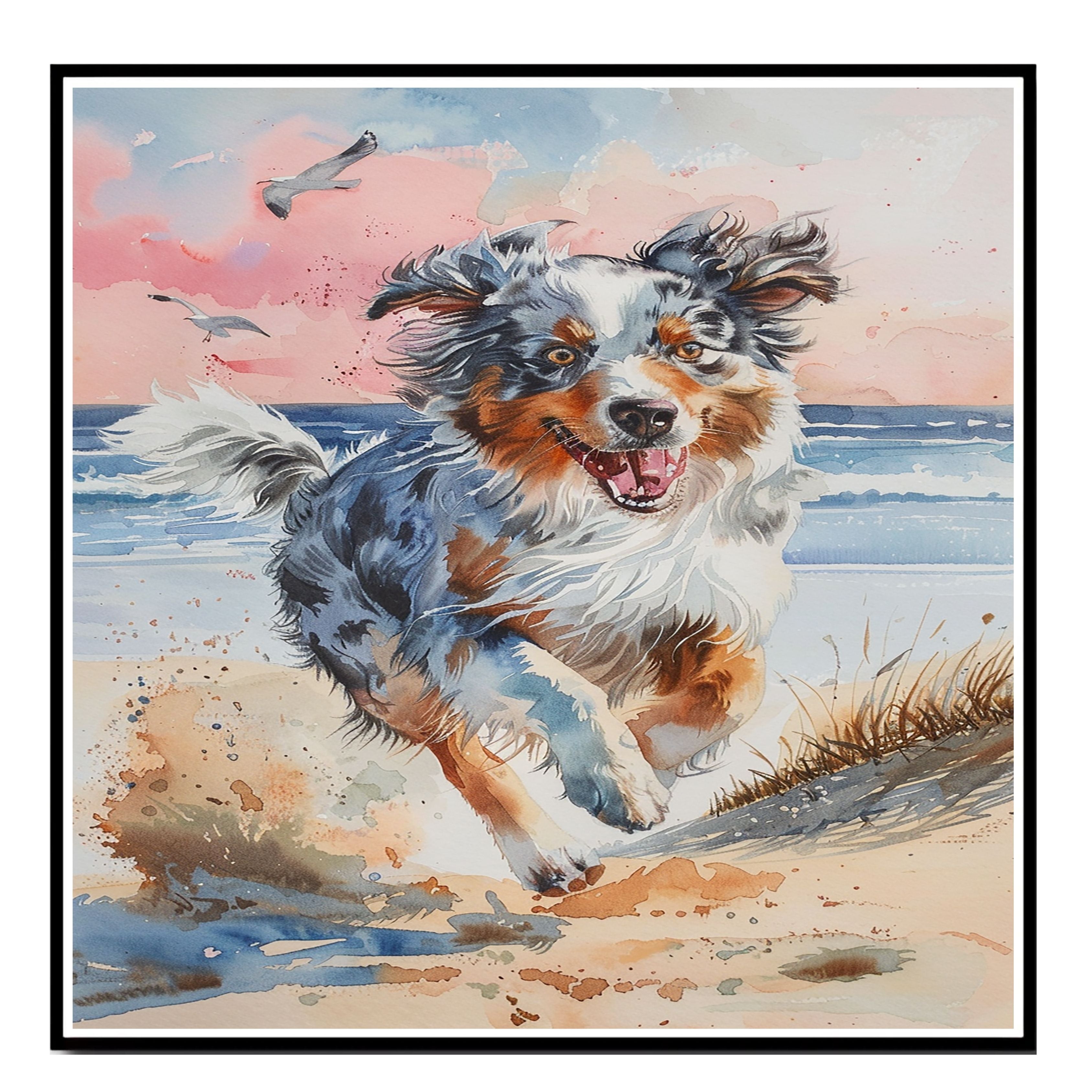 Capture the spirit of carefree joy with this stunning watercolor painting of a dog mid-run along a sandy beach. With soft pink skies, crashing waves, and expressive brushwork, this piece radiates energy and love for the ocean. A perfect gift for pet lovers or anyone who adores beachside charm and vibrant animal art.