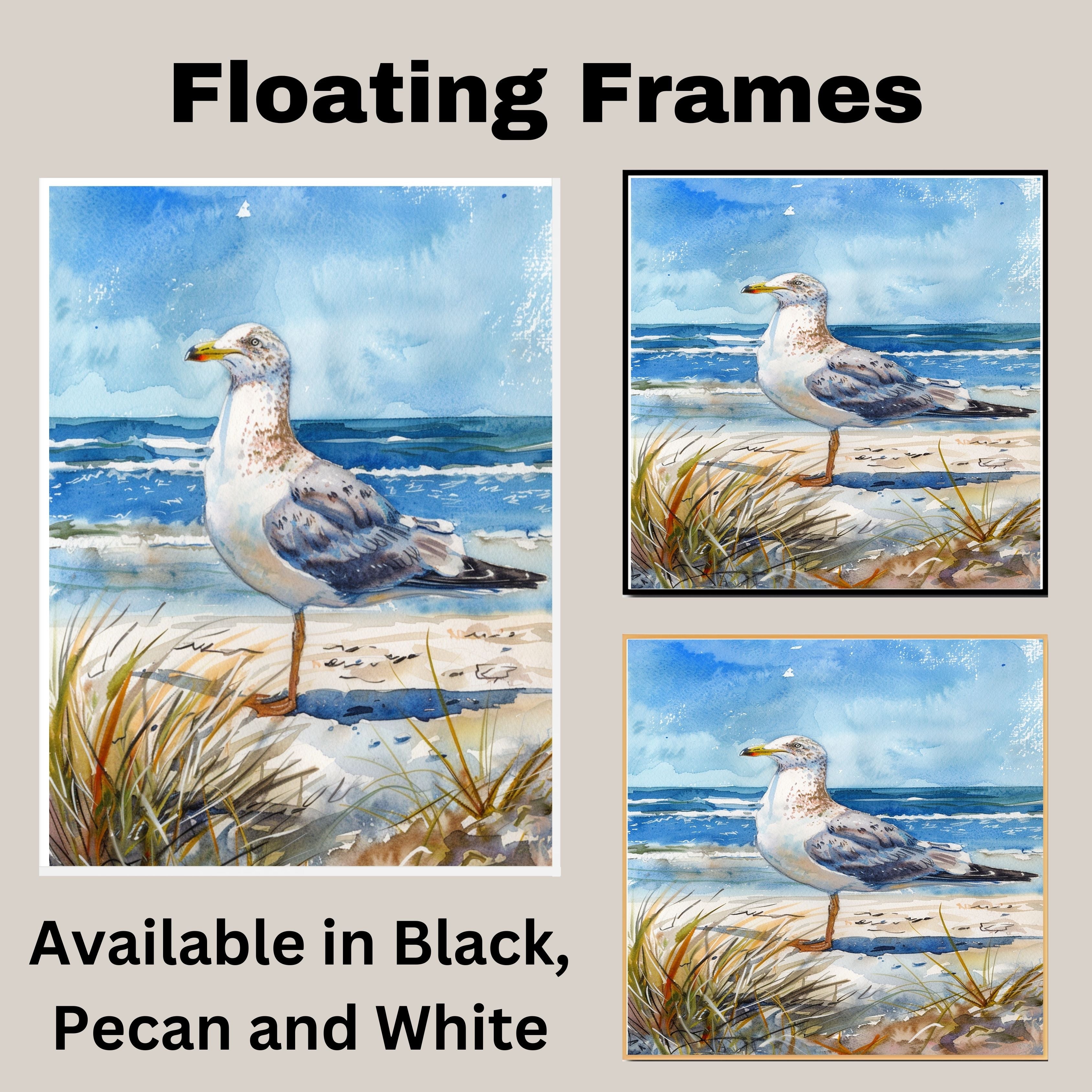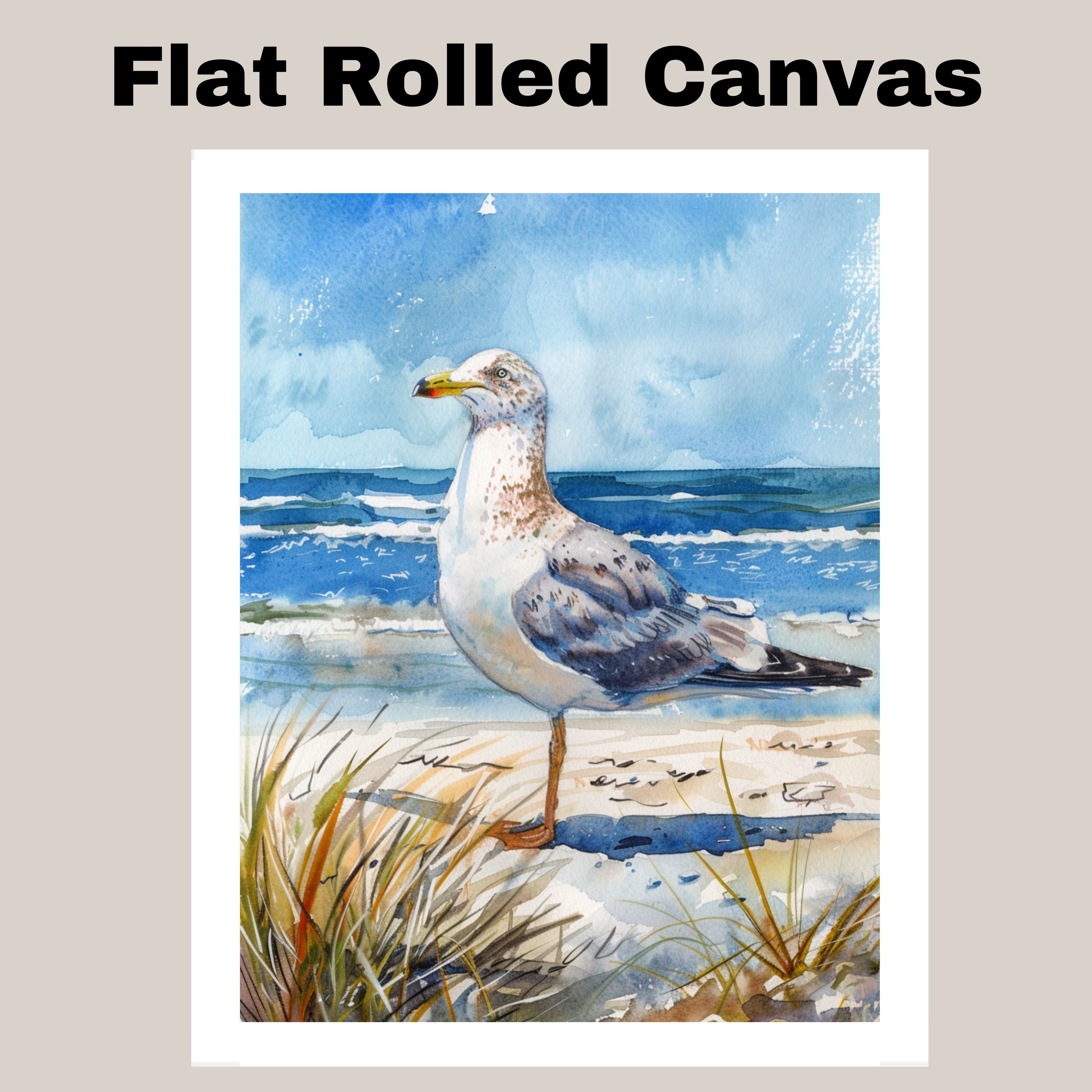 Watercolor Painting of a Seagull Standing on a Sandy Beach by the Ocean on Ready to Hang 1.5" Thick Canvas Wrap, Floating Framed Canvas, Flat Rolled Canvas
